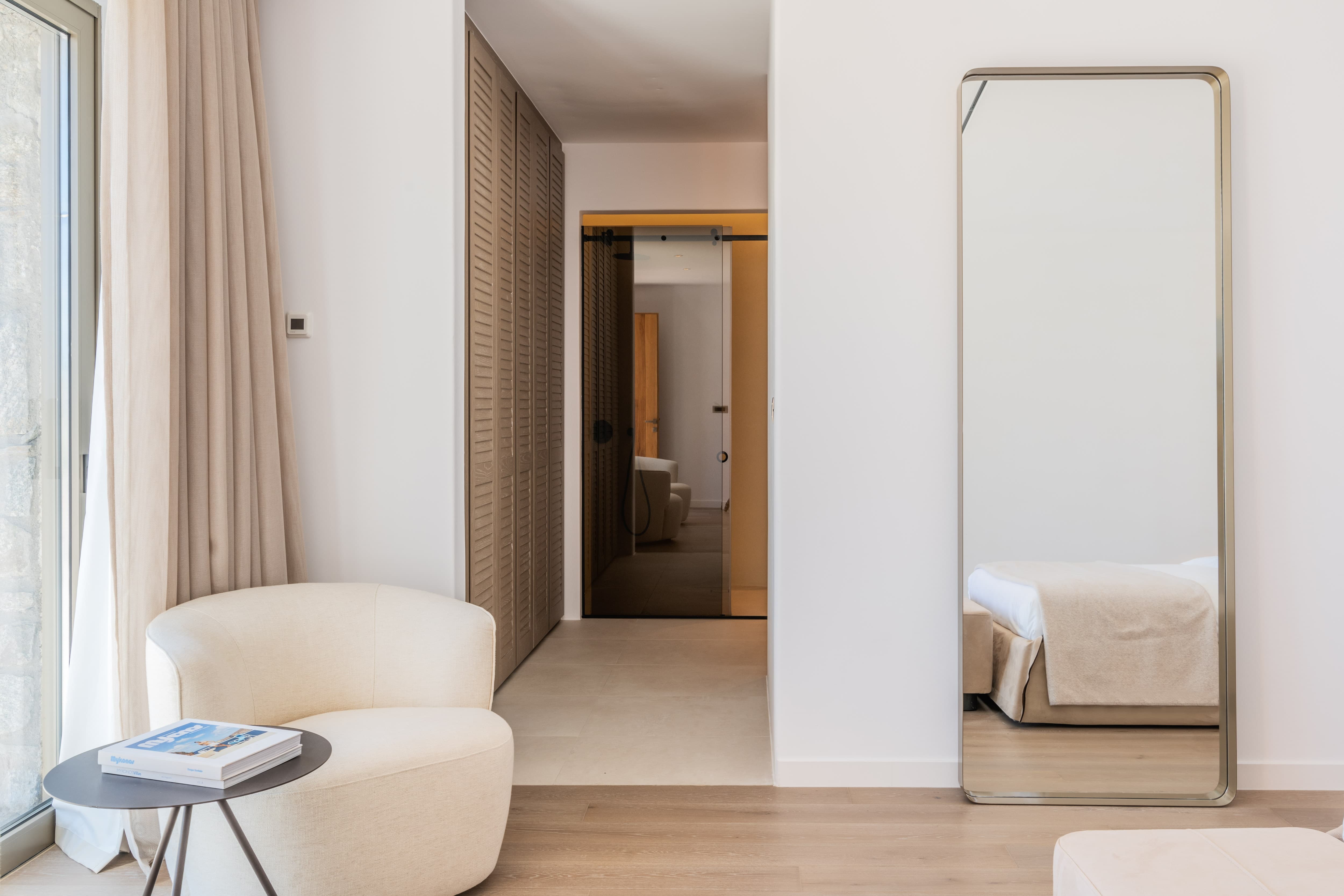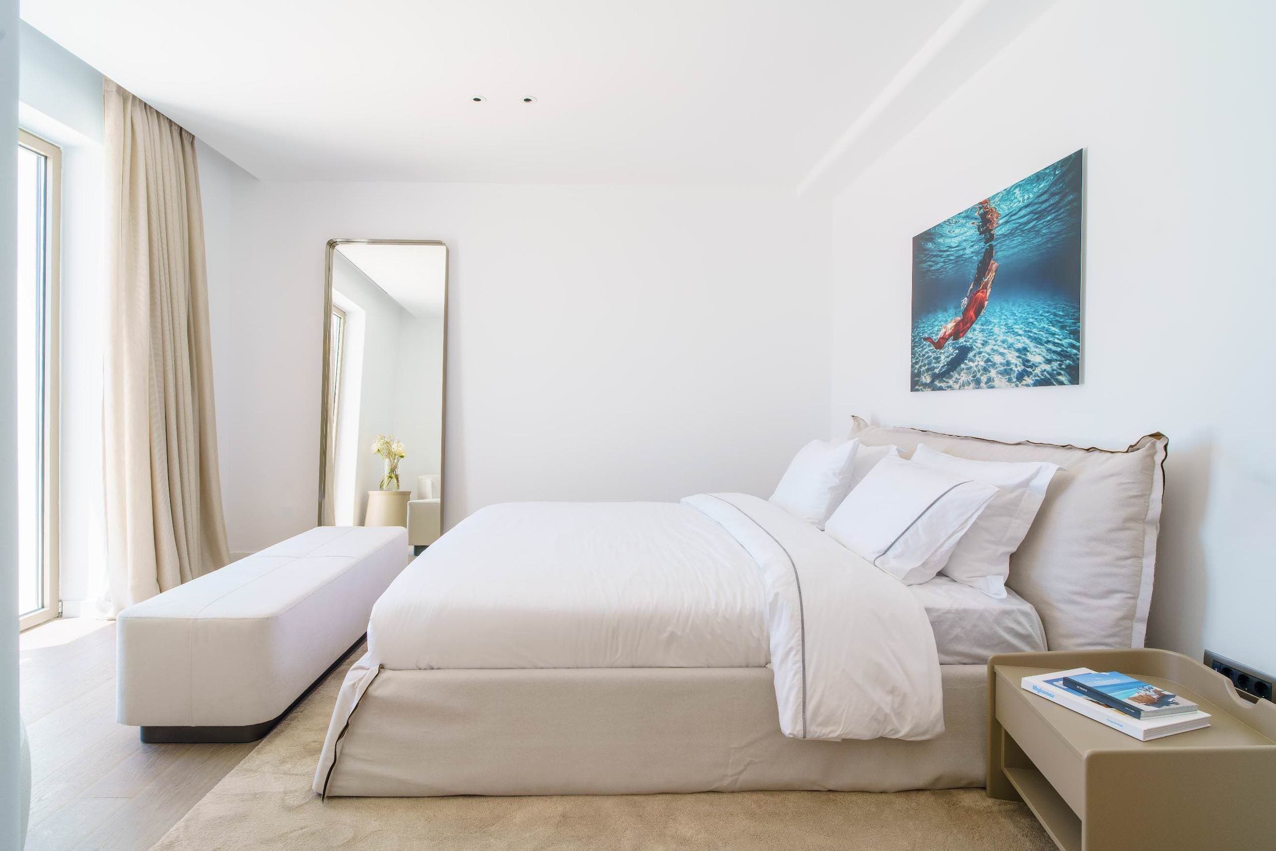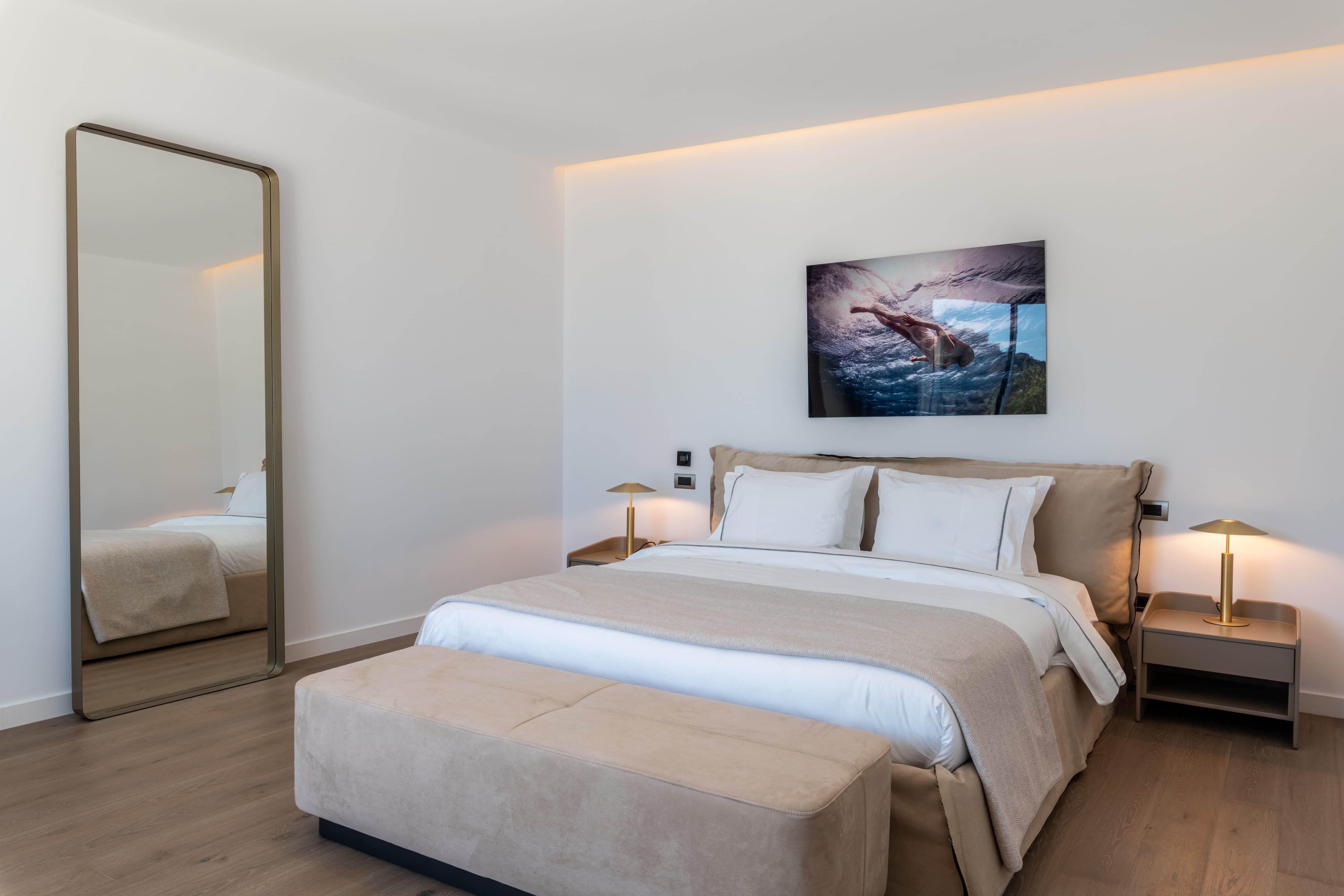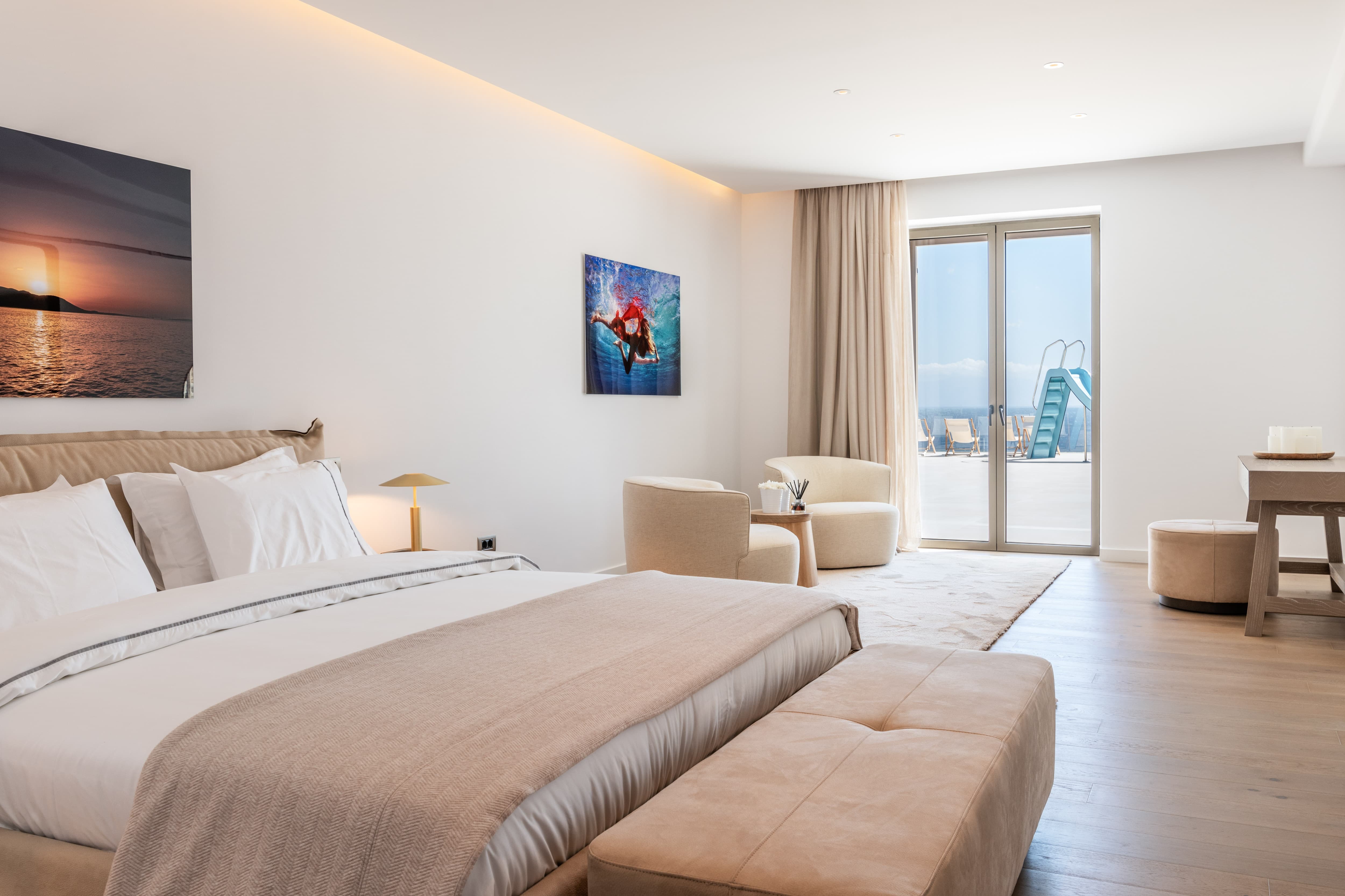 Eight beautifully appointed bedrooms, each with en-suite bathrooms, sea views, and direct access to outdoor terraces or pool areas. The master suite offers exceptional scale and privacy, while the remaining guest rooms maintain a consistent level of refined comfort. A dedicated children’s room features bunk beds, ideal for families. Laundry facilities are managed discreetly by the in-house team, with daily housekeeping and turndown service included.