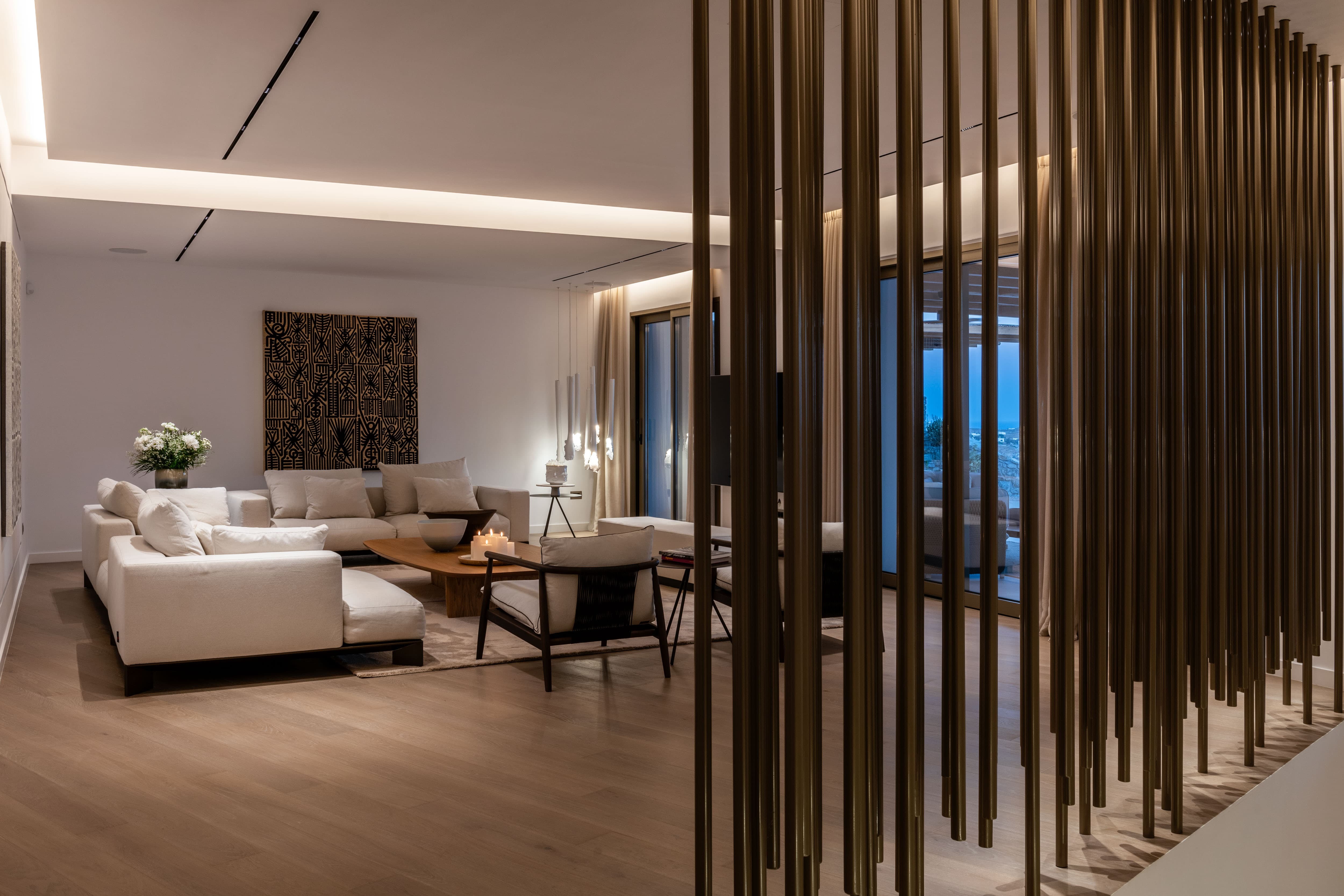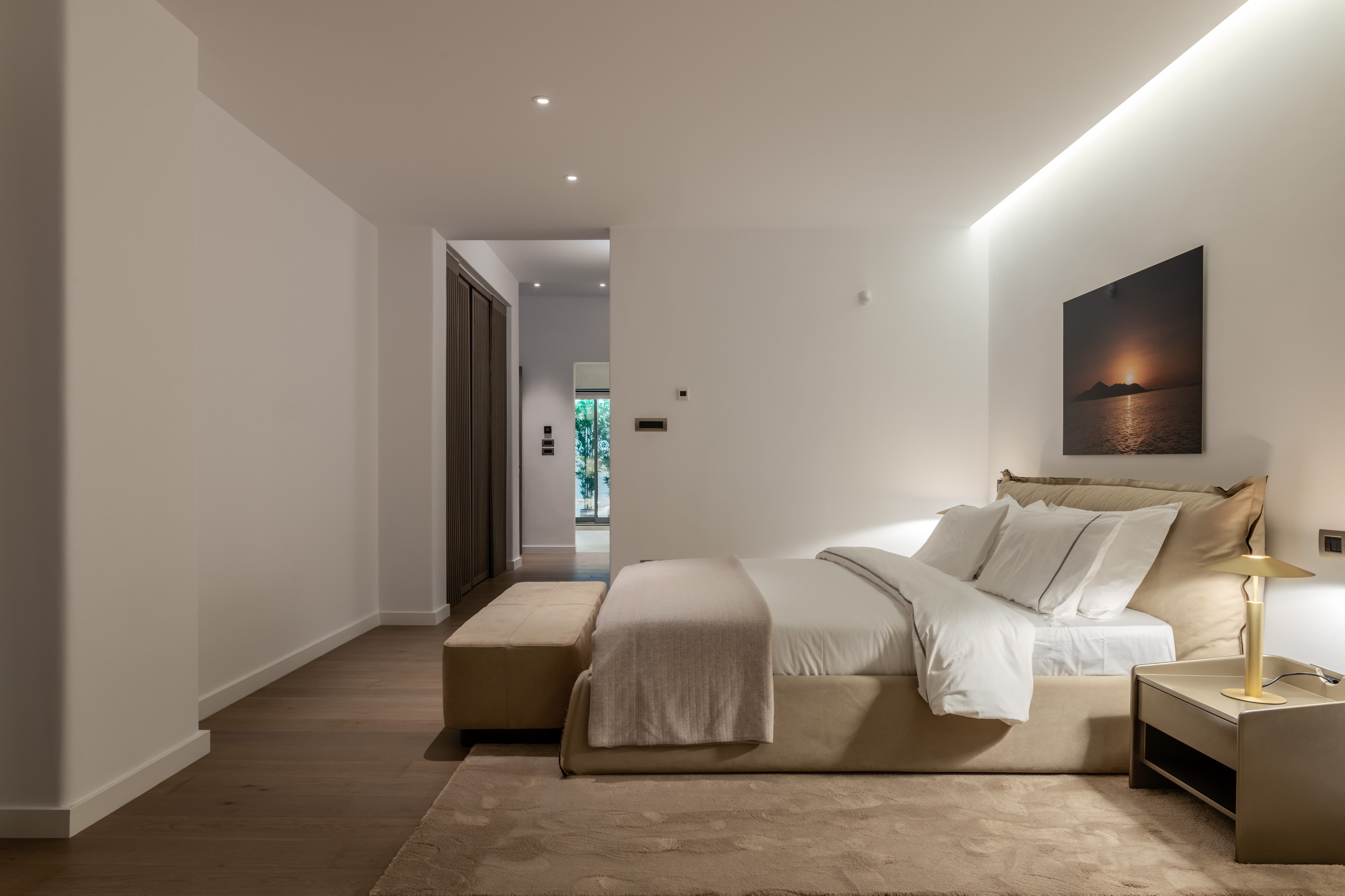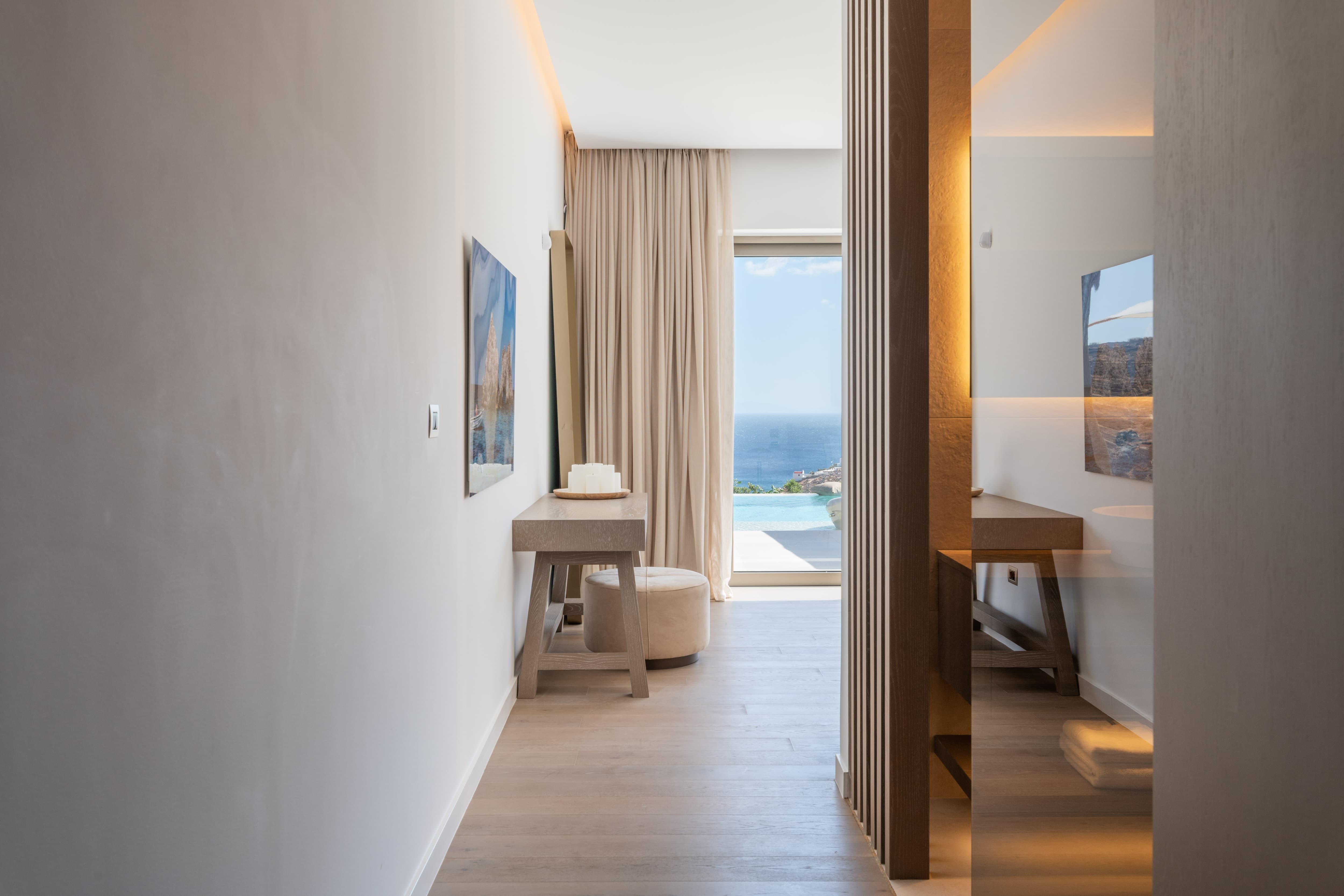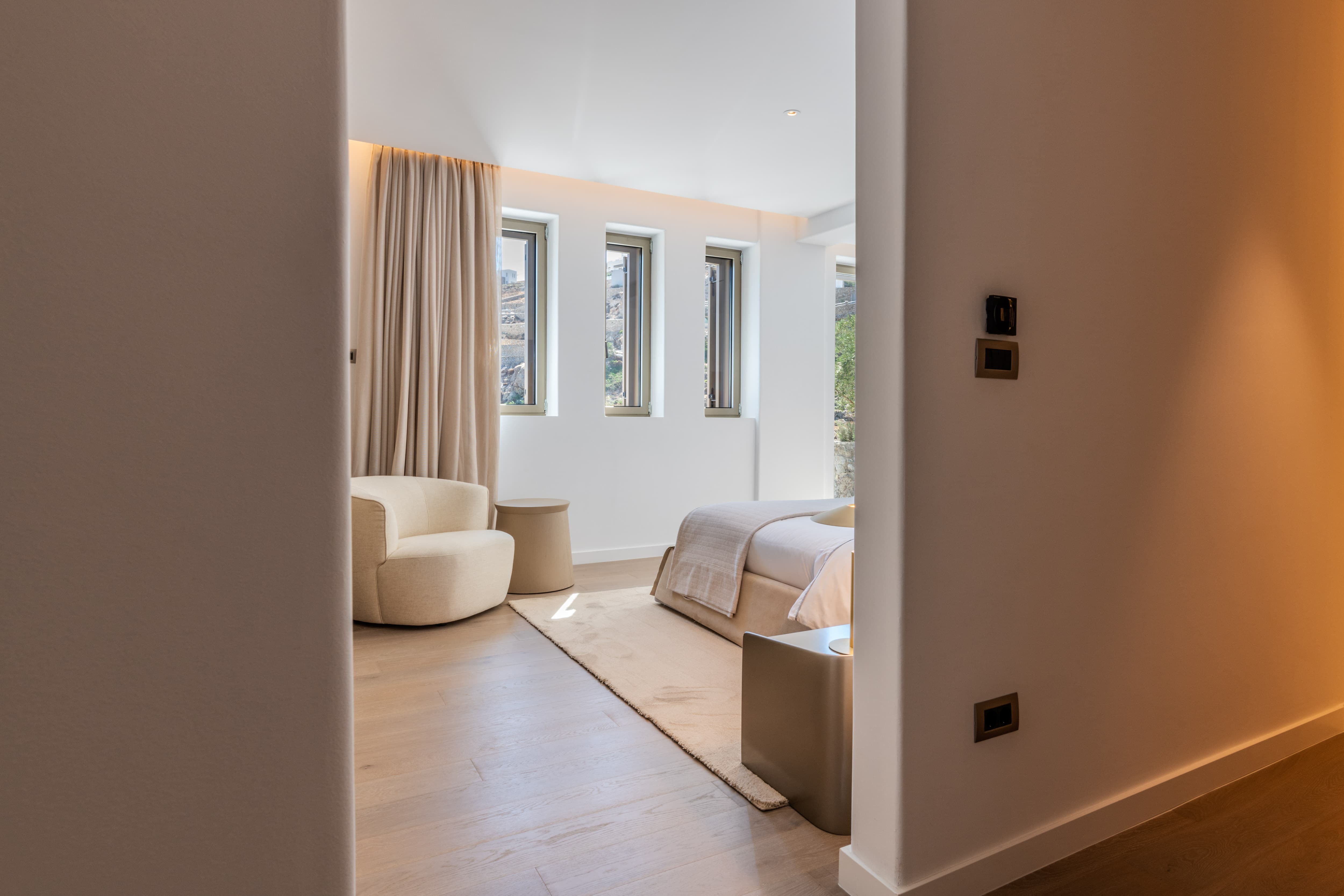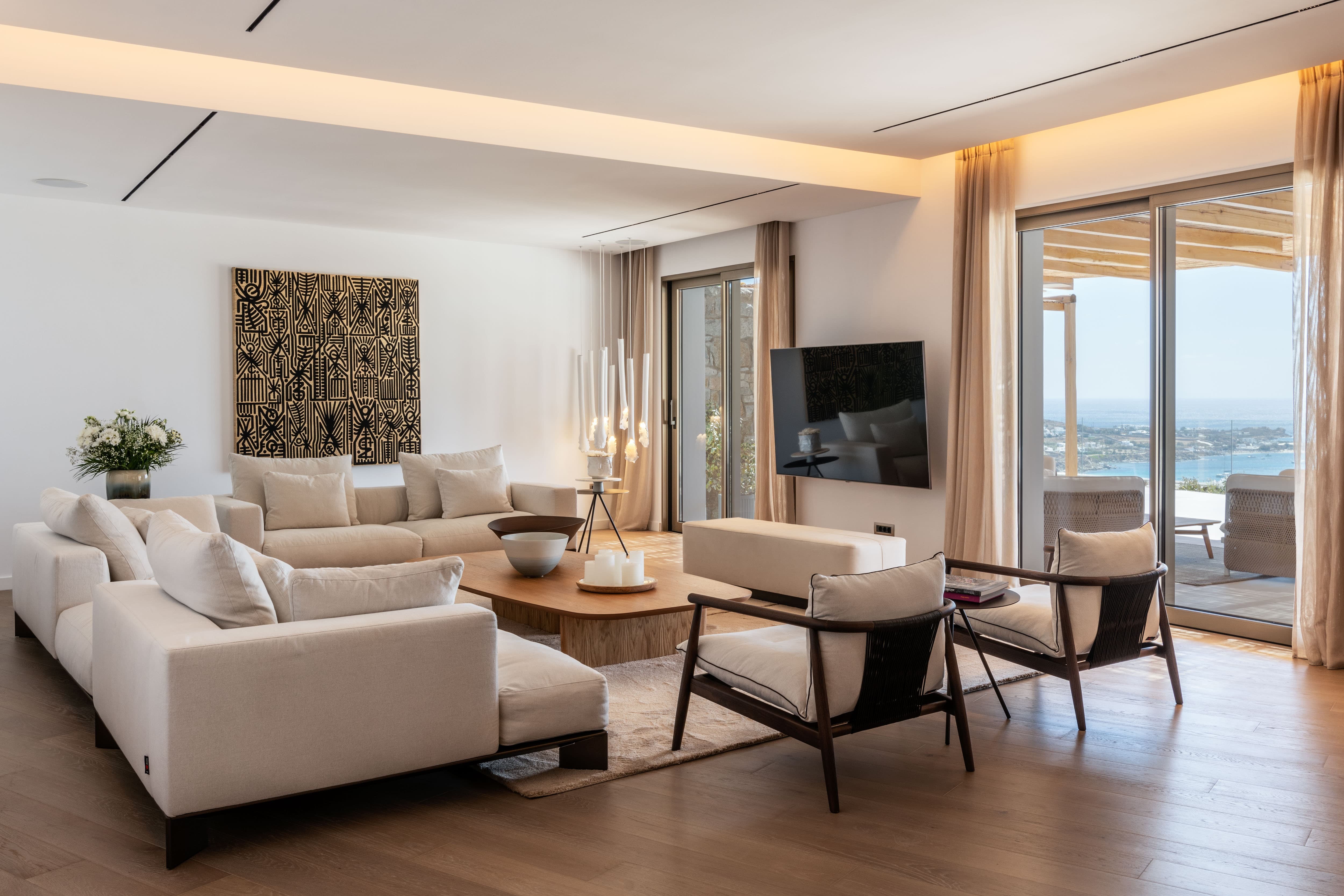 From the very first approach, the villa reveals itself gradually, carved into the hillside with a sense of calm authority. Soft stone, clean white lines, and wide open terraces draw the outside in, allowing the sea to become part of the architecture itself. Every angle has been considered, every line designed to frame the view.