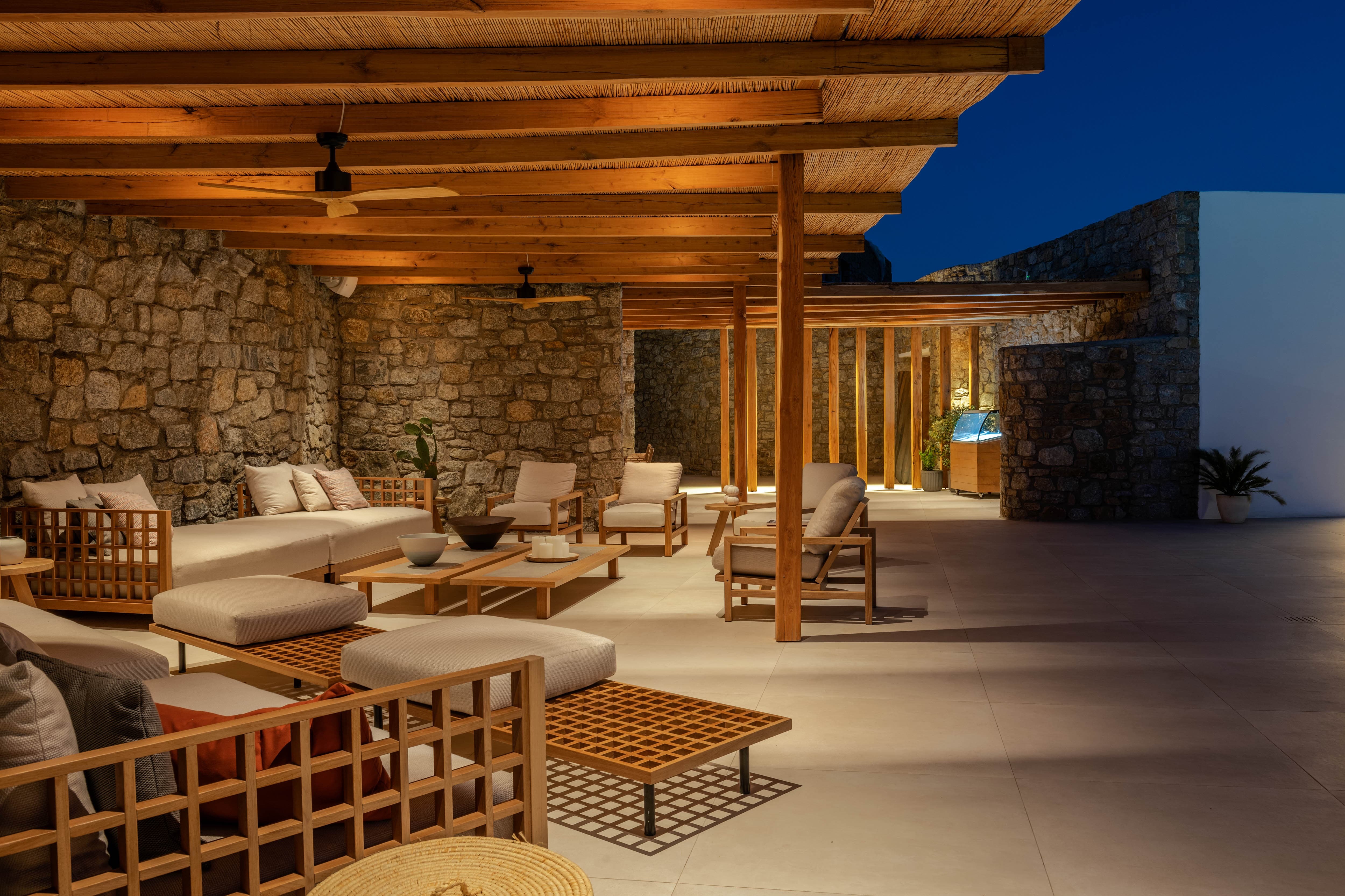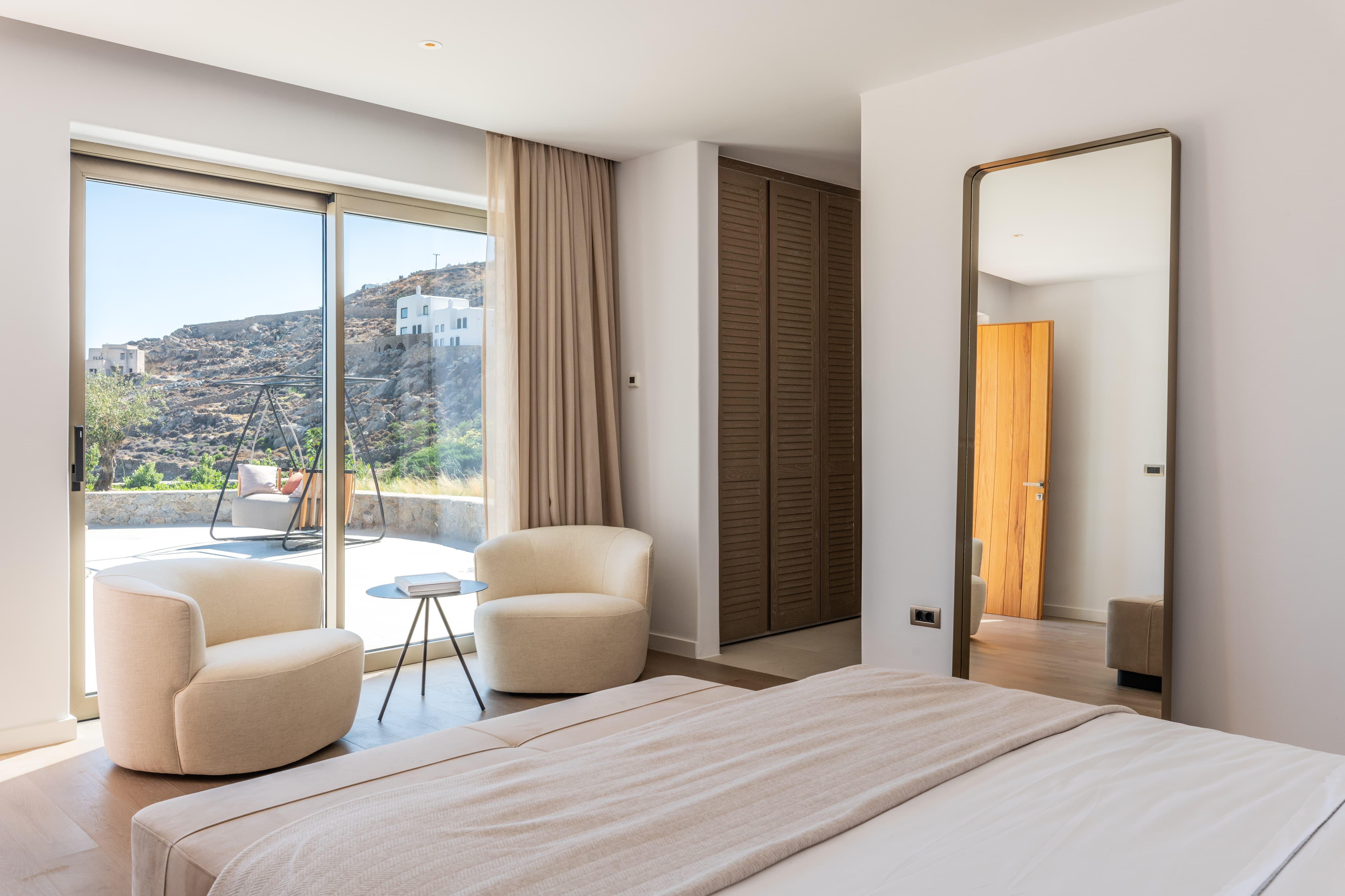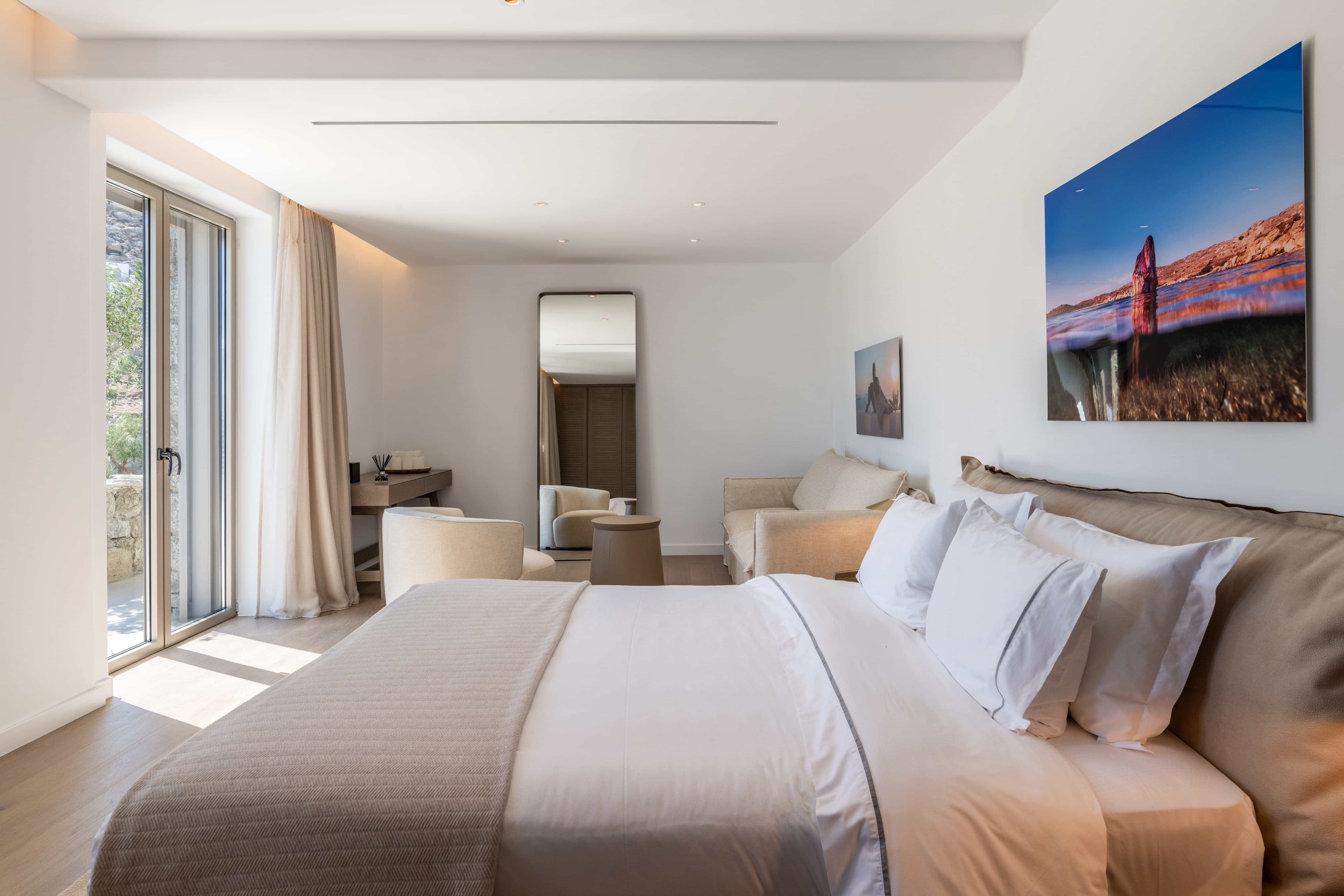 Positioned above Psarou Bay, one of Mykonos’ most prestigious locations, the villa offers panoramic views across the Aegean and surrounding coastline. Within walking distance to Psarou Beach and Nammos Village, guests benefit from both privacy and immediate access to the island’s most sought-after destinations.