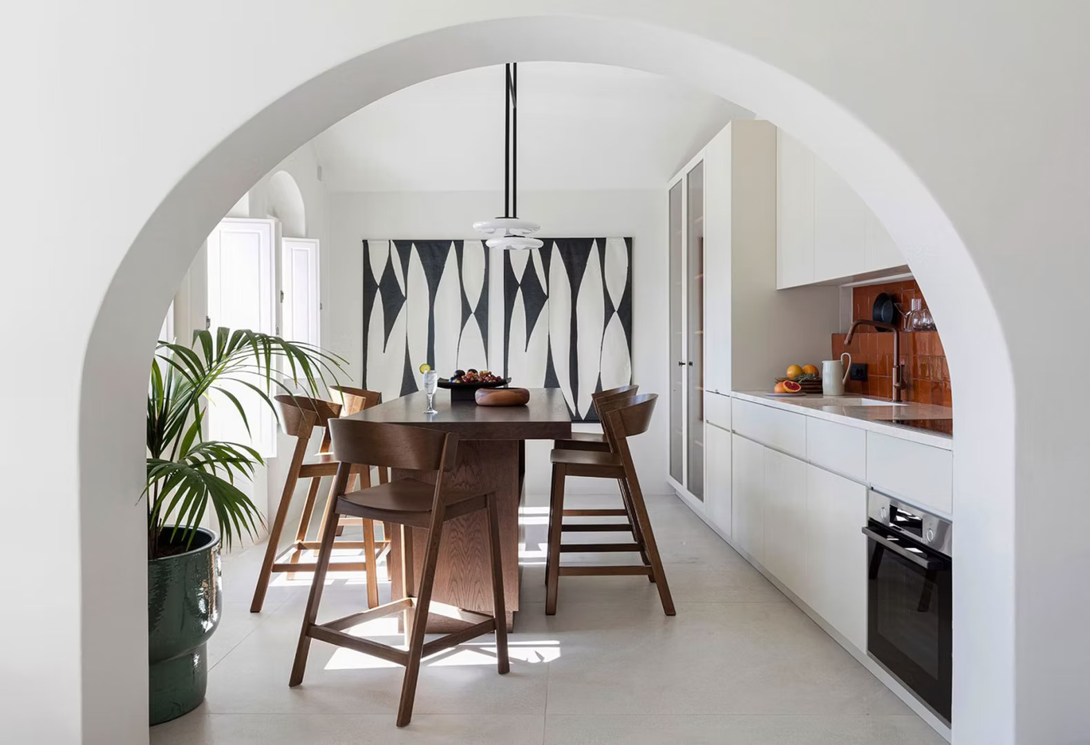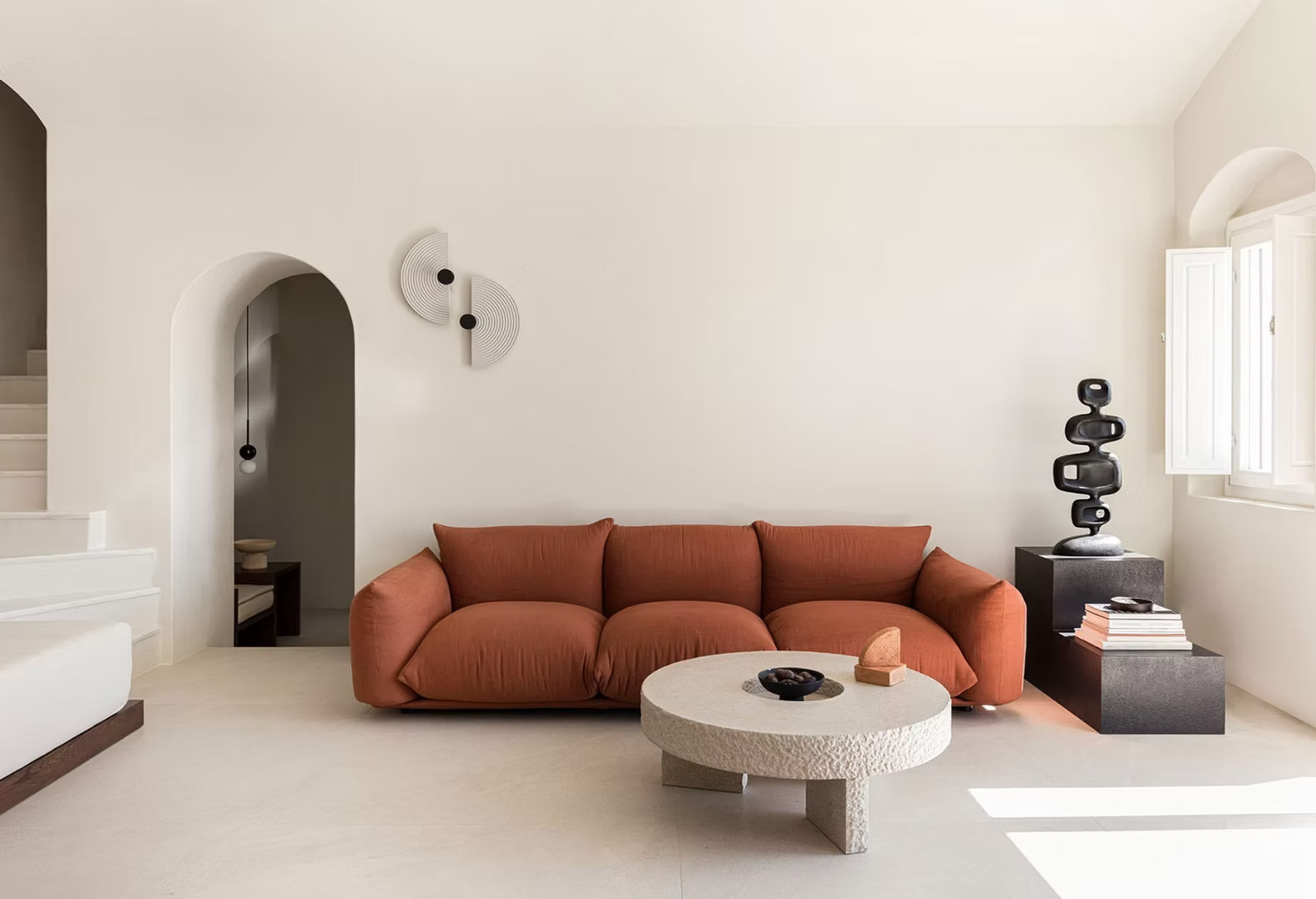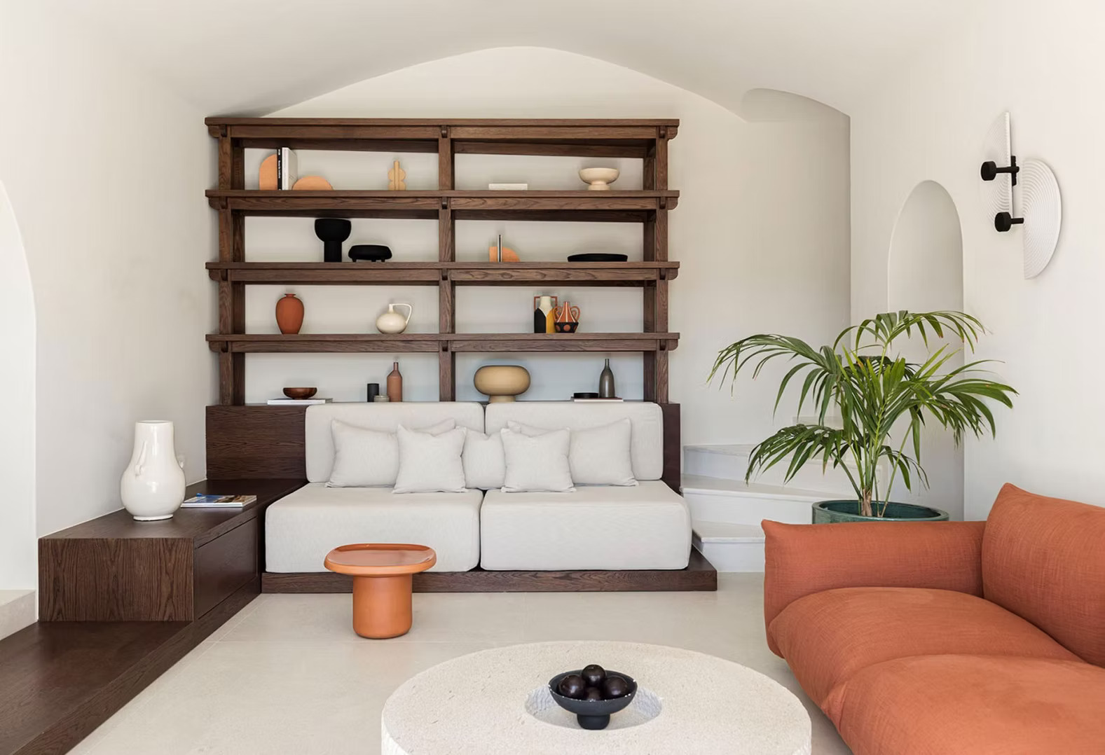 The villa offers one principal living area arranged as a cosy yet elegant lounge with an adjoining dining space. Spanning approximately 120 square metres, the interiors are shaped by whitewashed walls, soft architectural curves, and carefully framed openings that draw the caldera into view. Natural light floods the space throughout the day, creating an atmosphere that feels calm, expansive, and intimately connected to the horizon.