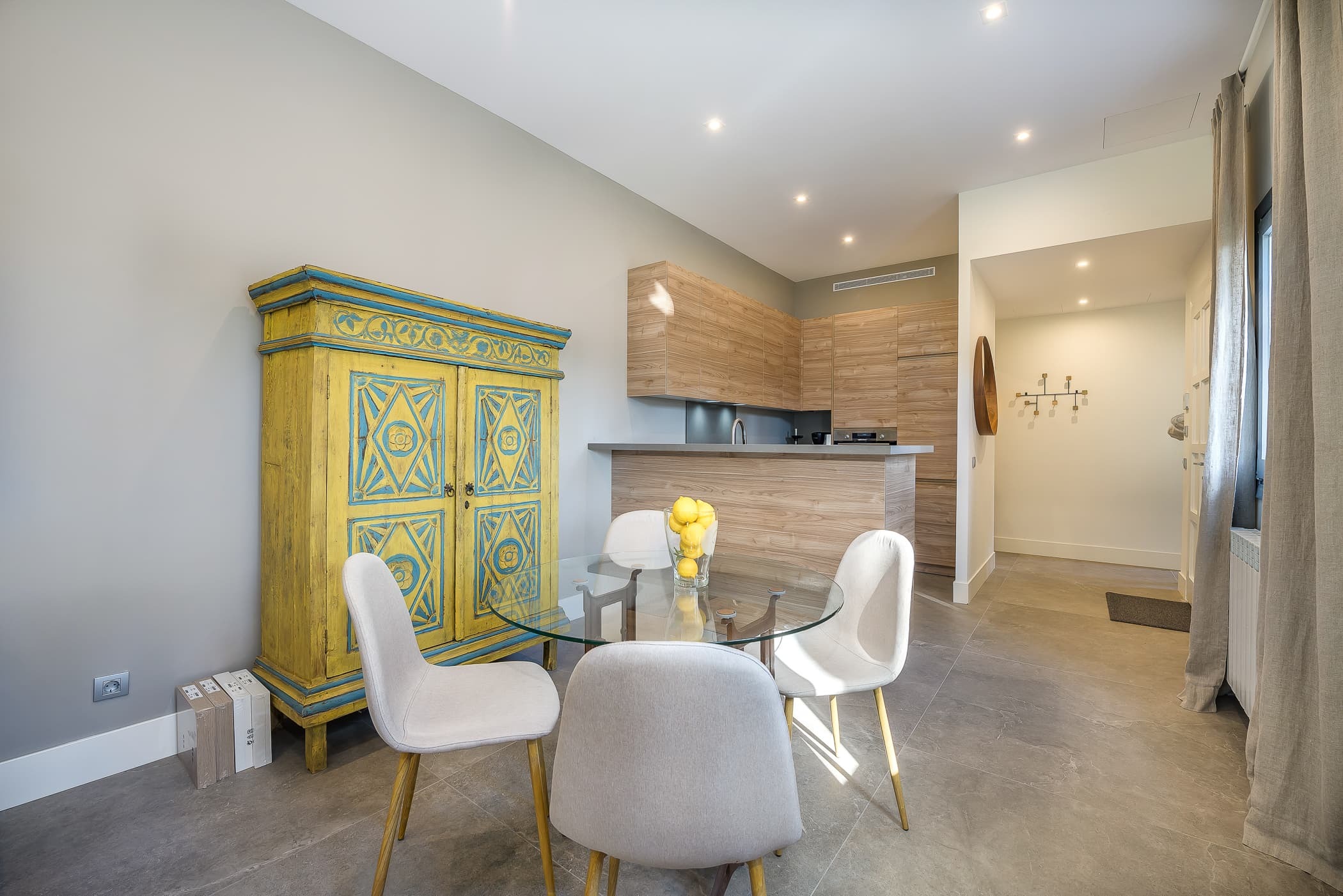 A fully equipped designer kitchen forms the heart of the home, flowing into a relaxed dining area designed for shared moments. From casual breakfasts to long evening meals, the space transitions naturally onto the surrounding terraces.