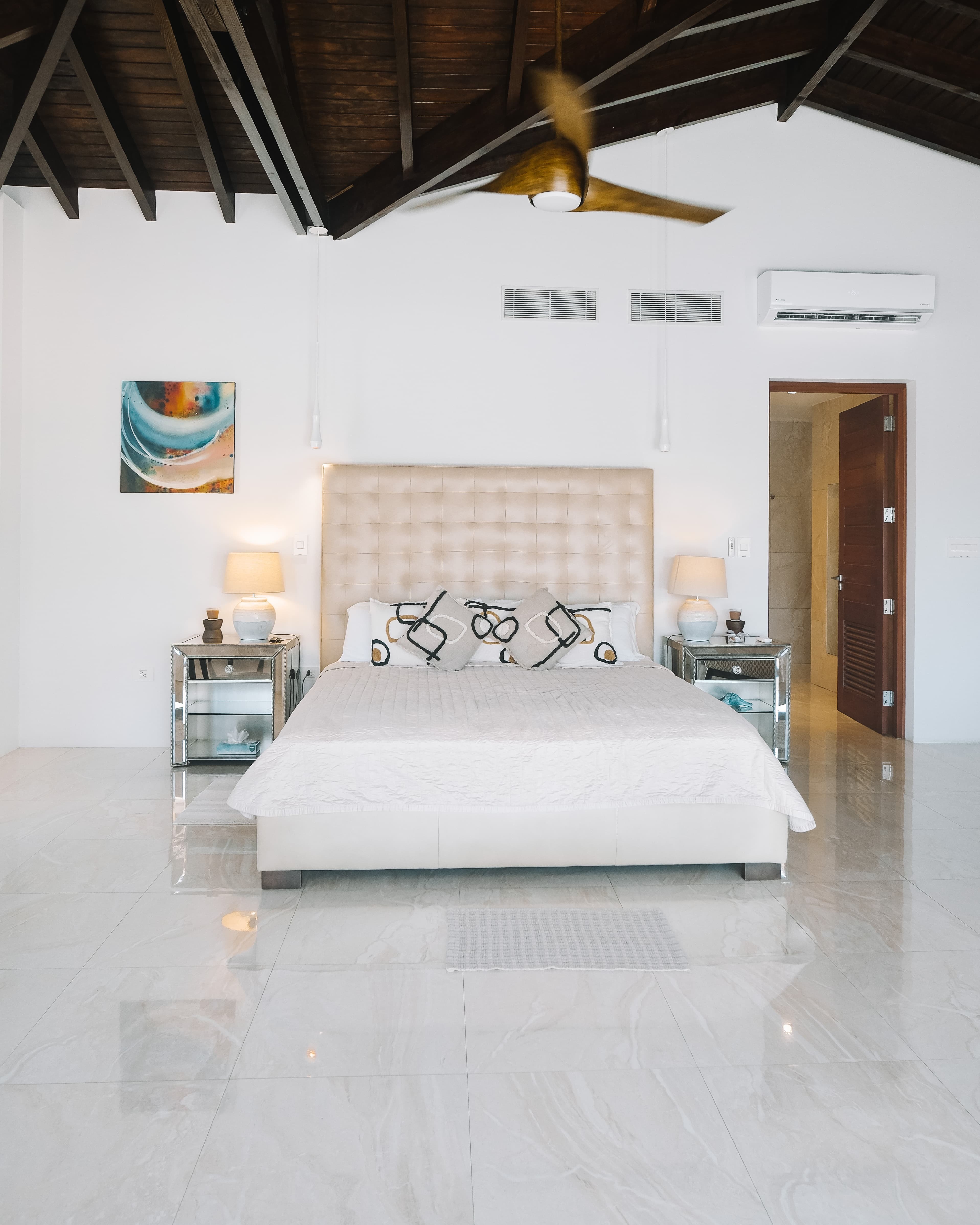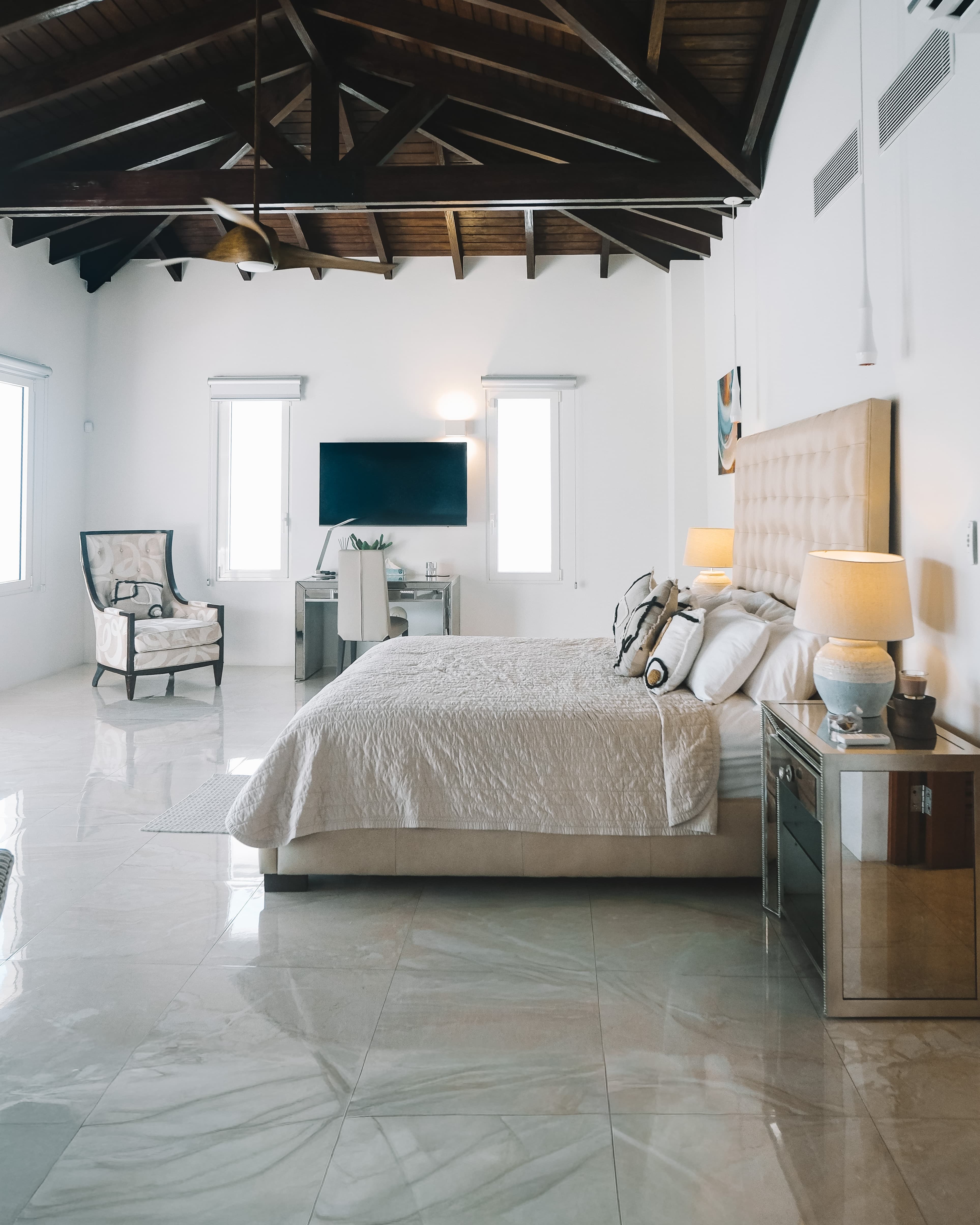 Expansive yet welcoming, the villa’s interiors are defined by whitewashed walls, rounded archways, marble flooring, and peaked wooden ceilings that frame uninterrupted sea views. Open-plan lounges flow seamlessly onto terraces, allowing indoor and outdoor living to merge effortlessly, with the Caribbean light and ocean breeze ever-present.