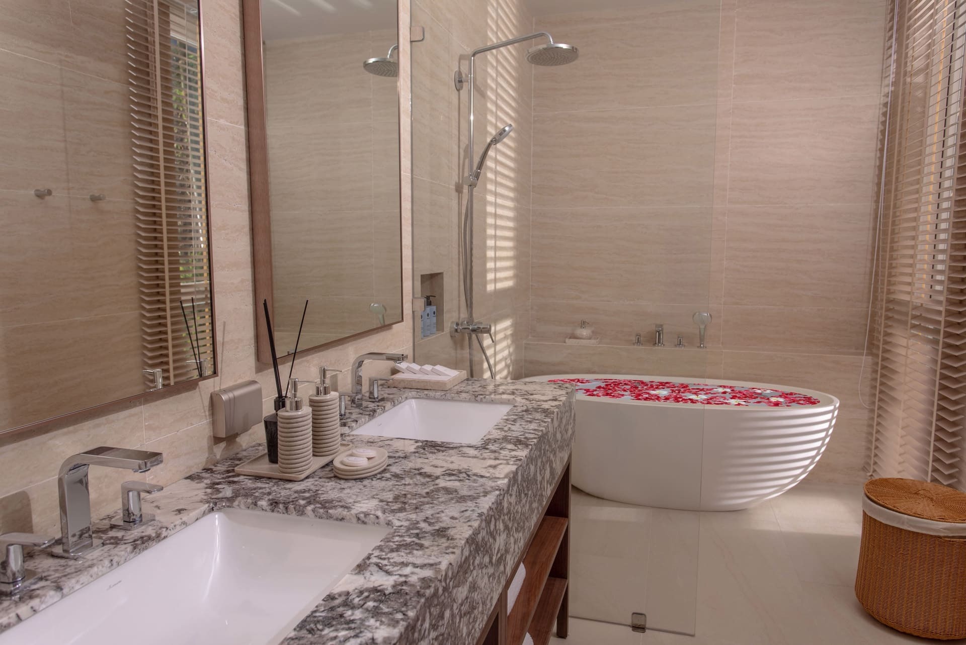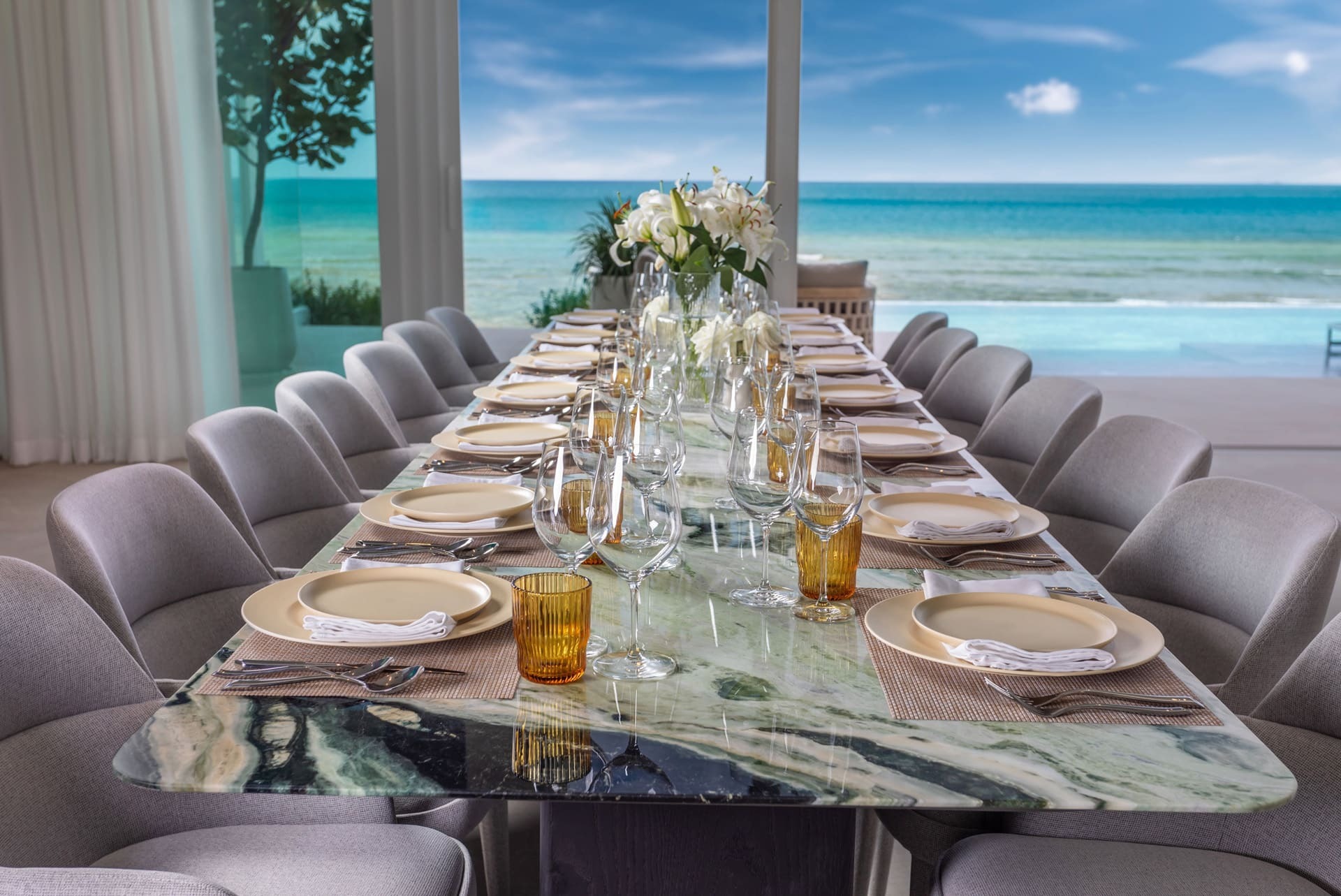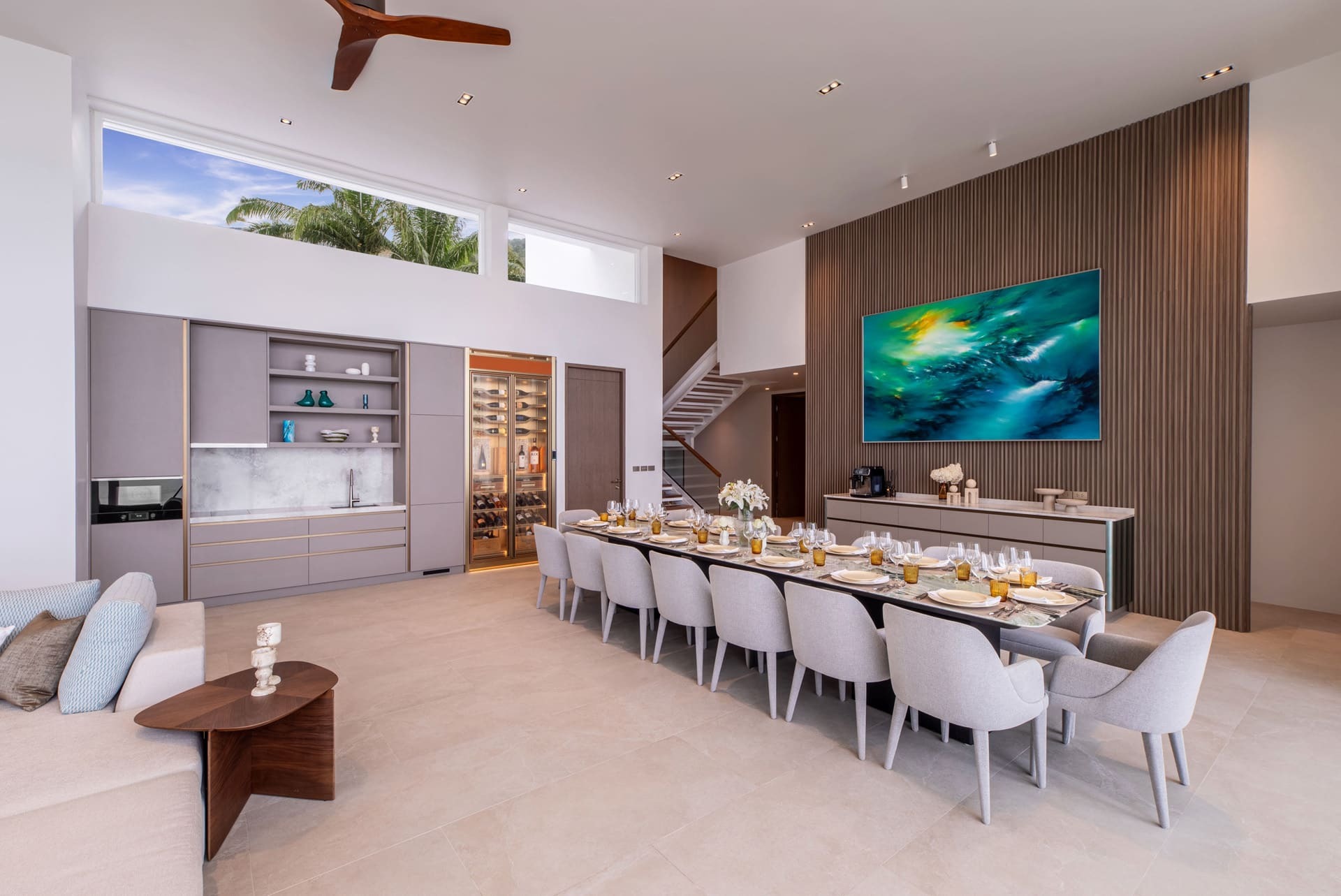 The villa features one expansive open-plan living area designed to maximise sea views and indoor–outdoor flow. This central space connects directly to the pool deck and beachfront, with generous seating for socialising and relaxed gatherings, complemented by ocean-facing dining areas.