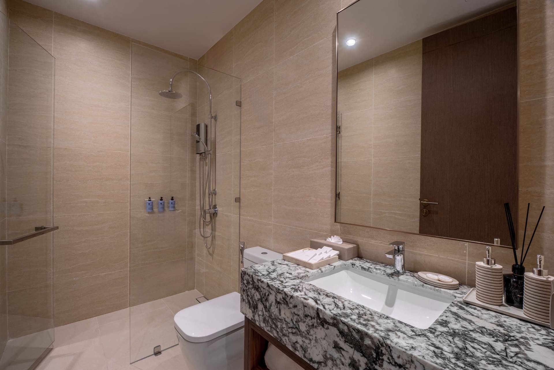 The villa includes 8 en-suite bathrooms, one per bedroom, finished to a high standard. An outdoor shower is also available for beach and pool use.