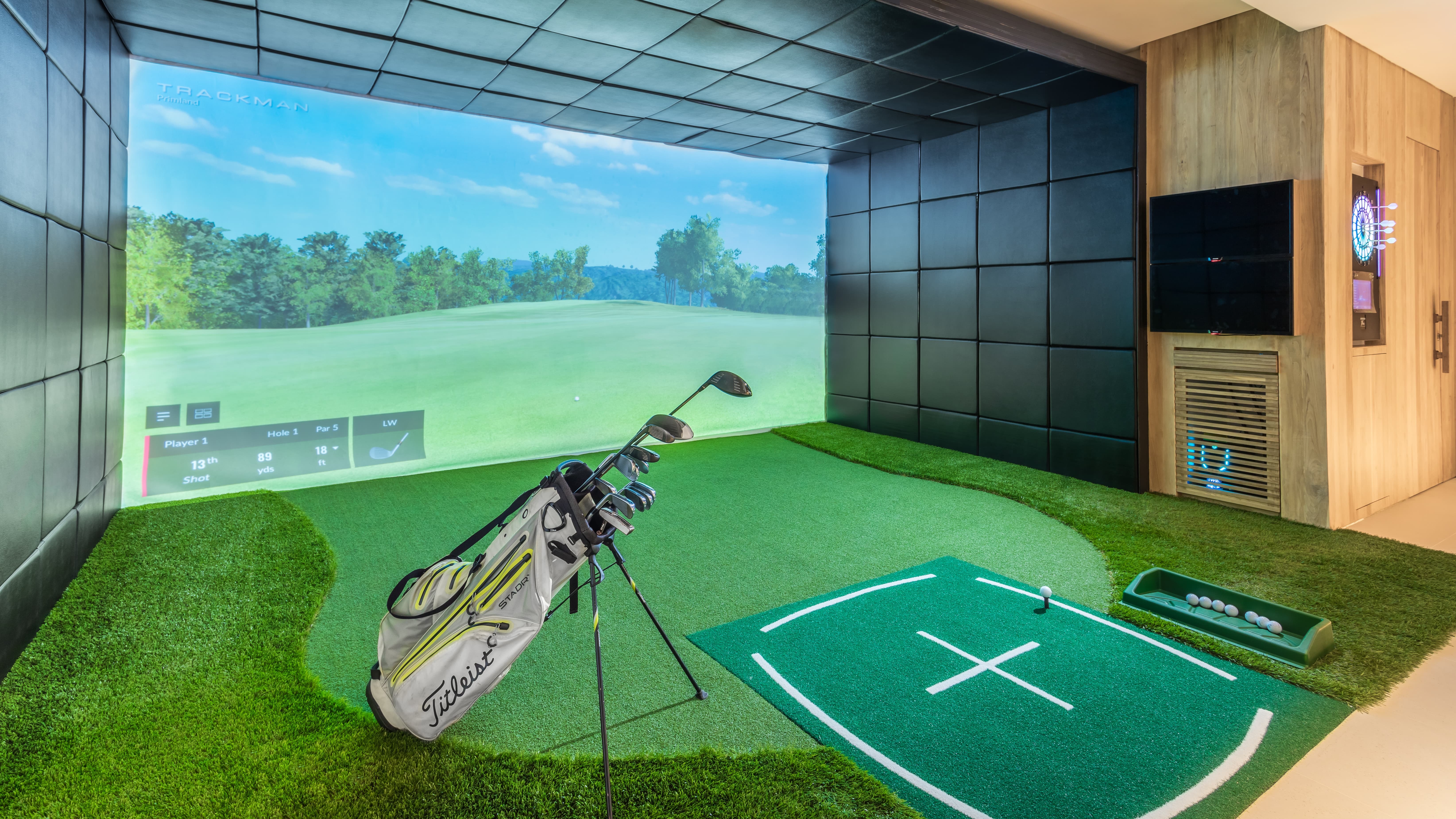 Leisure is thoughtfully integrated throughout the estate. Two infinity pools appear to blend into the horizon, accompanied by two Jacuzzis for complete relaxation. The main pool’s waterfall feature introduces a calming focal point, while the rooftop bar, complete with its own Jacuzzi, creates a spectacular setting for sunset gatherings. Indoors, a private cinema room invites relaxed movie evenings, while the entertainment lounge features a pool table. A dedicated games room with golf simulator adds a distinctive touch for enthusiasts.