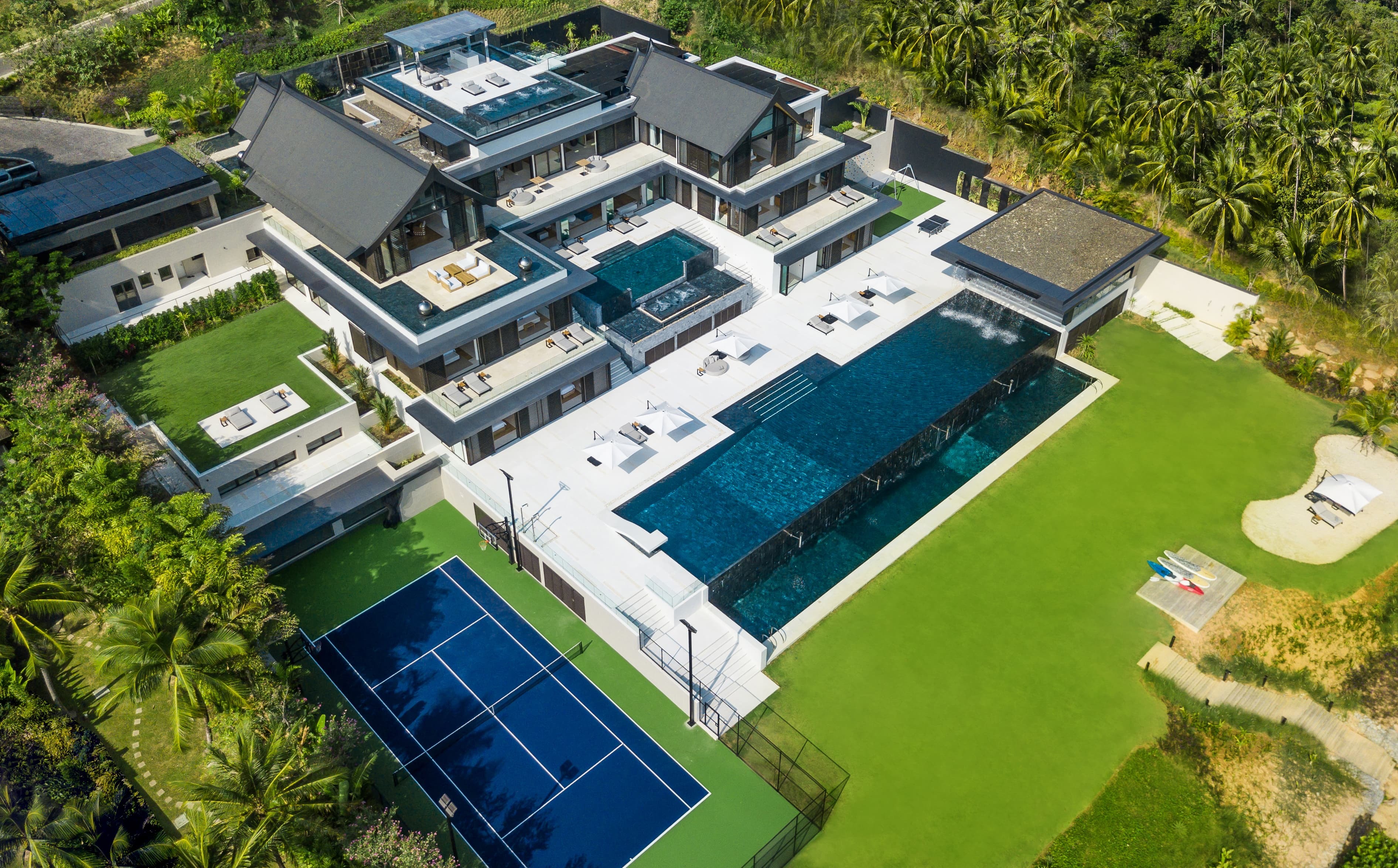 Outdoor living lies at the very heart of the Amaravida experience, where architecture and landscape dissolve into one another beneath wide tropical skies. Two infinity pools stretch towards the horizon, their still surfaces reflecting the shifting blues of sea and sky. Nearby, twin Jacuzzis offer quieter moments of immersion, whether at sunrise or beneath a canopy of stars. The gentle sound of water cascading from the main pool’s waterfall creates a soothing rhythm to long, sun-drenched afternoons. A shaded poolside sala provides an elegant setting for open-air lunches and candlelit barbecues, while above, the rooftop bar commands panoramic views across the Andaman Sea. With its own Jacuzzi and generous seating, it becomes the natural gathering place as dusk settles and the sky softens into gold and indigo. Beyond the terraces, expansive landscaped gardens unfold across the estate. Private tennis, basketball and squash courts offer opportunities for spirited play, while wide lawns and a dedicated children’s playground ensure that every generation finds space to move, explore and unwind. Multiple terraces and viewing decks are thoughtfully positioned to capture different moods of the day, from quiet sunrise reflections to dramatic sunset vistas over the ocean. Here, outdoor living is not an addition to the villa, but its defining spirit.