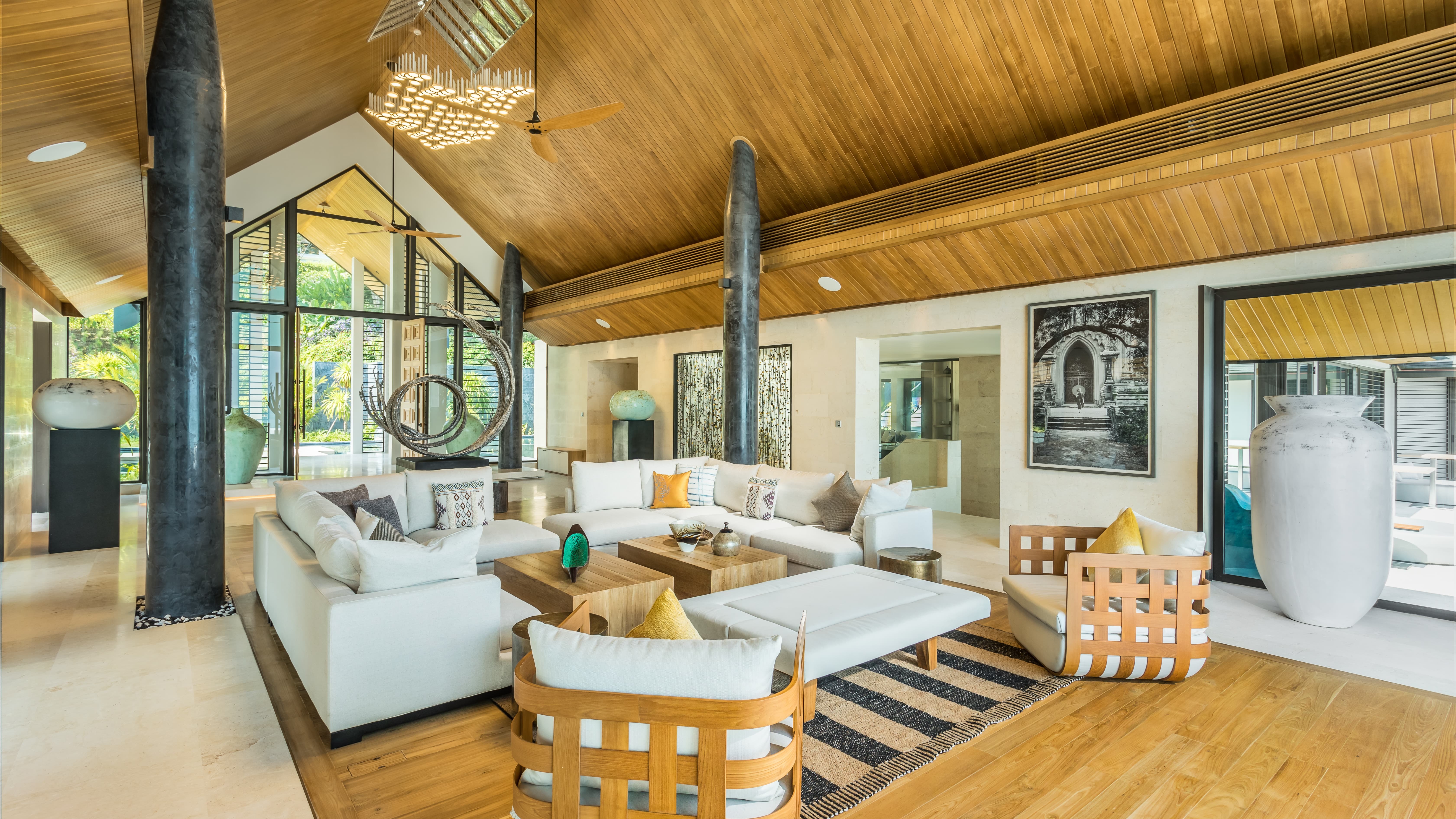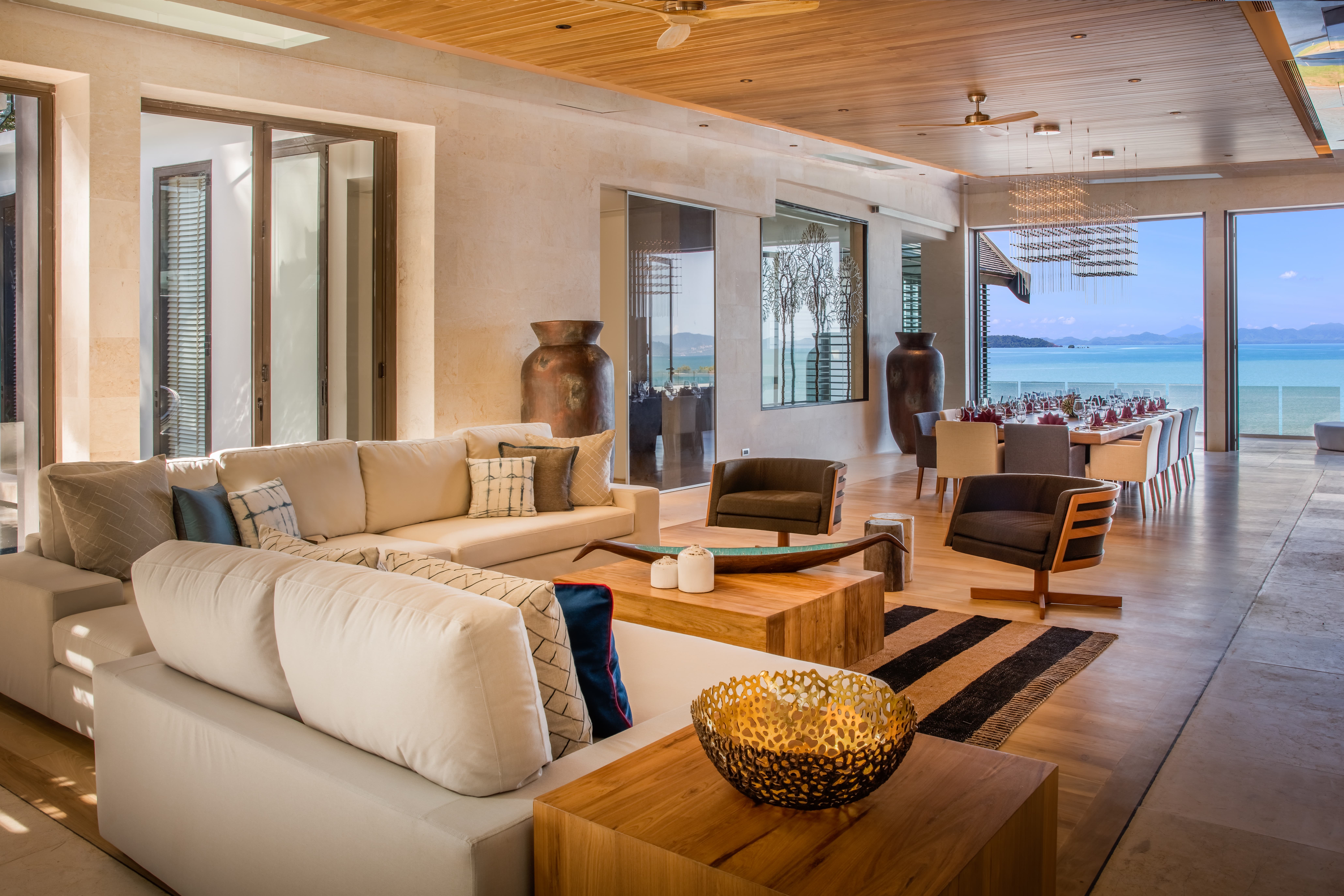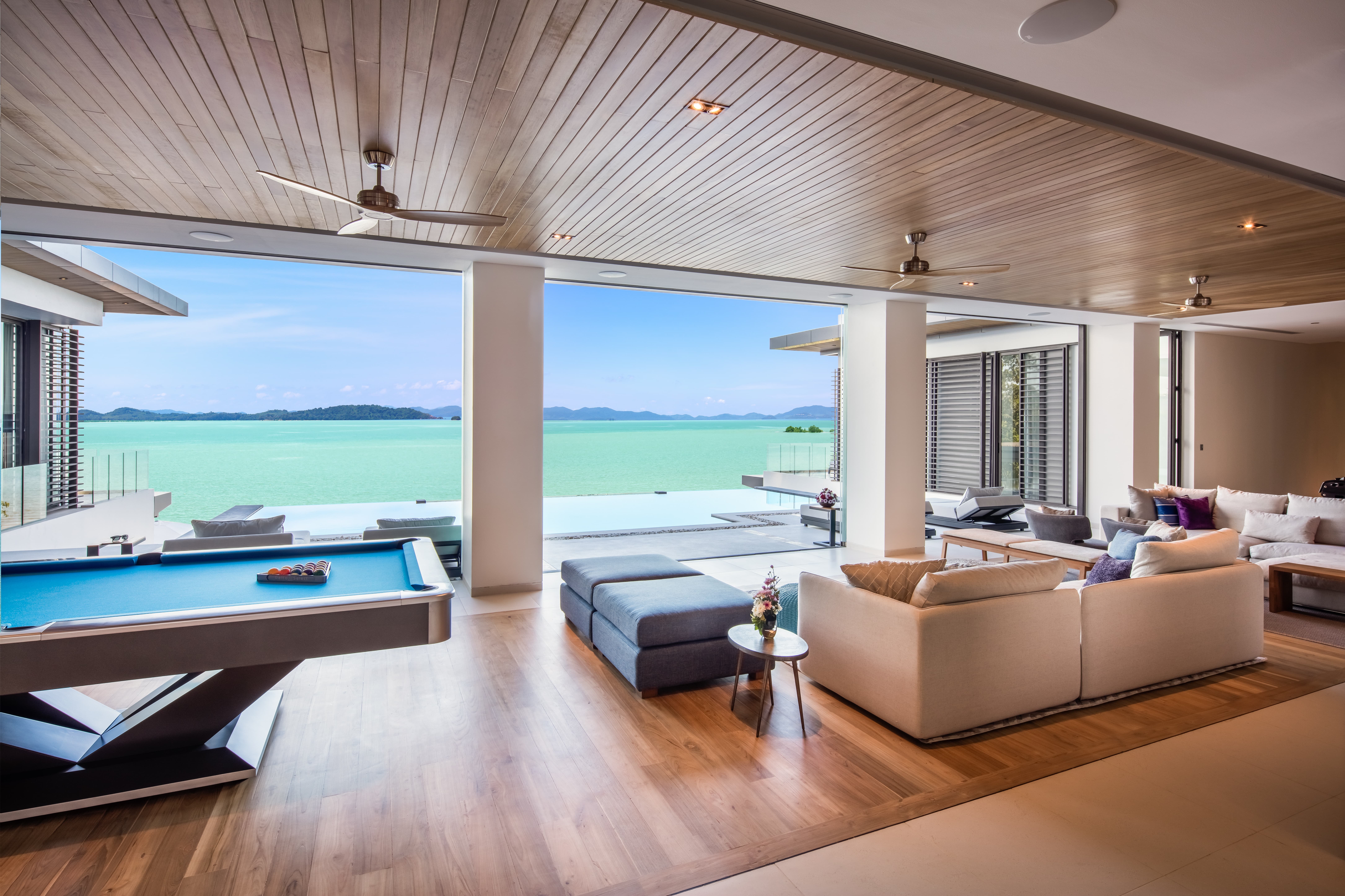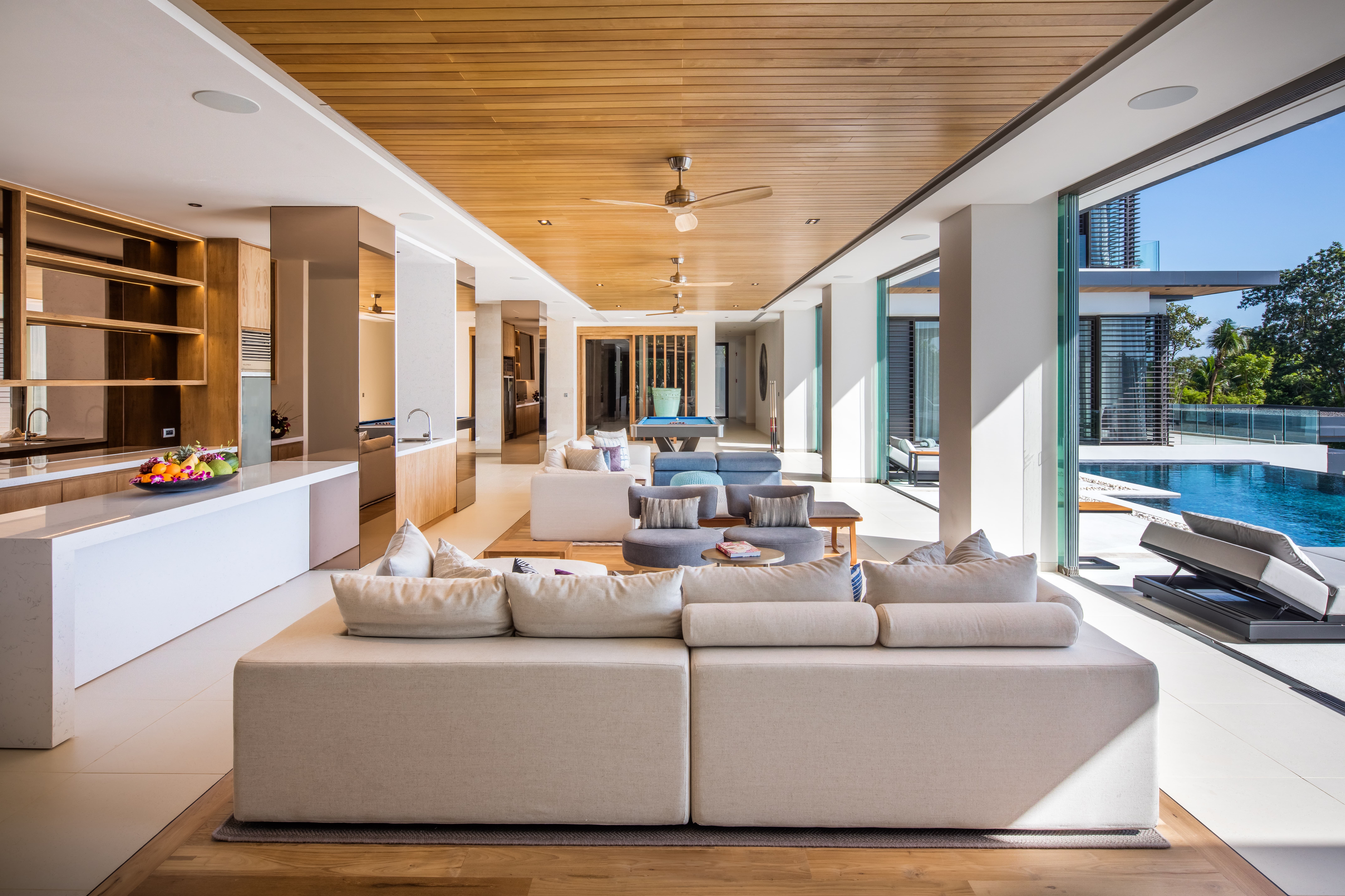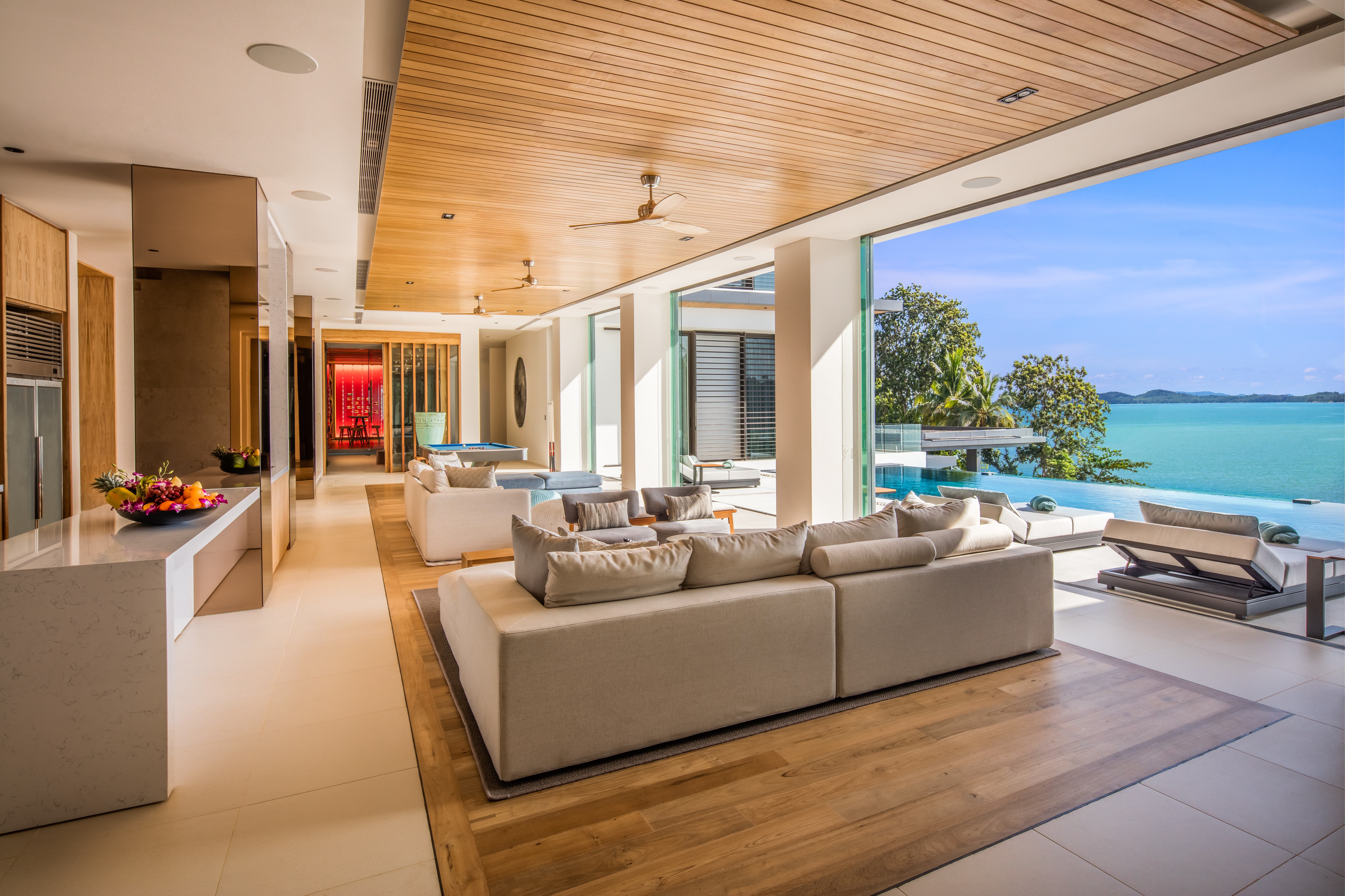 Arranged across four expansive levels, the villa unfolds with architectural confidence and effortless flow. At its heart lies a dramatic high-ceiling main lounge, where floor-to-ceiling glass frames uninterrupted views of the Andaman Sea. Light moves beautifully through the space from morning to dusk, enhancing the sense of openness and calm. Multiple living areas provide generous room for gathering, whether for celebratory evenings or quiet afternoons. Interiors transition seamlessly onto wide terraces, allowing indoor and outdoor living to merge into one continuous, ocean-facing experience.