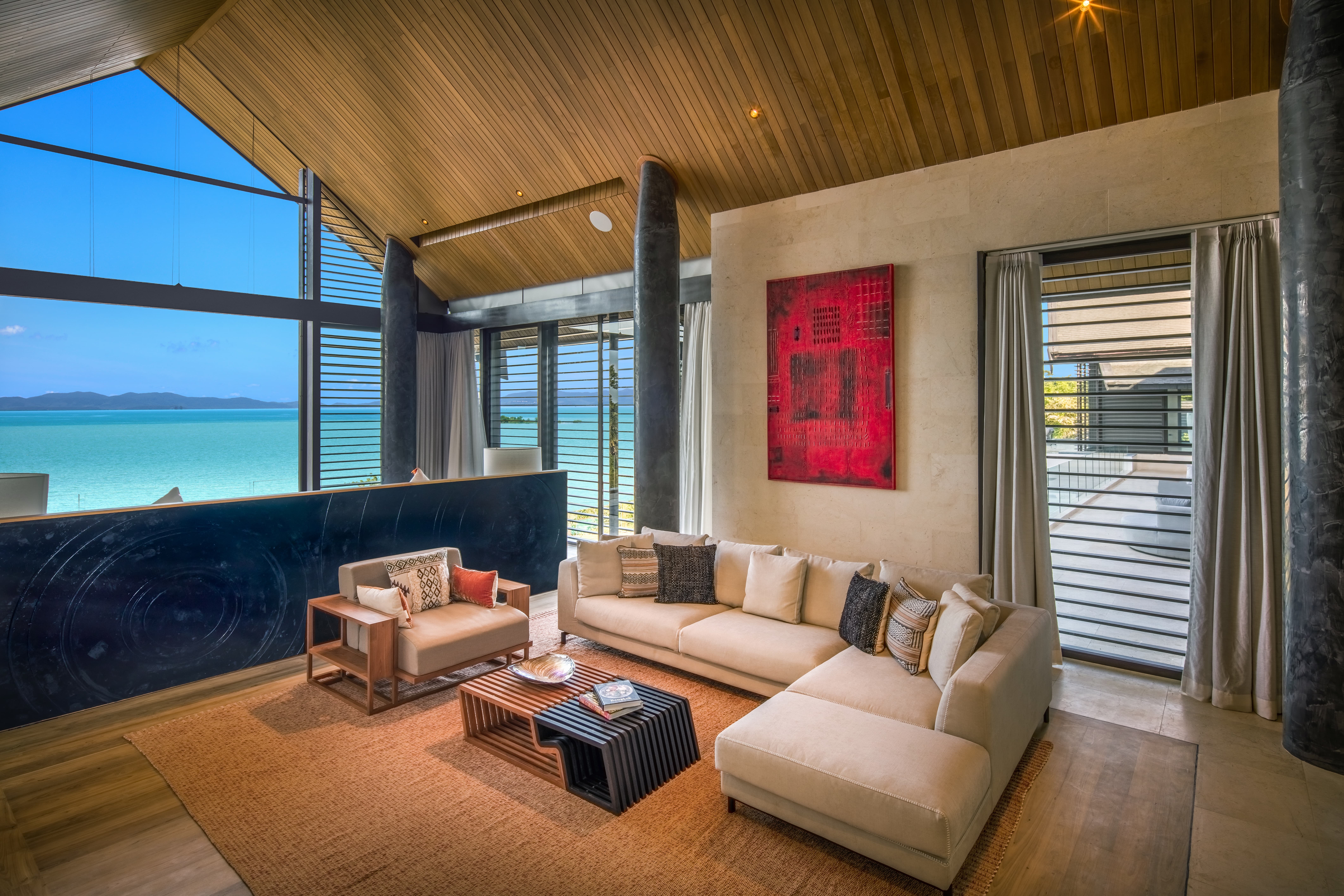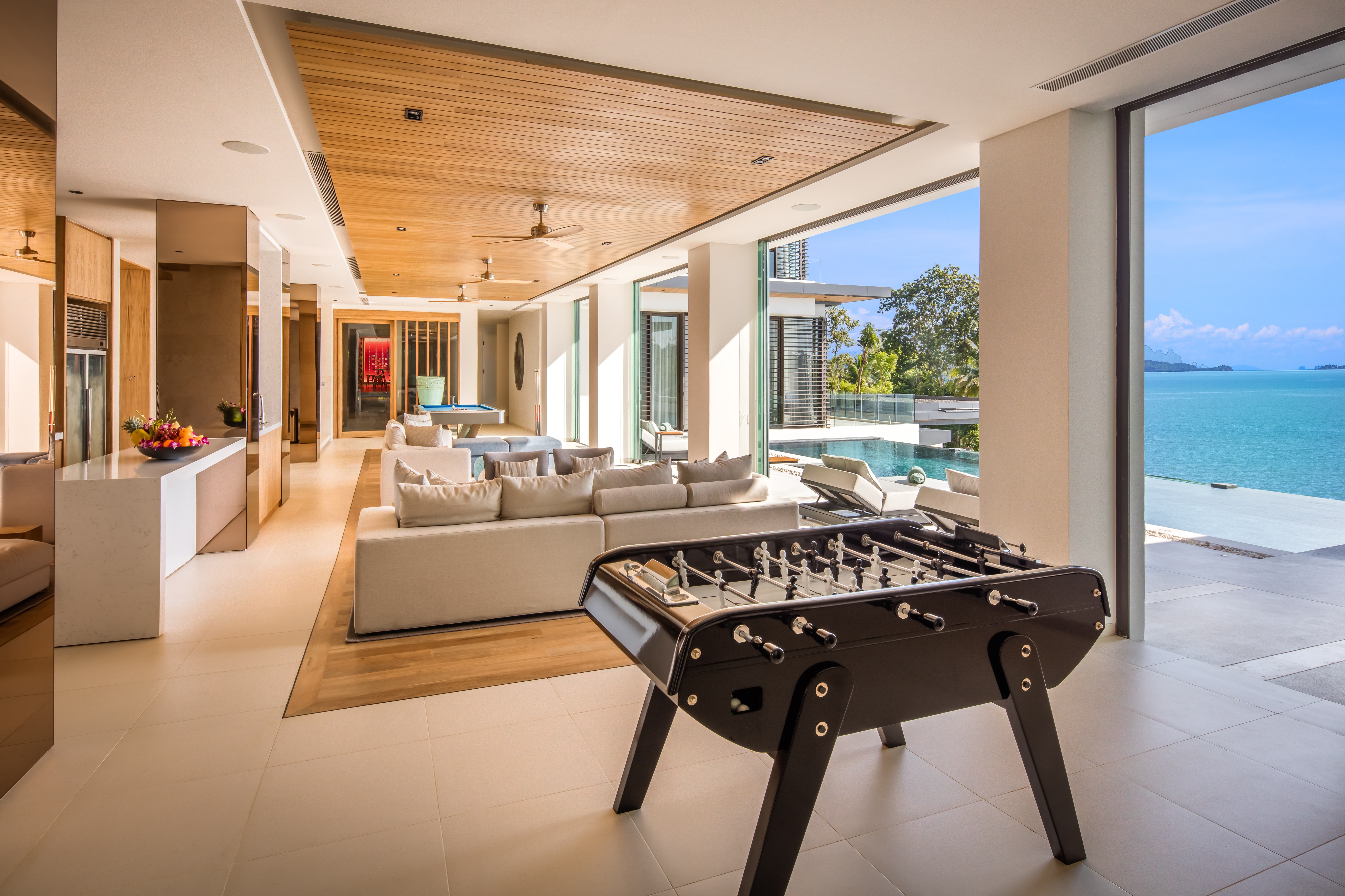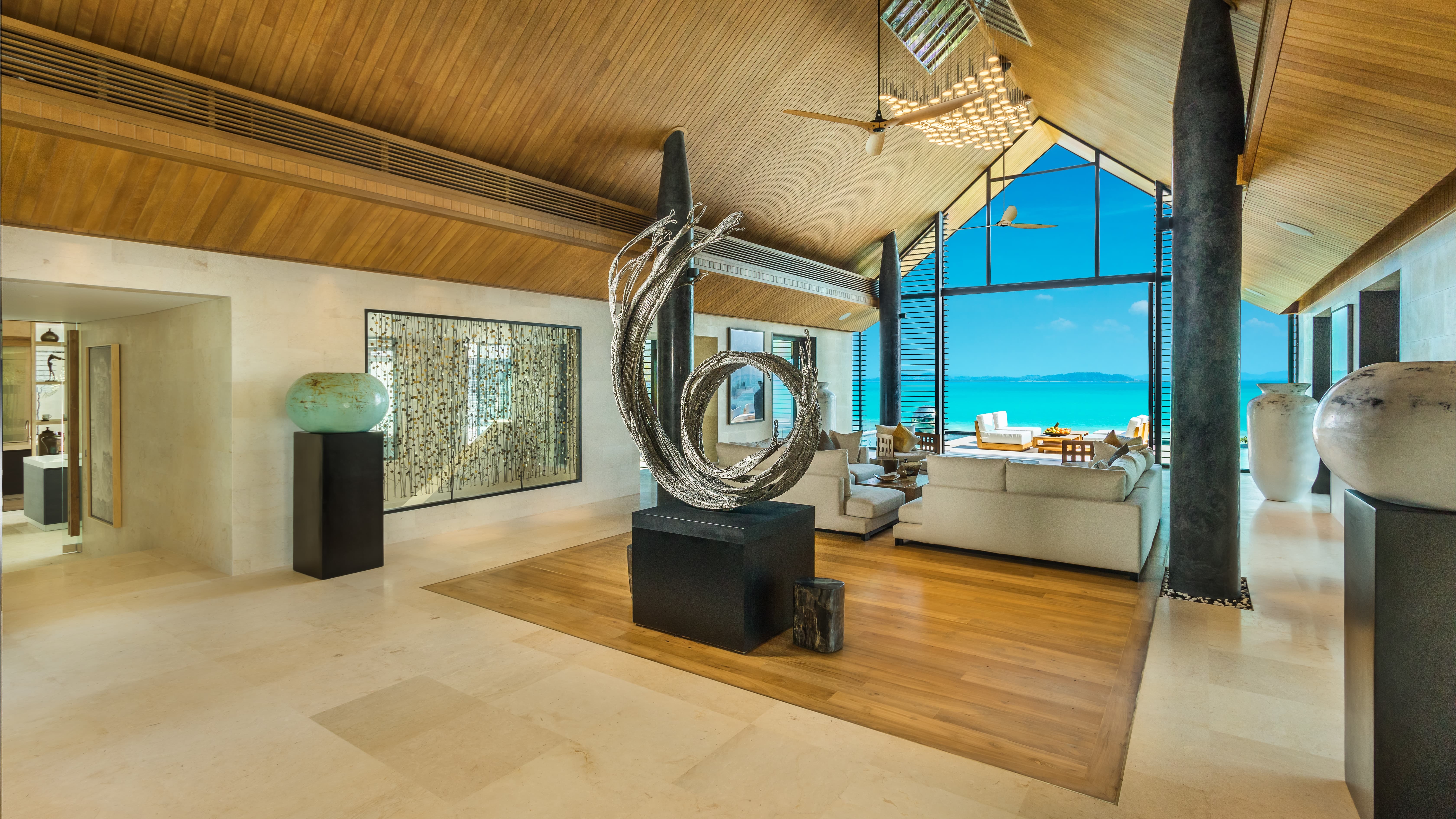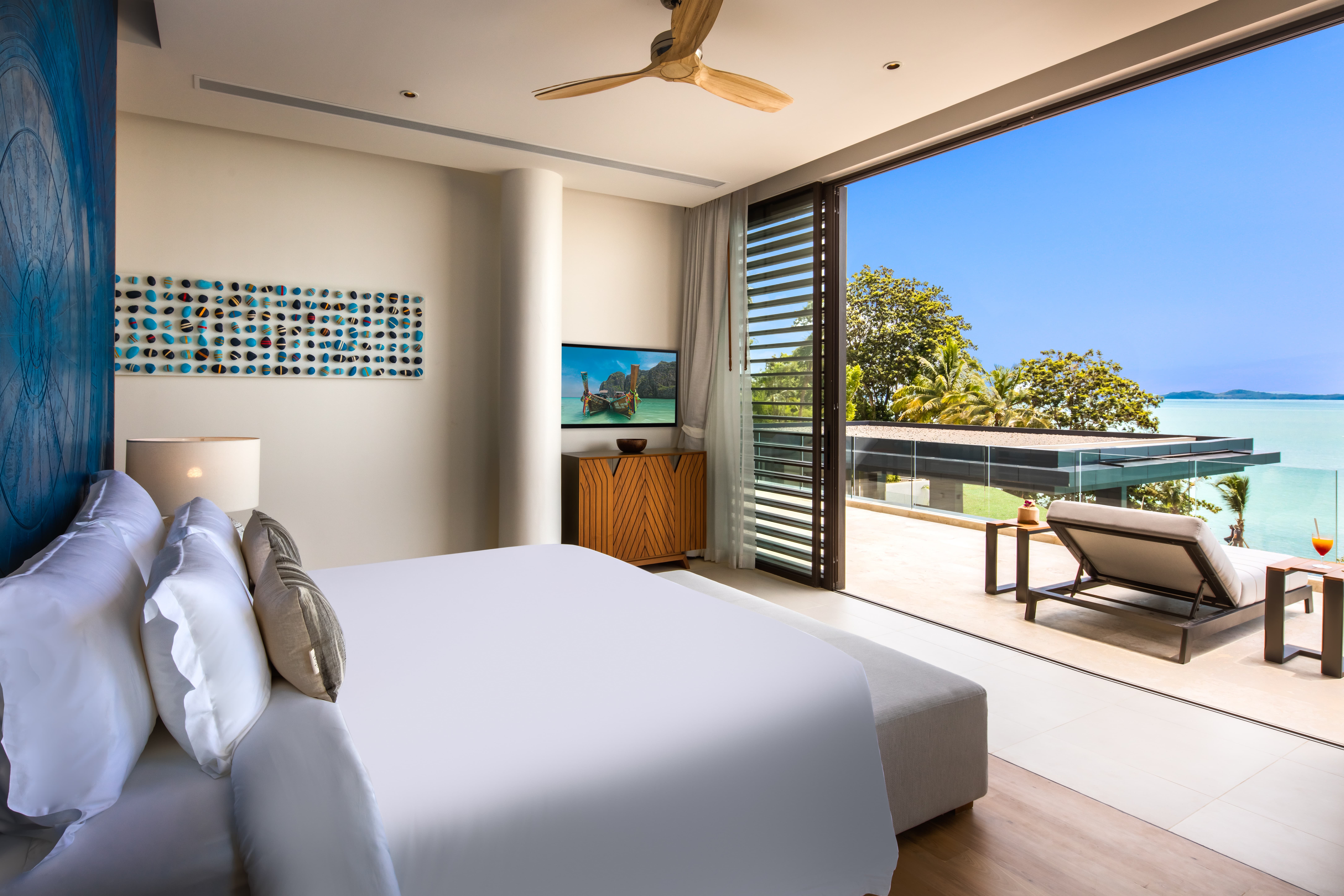 Arranged across four expansive levels, the villa unfolds with architectural confidence and effortless flow. At its heart lies a dramatic high-ceiling main lounge, where floor-to-ceiling glass frames uninterrupted views of the Andaman Sea. Light moves beautifully through the space from morning to dusk, enhancing the sense of openness and calm. Multiple living areas provide generous room for gathering, whether for celebratory evenings or quiet afternoons. Interiors transition seamlessly onto wide terraces, allowing indoor and outdoor living to merge into one continuous, ocean-facing experience.