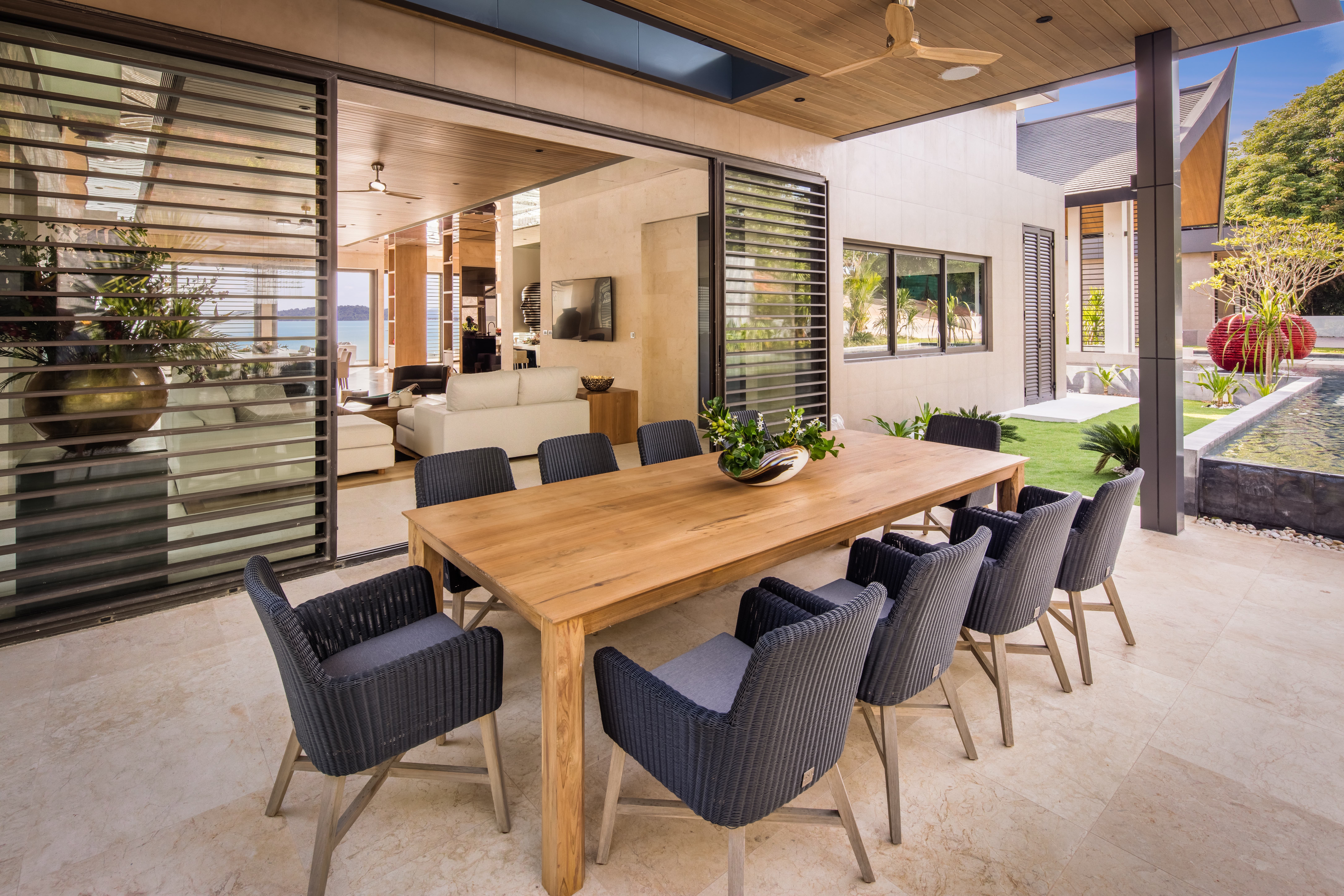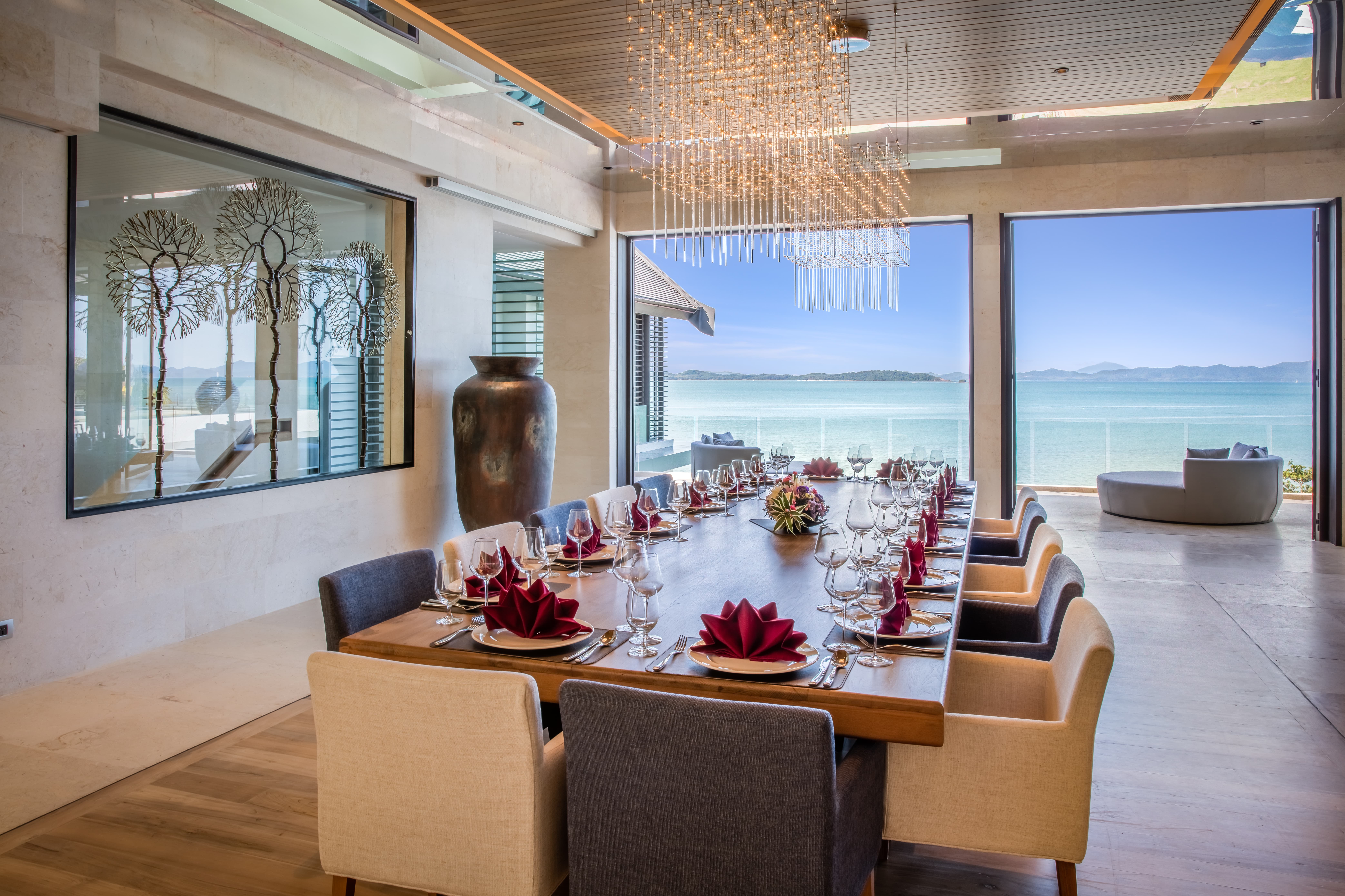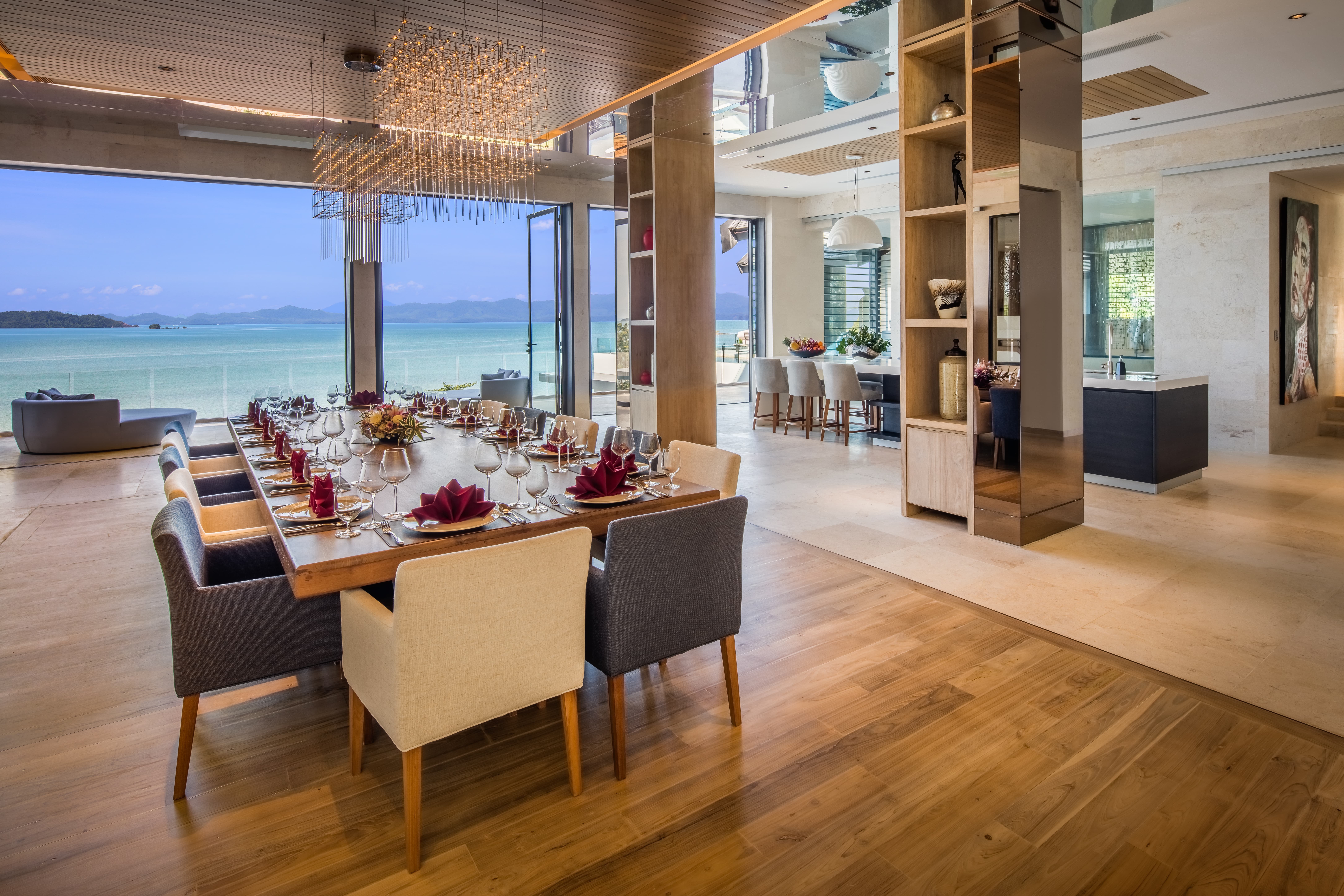 The villa’s kitchen is both elegant and fully equipped, designed to support private chefs and relaxed self-catering alike. Premium appliances, generous preparation space and refined finishes ensure functionality without compromising style. Dining areas are positioned to maximise views, whether indoors beneath high ceilings or outdoors on sea-facing terraces. Poolside dining beneath the sala provides a naturally glamorous setting for long alfresco lunches and candlelit dinners.