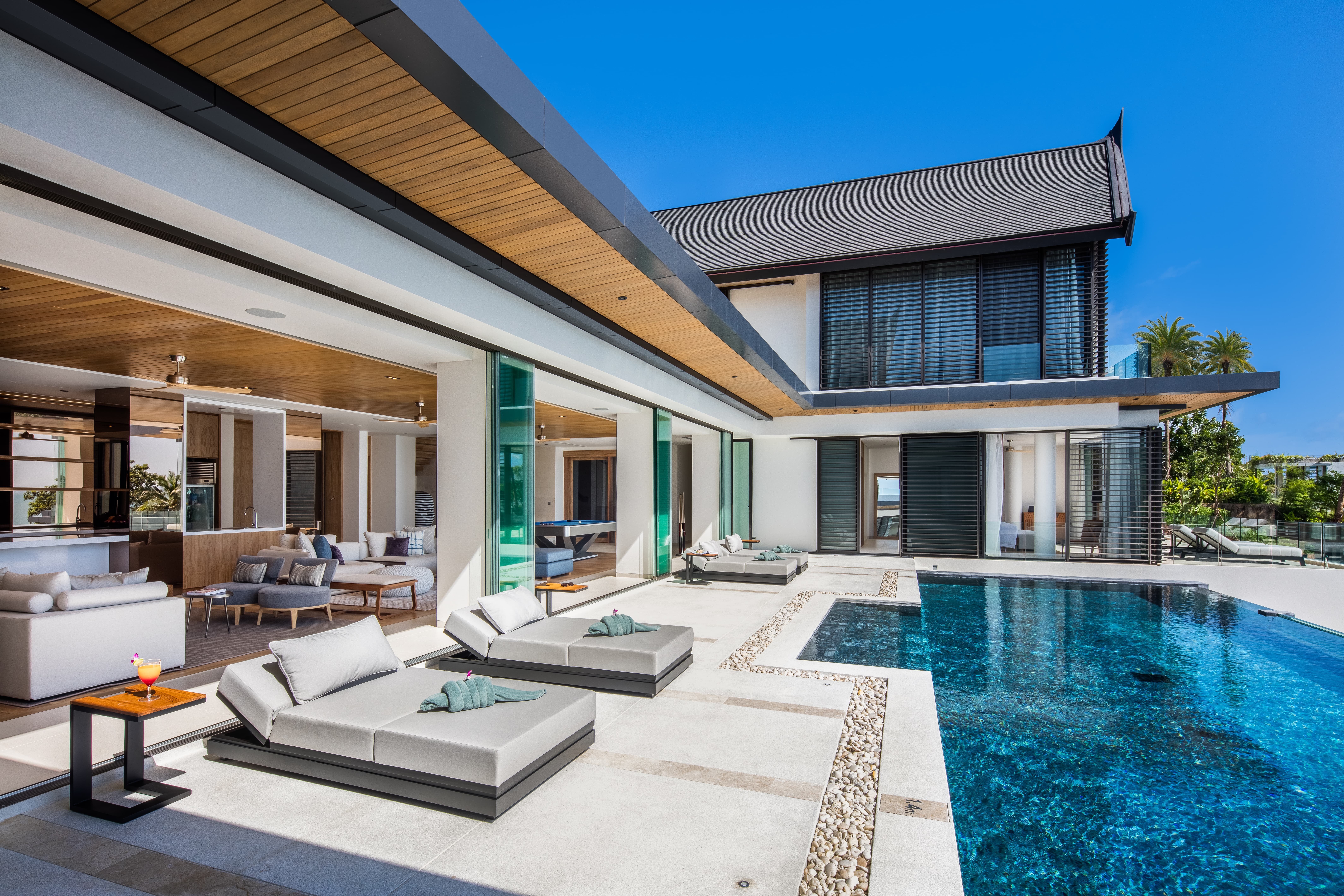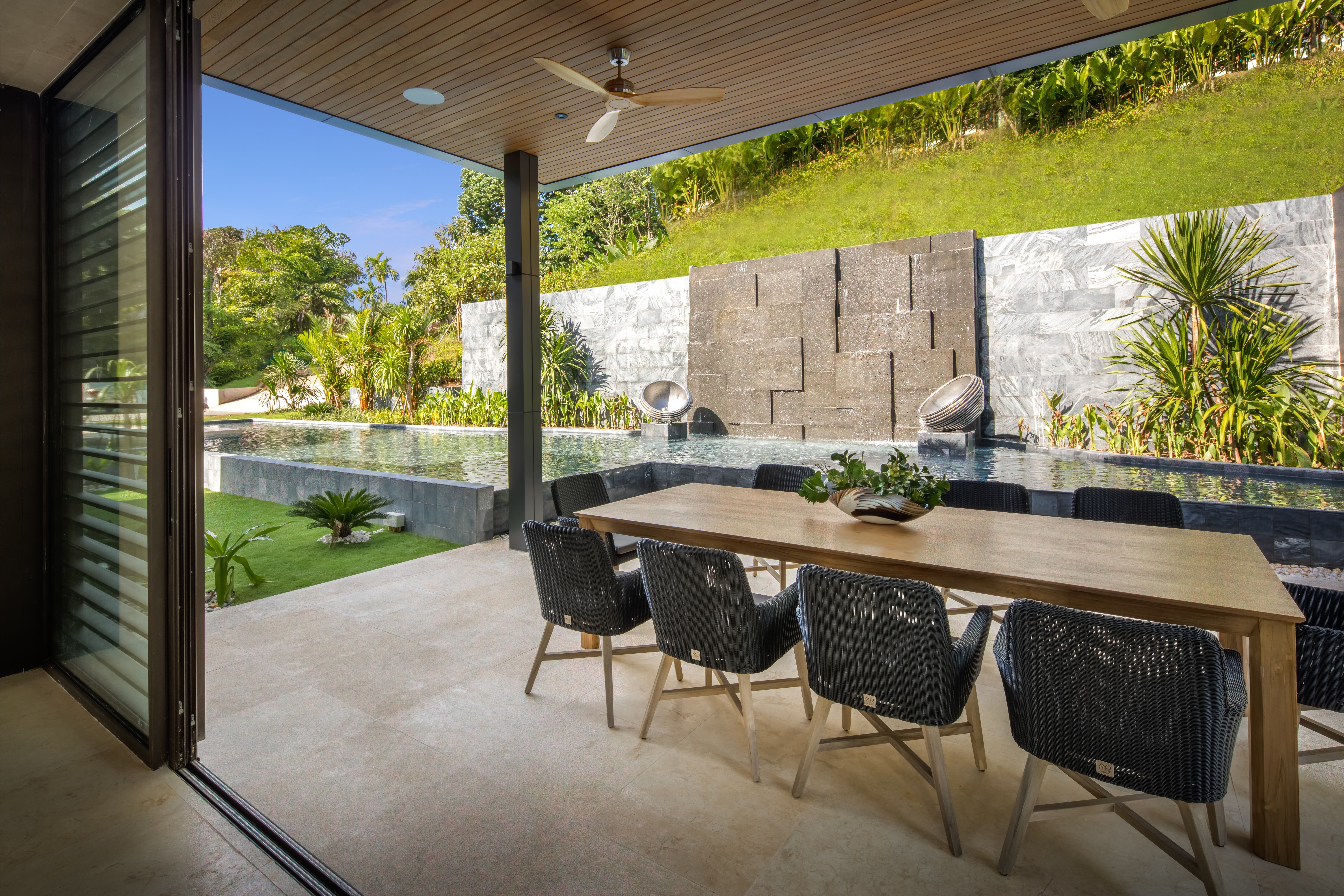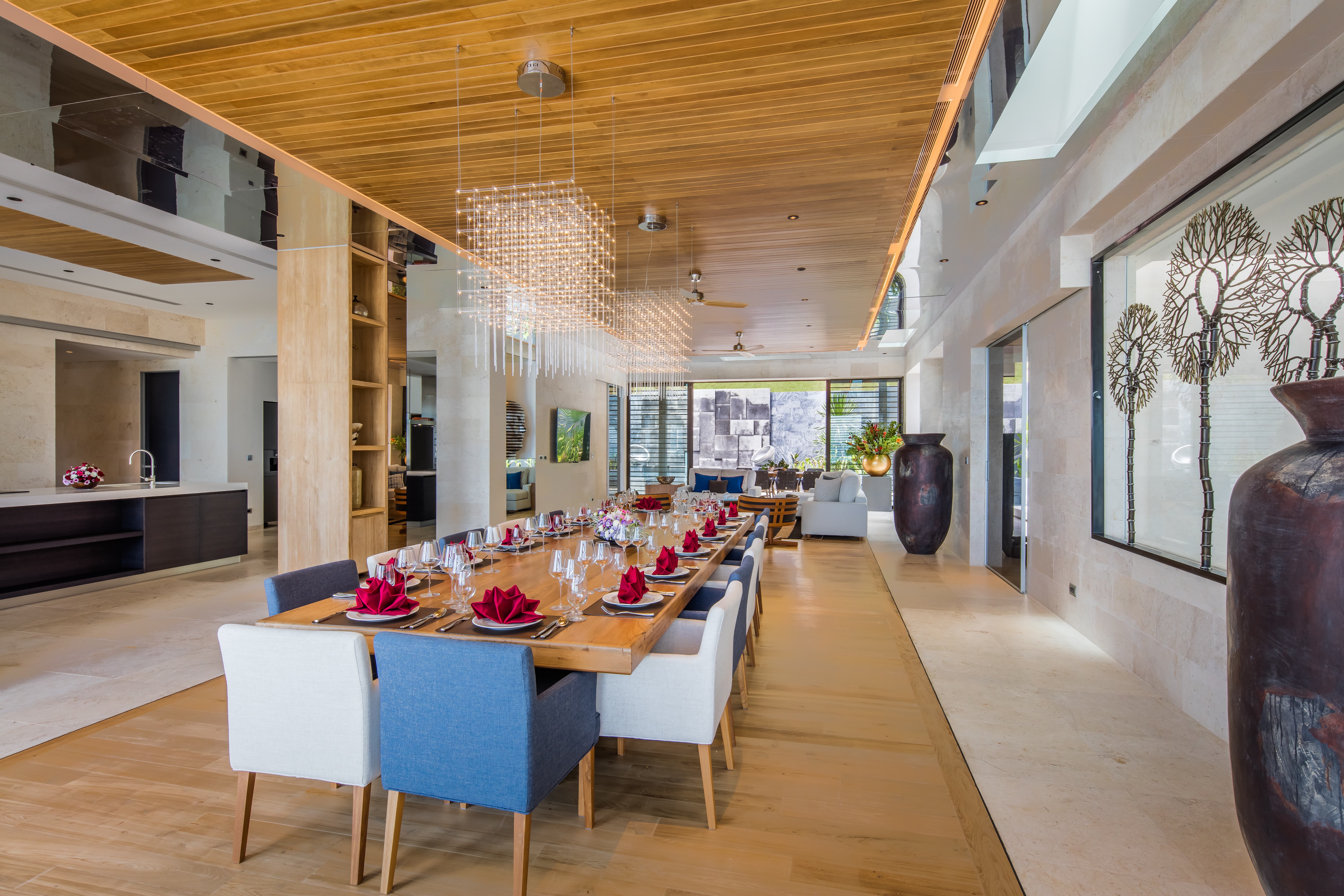 The villa’s kitchen is both elegant and fully equipped, designed to support private chefs and relaxed self-catering alike. Premium appliances, generous preparation space and refined finishes ensure functionality without compromising style. Dining areas are positioned to maximise views, whether indoors beneath high ceilings or outdoors on sea-facing terraces. Poolside dining beneath the sala provides a naturally glamorous setting for long alfresco lunches and candlelit dinners.