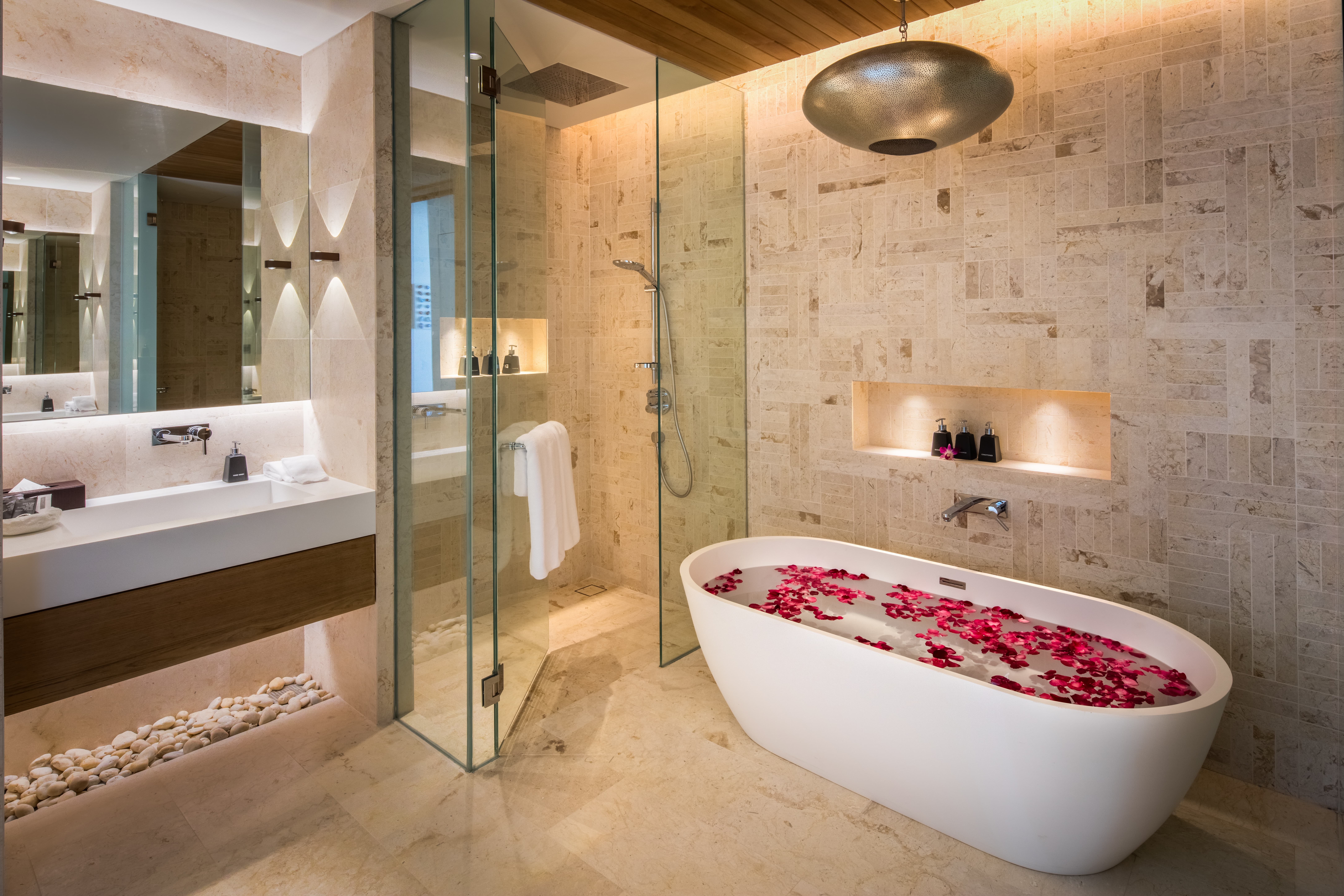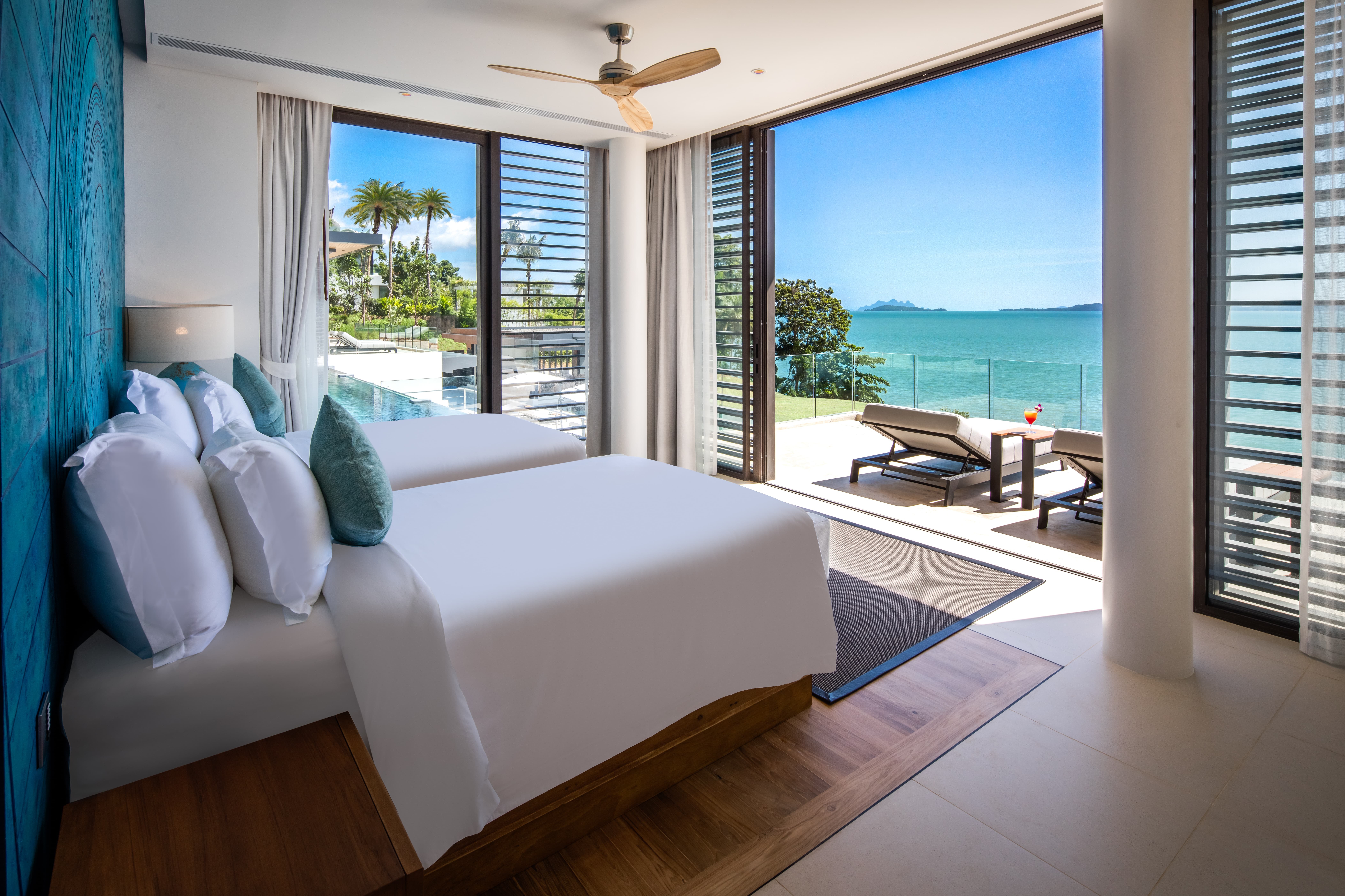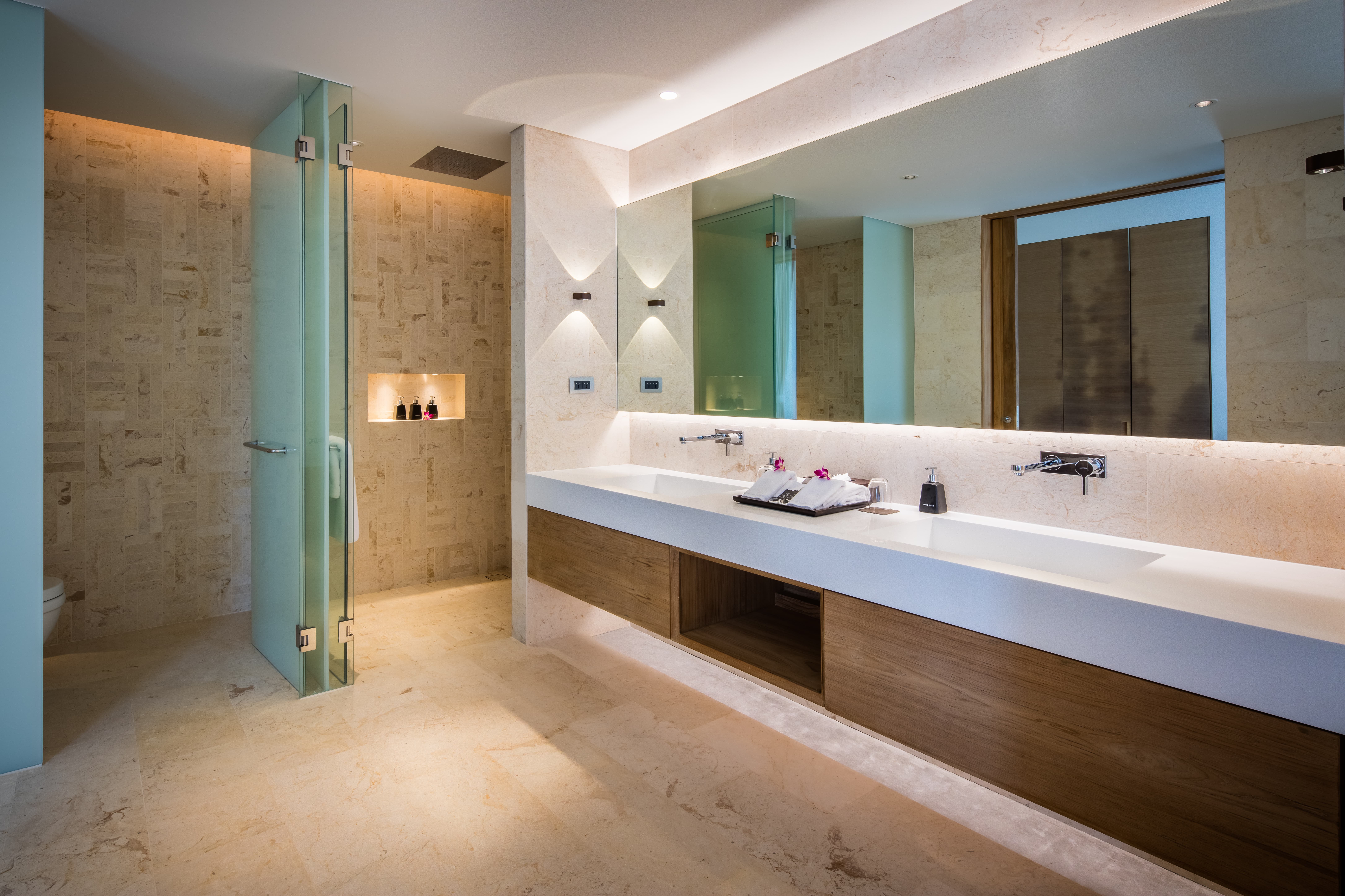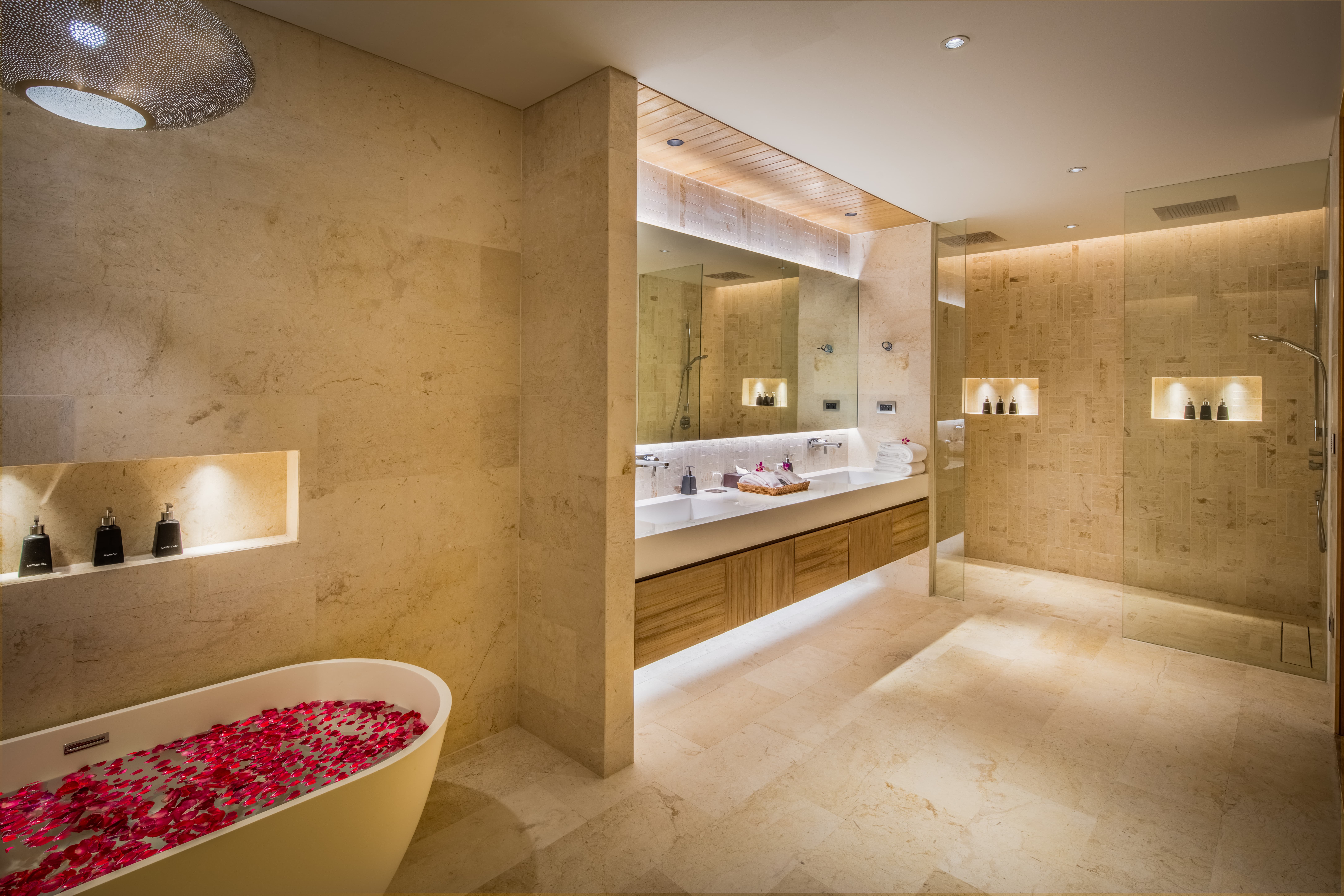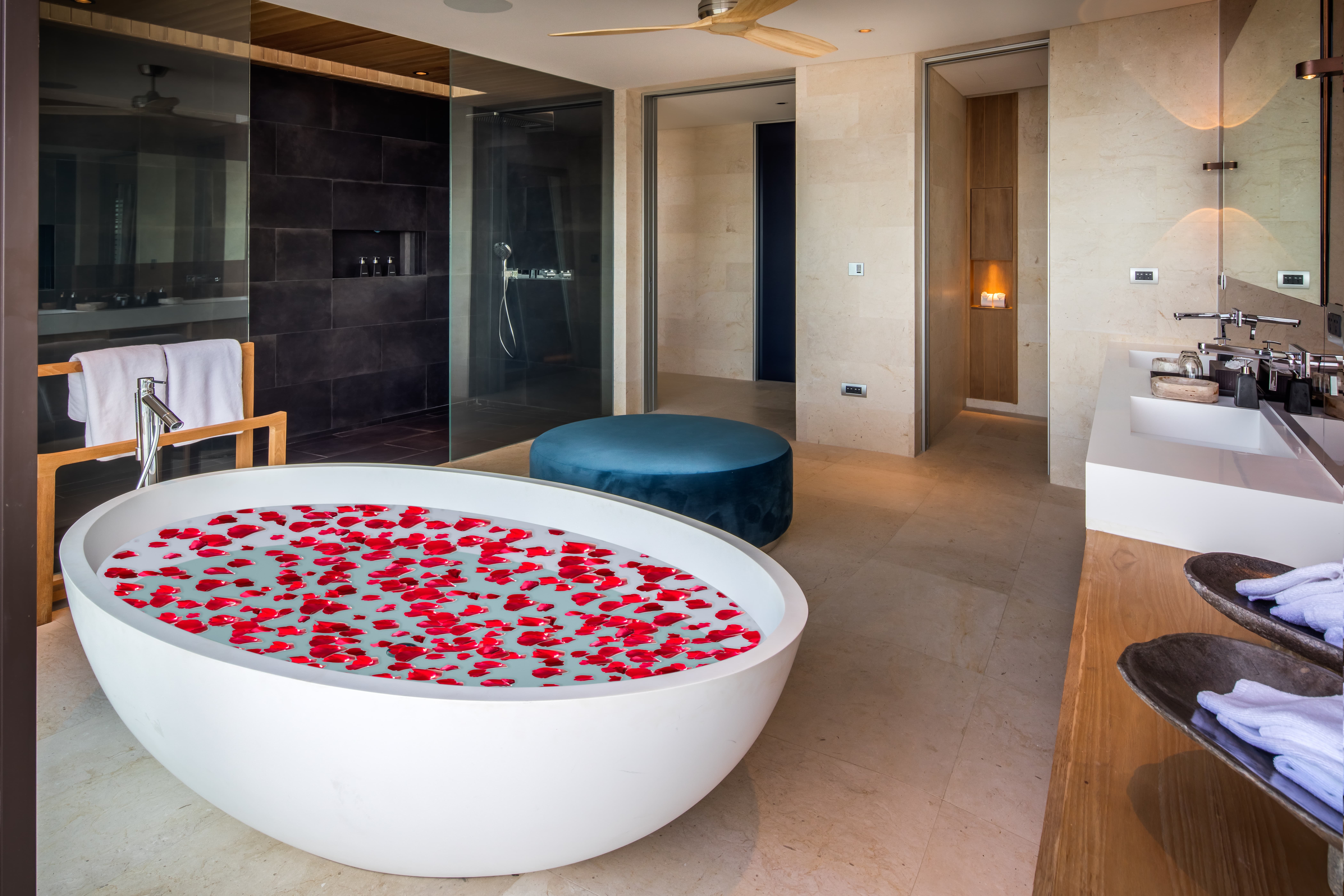 Each en-suite bathroom reflects the villa’s commitment to understated luxury. Freestanding bathtubs and walk-in showers are framed by oversized windows, inviting natural light and panoramic ocean views. Premium amenities, modern fixtures and spa-like detailing transform everyday routines into moments of quiet indulgence.