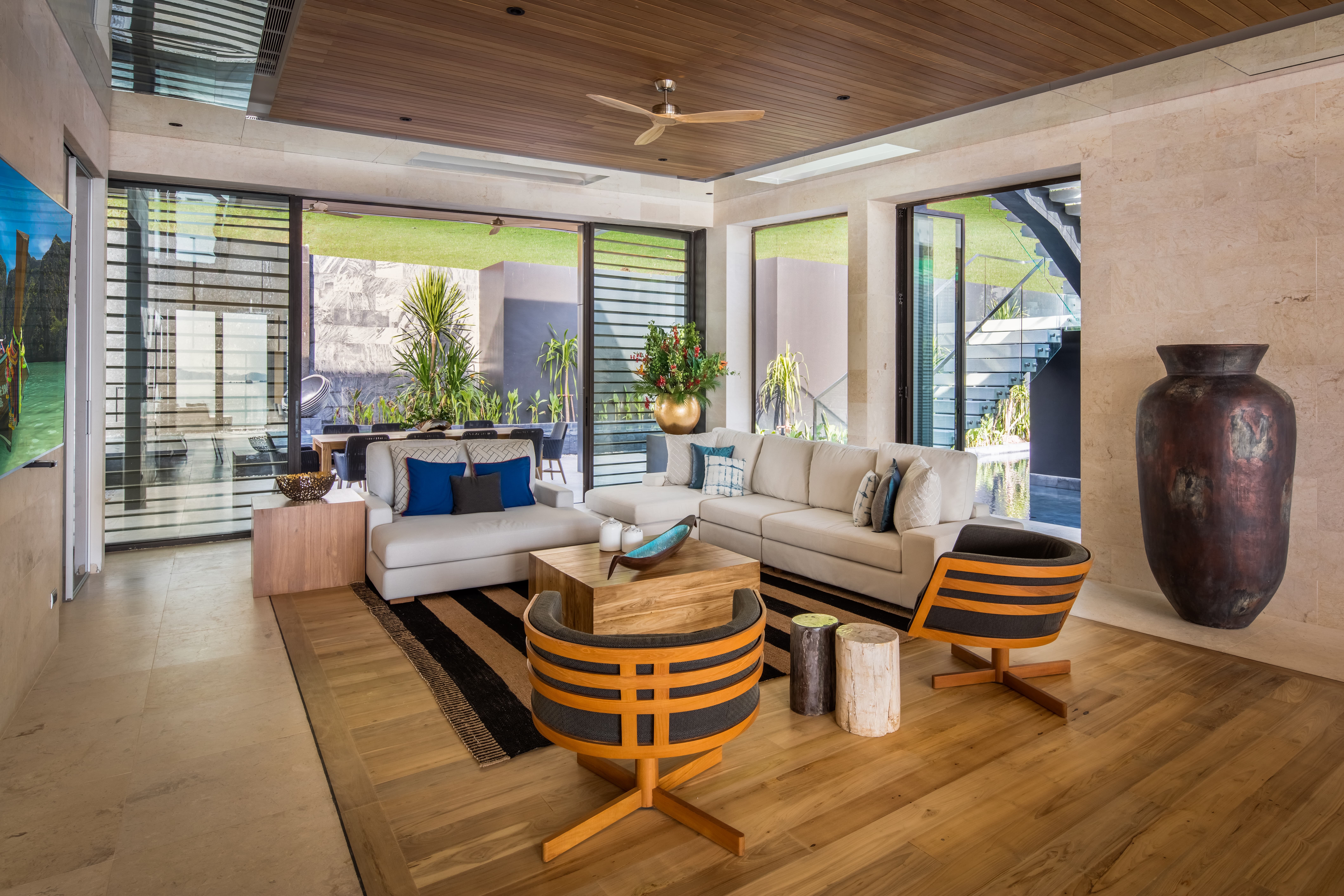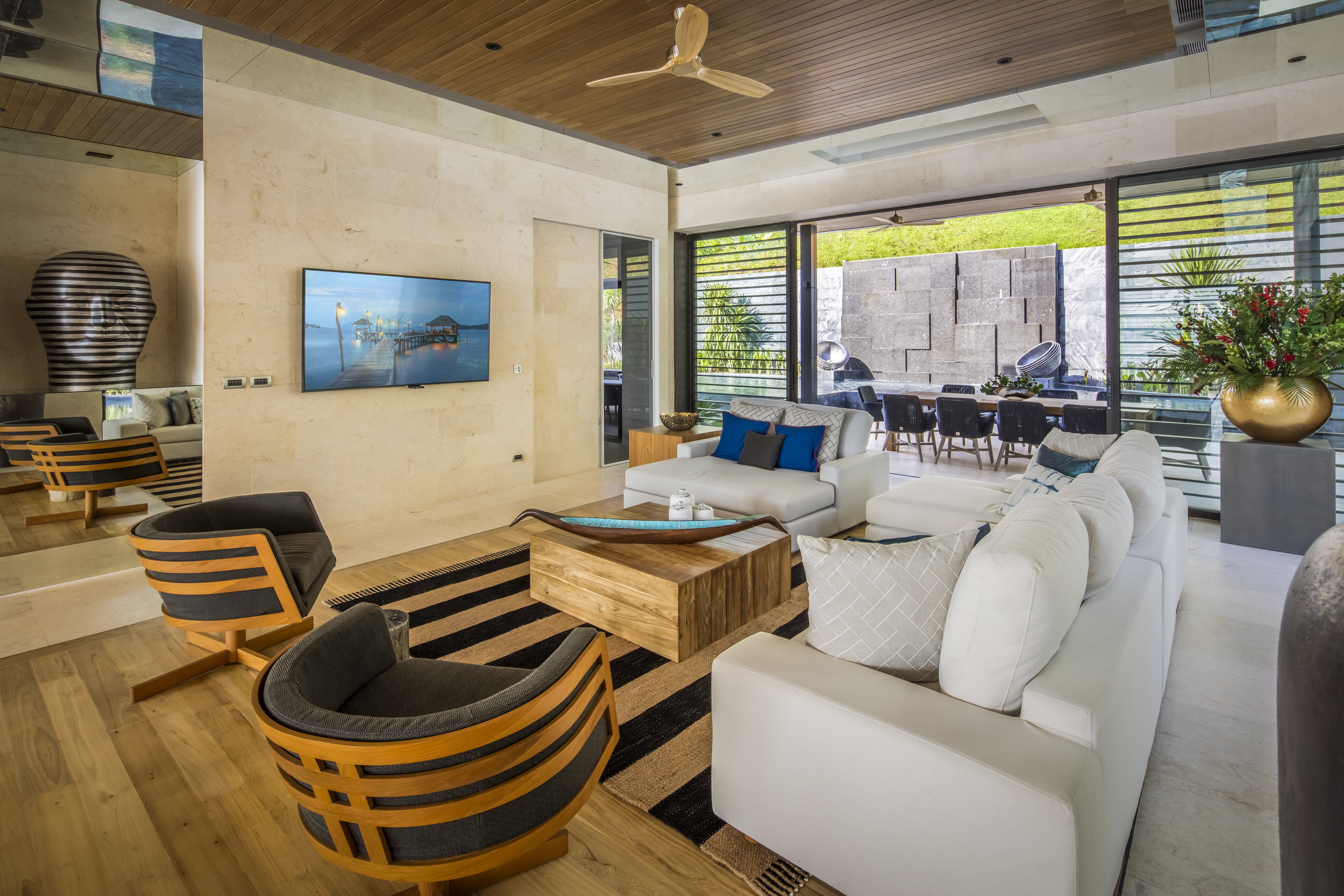 The villa is fully air-conditioned throughout, maintaining a cool and comfortable interior climate even during the warmest months. Large glass openings allow for natural airflow, balancing contemporary climate control with tropical breezes.