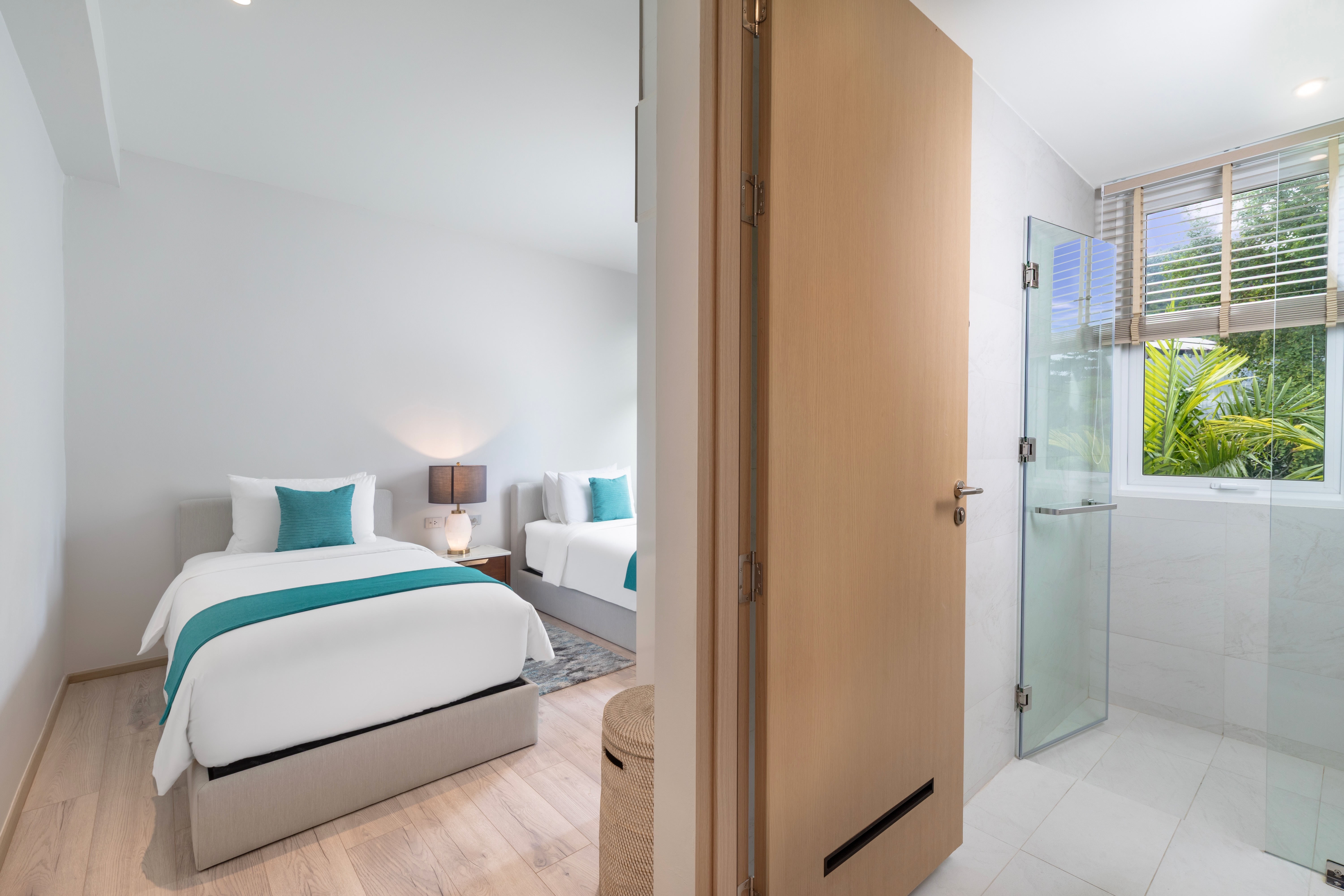The villa features six beautifully appointed bedrooms, comfortably accommodating up to 12 guests. Perfect for families and small groups seeking space, privacy, and effortless luxury. Two opulent master suites offer plush king-sized beds and sweeping views of the infinity pool, ocean, and sunset beyond. Each master bedroom also includes a Smart TV and a luxurious ensuite bathroom designed for total relaxation. The four guest bedrooms are equally inviting, each fitted with twin beds, private ensuites, and refined amenities that make every stay feel indulgent and seamless.