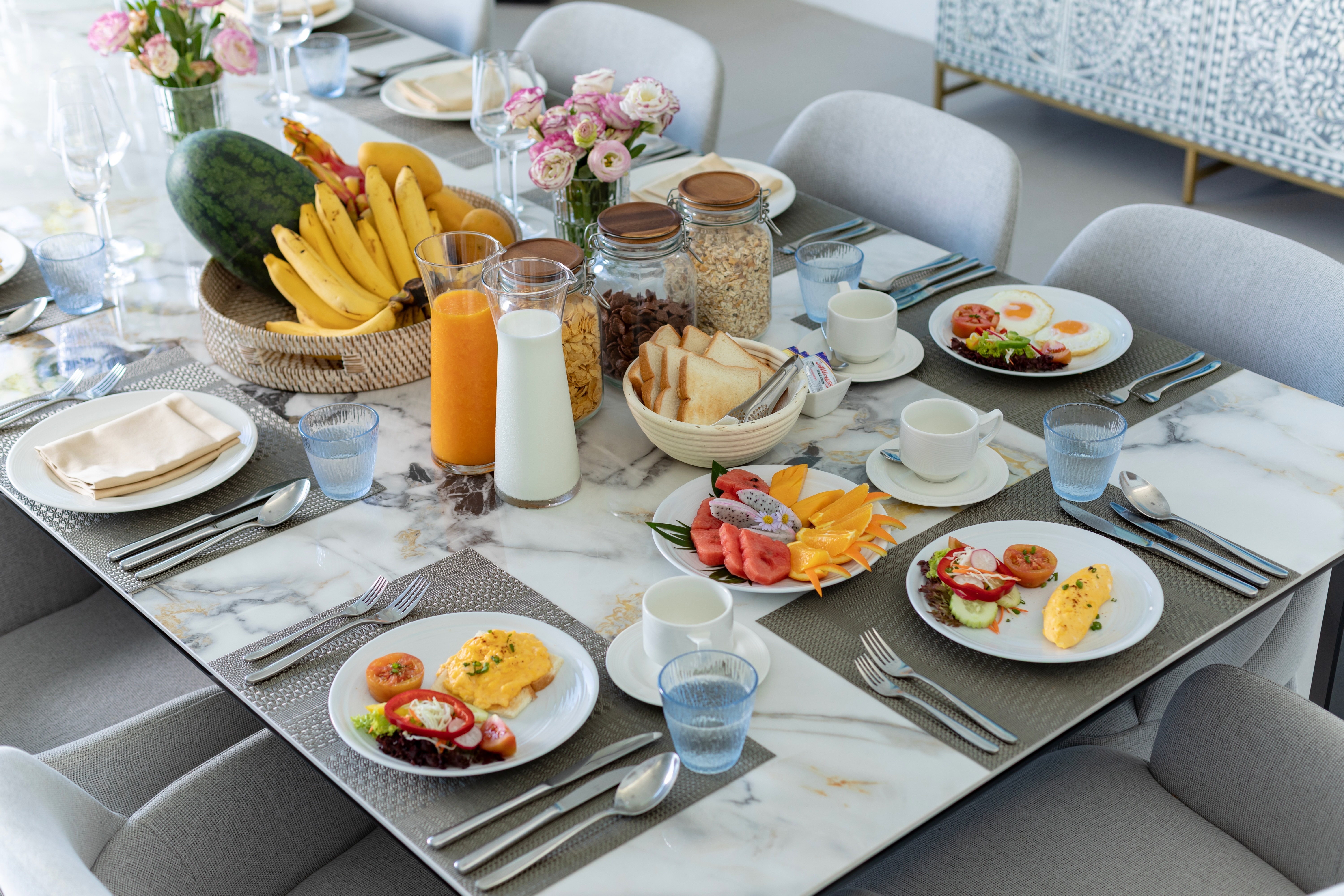 The villa features a fully equipped kitchen and a spacious dining area that comfortably seats 12 guests, ideal for shared meals and entertaining. A private chef is included to prepare personalized dishes (food cost not included), and guests enjoy a daily complimentary Continental or Asian breakfast served between 7:00 and 11:00 AM. BBQ facilities are available for relaxed outdoor dining, and a curated wine menu can be arranged at an additional charge.