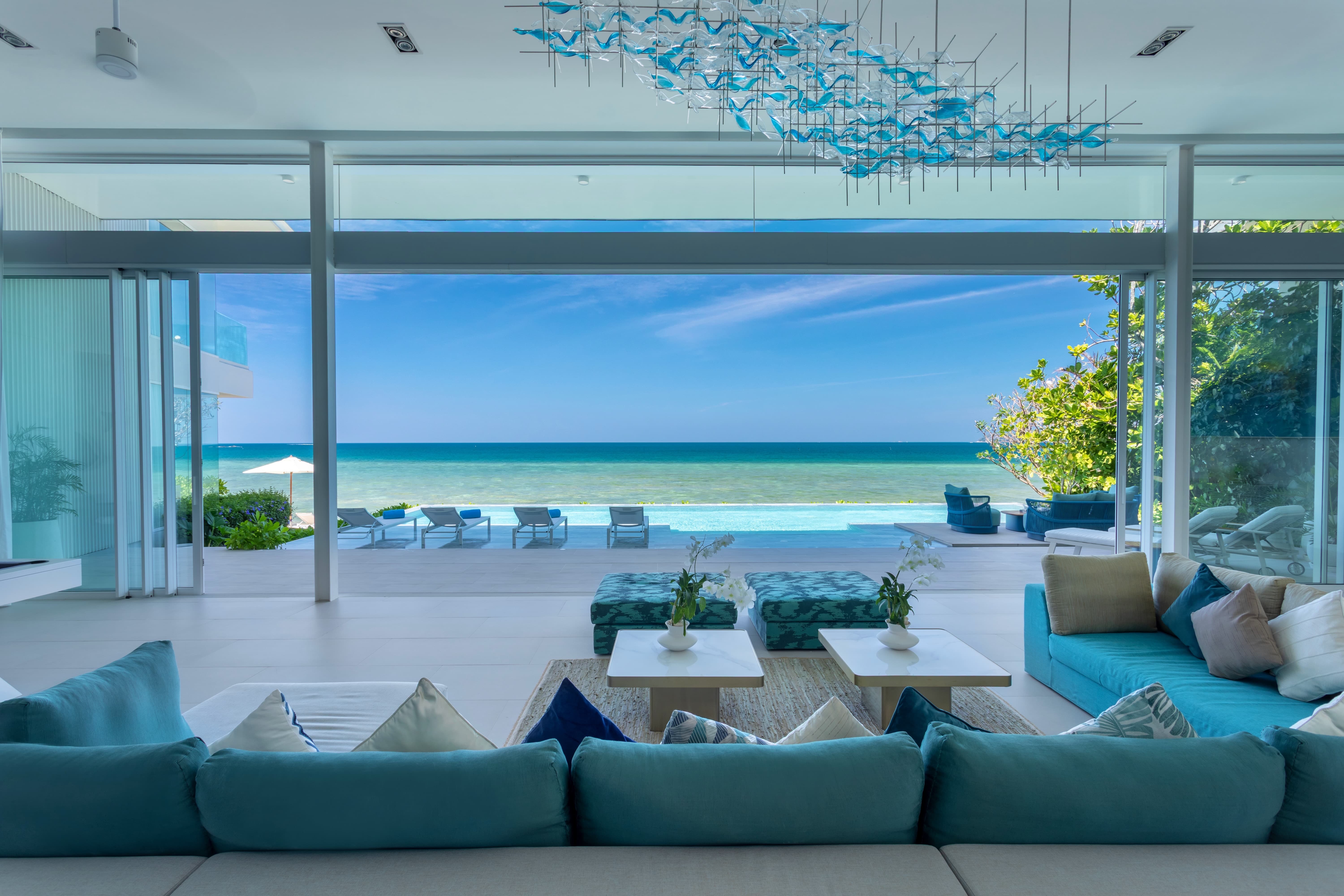 The villa is fully air-conditioned, maintaining comfort throughout the tropical seasons. Wide sliding glass doors allow for natural ventilation and warm sea breezes when desired, creating a balanced and comfortable interior climate.