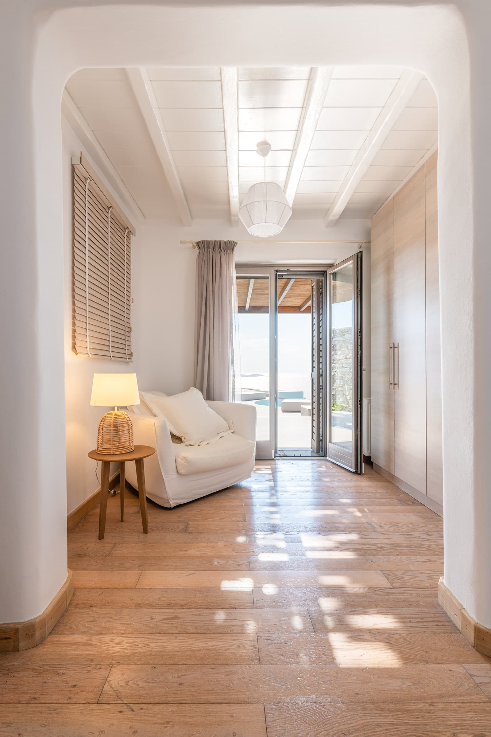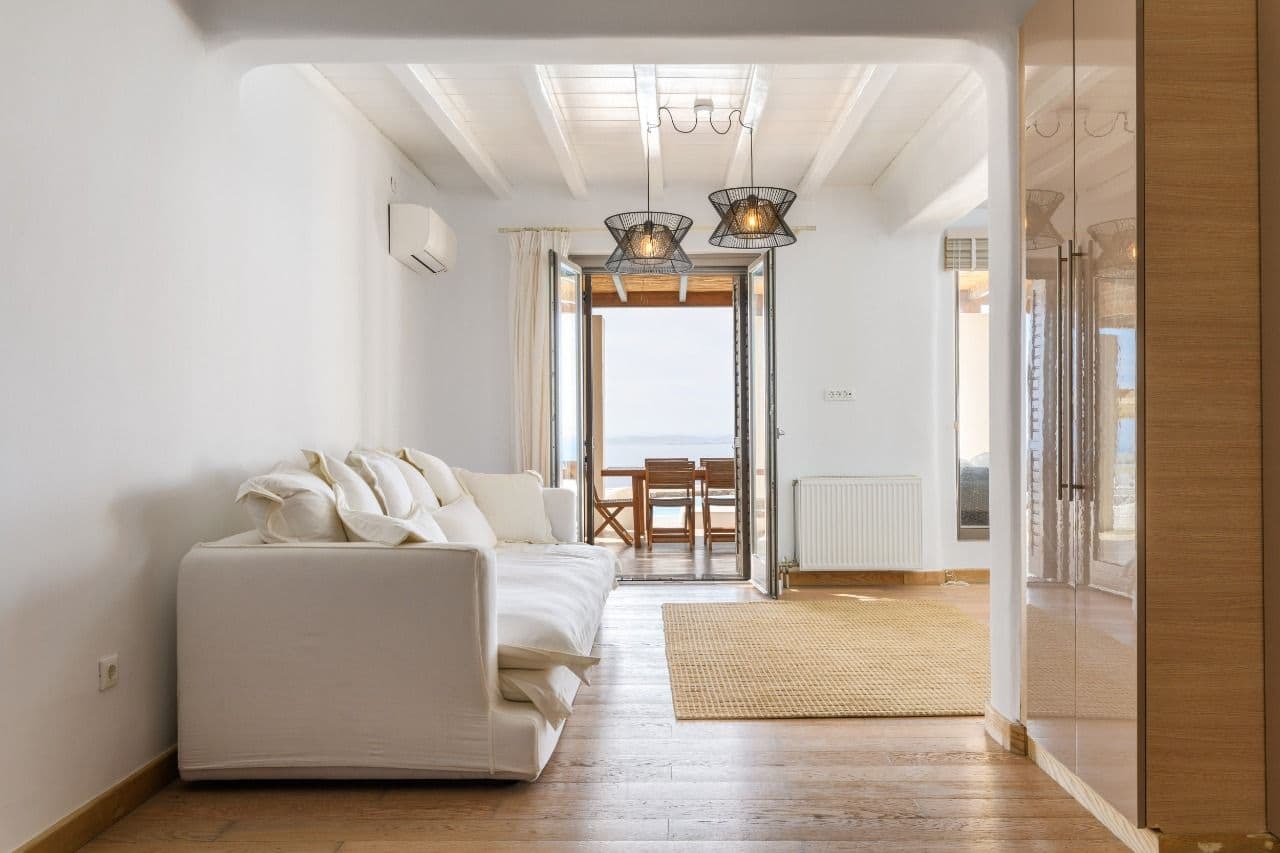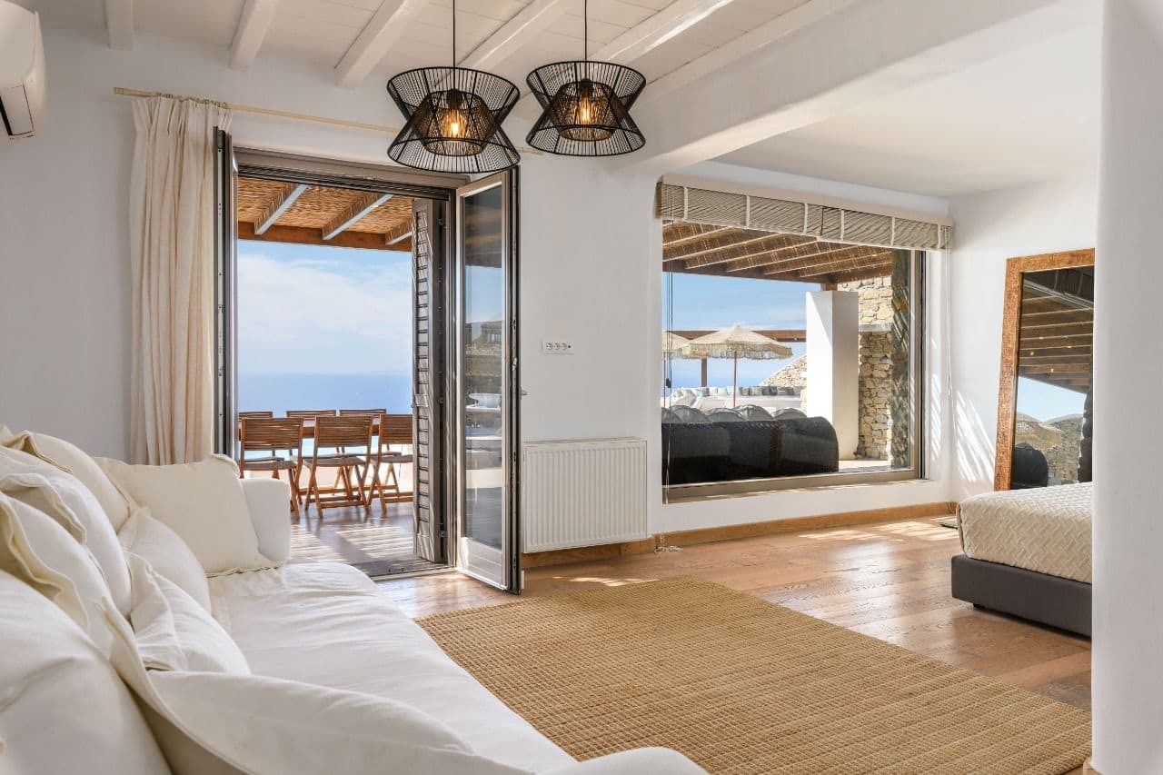 Open, light-filled living areas designed to flow seamlessly into the outdoor terraces and frame uninterrupted views across the Aegean. The main lounge connects directly to the pool and exterior spaces, creating a natural indoor-outdoor rhythm. Soft, minimal interiors in neutral tones allow the landscape to take focus, while multiple seating areas offer both social and more private settings.
