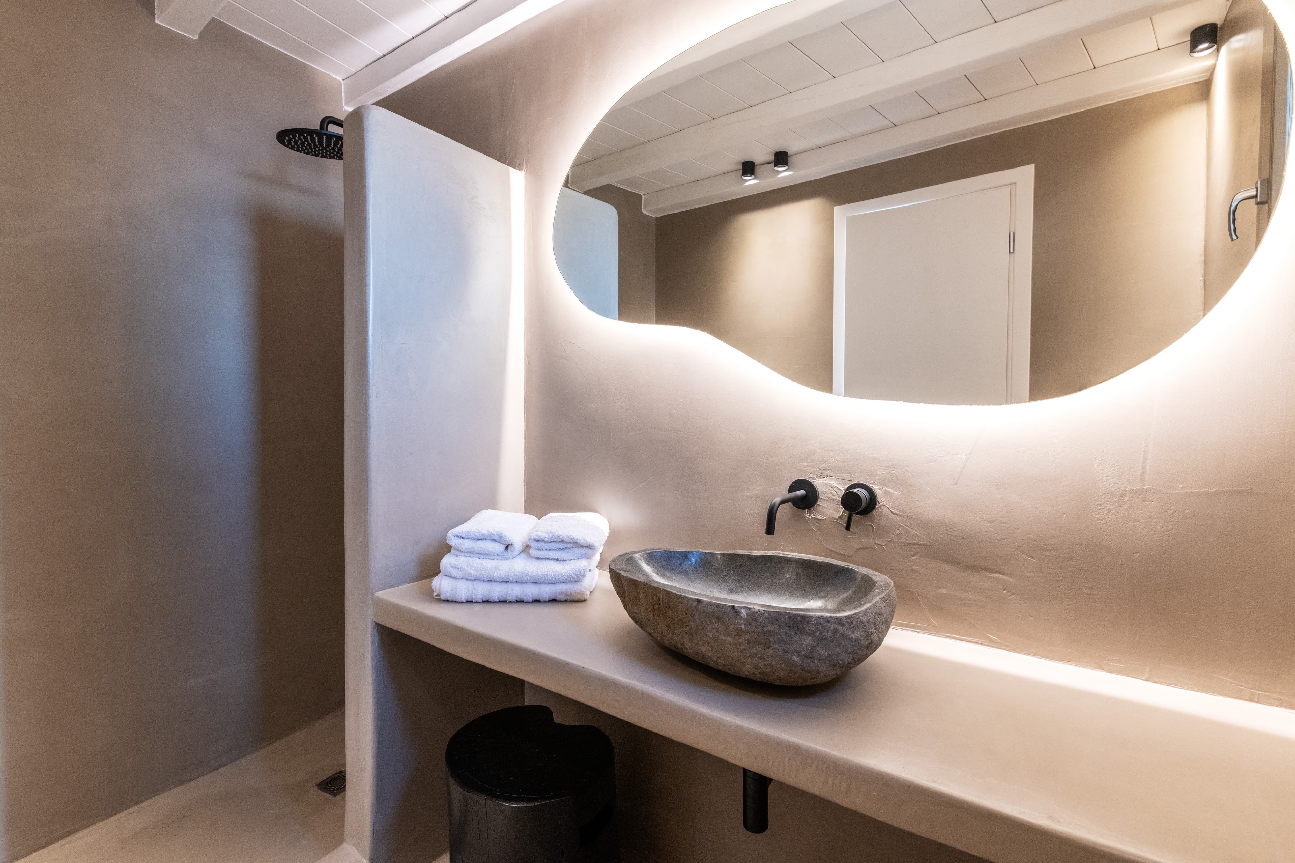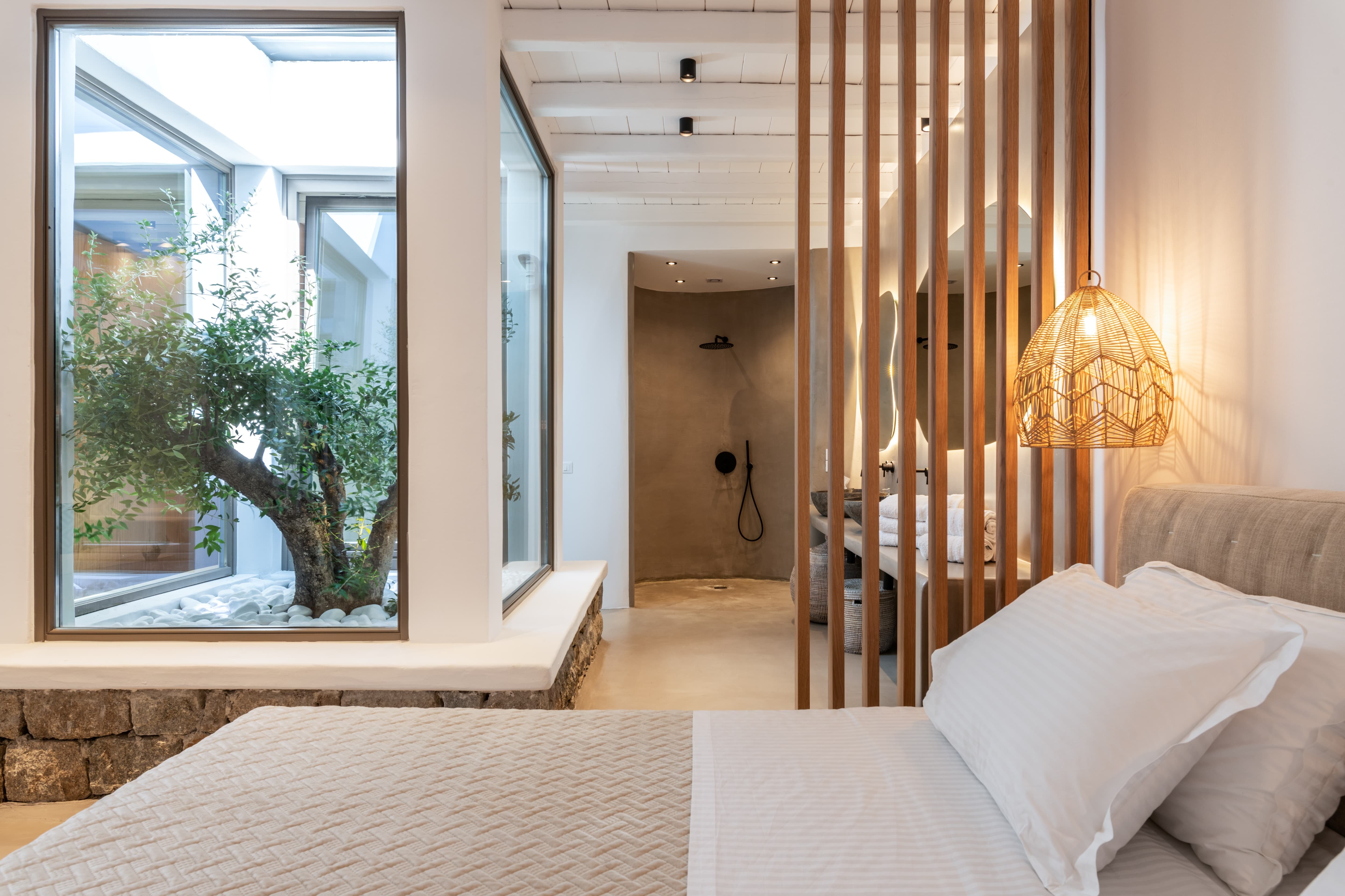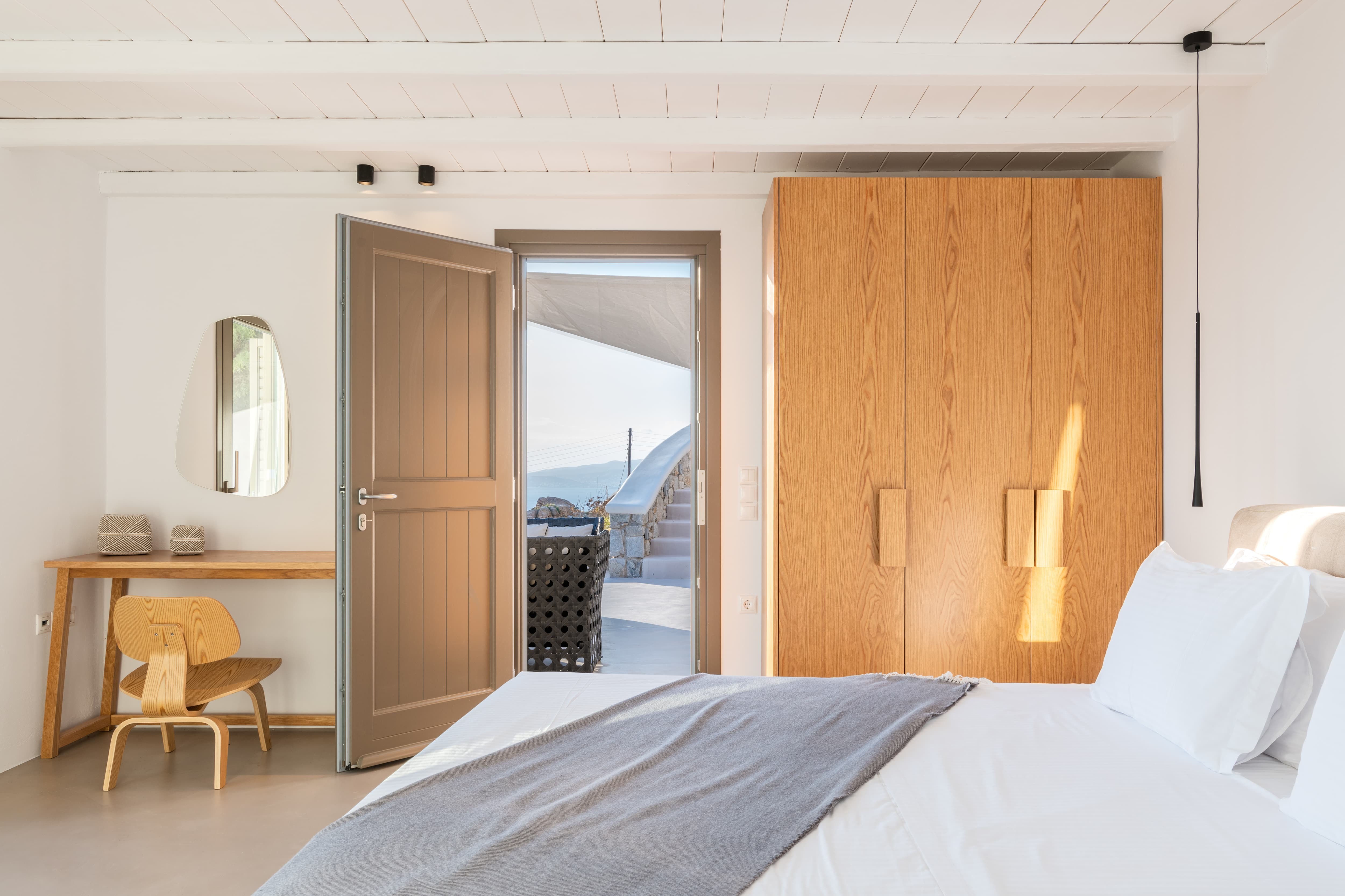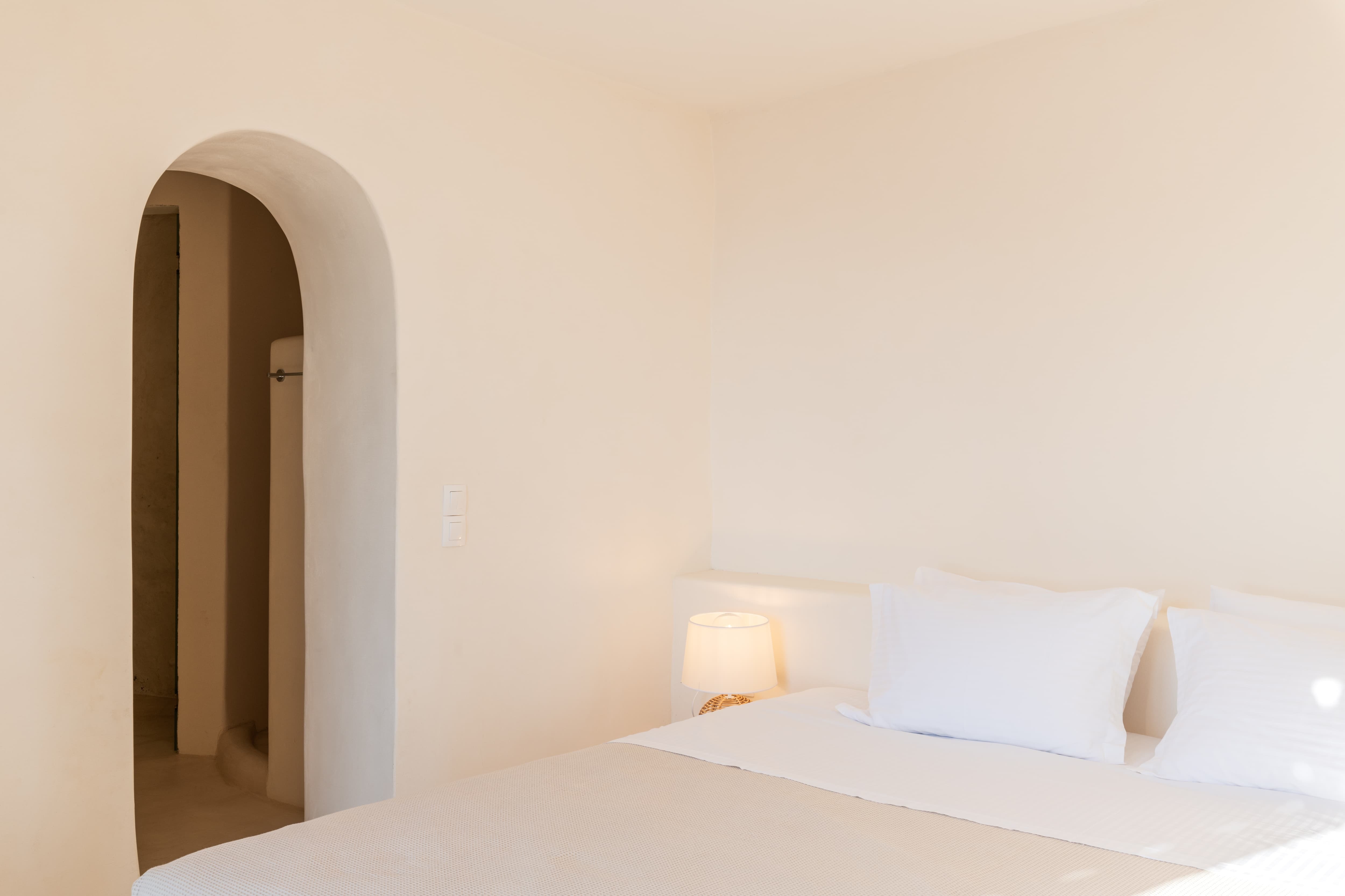 There is a natural calm to the villa. Its architecture blends traditional Cycladic elements with a modern, minimal aesthetic, soft tones, clean lines, and open spaces that allow light and landscape to lead. It is a setting that feels considered yet unforced, designed to be lived in rather than simply observed.