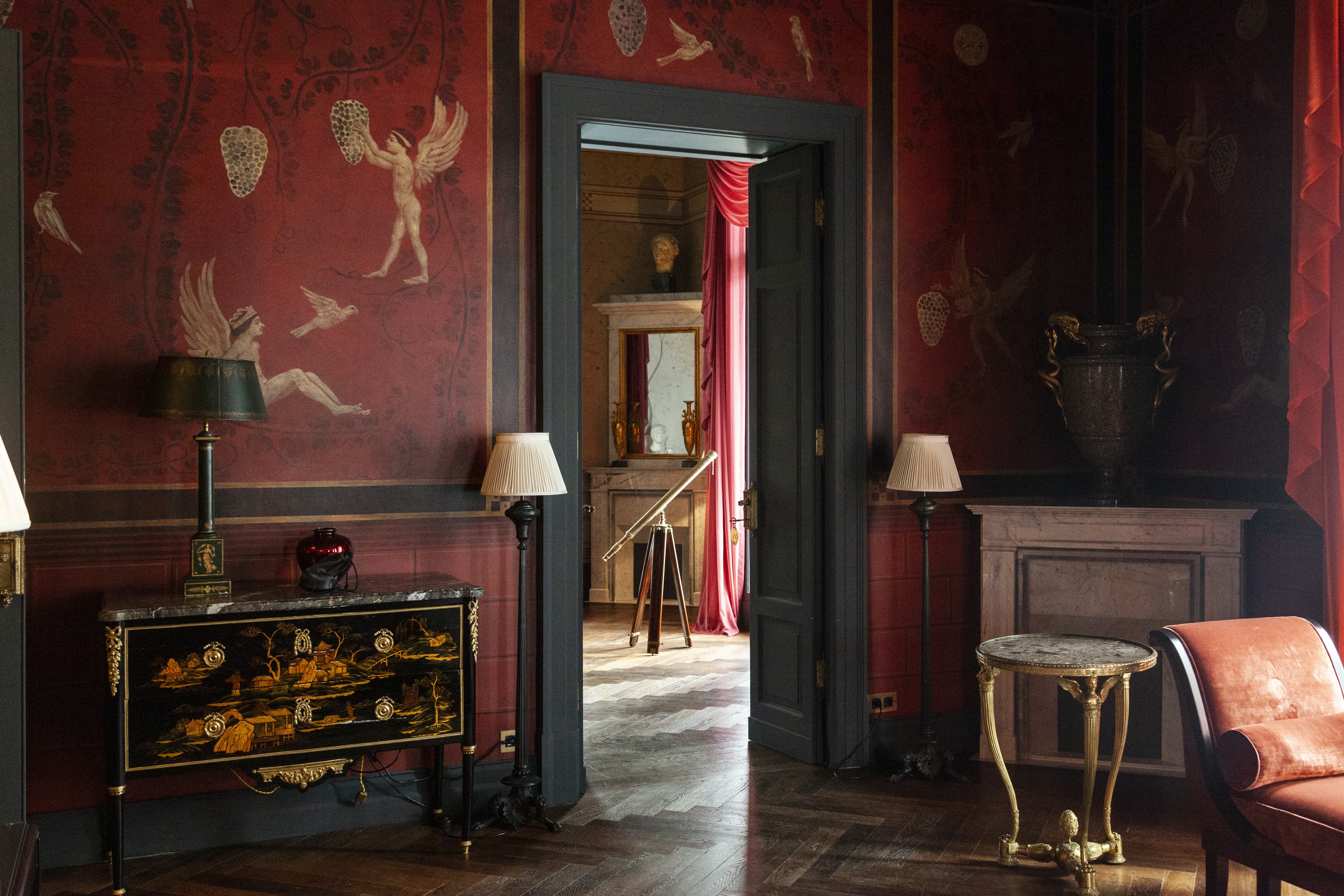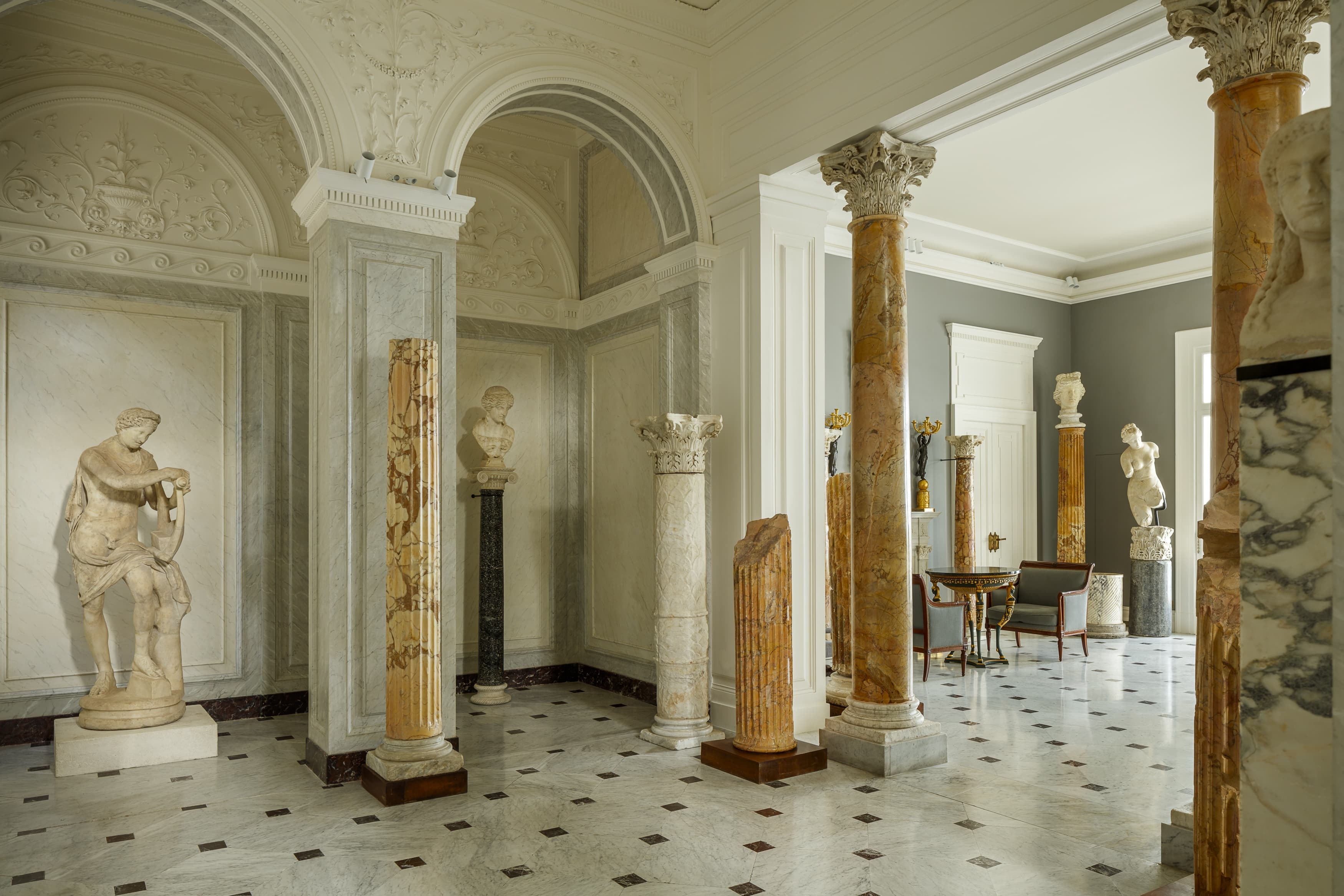 A sequence of grand reception rooms defines the interior, each space layered with museum-quality art, Roman antiquities, and classical architectural elements. High ceilings, expansive proportions, and curated furnishings create an atmosphere that feels both monumental and intimate, where formal entertaining and relaxed living coexist effortlessly.