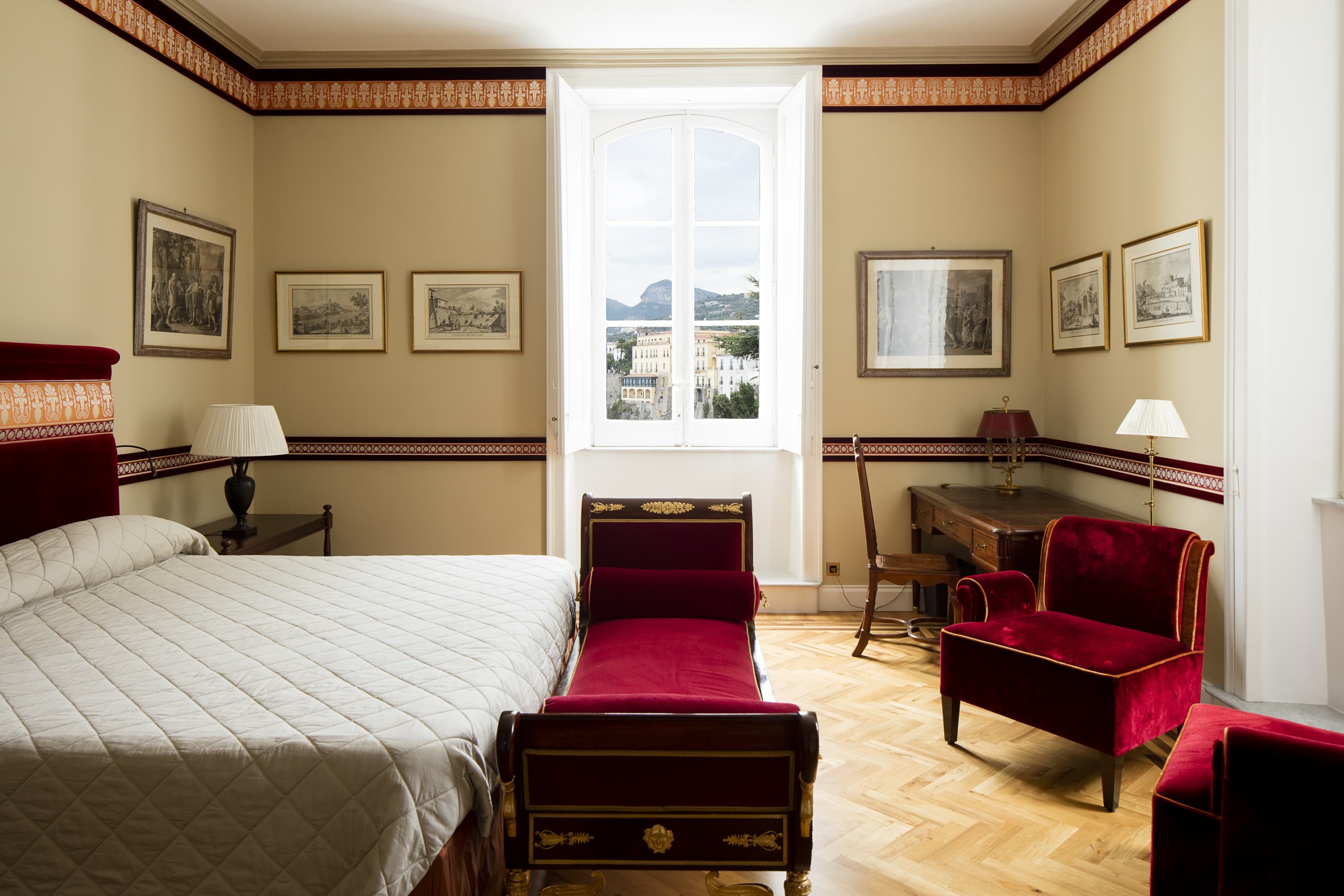 Originally created by William Waldorf Astor, the property carries a distinct sense of legacy, where history, art, and landscape converge. From its elevated position, the views are vast and uninterrupted, stretching across the Bay of Naples, Mount Vesuvius, and the sweeping Amalfi coastline.