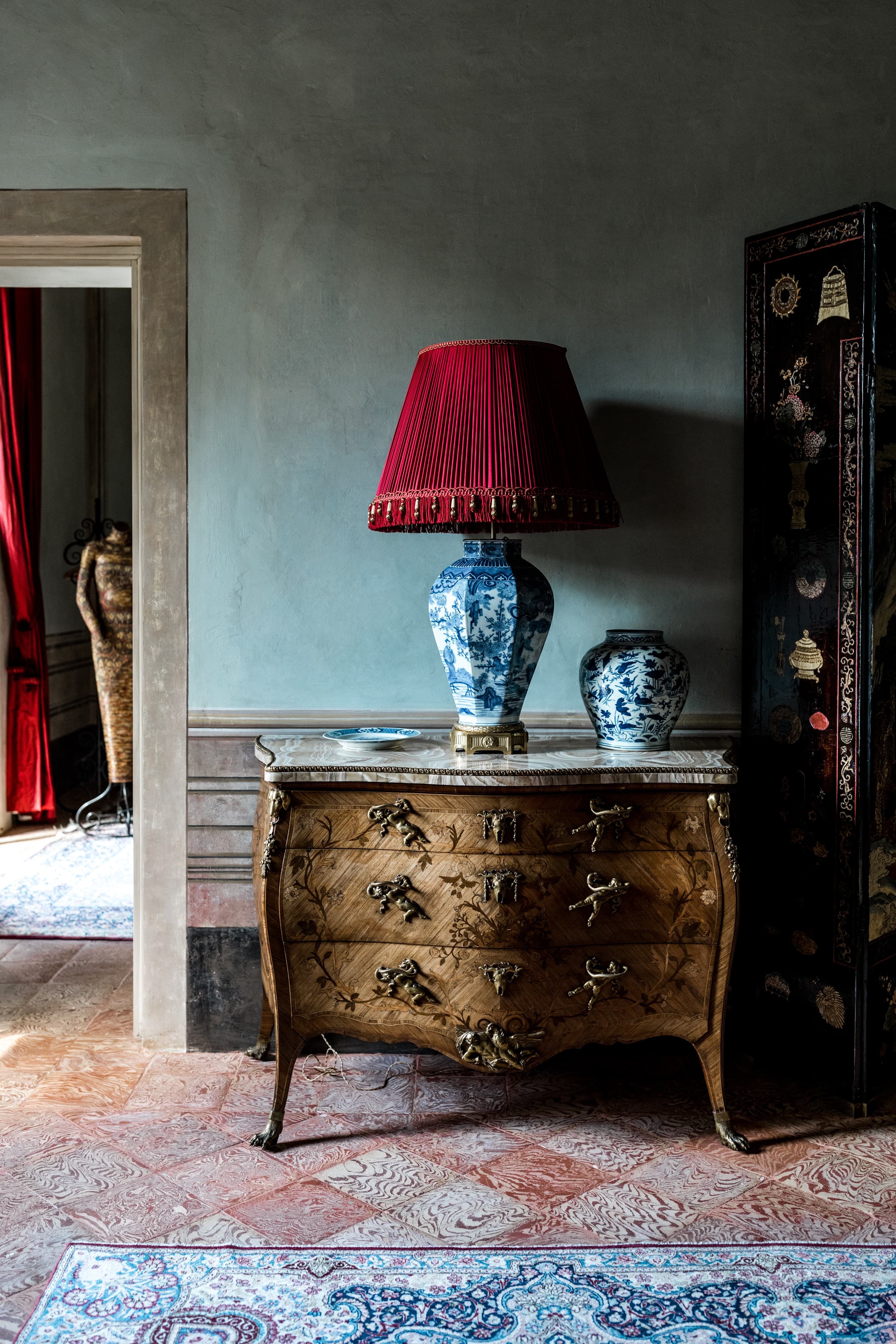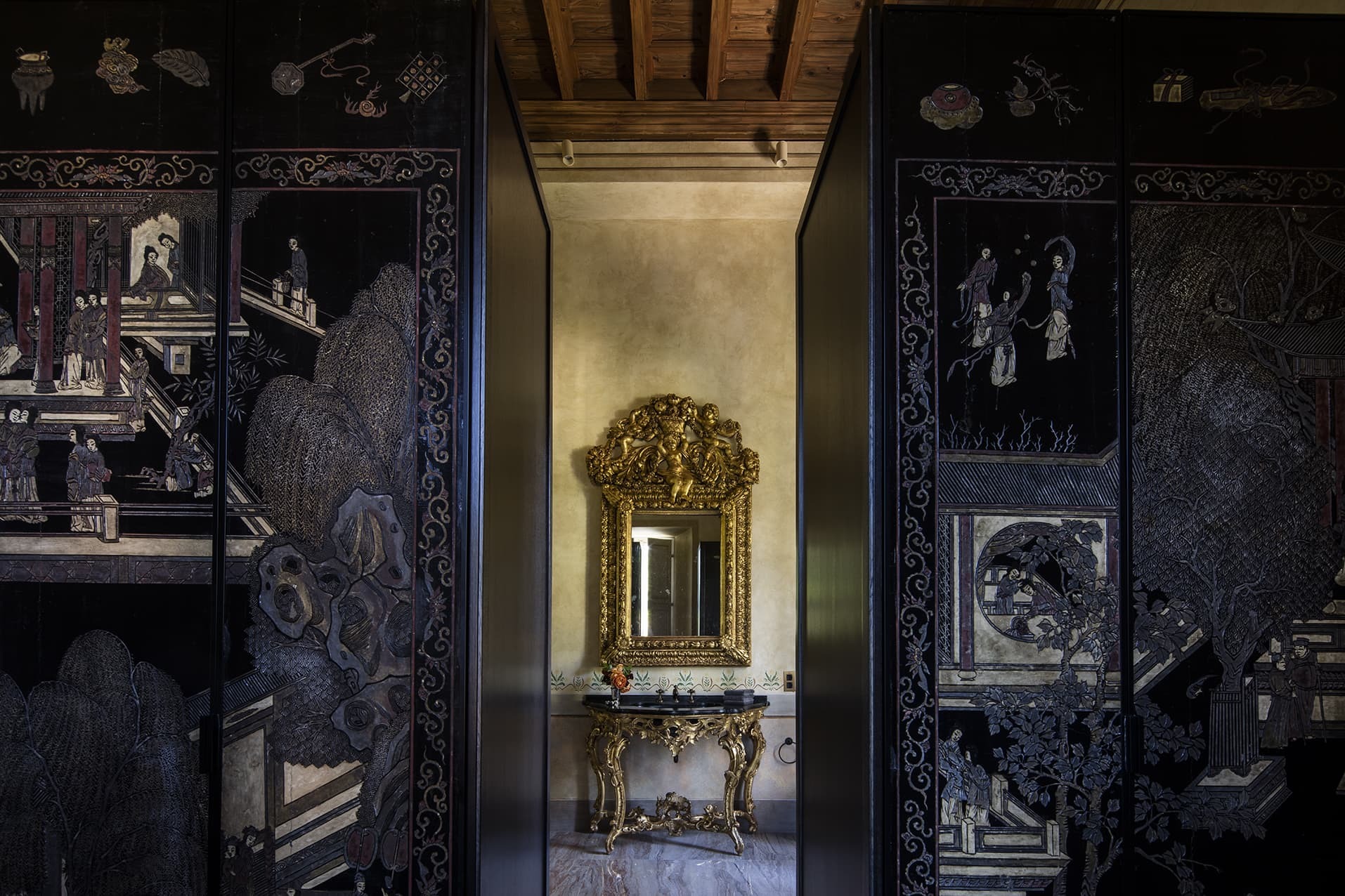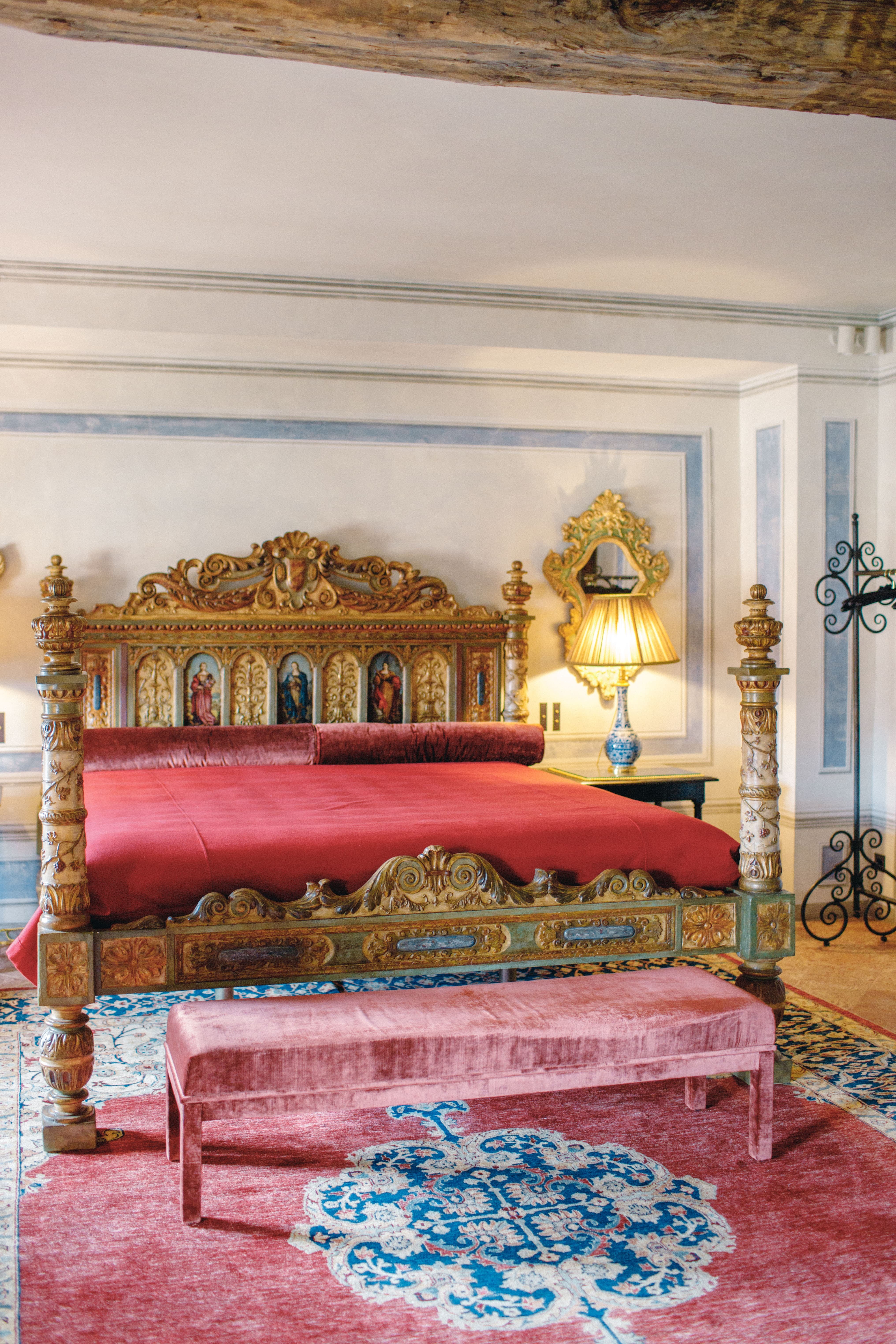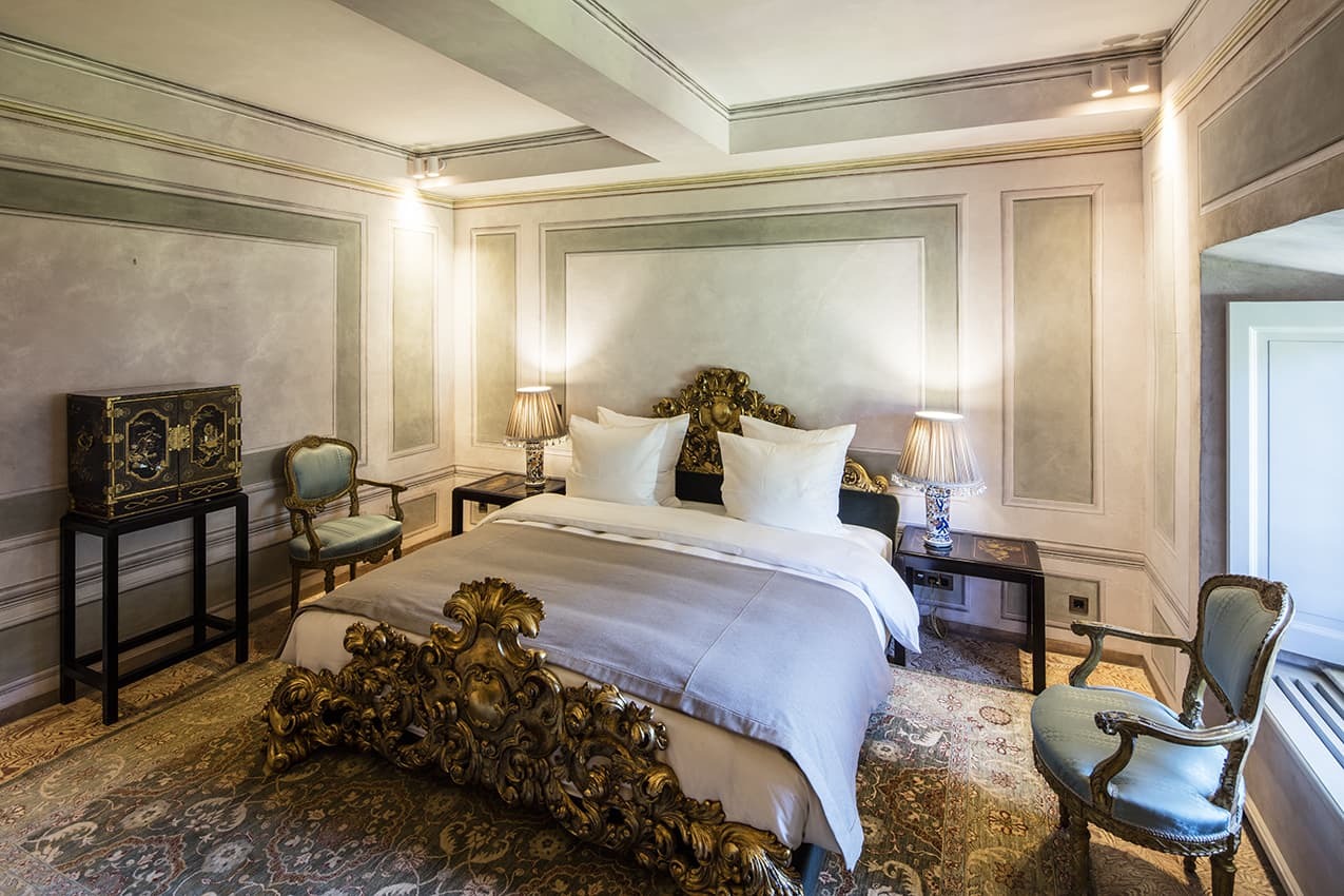 The estate accommodates up to 12 guests across six regal bedroom suites. Each suite is individually styled with antique furnishings, curated artworks, and lake or garden views. Generous proportions and high ceilings reinforce the sense of scale, while contemporary comforts ensure complete privacy and rest. Professional housekeeping is included, and laundry services are managed discreetly by the villa staff.