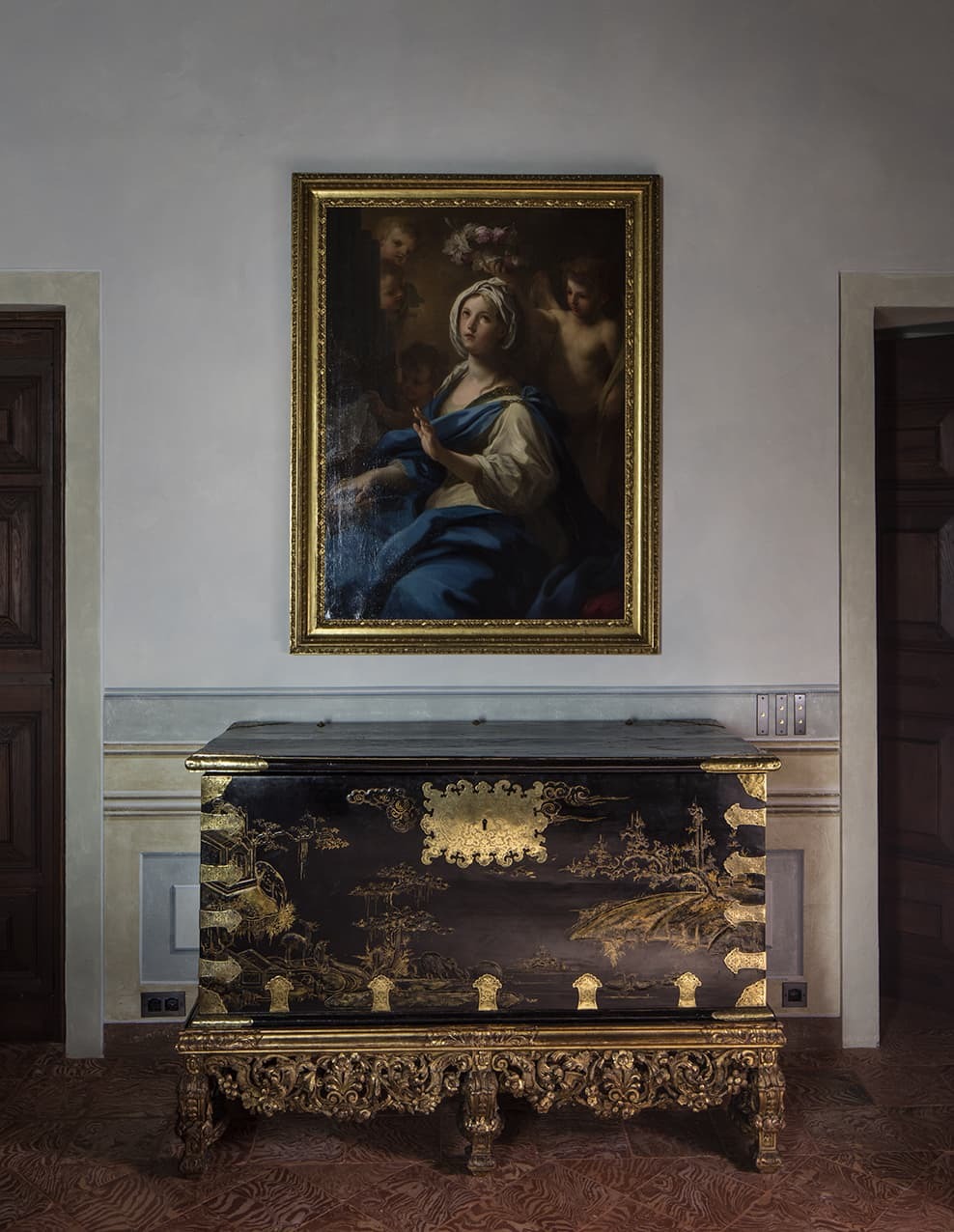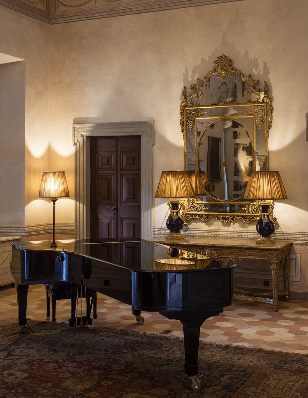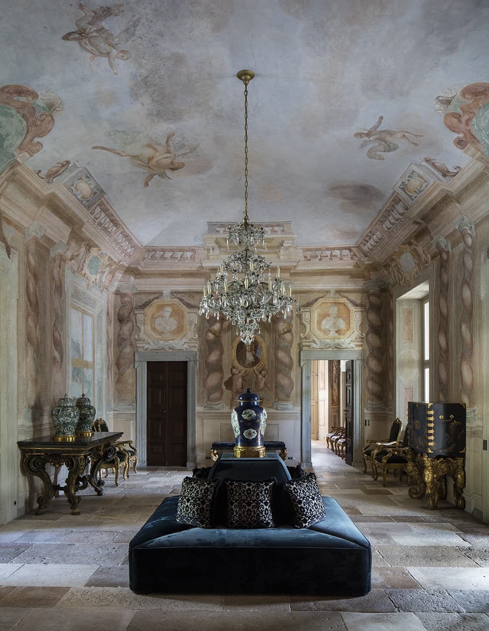 Villa Balbiano unfolds through a sequence of monumental salons and reception rooms that reflect its 16th-century aristocratic heritage. Frescoed ceilings, marble floors, crystal chandeliers, and museum-quality artworks define the principal living areas, while expansive windows frame uninterrupted views across Lake Como. A winter garden, formal dining hall, and refined lounges create spaces equally suited to grand entertaining and intimate evenings. A grand piano anchors one of the principal salons, echoing the villa’s history of concerts and literary gatherings.
