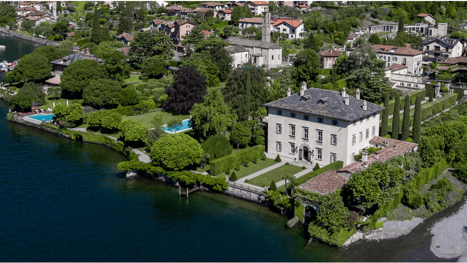 Surrounded by nearly three acres of meticulously landscaped gardens, the estate commands sweeping lake views framed by rose beds, wisteria-draped pergolas, sculptural fountains, and centuries-old trees. Hidden statues and water features reveal themselves along garden paths, while a private pier and boathouse provide direct access to the lake, allowing seamless arrival by water.