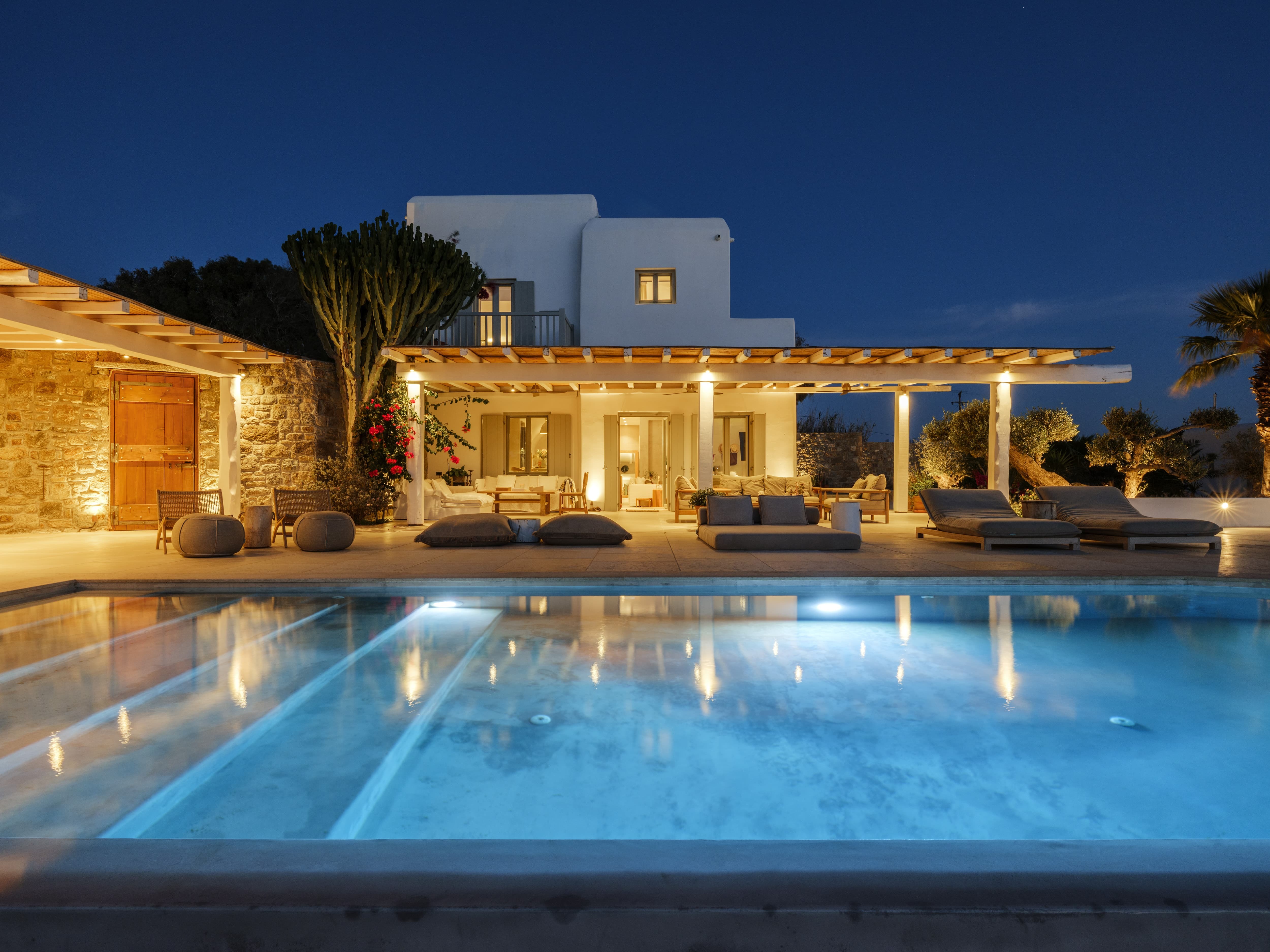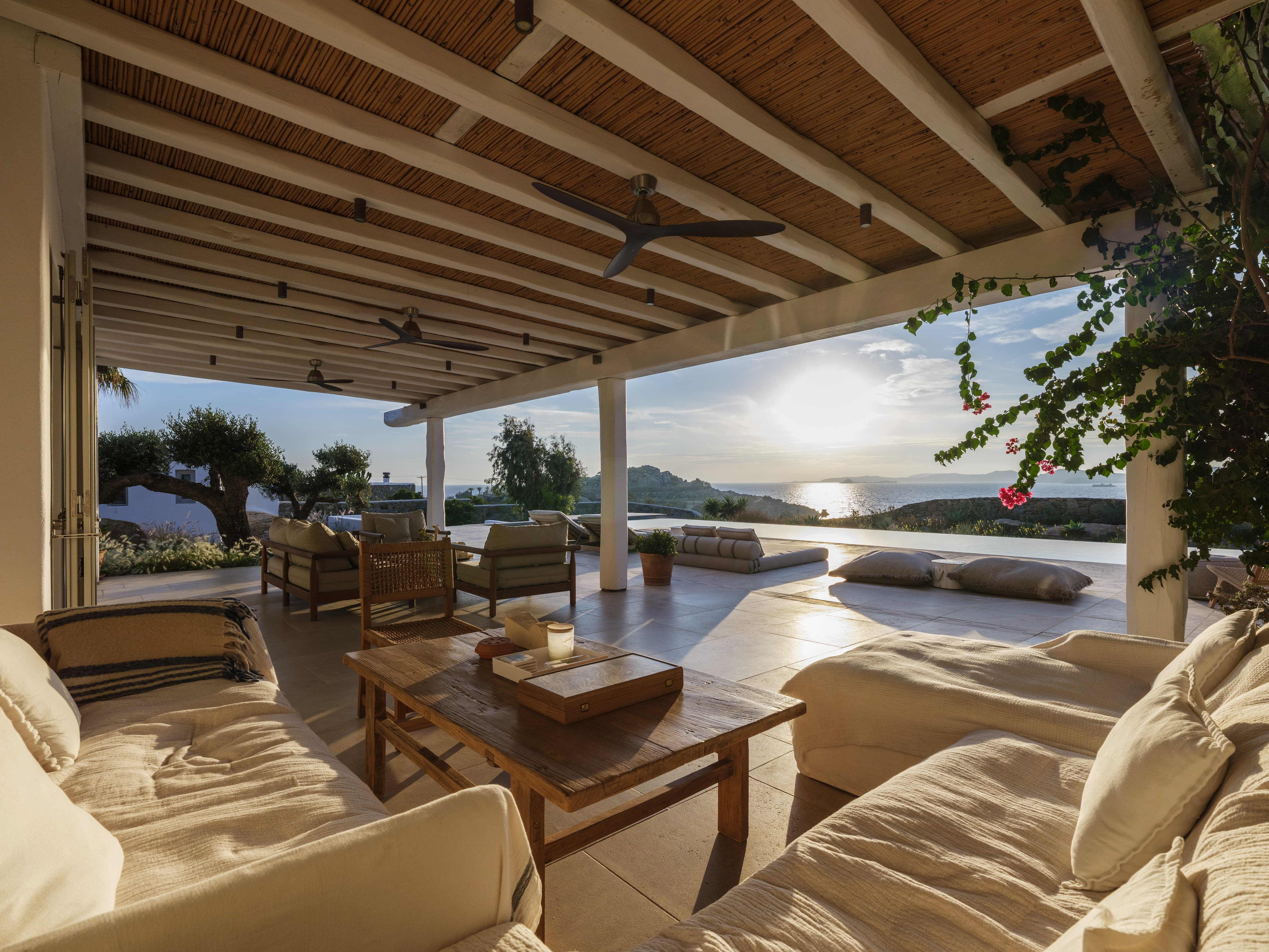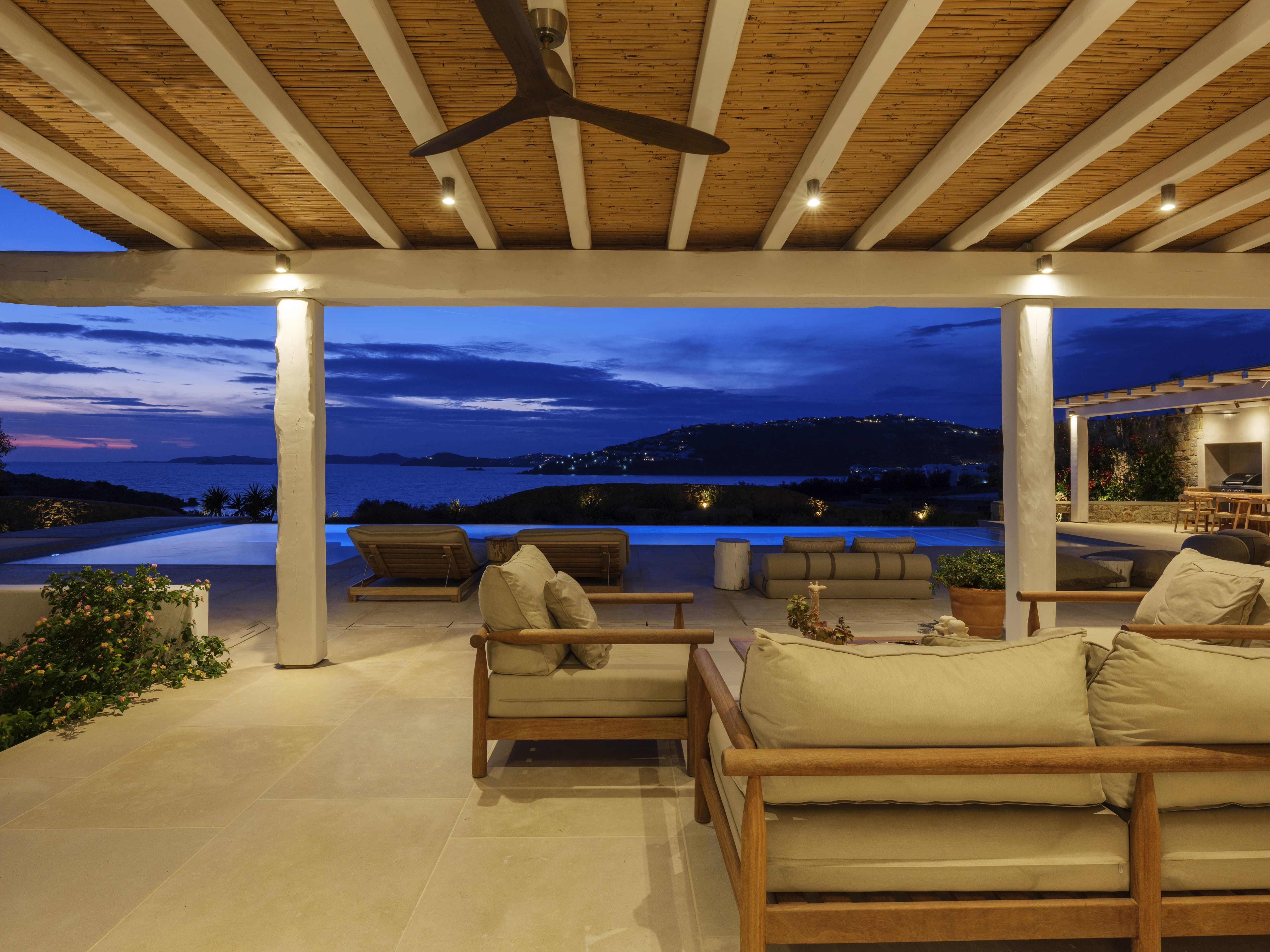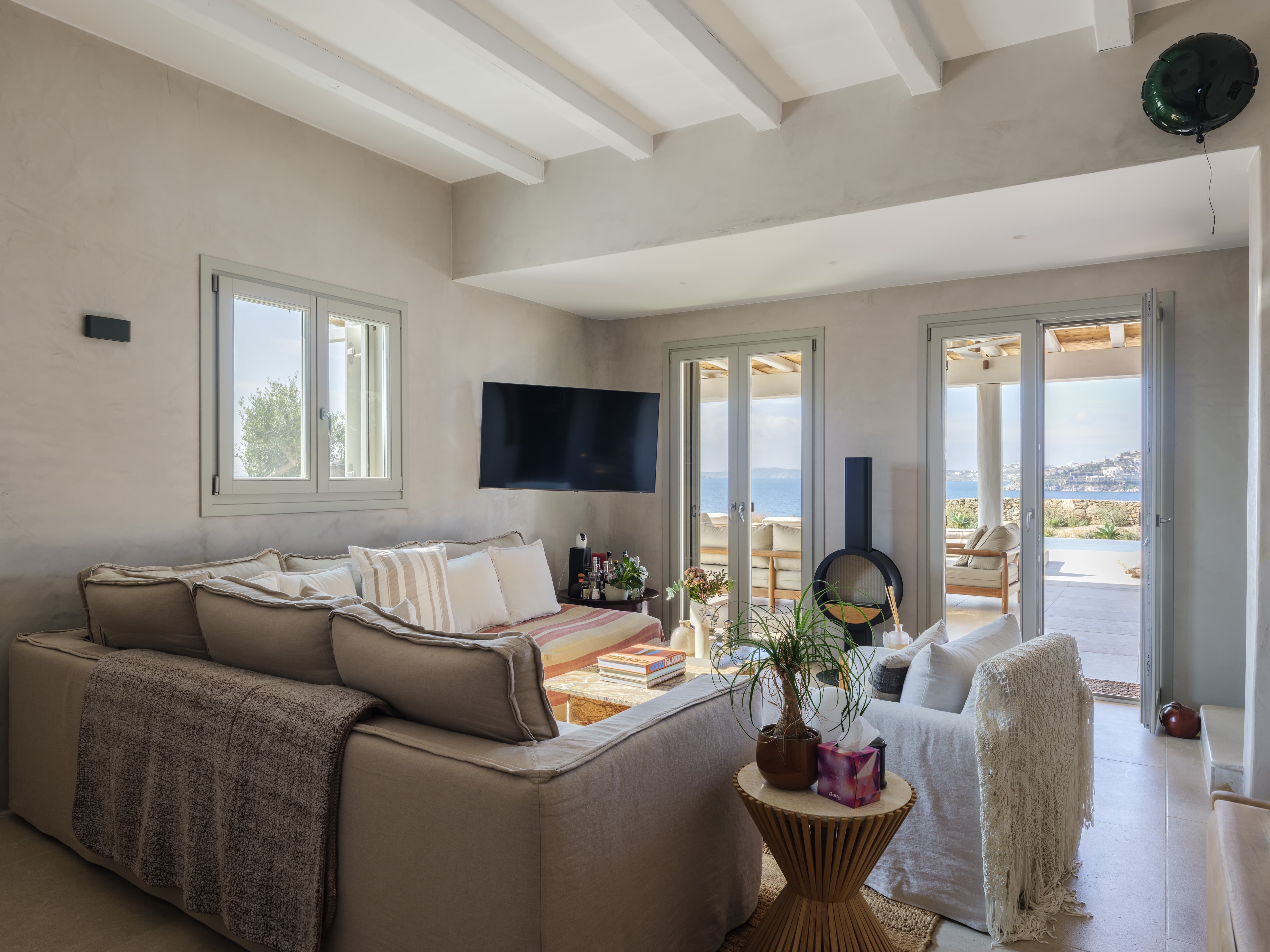 Flat-screen televisions and relaxed lounge areas provide indoor entertainment, while the primary focus remains on the outdoor lifestyle and surrounding setting. The villa’s proximity to Mykonos’ most iconic beach venues also adds an additional layer of entertainment just moments away.