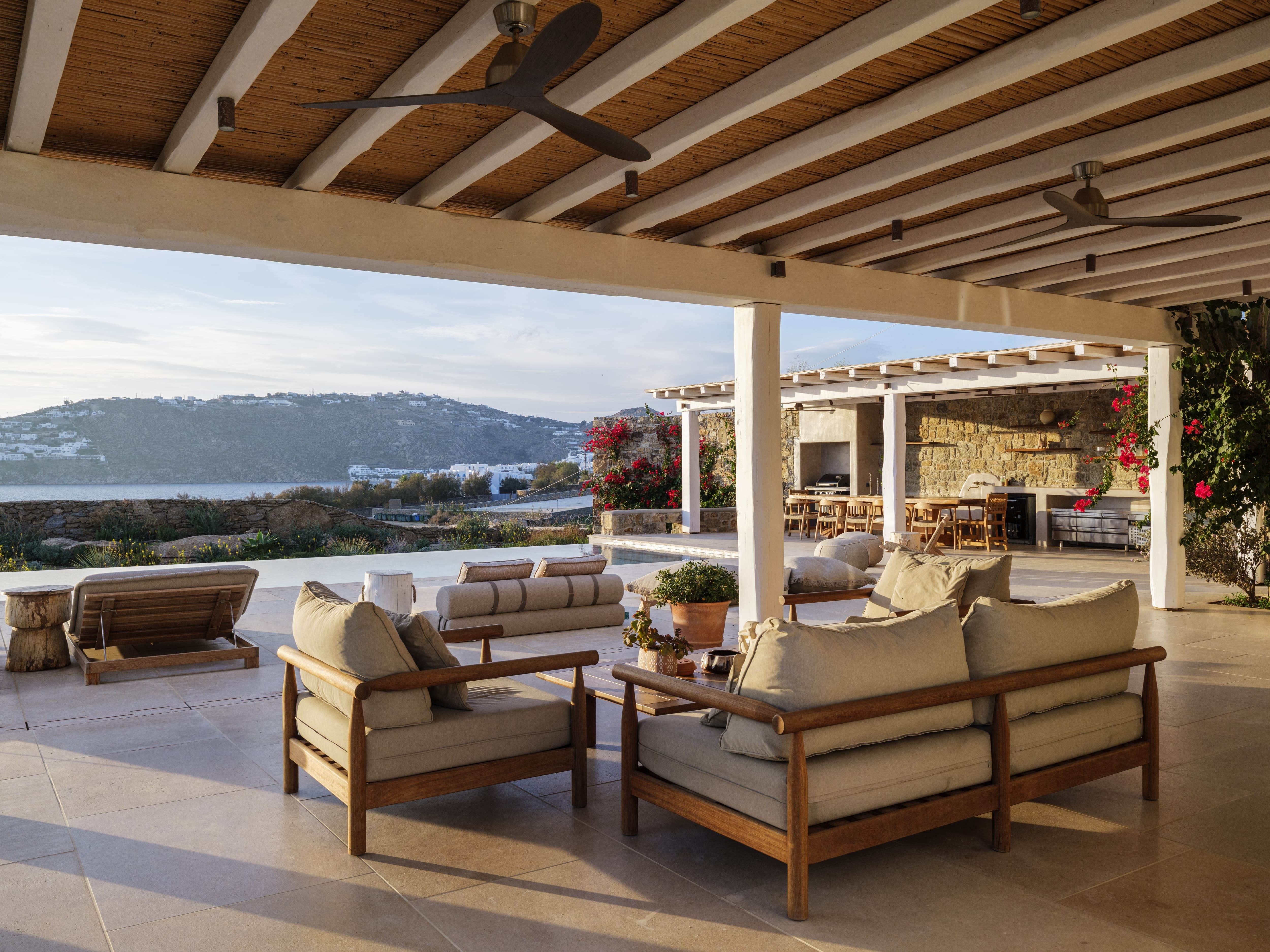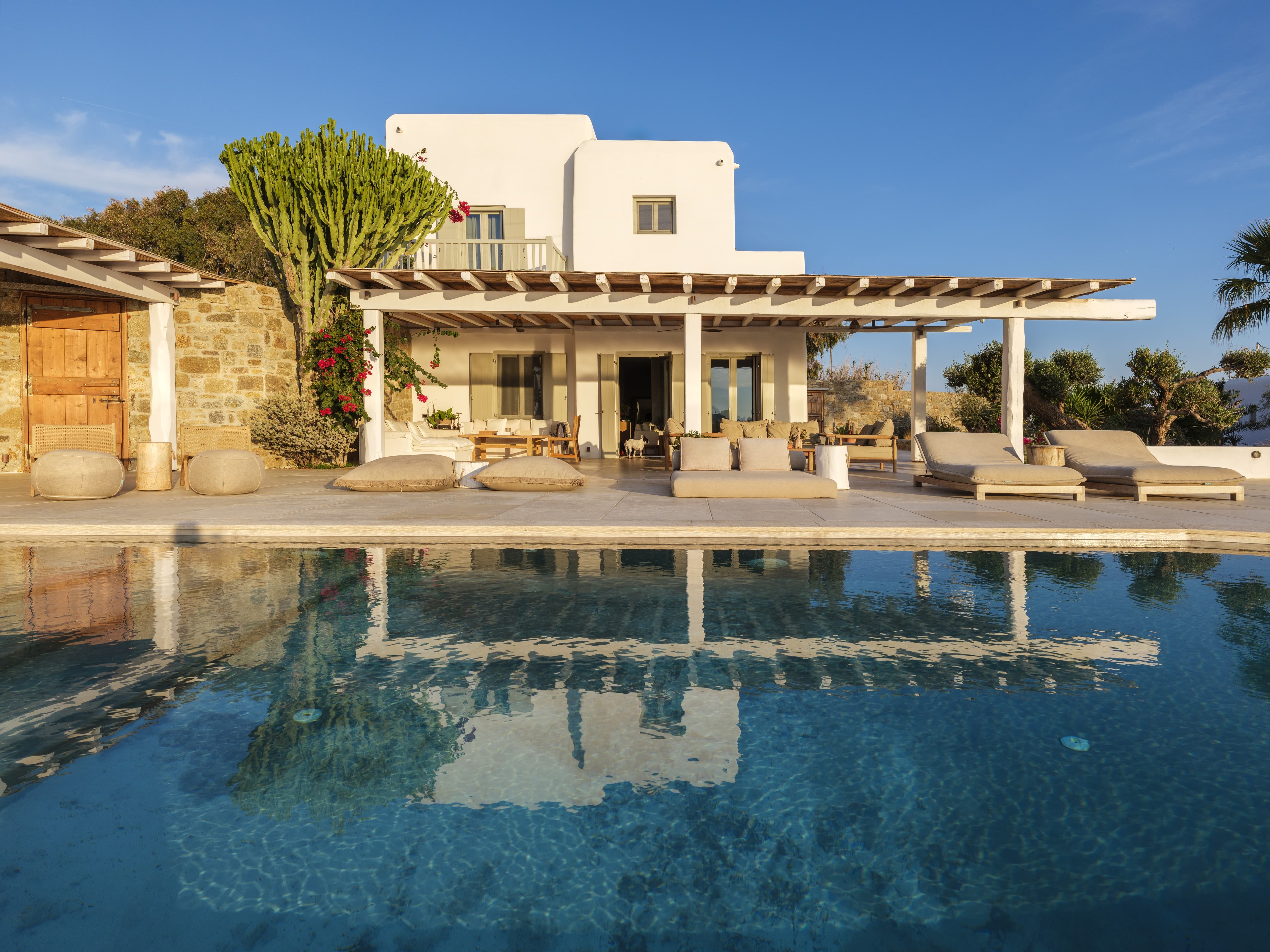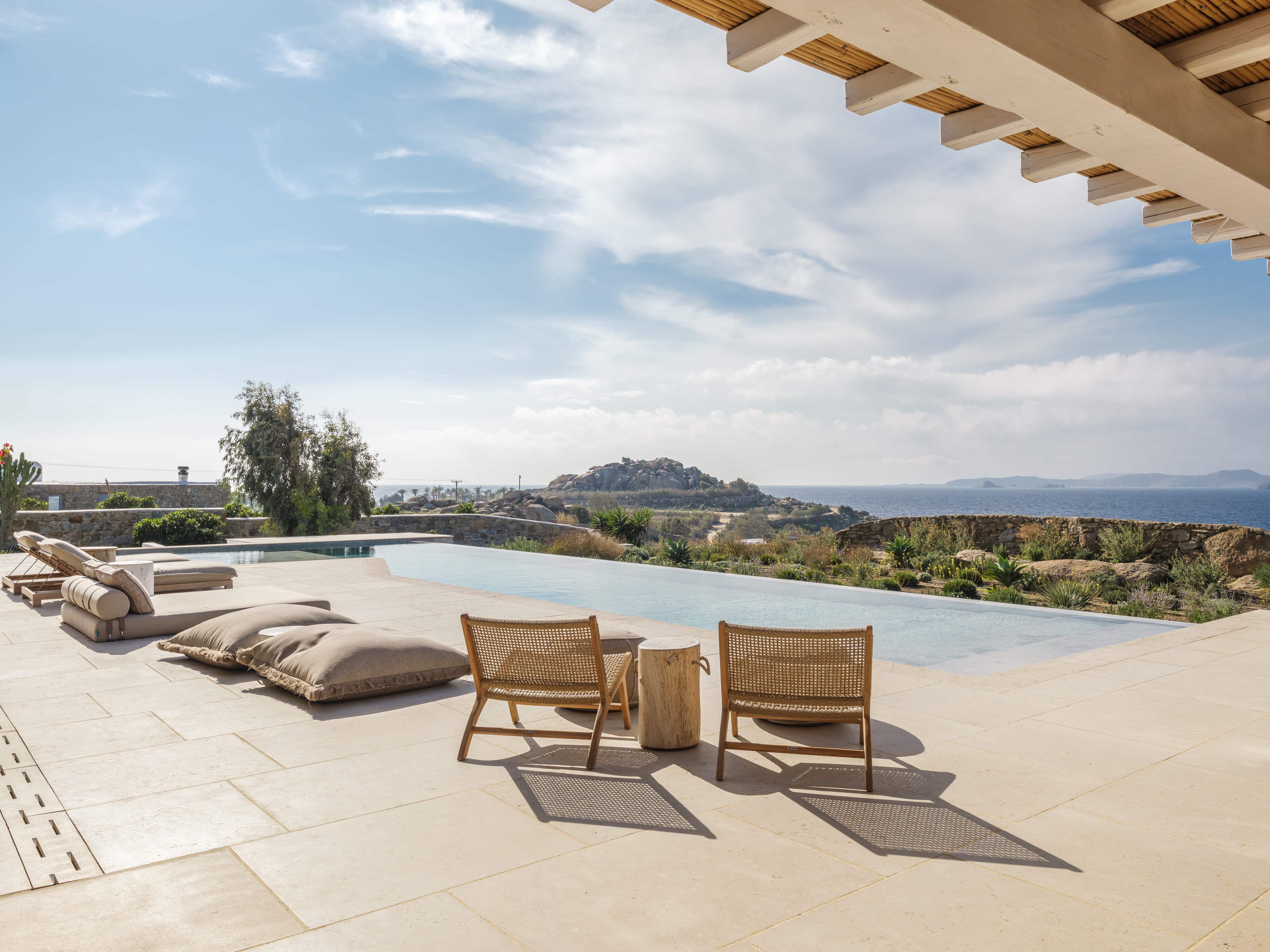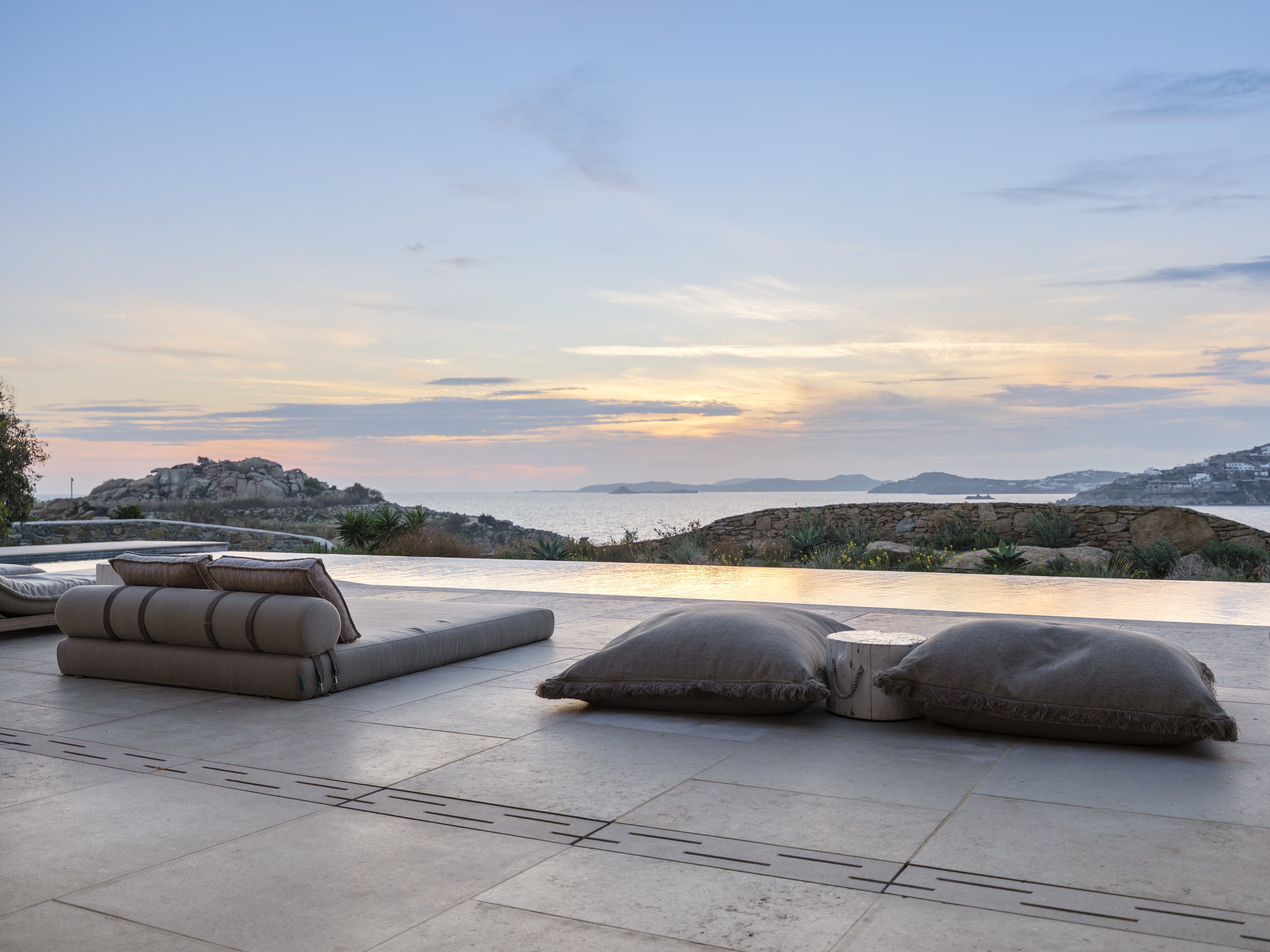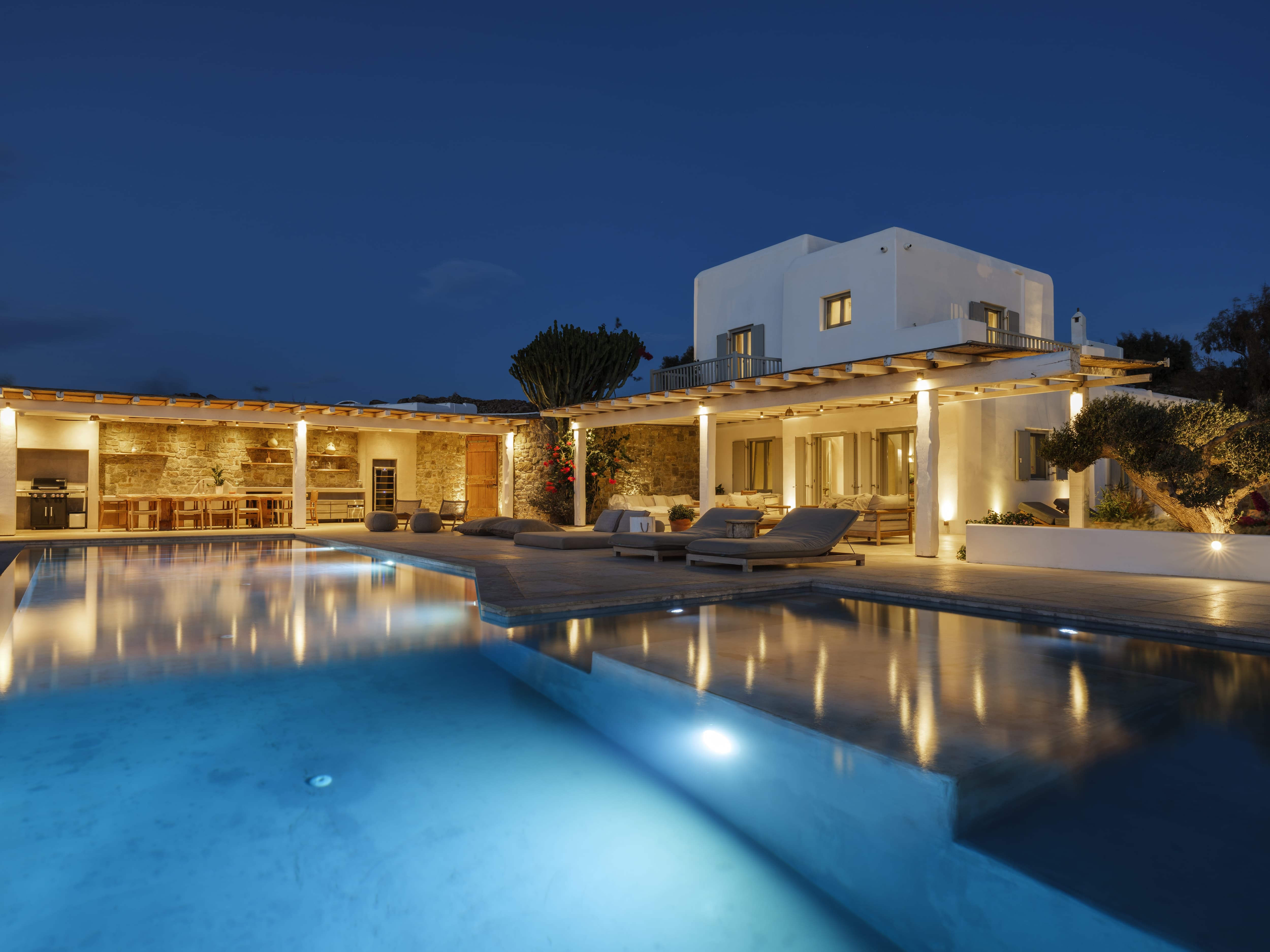 Flat-screen televisions and relaxed lounge areas provide indoor entertainment, while the primary focus remains on the outdoor lifestyle and surrounding setting. The villa’s proximity to Mykonos’ most iconic beach venues also adds an additional layer of entertainment just moments away.