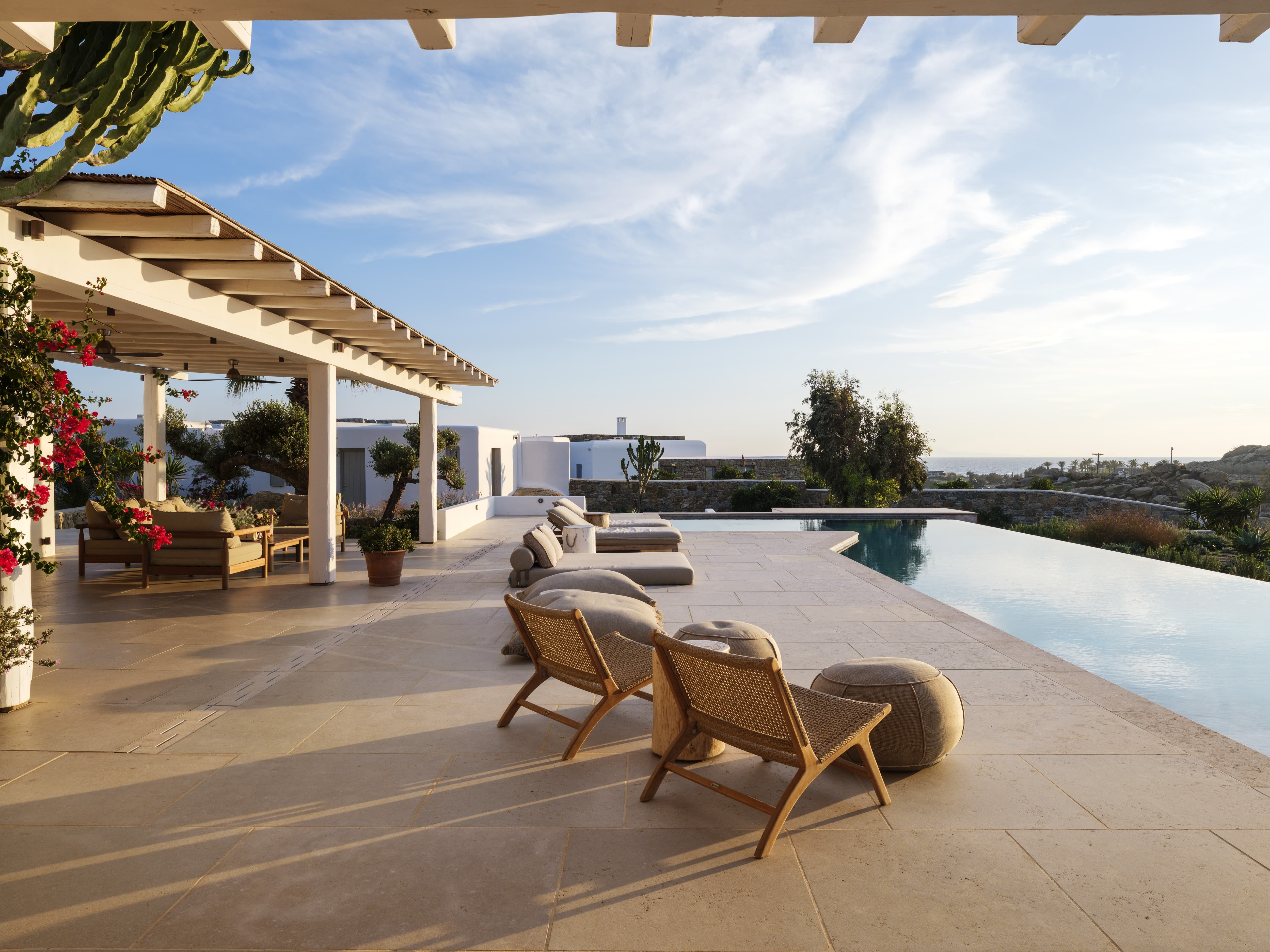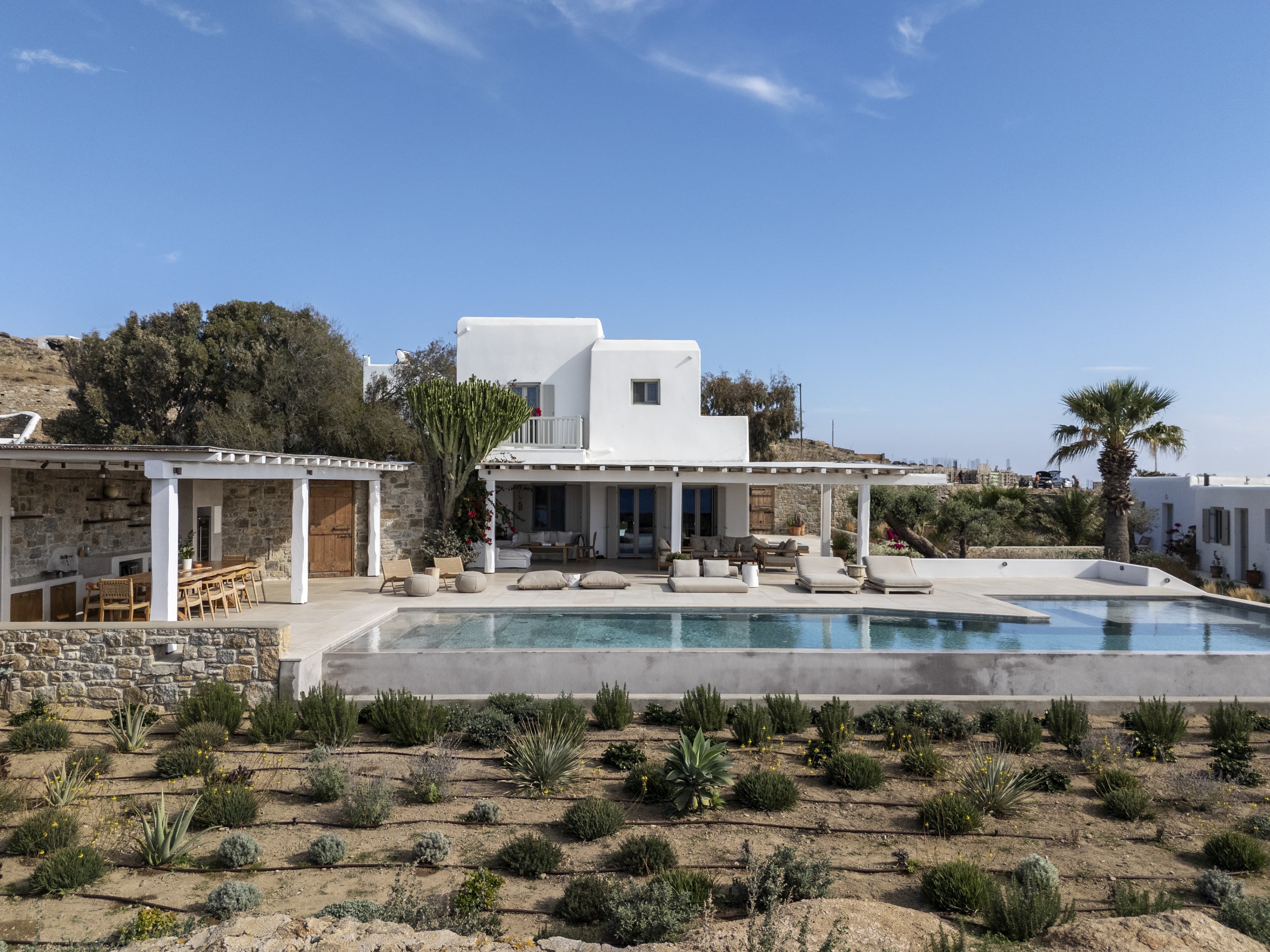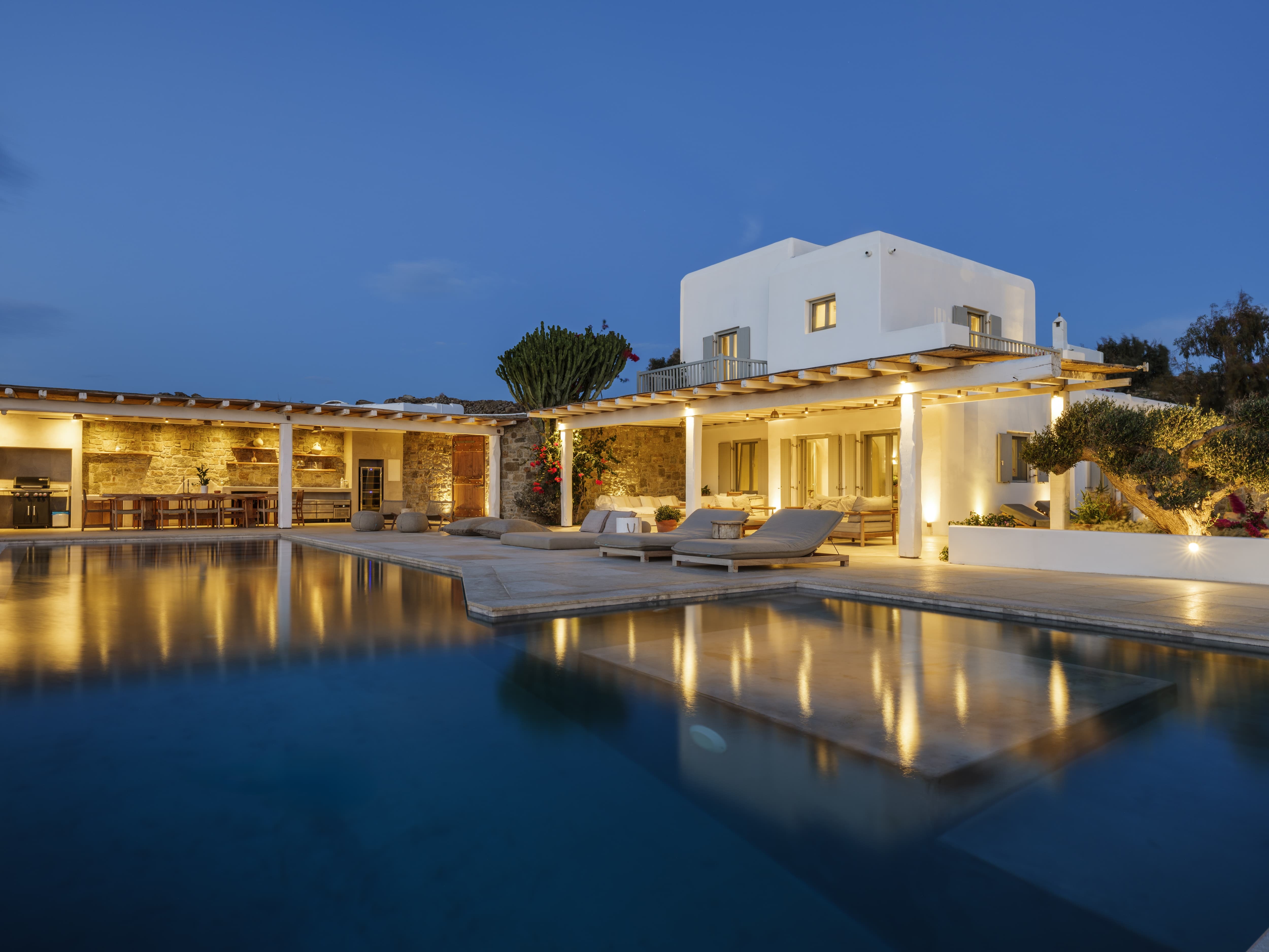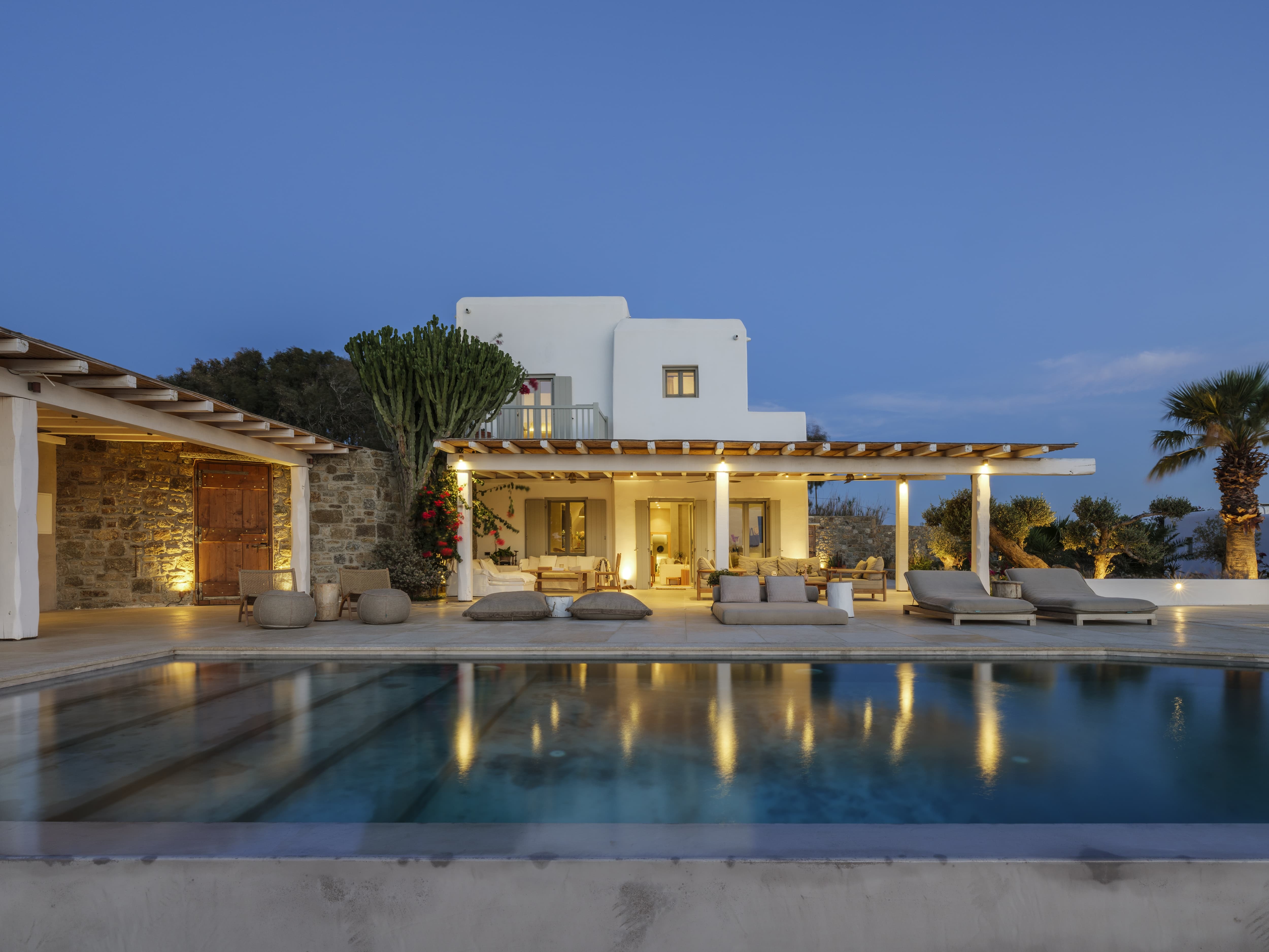 Flat-screen televisions and relaxed lounge areas provide indoor entertainment, while the primary focus remains on the outdoor lifestyle and surrounding setting. The villa’s proximity to Mykonos’ most iconic beach venues also adds an additional layer of entertainment just moments away.
