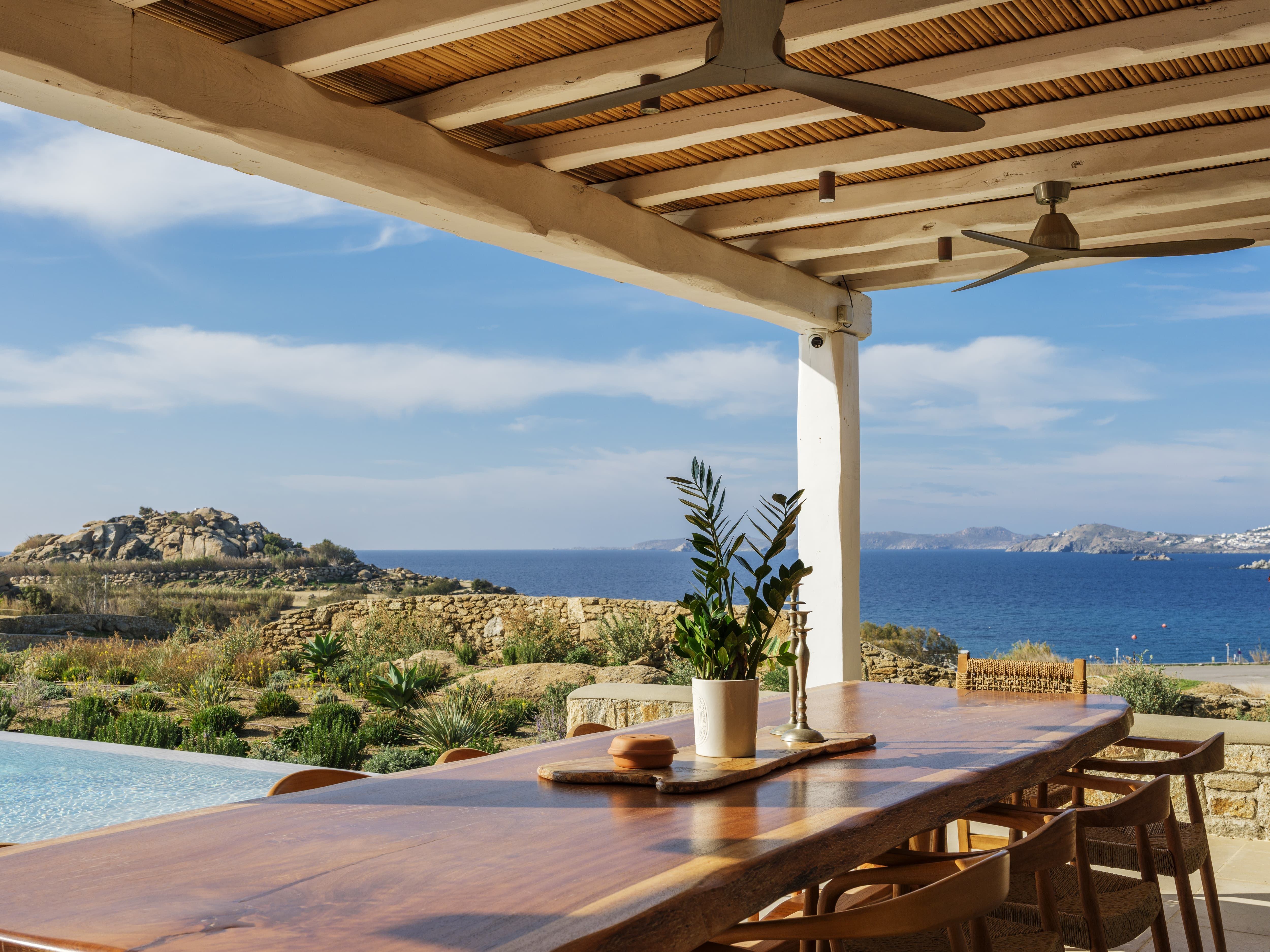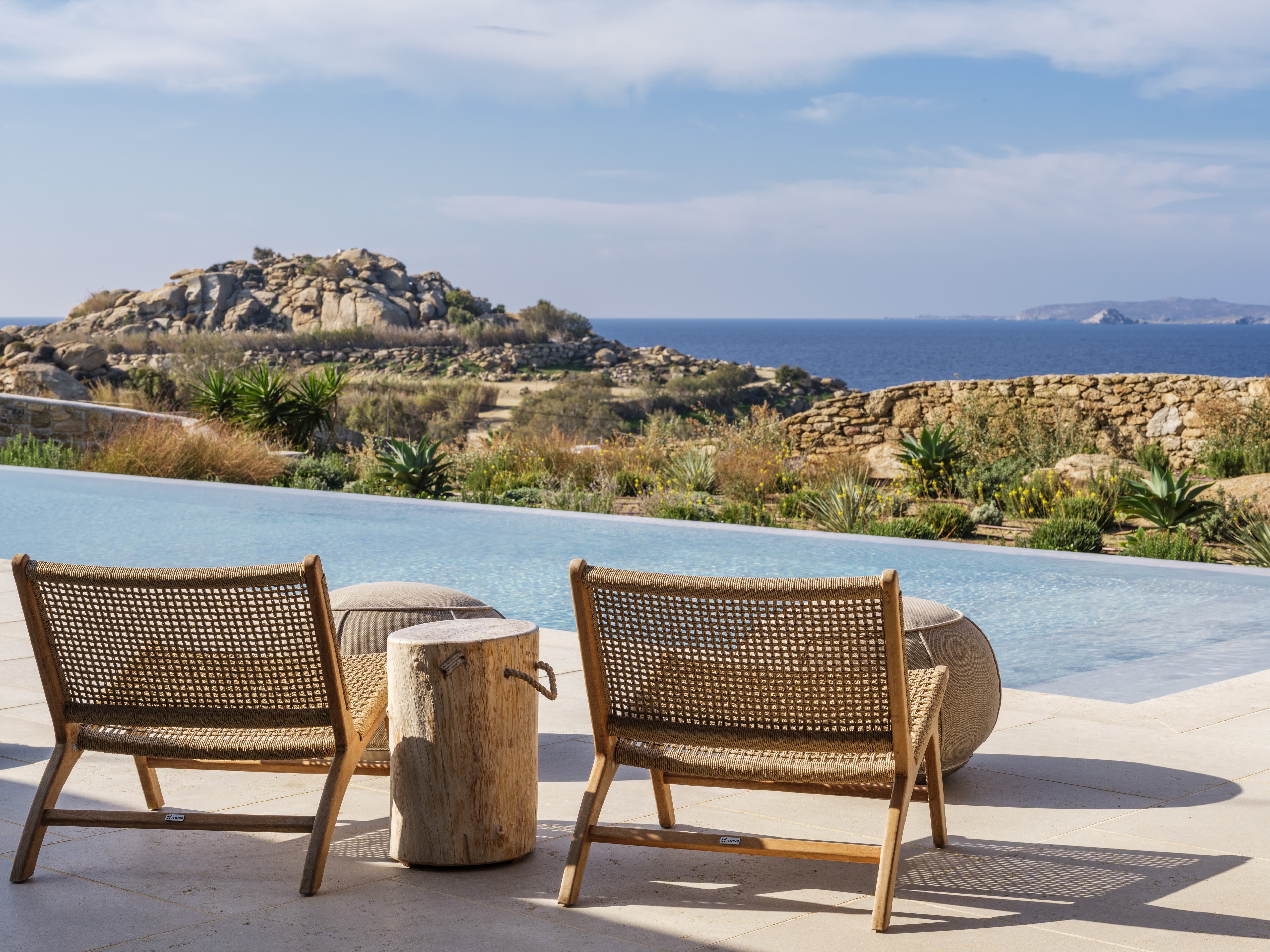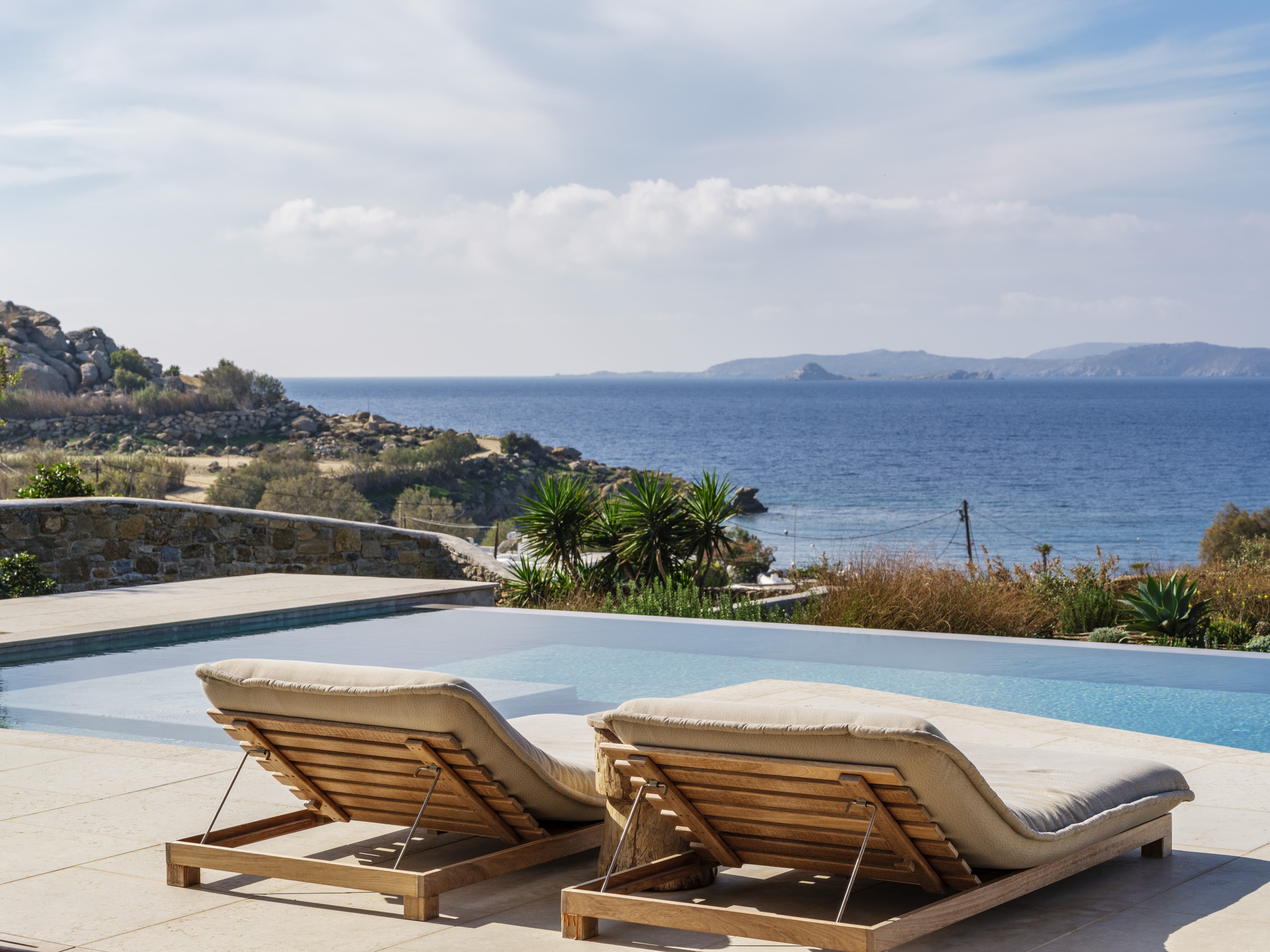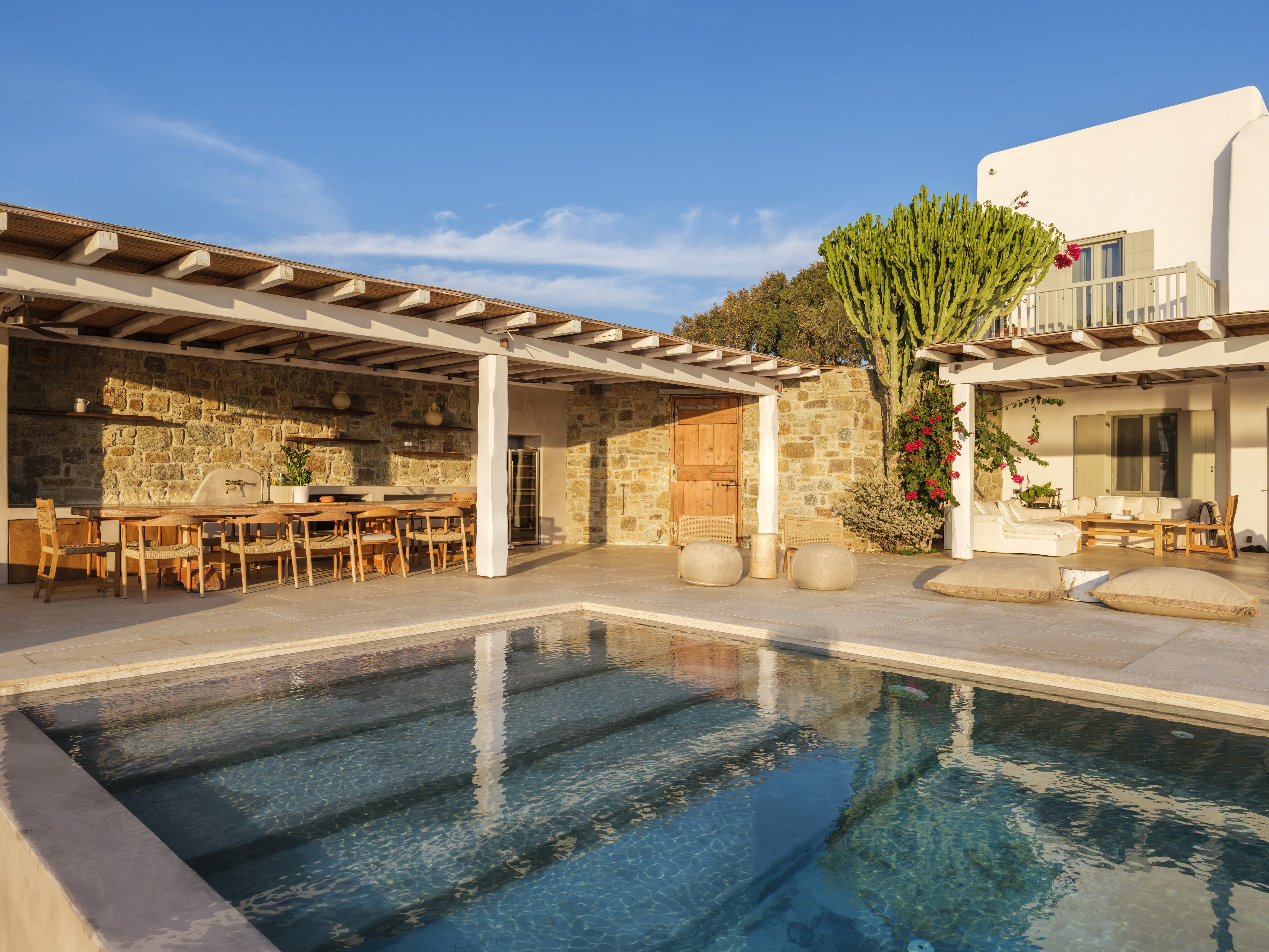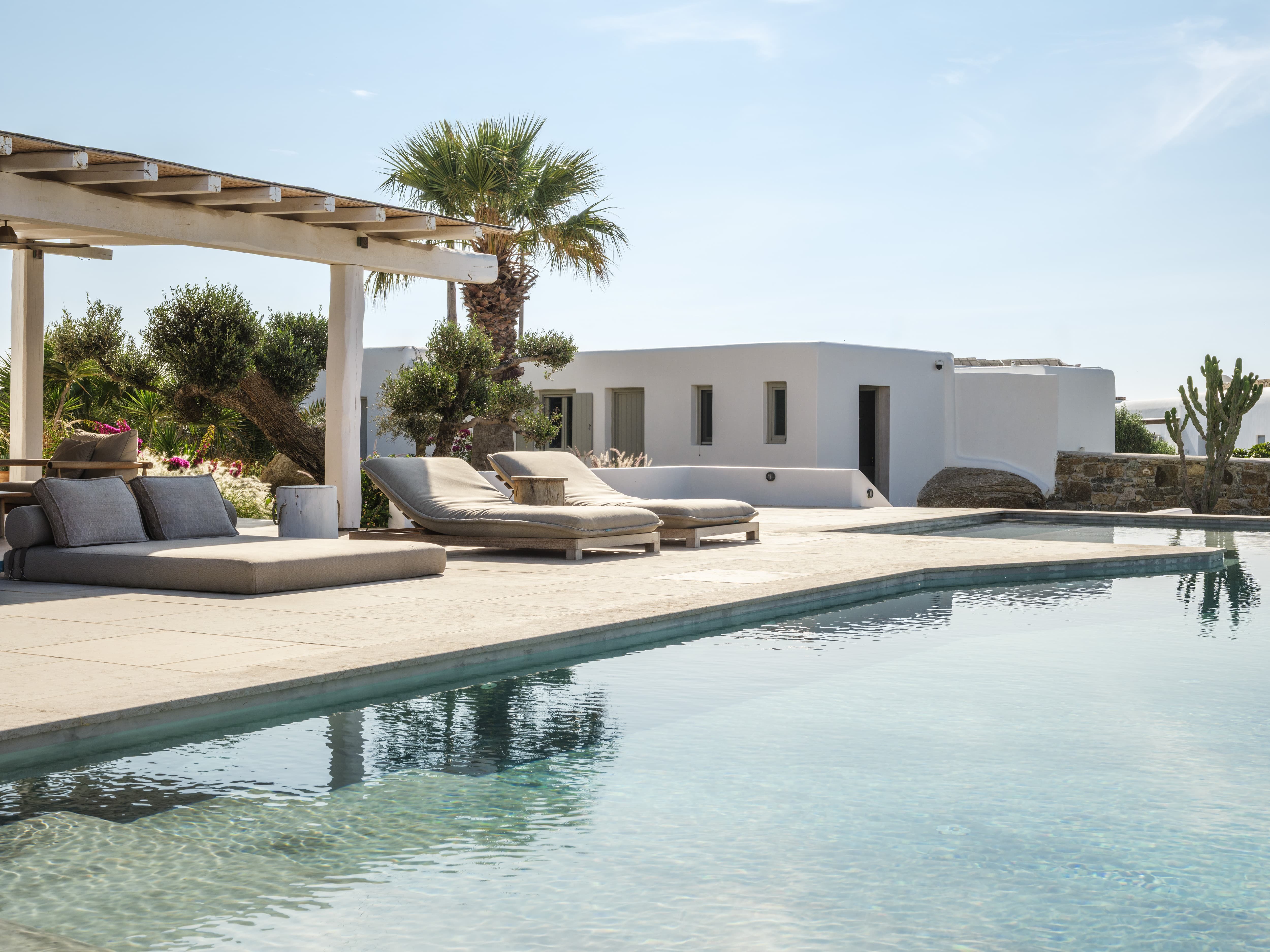 Flat-screen televisions and relaxed lounge areas provide indoor entertainment, while the primary focus remains on the outdoor lifestyle and surrounding setting. The villa’s proximity to Mykonos’ most iconic beach venues also adds an additional layer of entertainment just moments away.