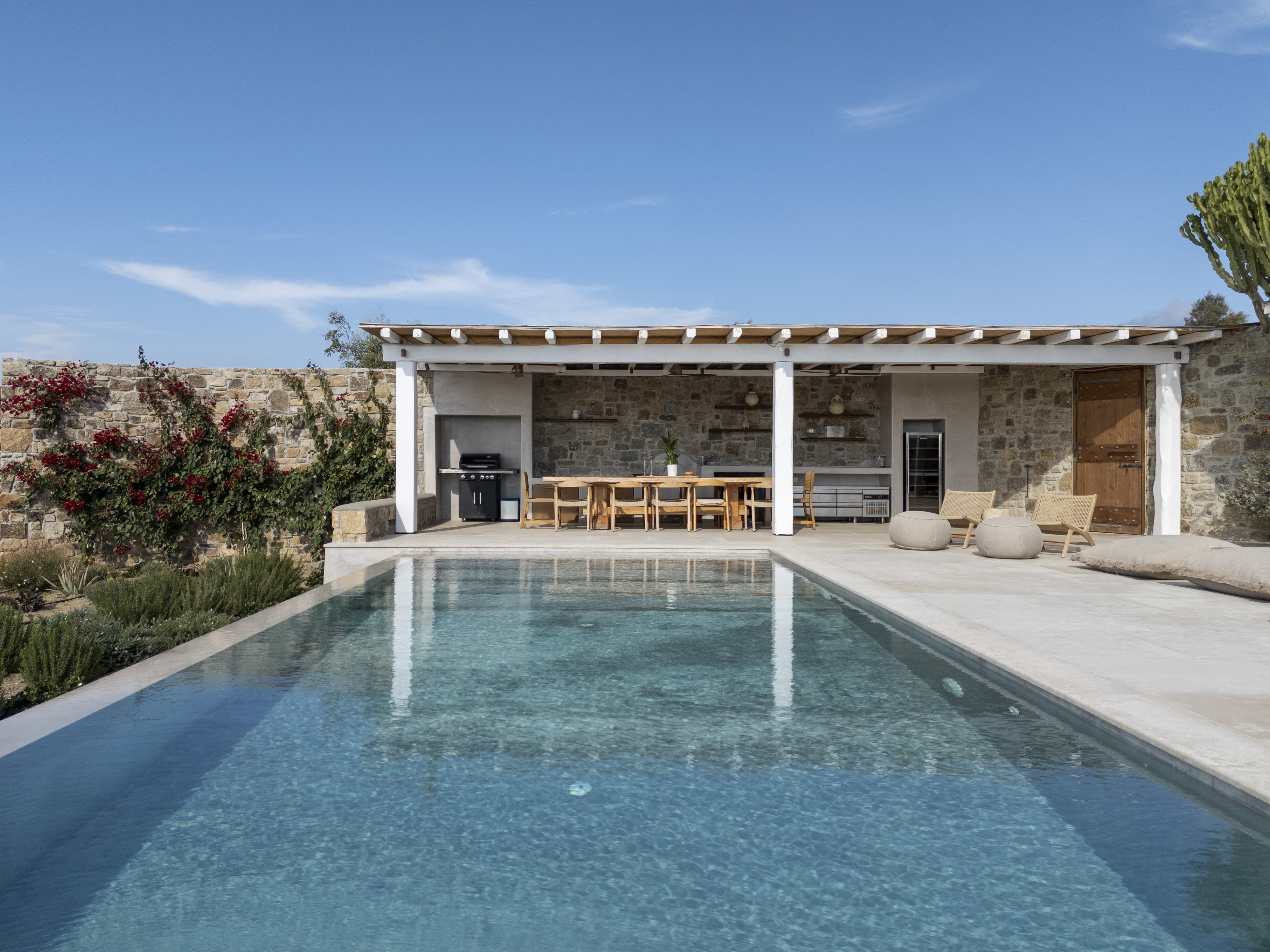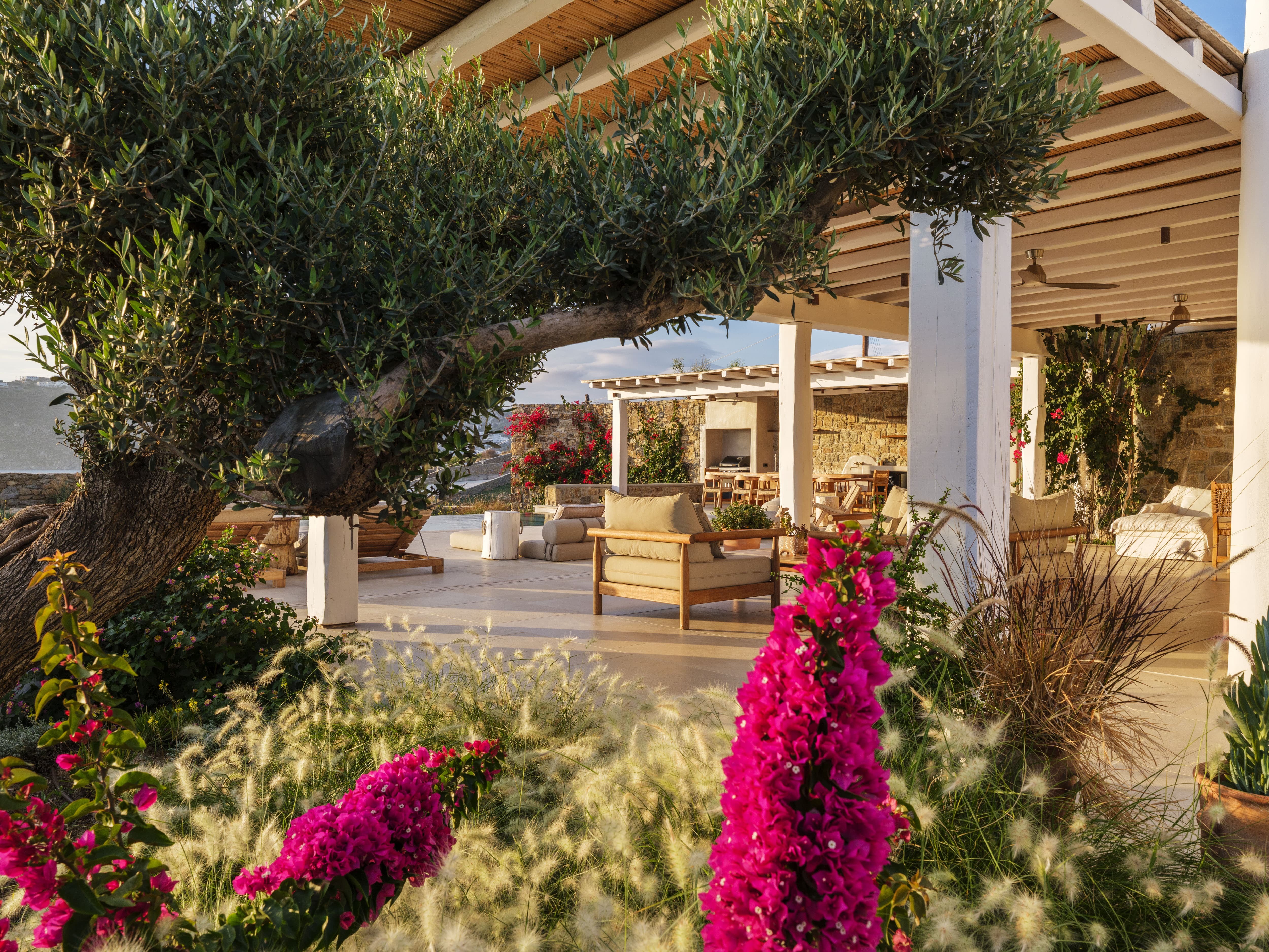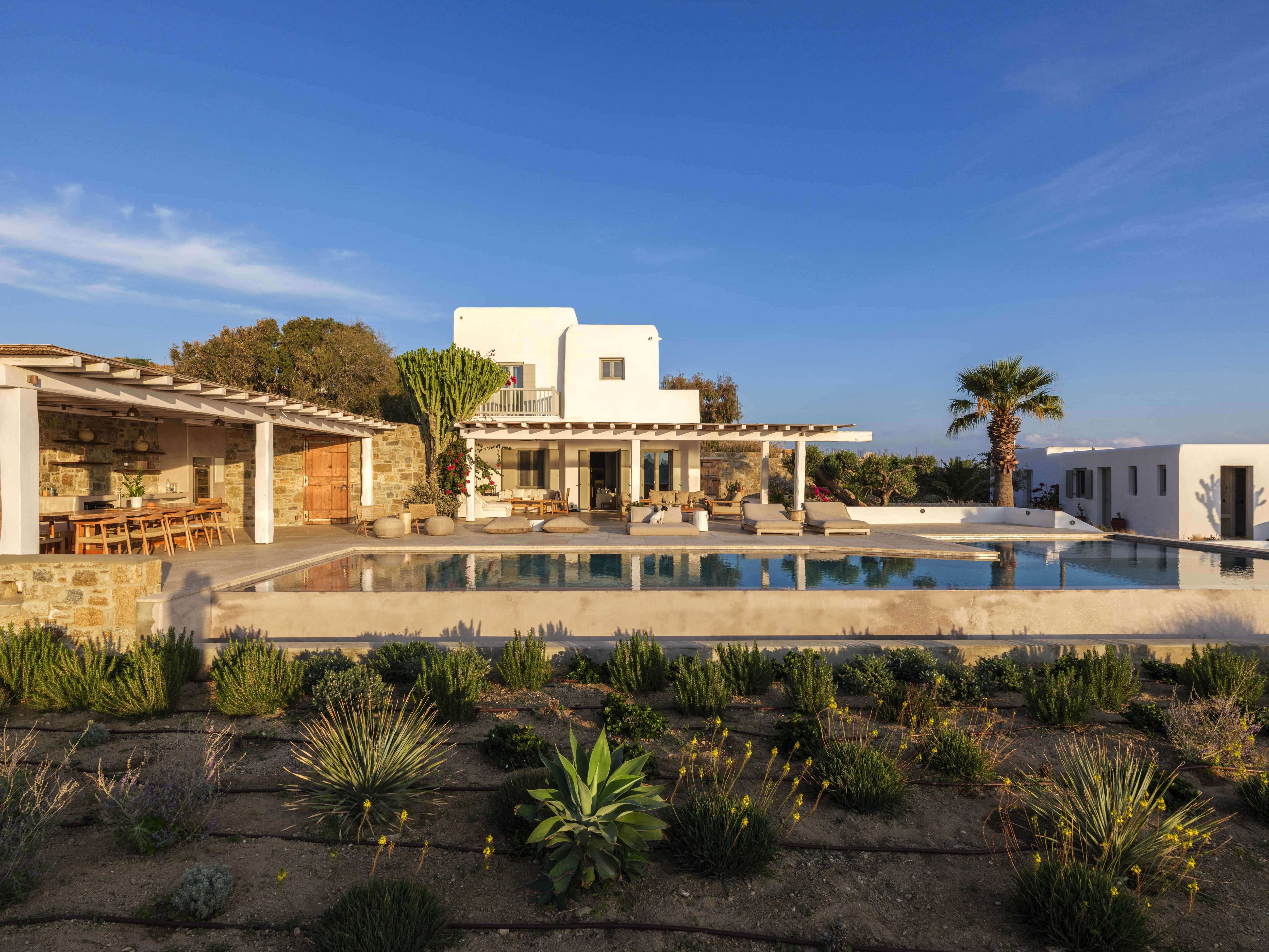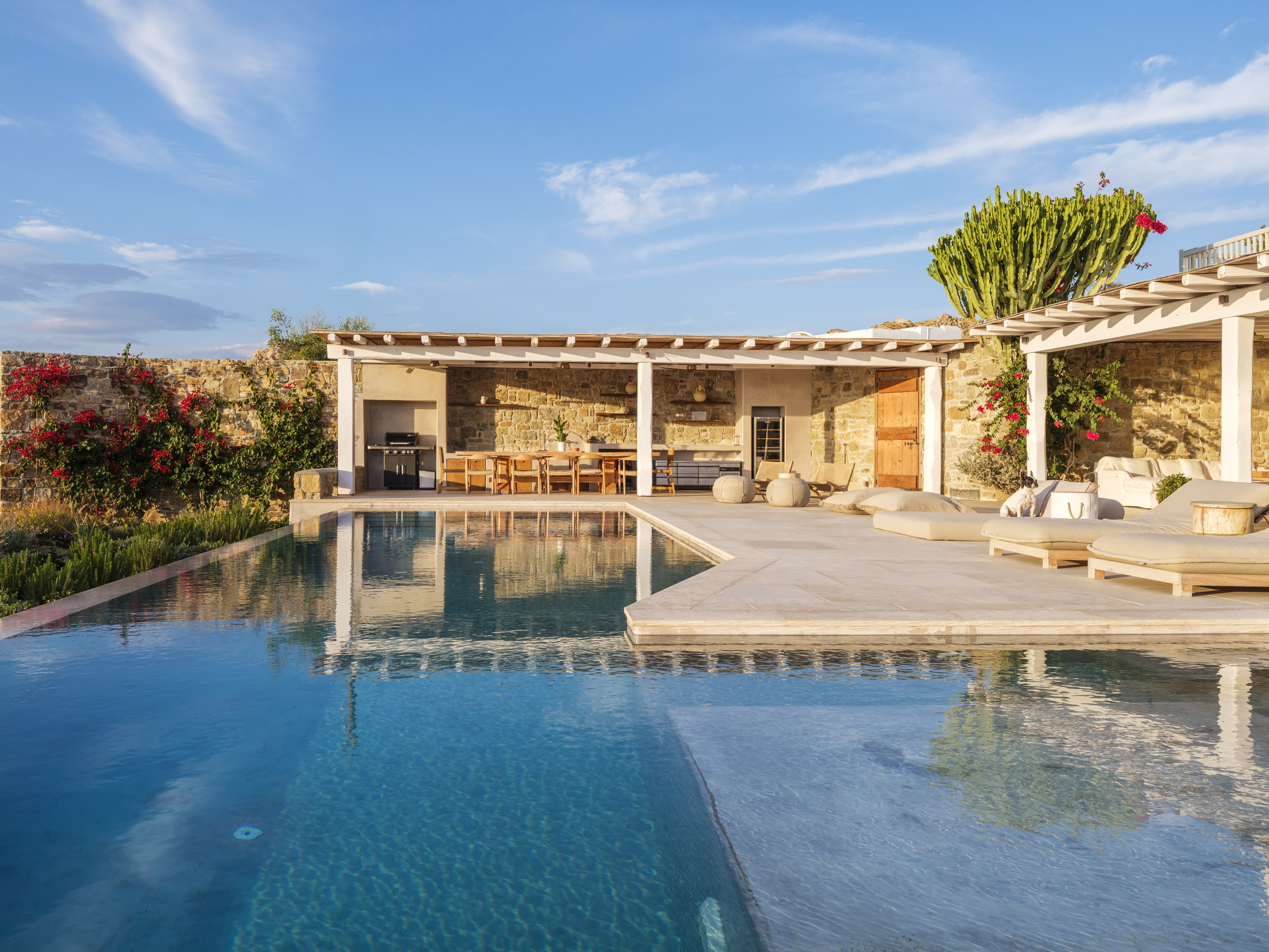 Flat-screen televisions and relaxed lounge areas provide indoor entertainment, while the primary focus remains on the outdoor lifestyle and surrounding setting. The villa’s proximity to Mykonos’ most iconic beach venues also adds an additional layer of entertainment just moments away.
