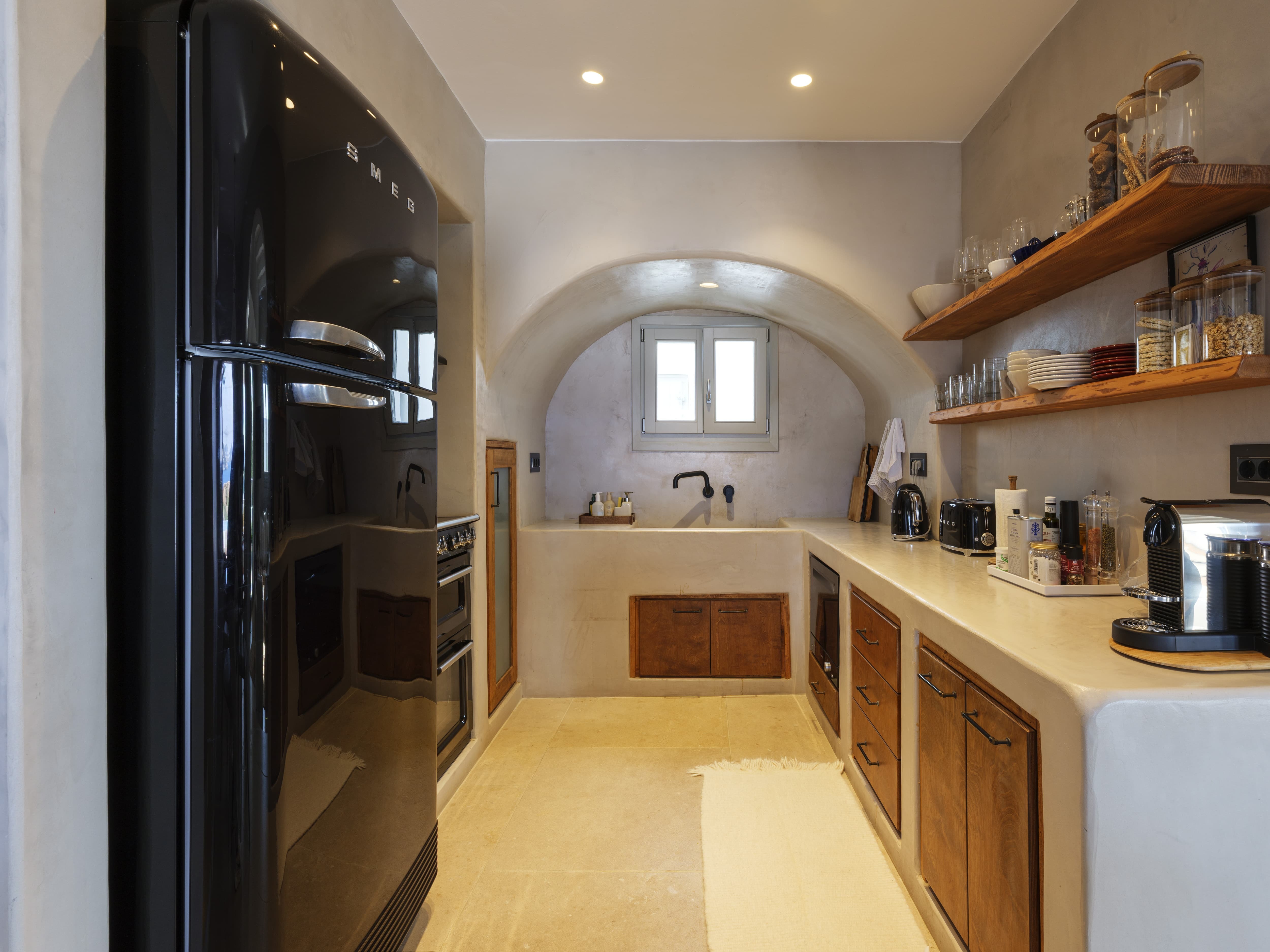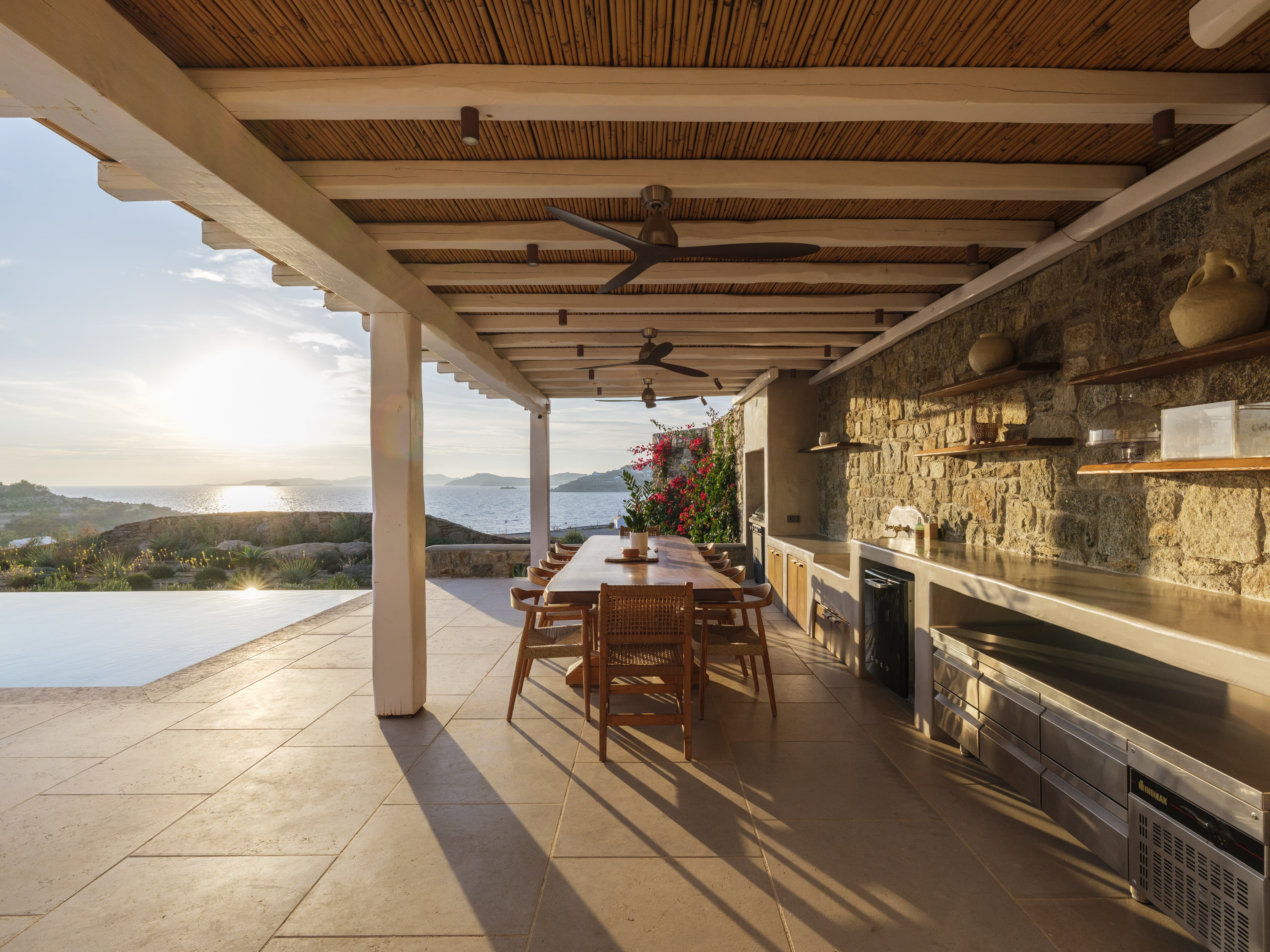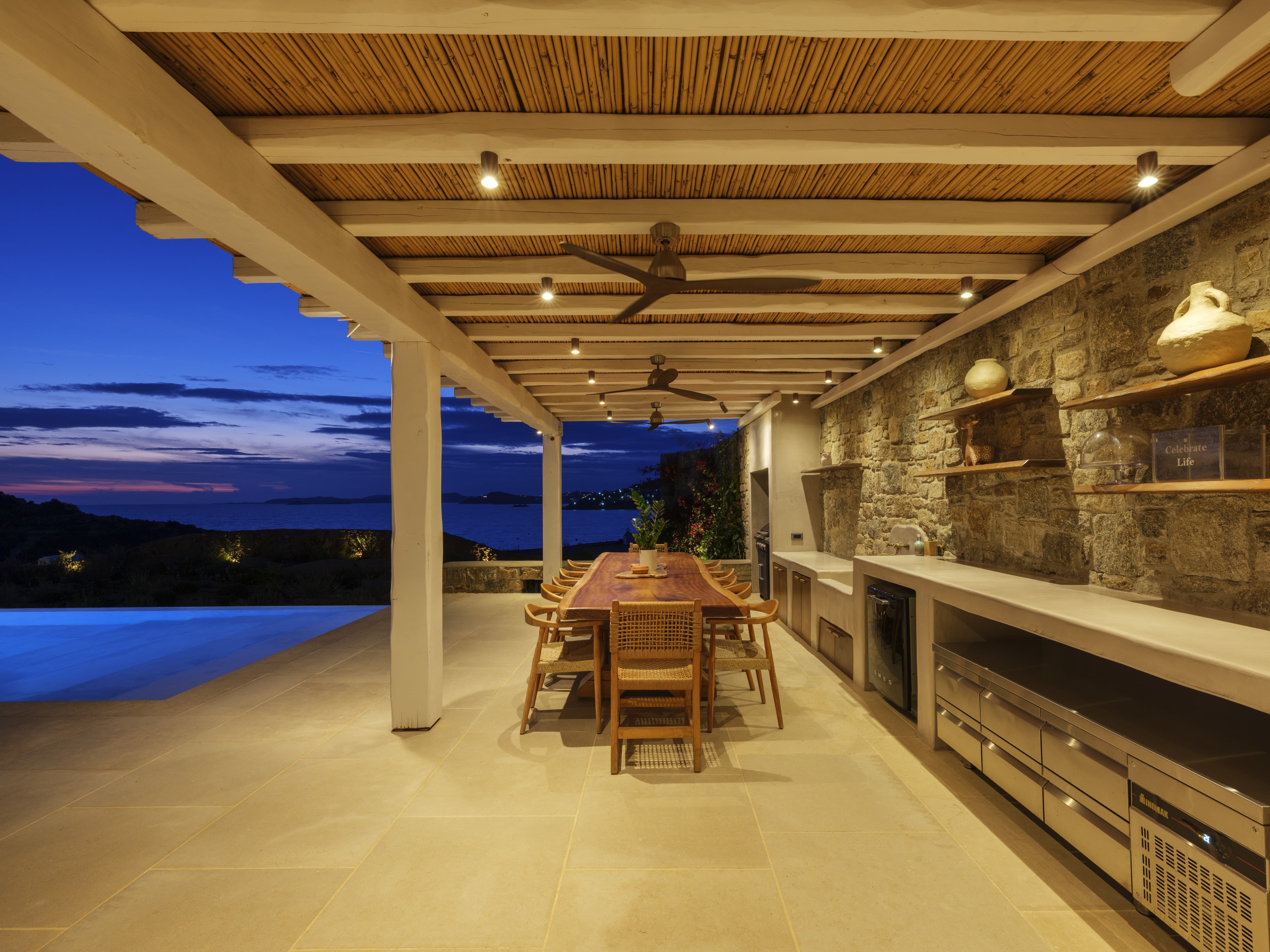 A fully equipped kitchen sits at the centre of the villa, designed for both self-catered stays and private chef experiences. Indoor and outdoor dining areas provide flexibility throughout the day, from relaxed breakfasts to long, informal dinners overlooking the sea. The open-plan layout allows dining to feel connected to both the living space and the terrace beyond.