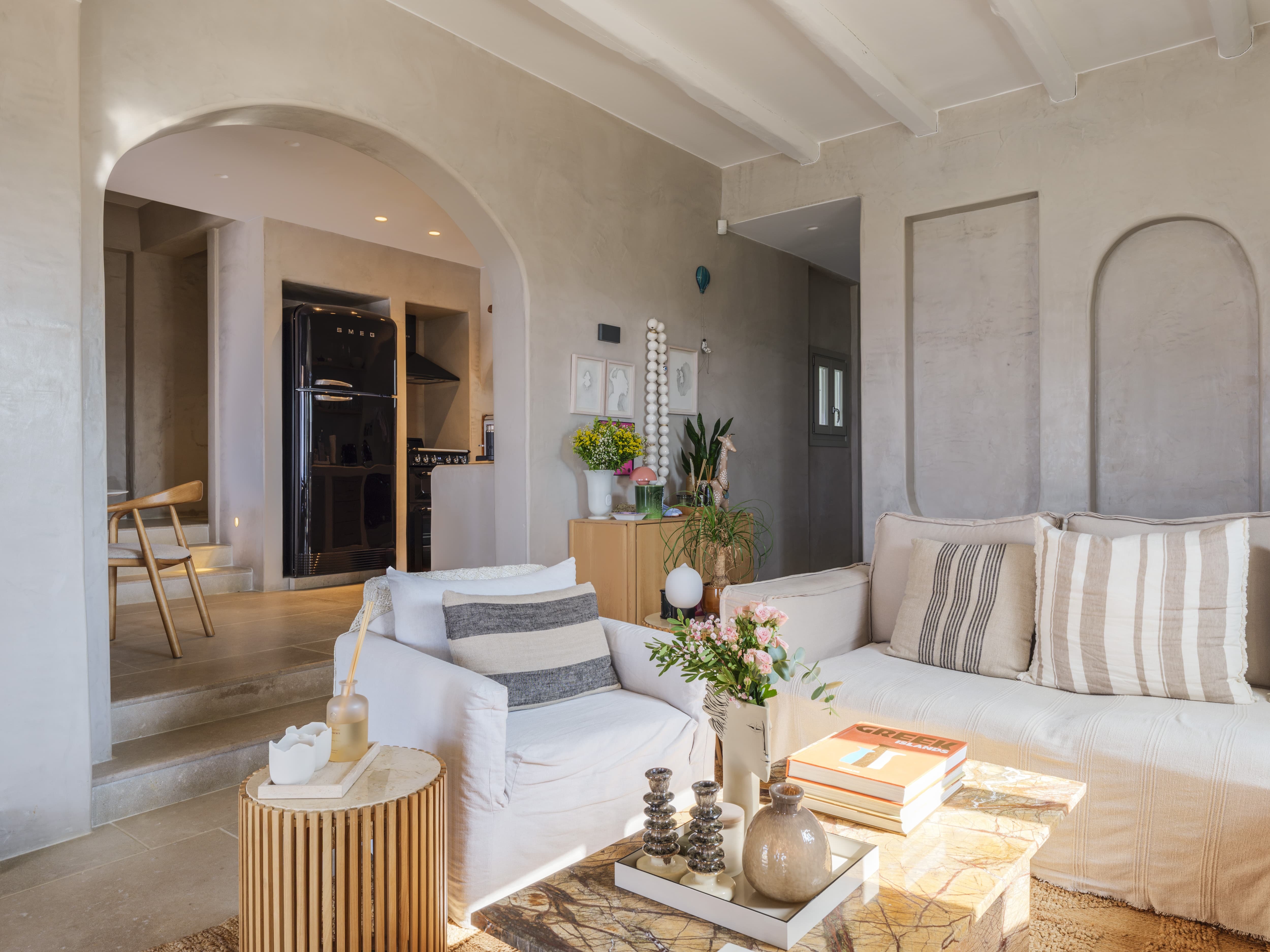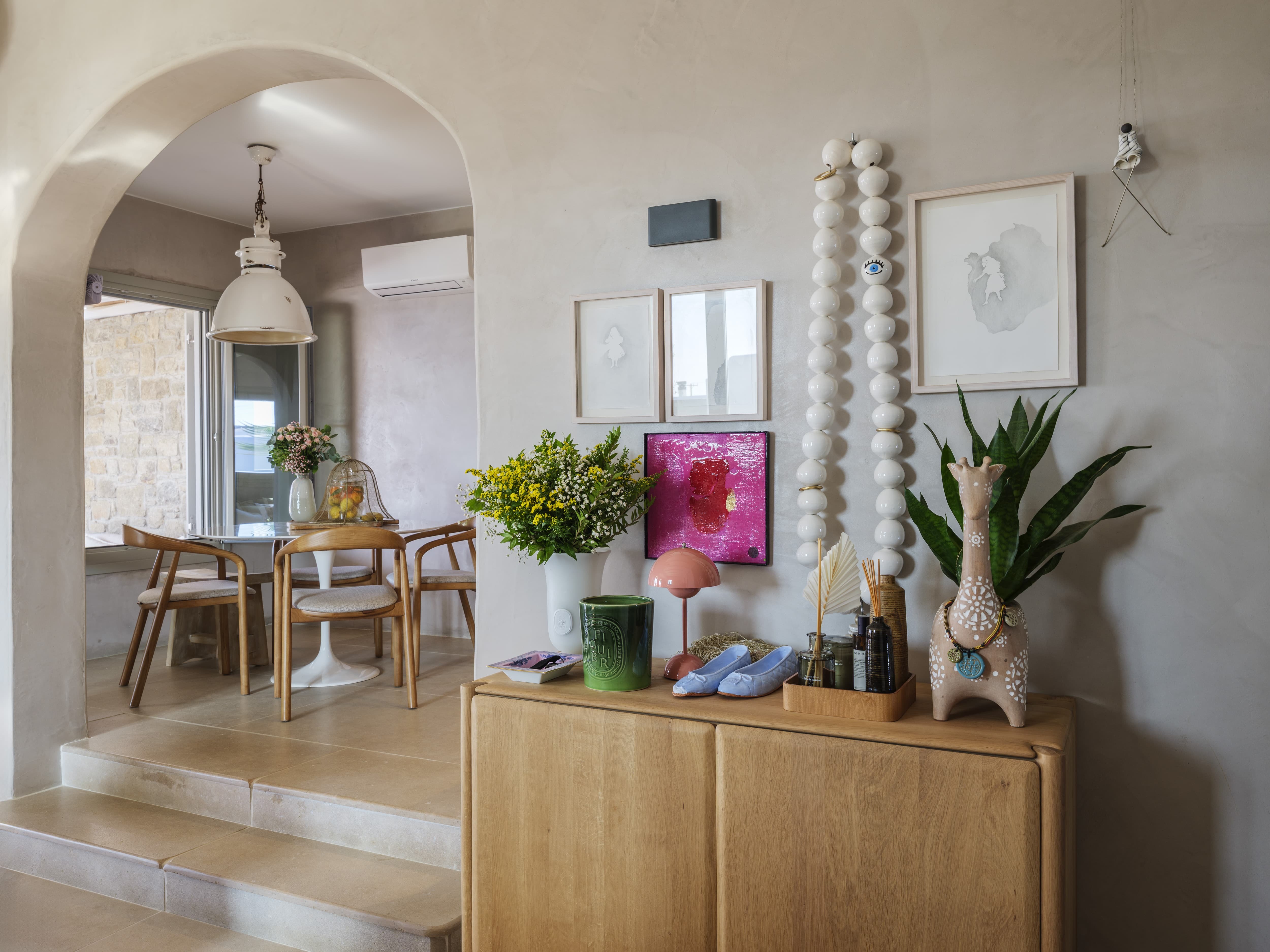 A relaxed, open-plan living area designed to flow effortlessly into the outdoor terraces. Soft, bohemian-inspired interiors create a warm and inviting atmosphere, while large openings allow natural light and sea views to define the space. The layout encourages a seamless transition between indoor comfort and outdoor living, ideal for both social moments and quiet retreat.