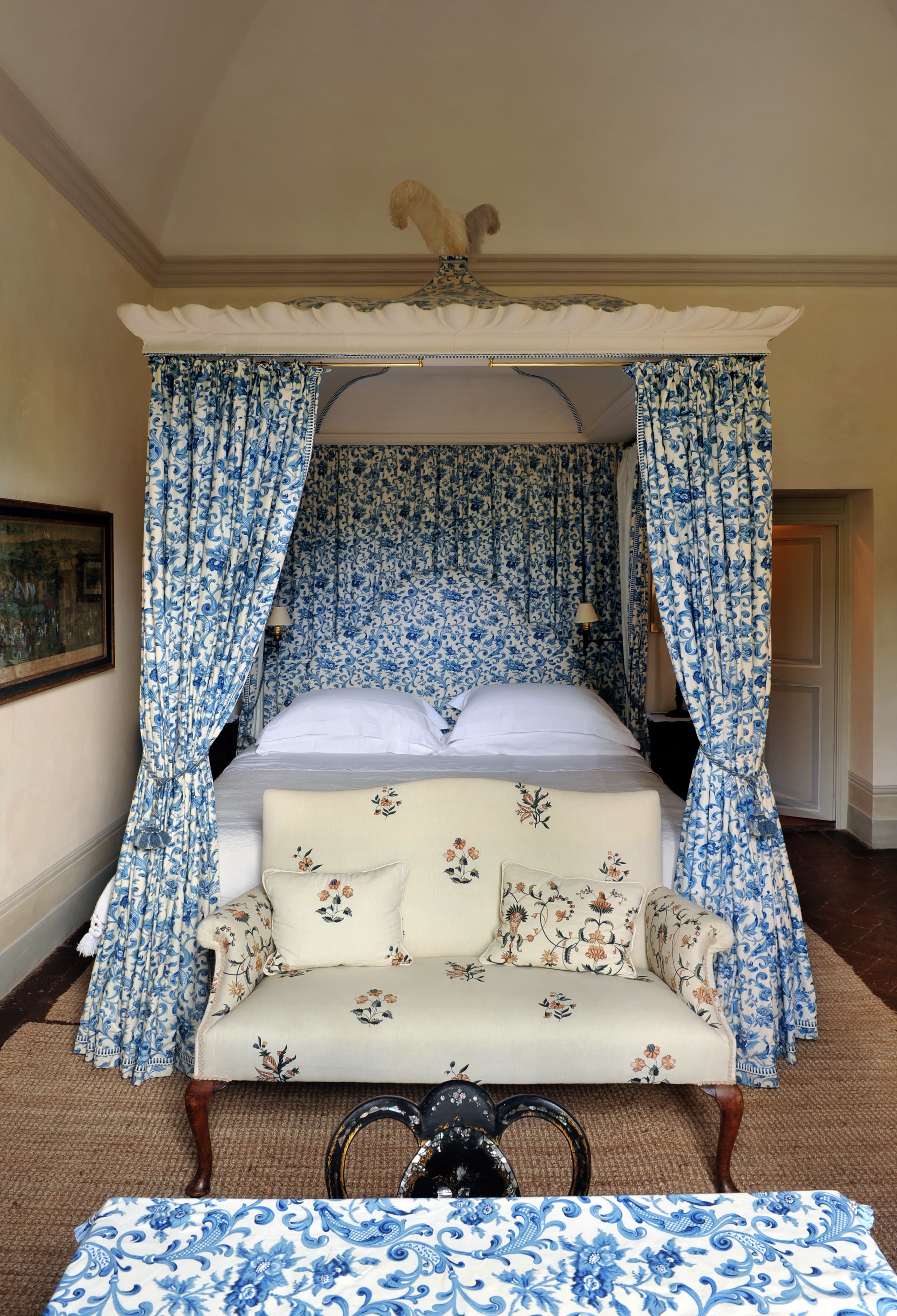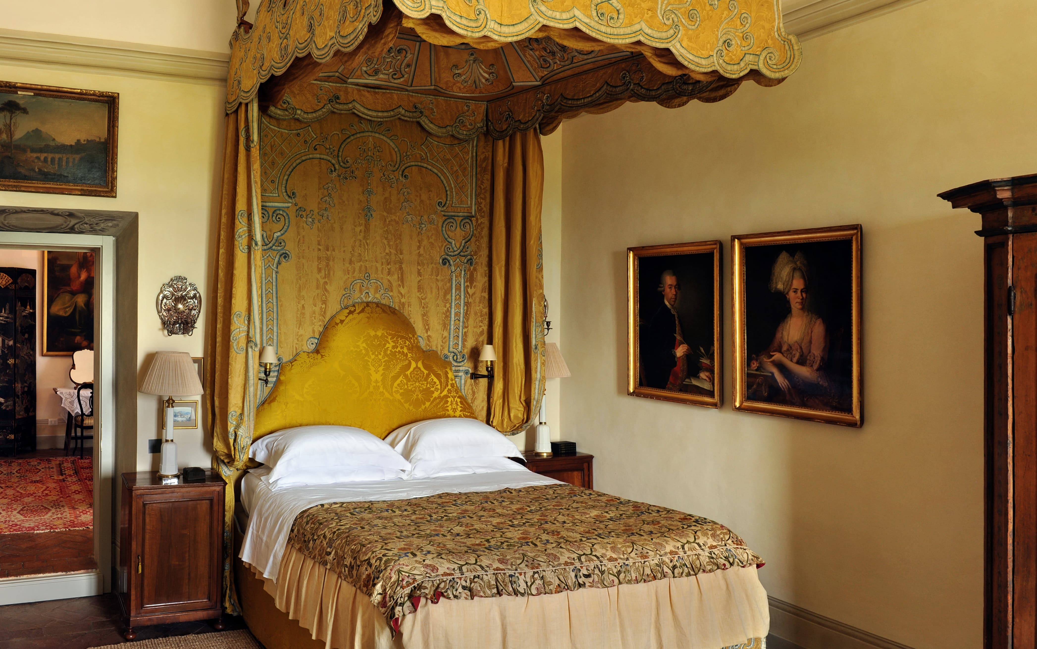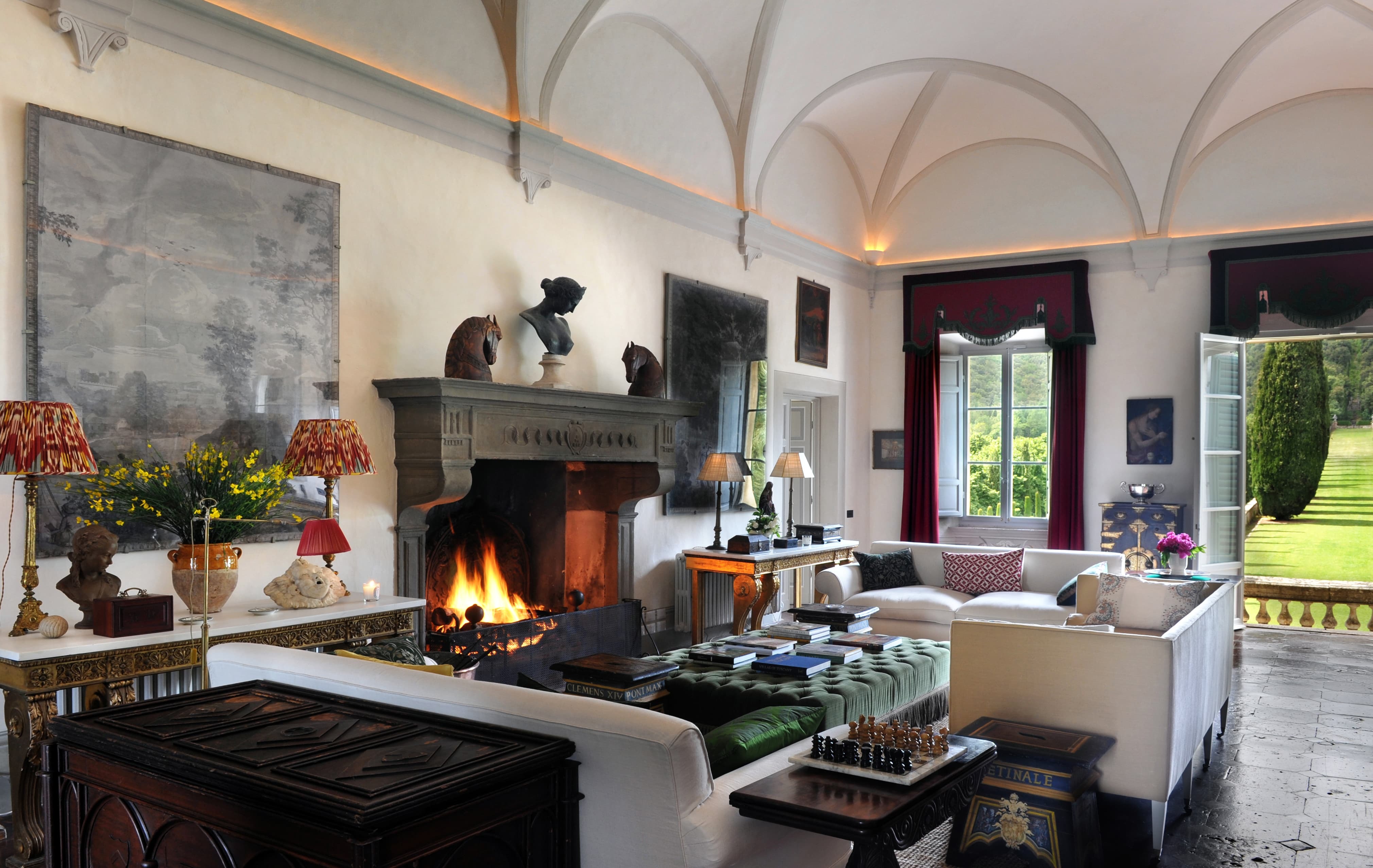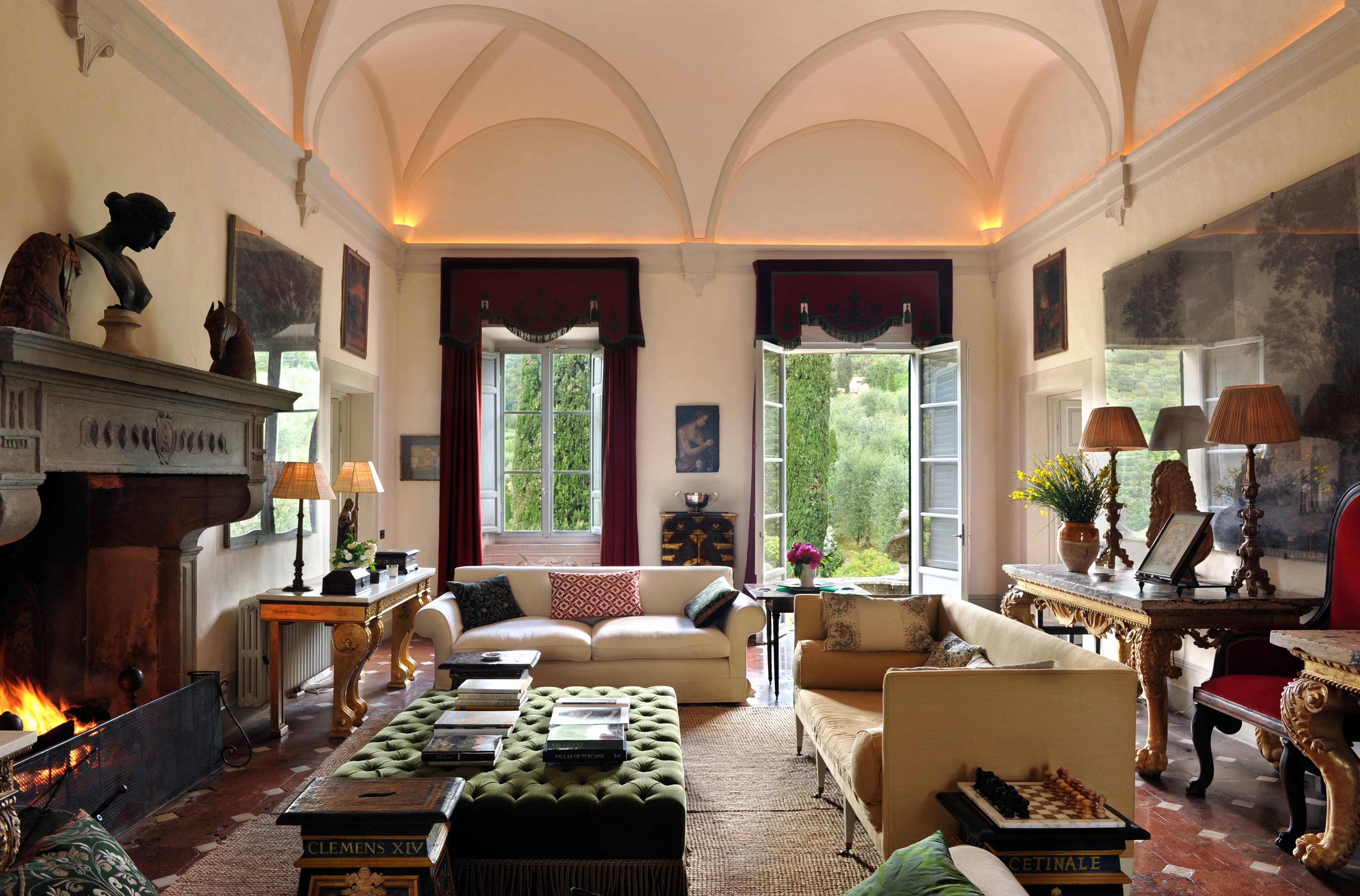 At Villa Cetinale, living unfolds on a truly Baroque scale. Grand reception halls, frescoed salons, and symmetrical gathering rooms reflect the villa’s 17th-century origins, originally commissioned for Pope Alexander VII. High ceilings, marble floors, antique furnishings, and curated artworks create an atmosphere of noble restraint rather than excess. Formal drawing rooms open onto terraces and axial garden views, while more intimate sitting rooms allow for quieter conversation and retreat.