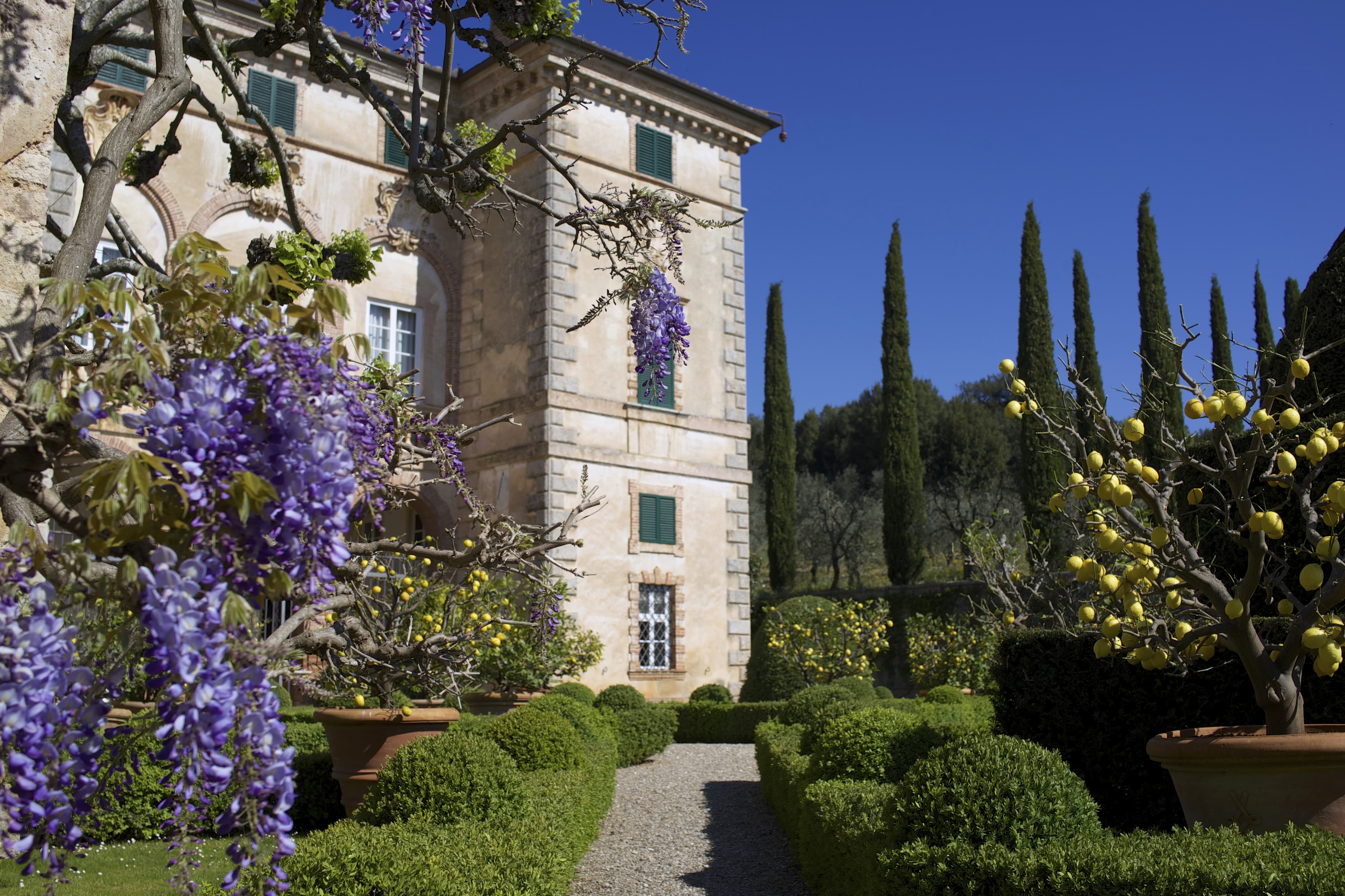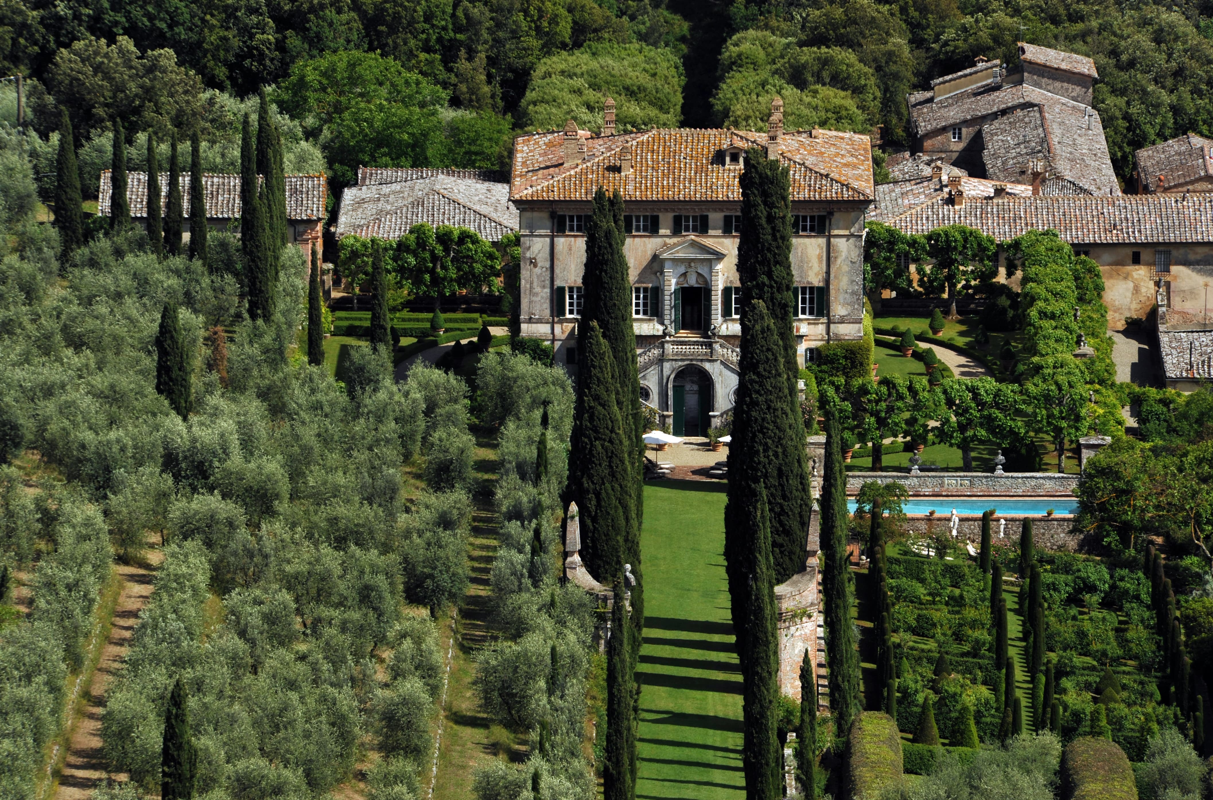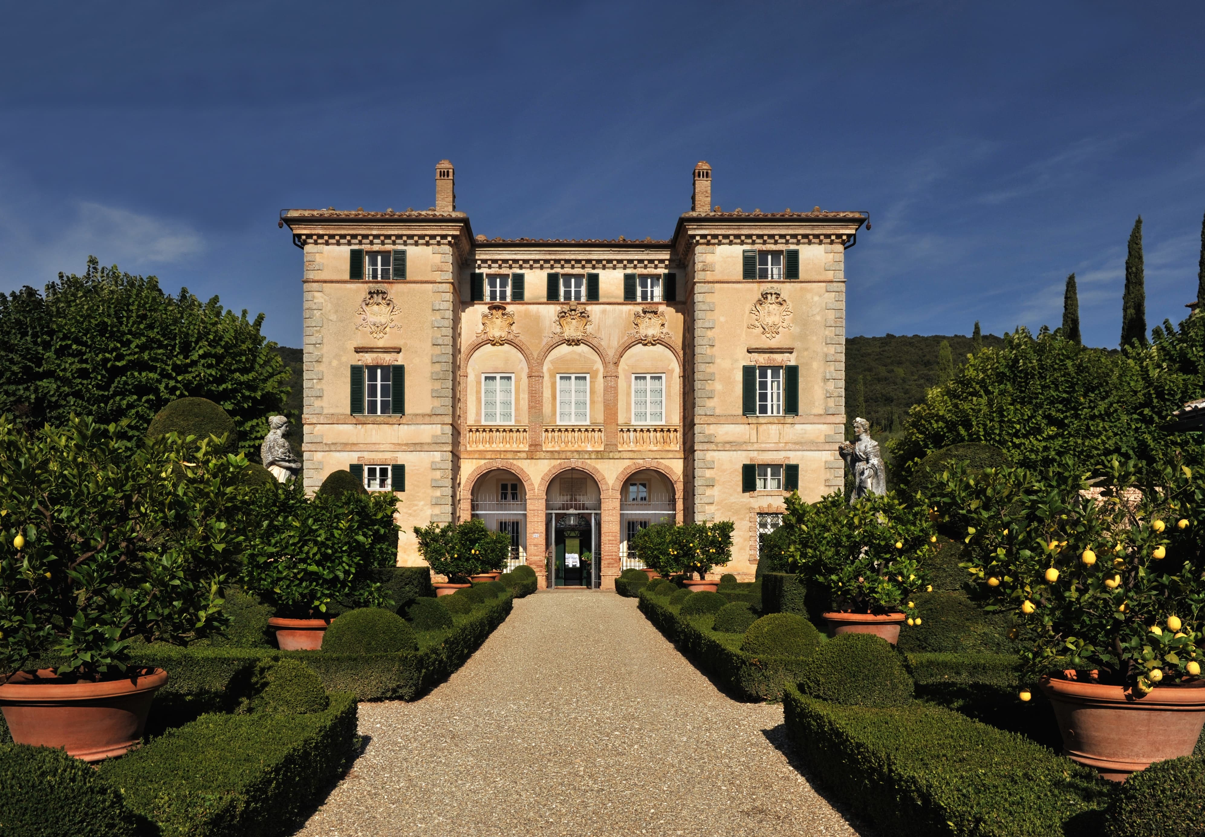 The estate spans approximately 165 acres of countryside, with gardens widely regarded among the most beautiful in Italy. Cypress-lined avenues, sculpted terraces, hidden statues, woodland paths, and long axial vistas create a landscape of remarkable harmony and drama. The villa’s setting offers sweeping views across the Tuscan countryside, combining grandeur with deep seclusion.