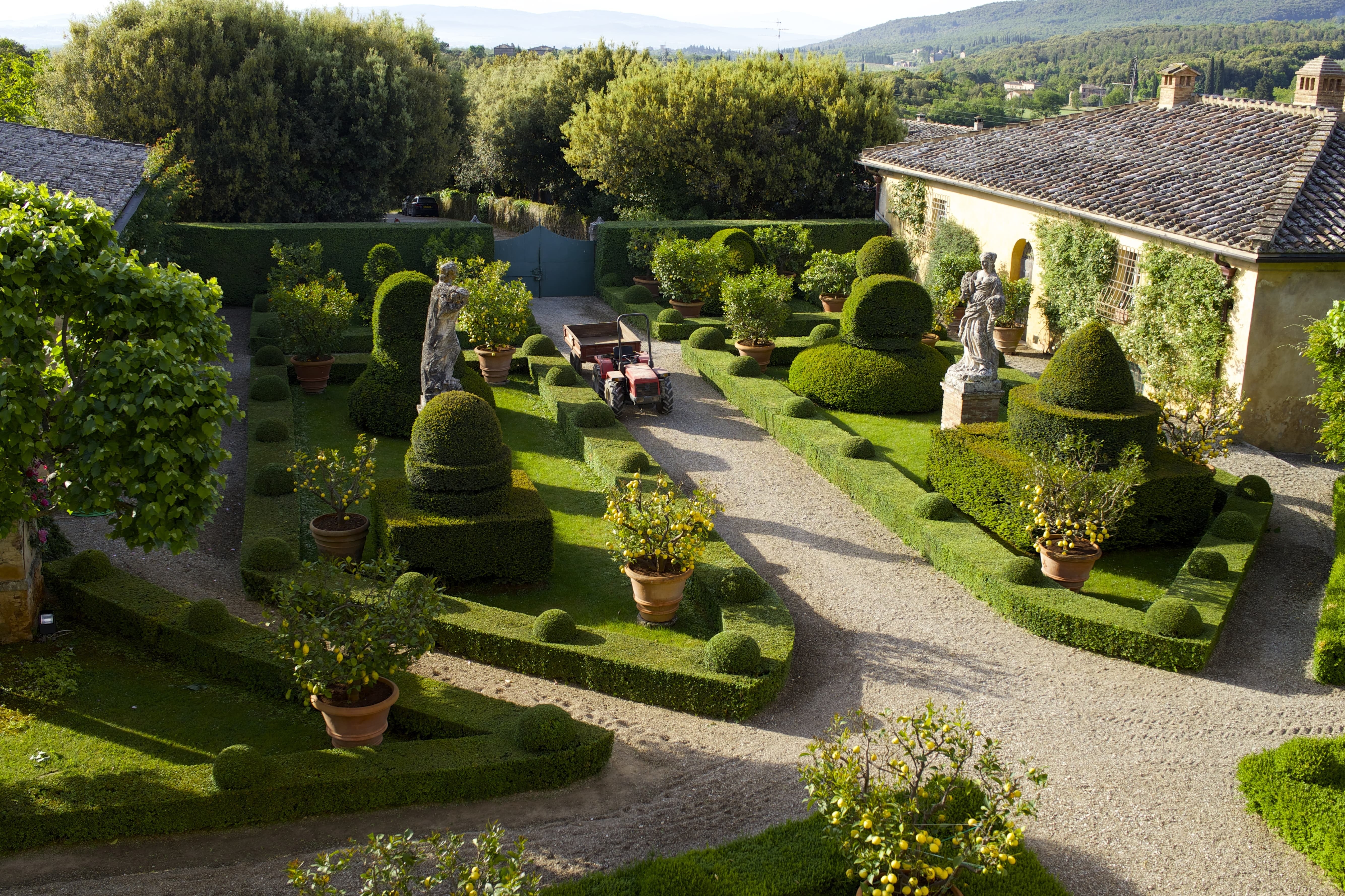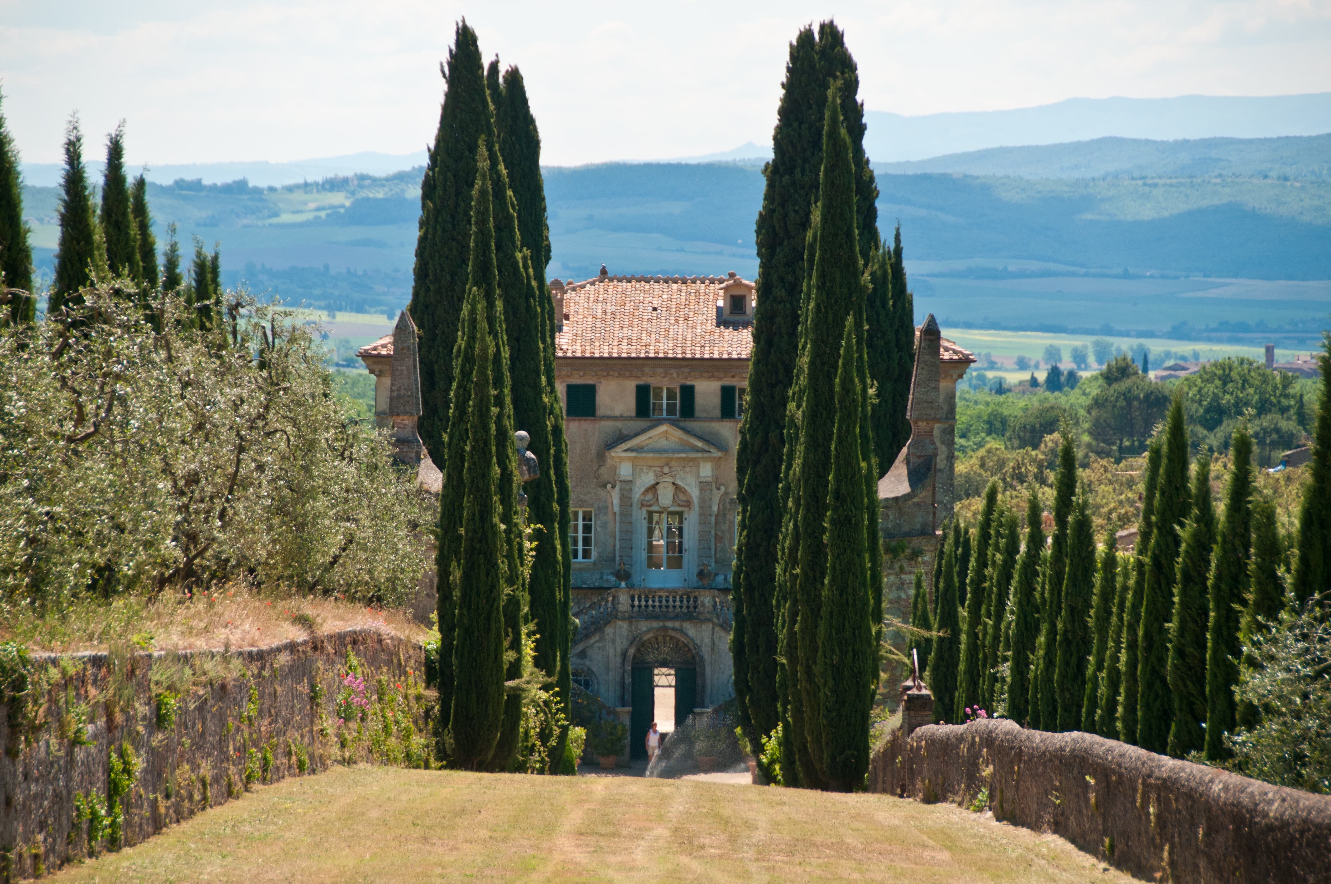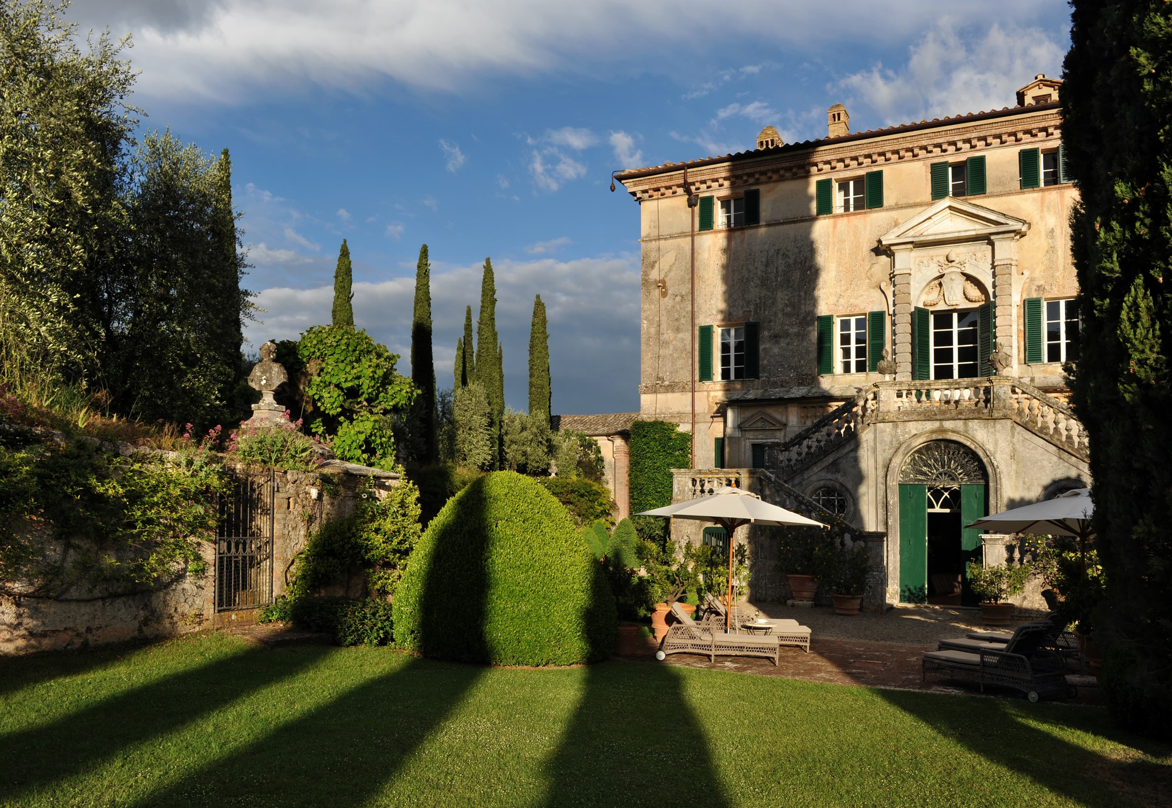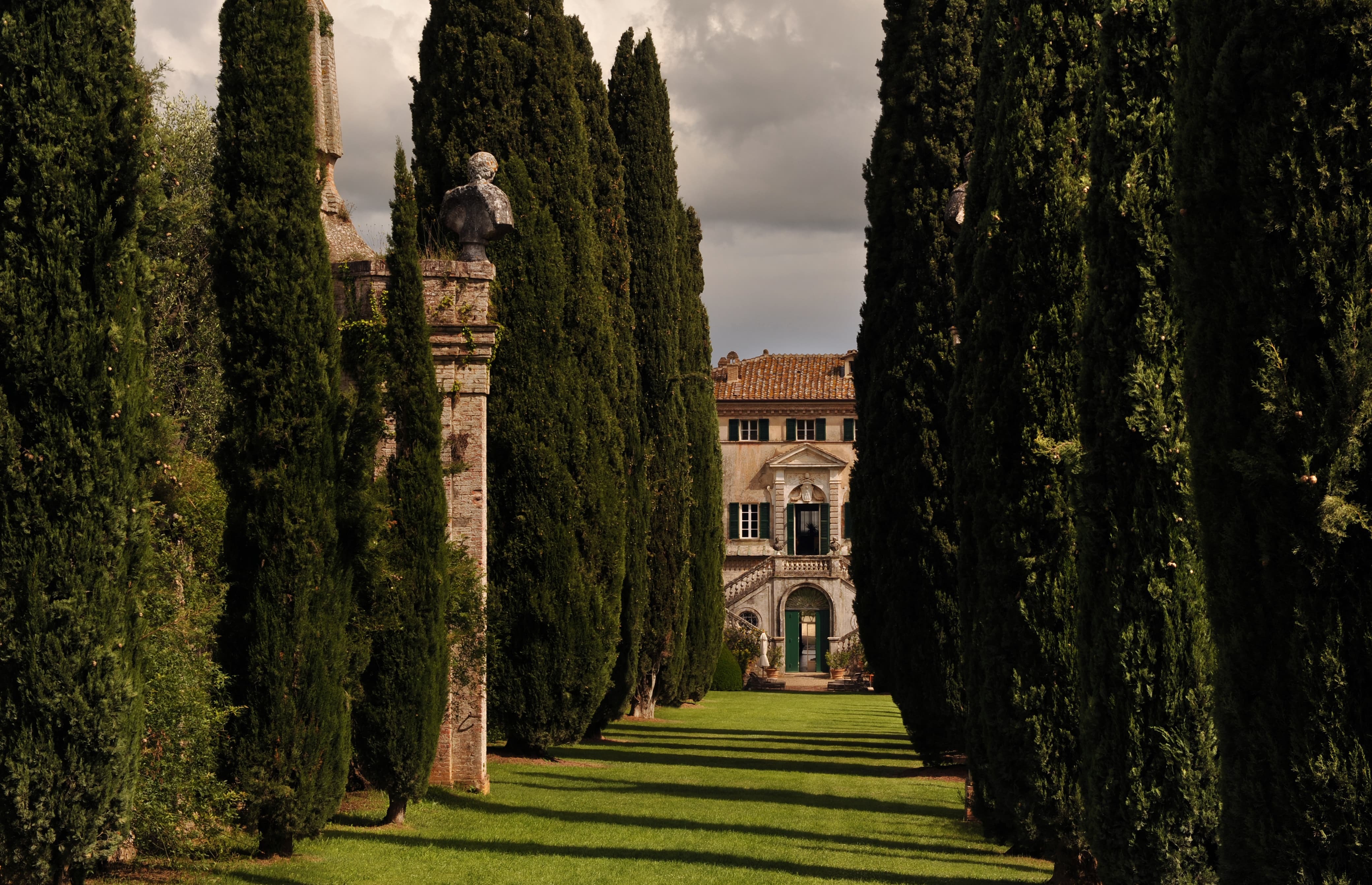 The estate spans approximately 165 acres of countryside, with gardens widely regarded among the most beautiful in Italy. Cypress-lined avenues, sculpted terraces, hidden statues, woodland paths, and long axial vistas create a landscape of remarkable harmony and drama. The villa’s setting offers sweeping views across the Tuscan countryside, combining grandeur with deep seclusion.