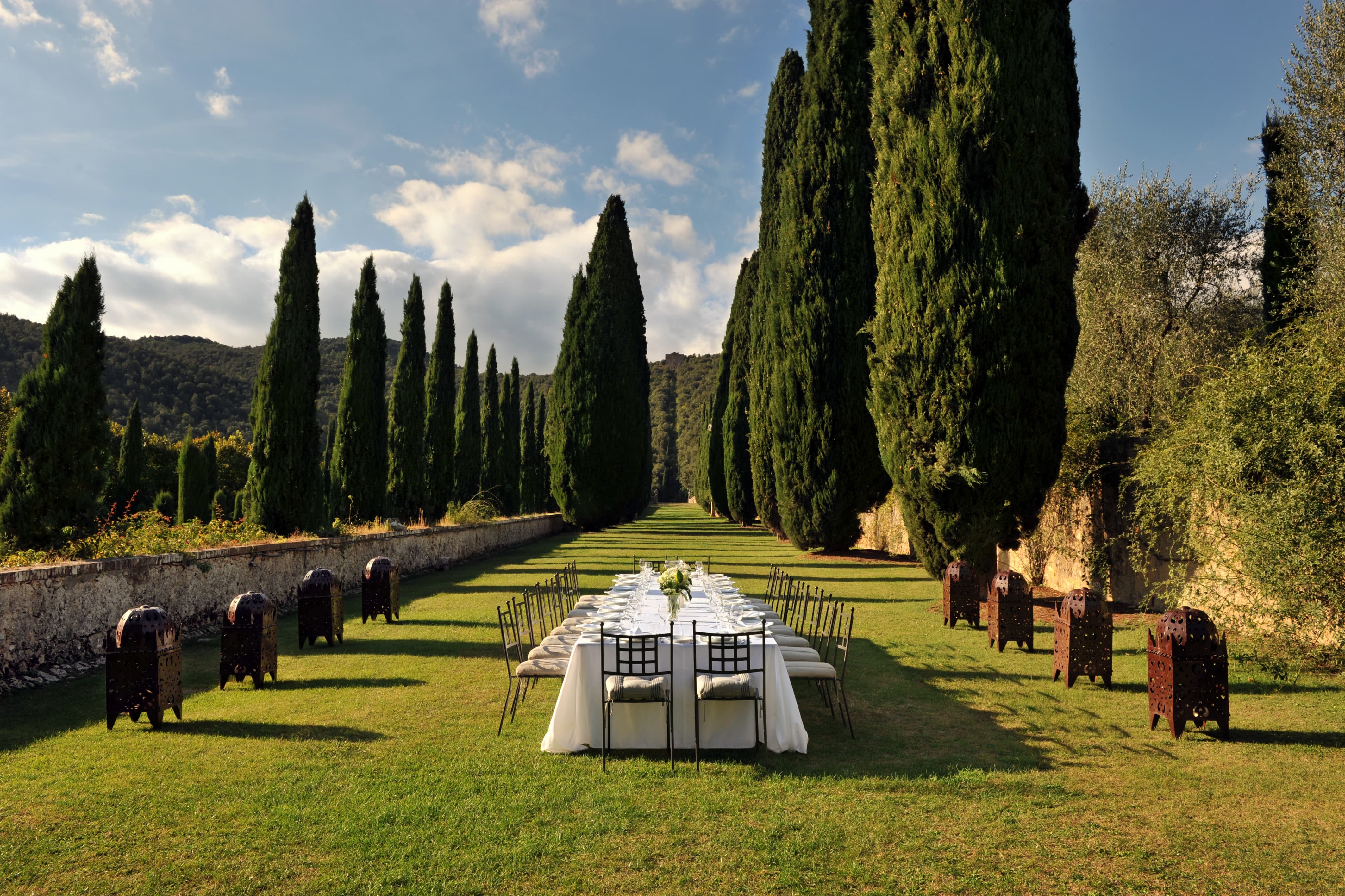 A fully equipped professional kitchen supports private chef service and event catering. Formal dining takes place in a magnificent dining hall suited to candlelit dinners and celebratory feasts, while outdoor terraces allow for long Tuscan lunches beneath open skies. The estate’s scale makes it particularly suited to weddings and milestone gatherings, with catering seamlessly integrated into the historic layout.