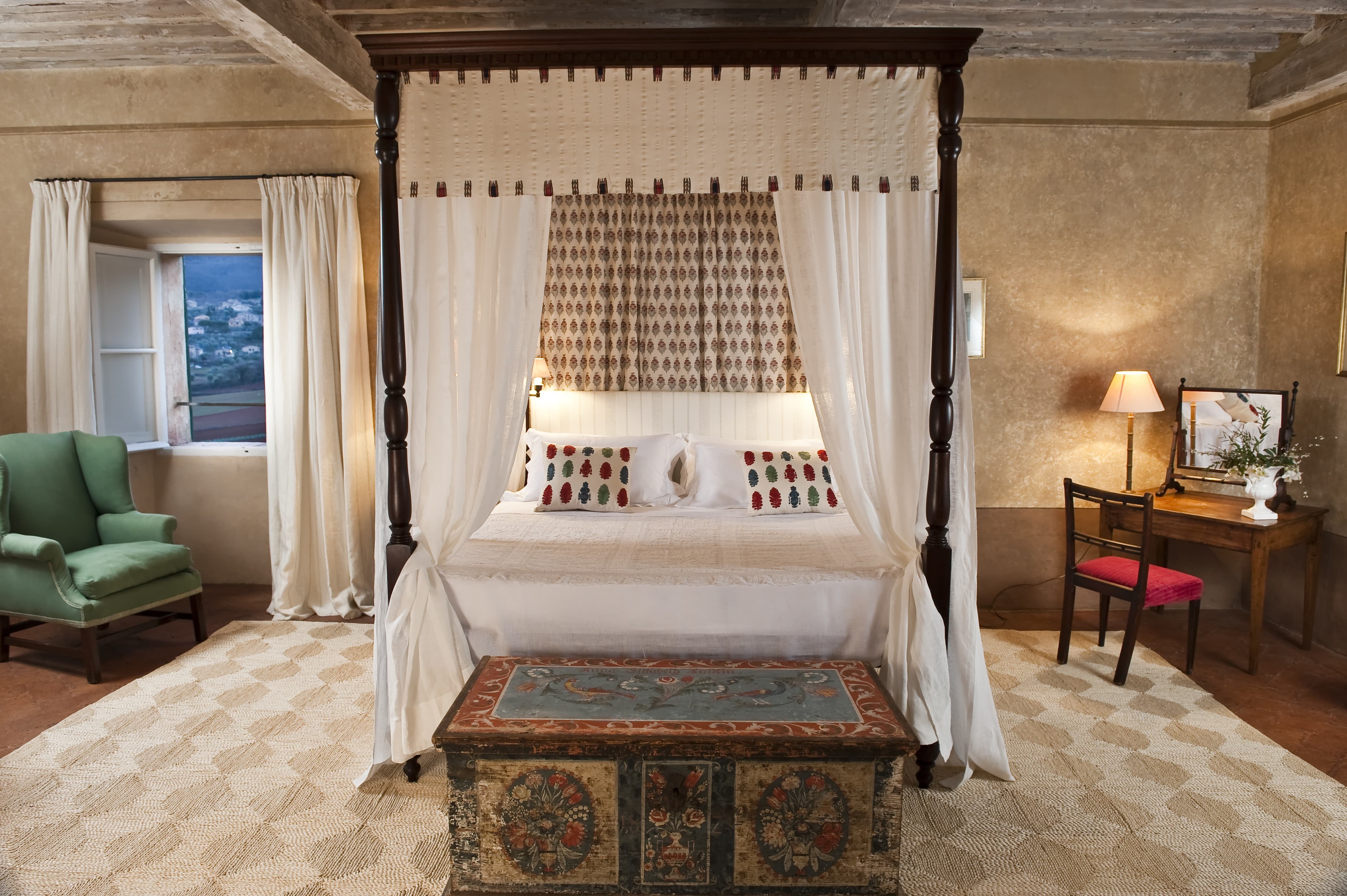 The villa accommodates up to 24 guests across 12 elegant en suite bedrooms. Each suite is individually styled, blending period architecture with understated Tuscan comfort. Many rooms overlook the formal gardens or rolling countryside beyond. Professional housekeeping is included, with full laundry services managed discreetly by the estate team to support extended stays, weddings, and larger gatherings.