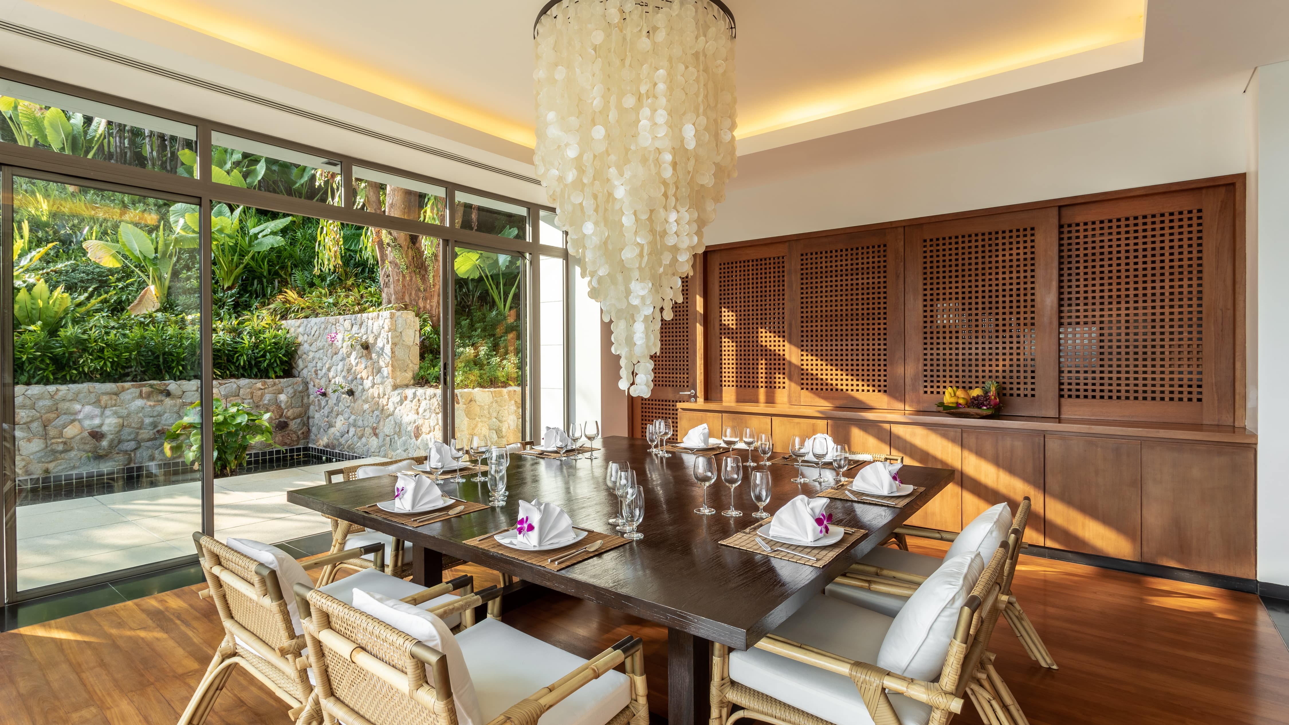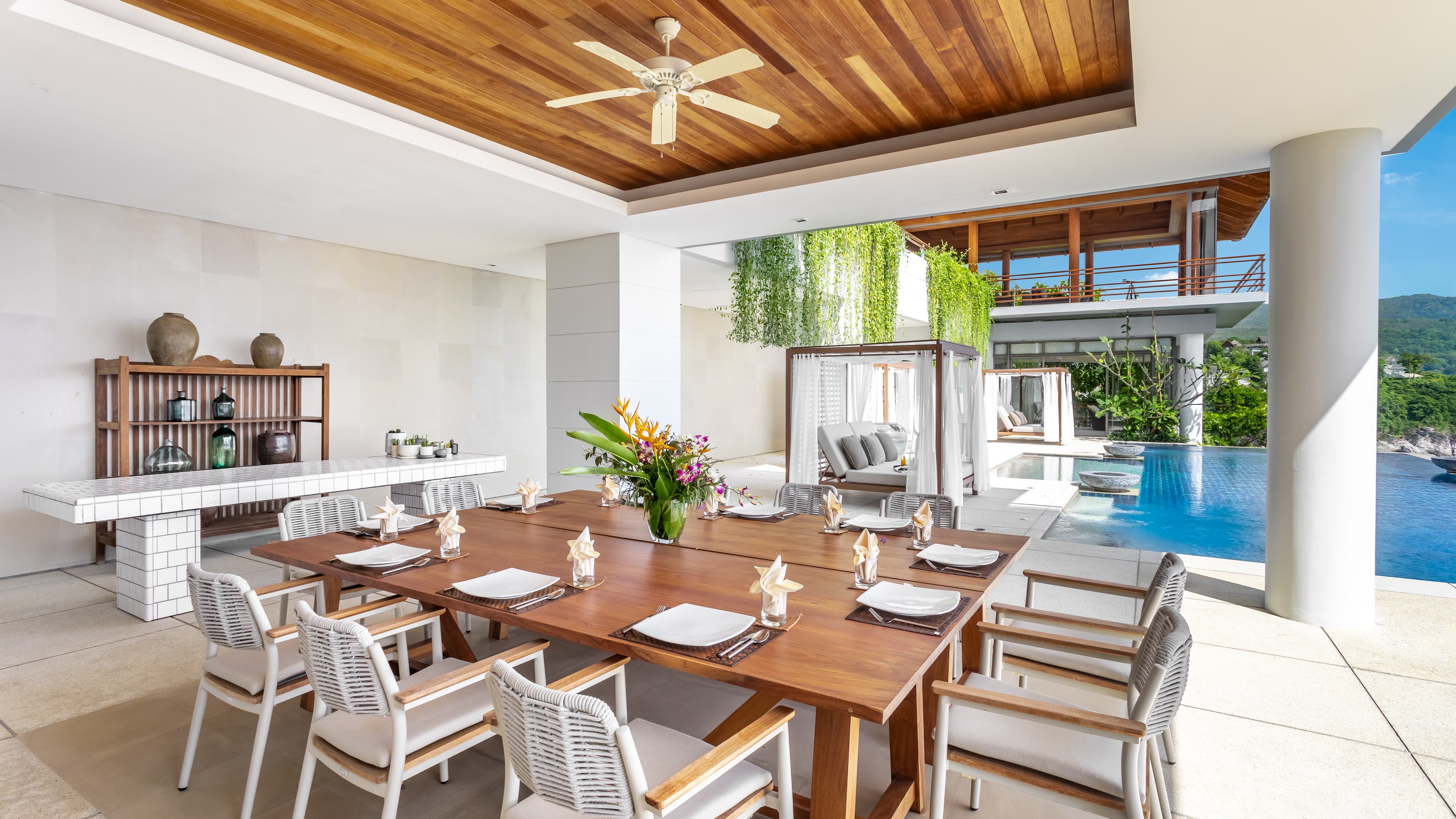 The fully equipped kitchen supports both private chef service and relaxed family dining. Indoor dining spaces remain cool and refined, while outdoor dining areas provide a more dramatic setting against ocean and sunset. A poolside barbecue area allows for memorable alfresco evenings, where seafood grills and shared platters unfold beneath the tropical sky. The villa’s flow between kitchen, dining room and terrace ensures every gathering feels effortless.