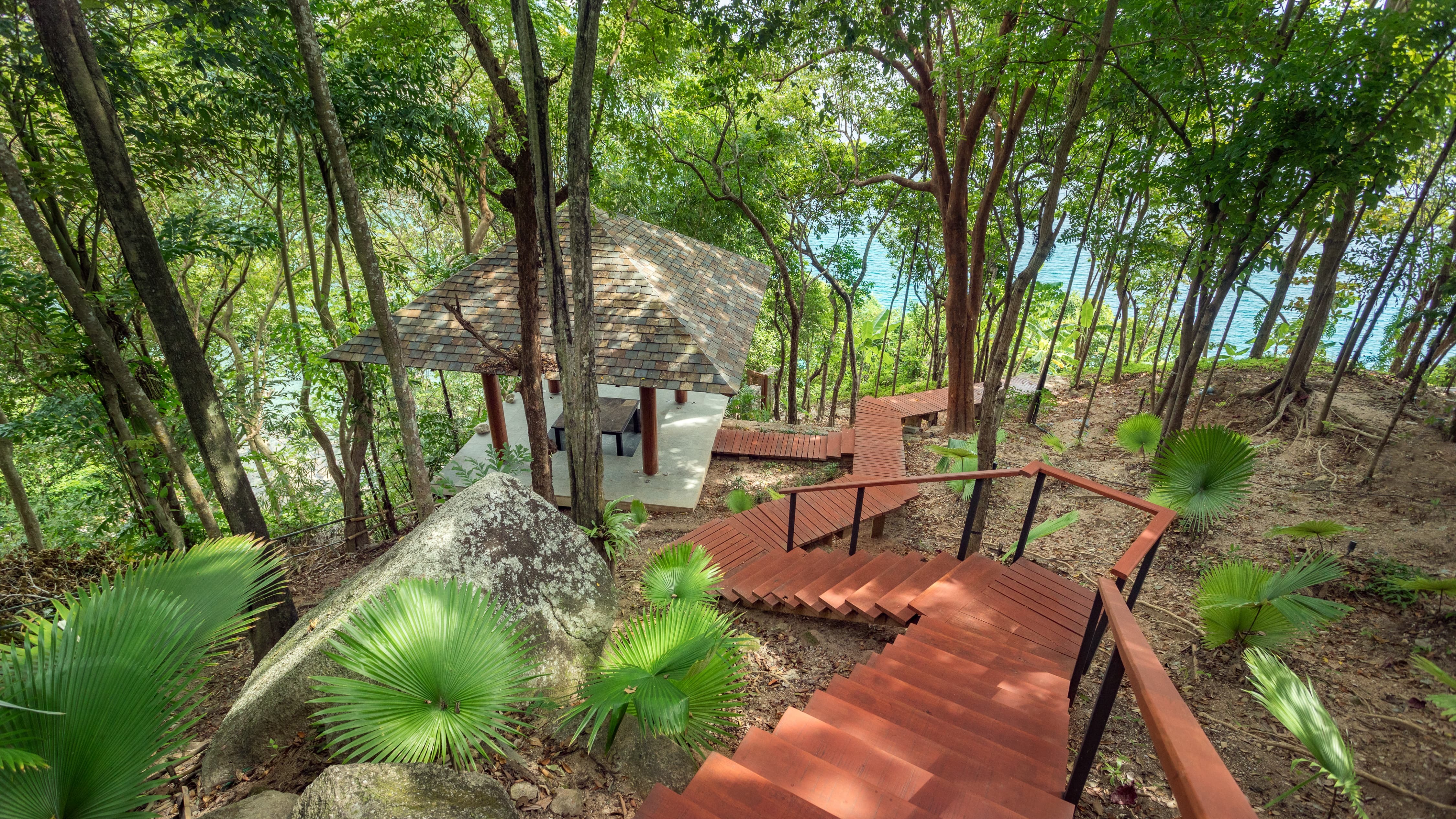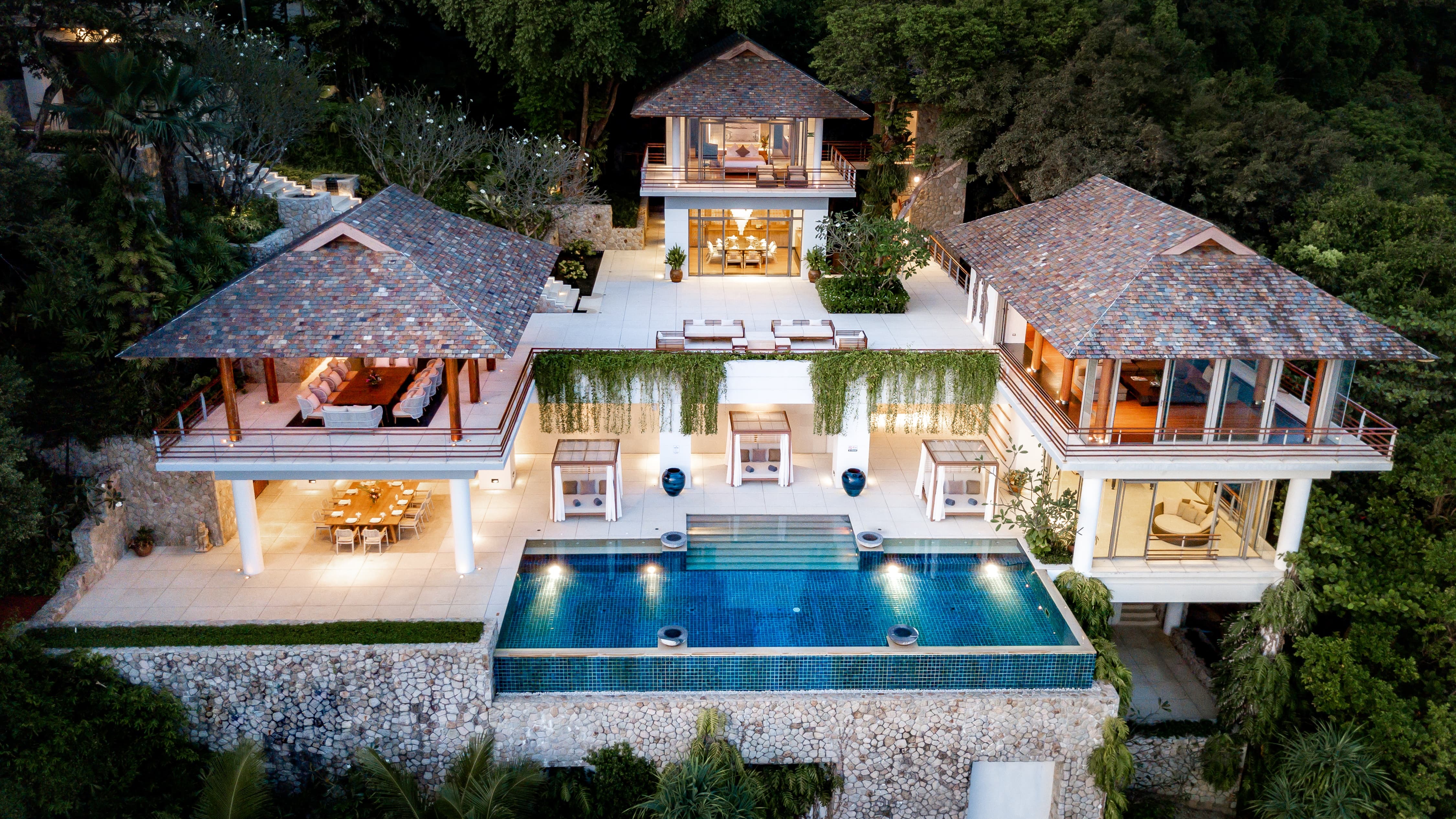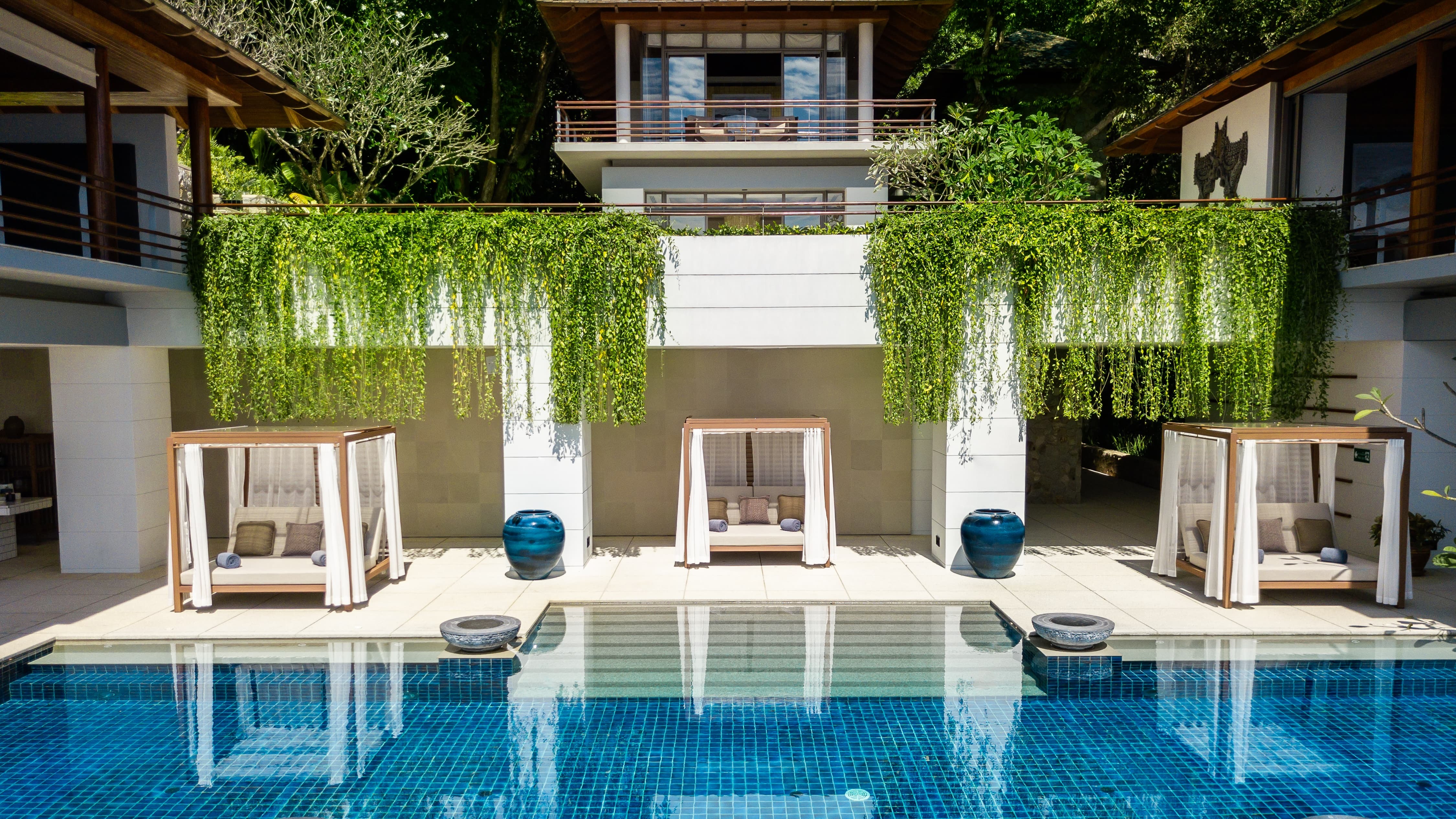 Artfully arranged across five levels and surrounded by lush tropical foliage, the estate feels both grand and deeply private. Water is a constant presence. A 15-metre infinity-edge pool stretches toward the bay below, reflecting the shifting blues of the Andaman Sea, while tranquil koi ponds and gentle water features introduce a soothing rhythm to the landscape.