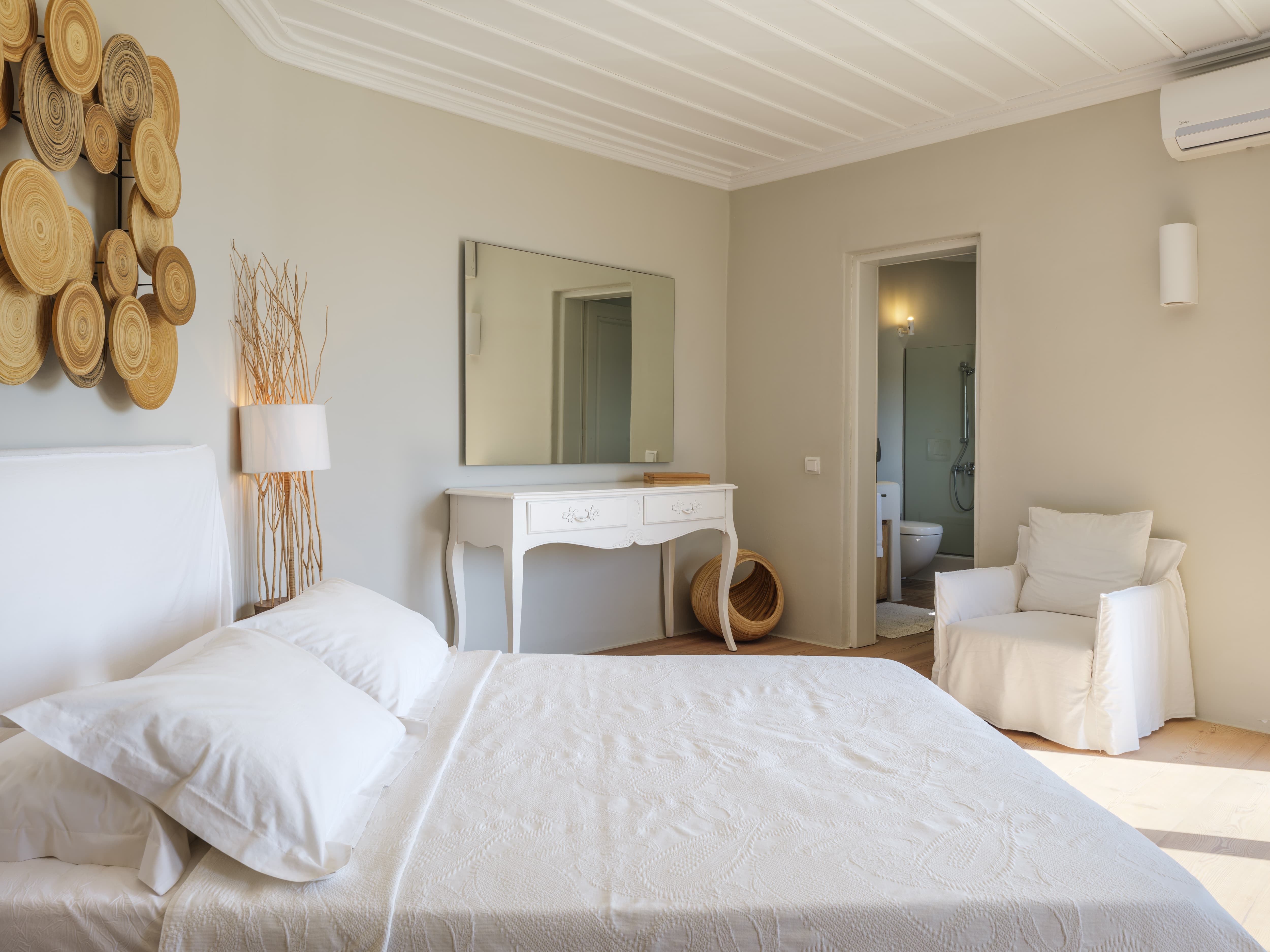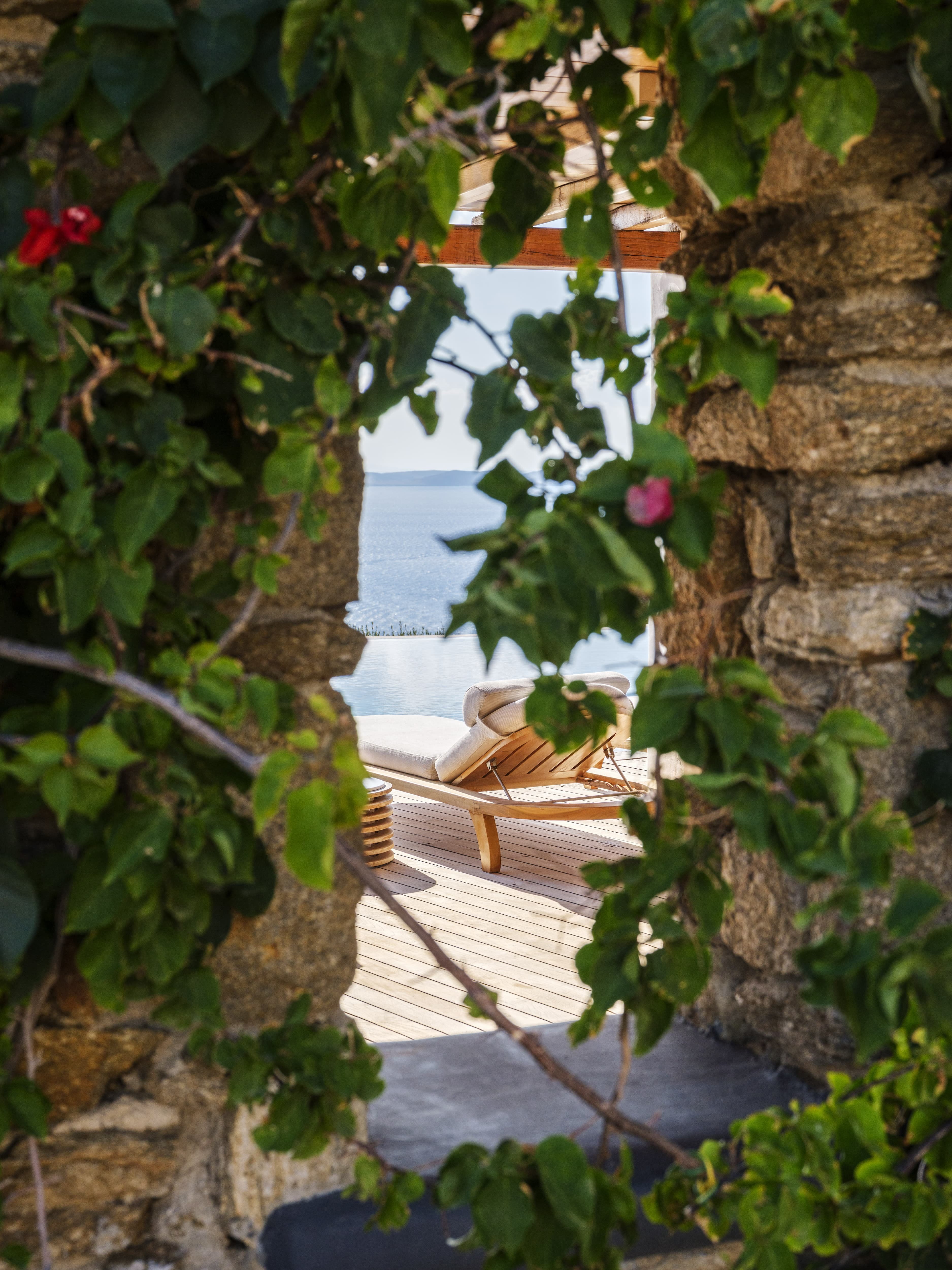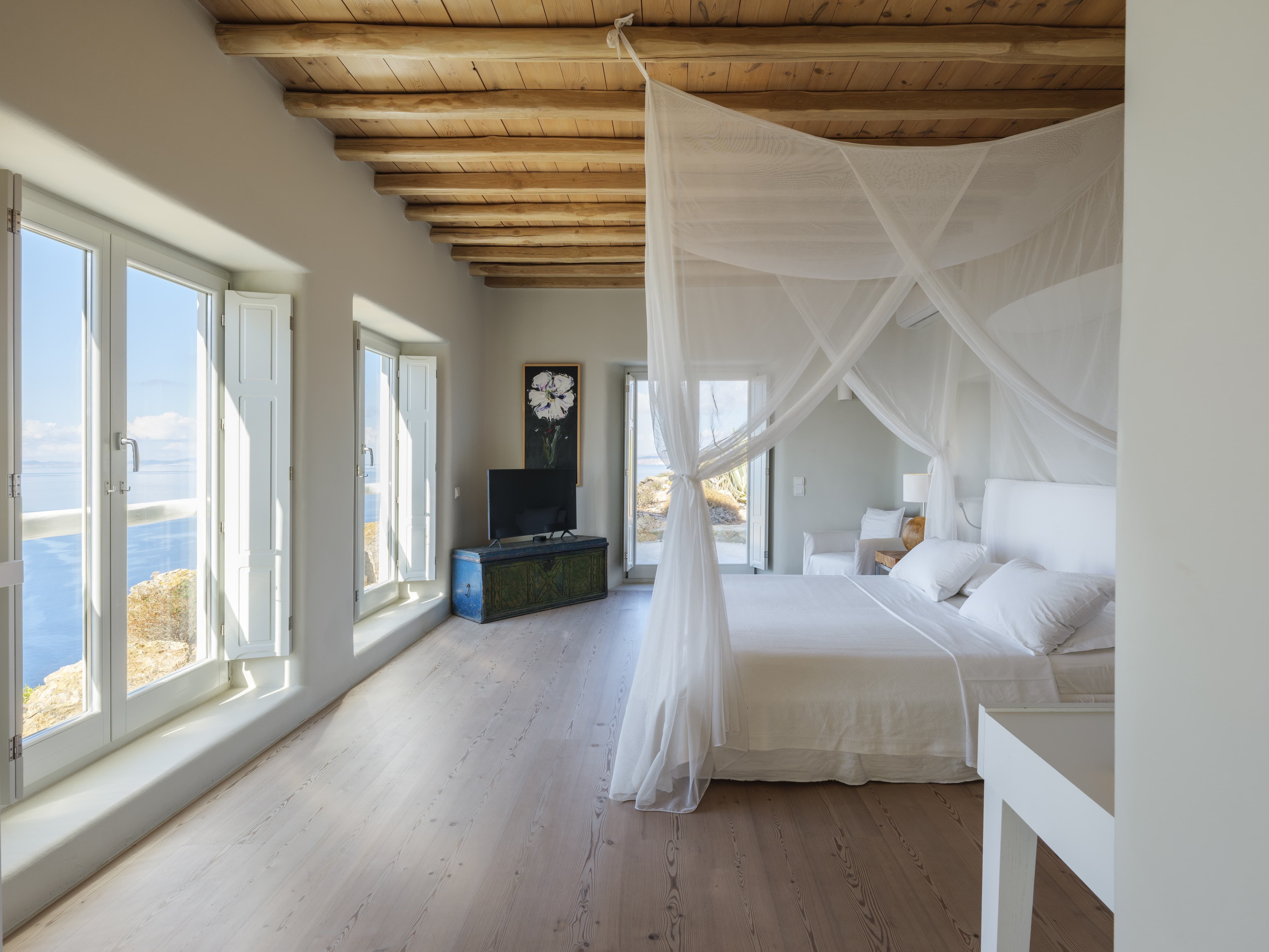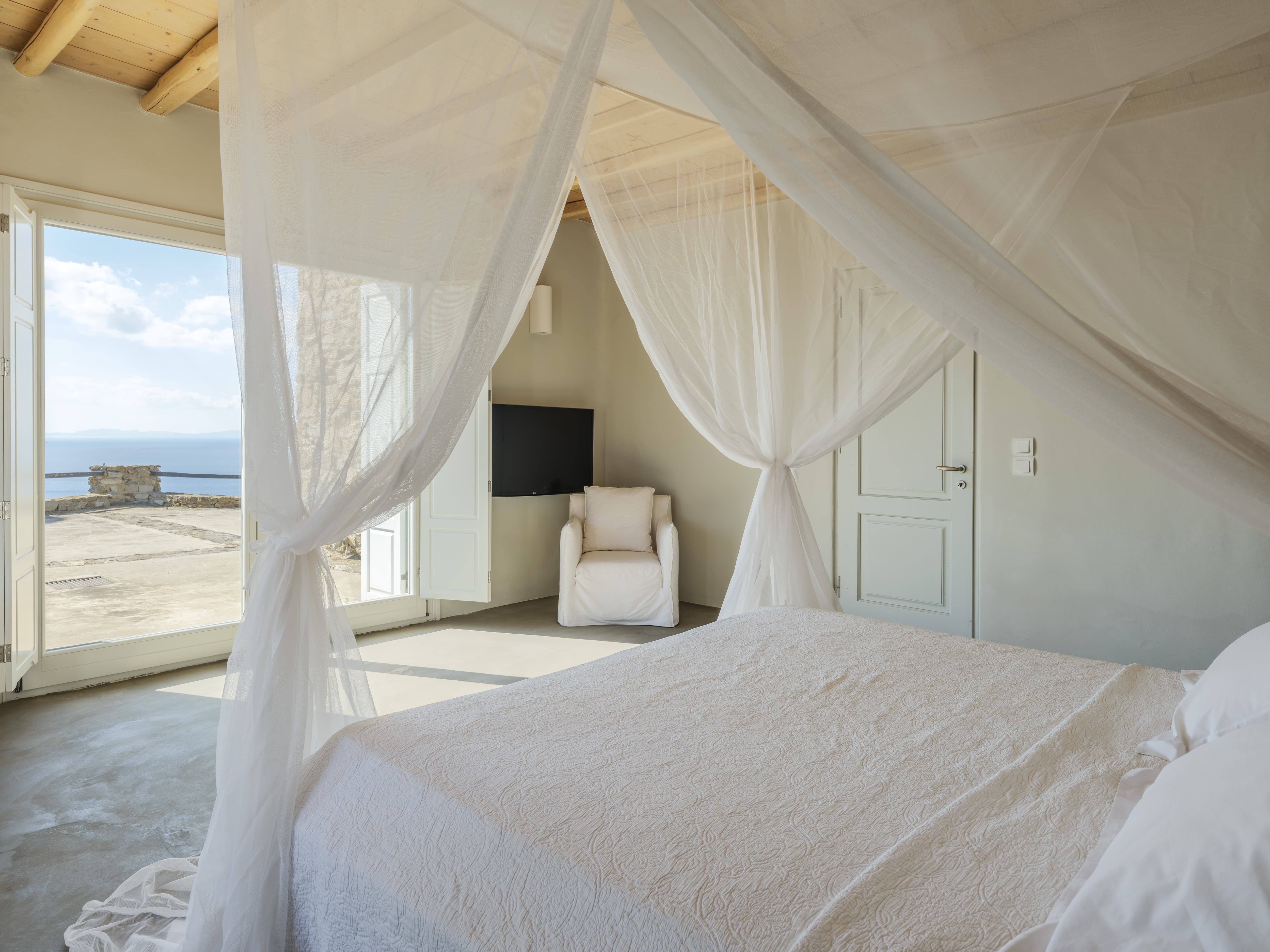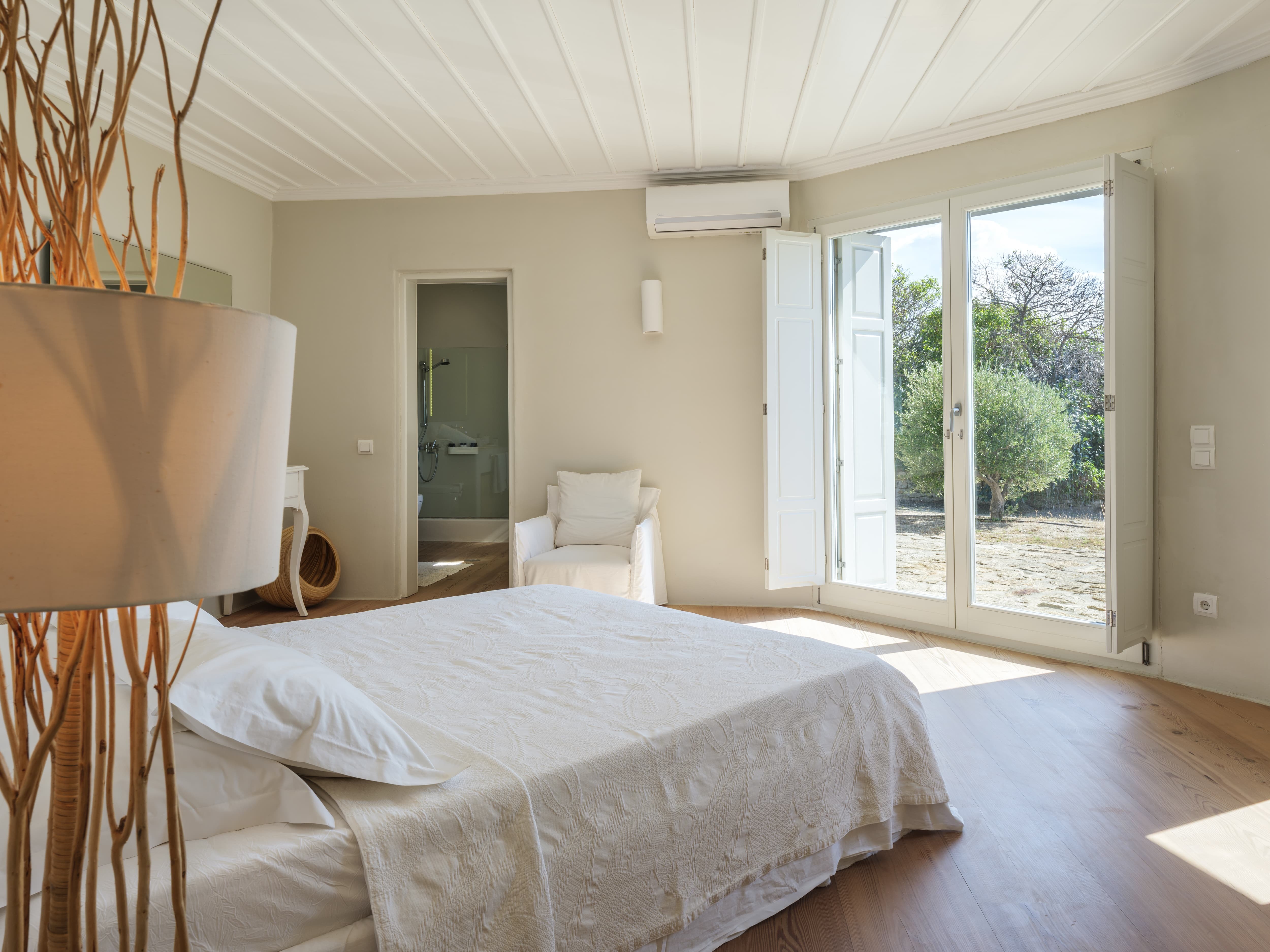 Ten well-appointed bedrooms arranged across the main villa and an independent guest house, offering flexibility and privacy for larger groups. Each bedroom features an en-suite bathroom, sea views, and access to outdoor spaces or balconies. Laundry and housekeeping are managed by the in-house team, with daily cleaning and maintenance included throughout your stay.