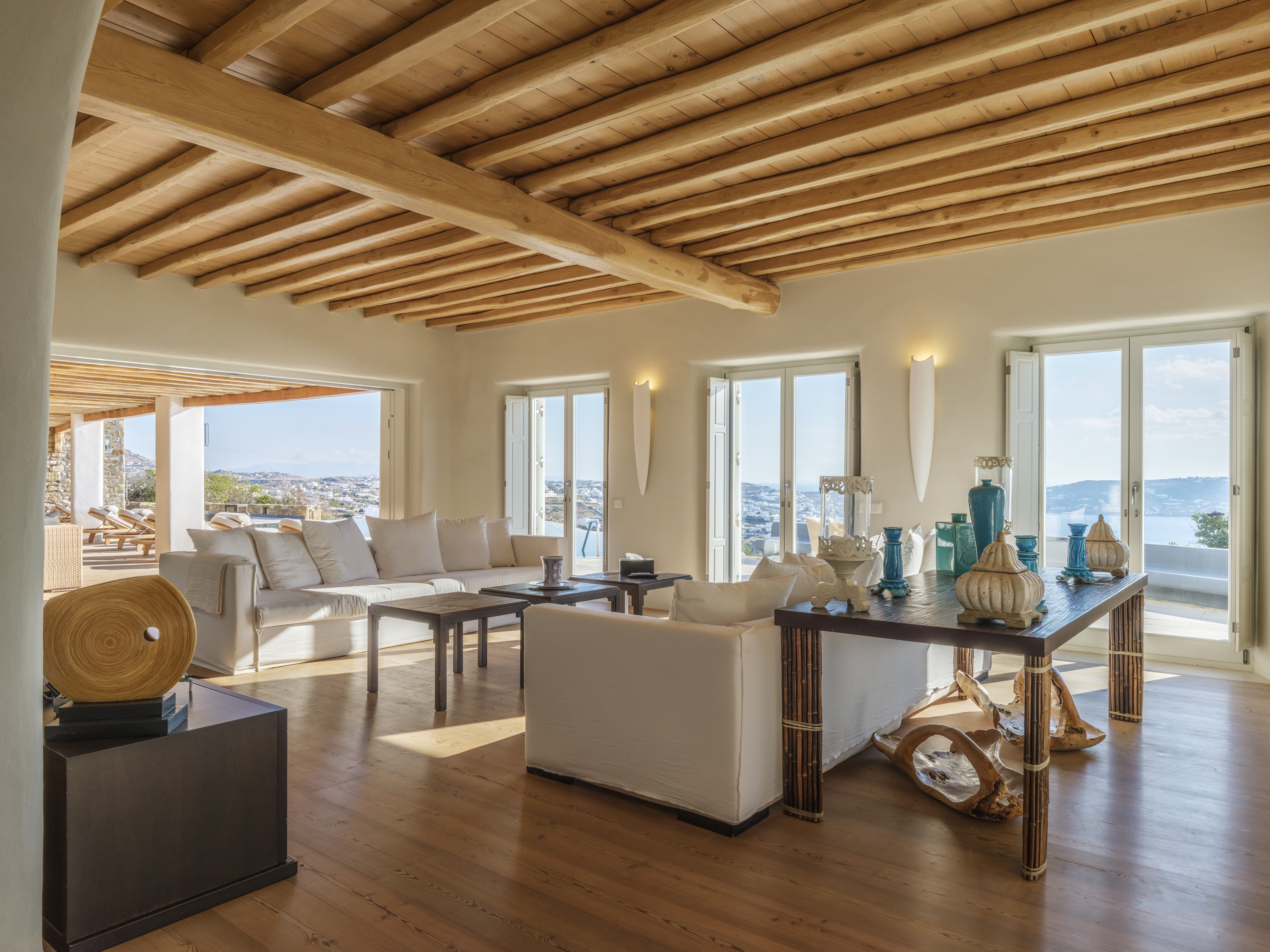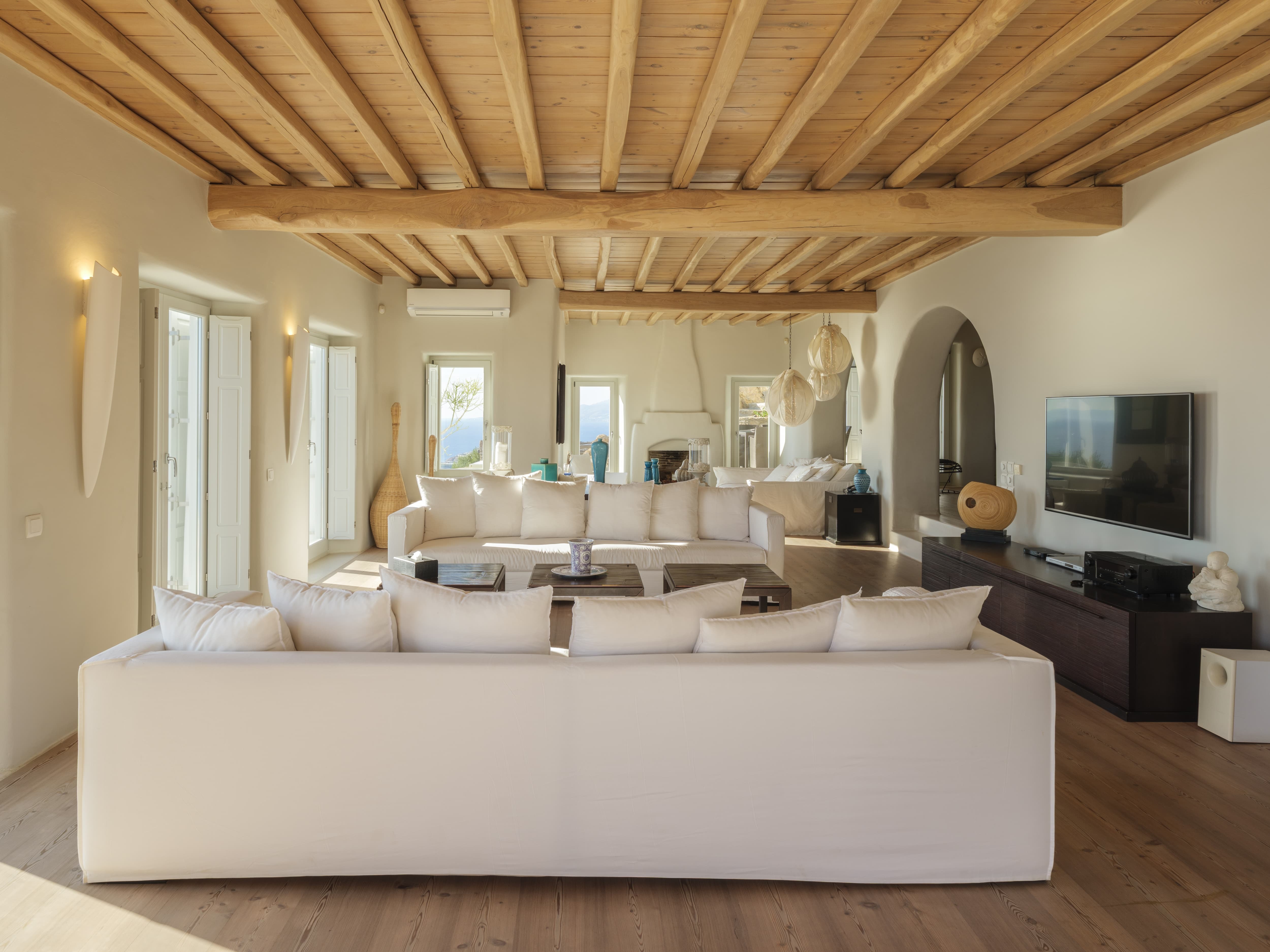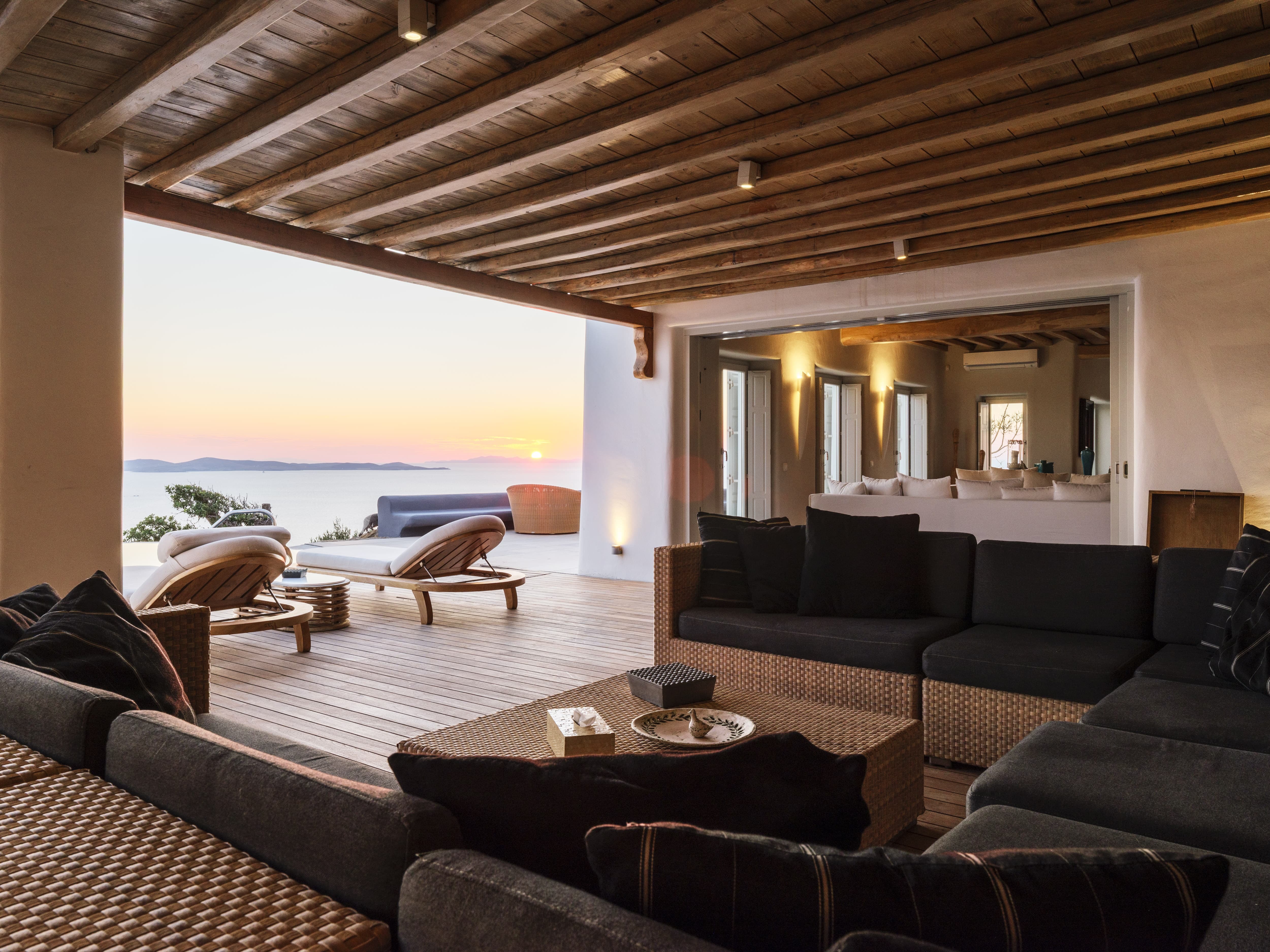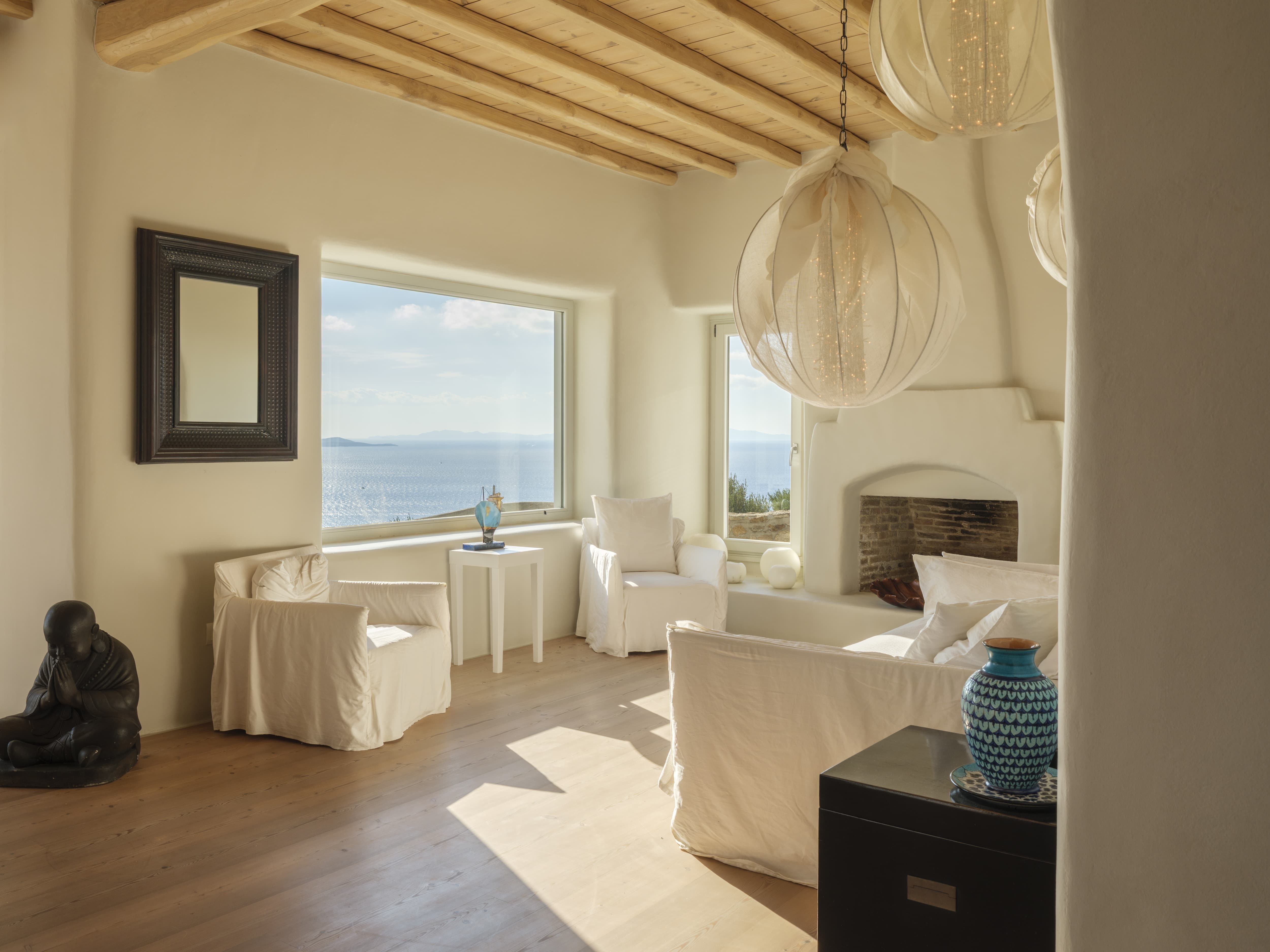 Expansive open-plan living areas designed to capture light and panoramic views across the Aegean and Mykonos Town. The main lounge, centred around a fireplace, flows seamlessly onto the outdoor terraces, creating a natural transition between indoor comfort and outdoor living. Multiple seating areas allow for both social gatherings and quieter moments.
