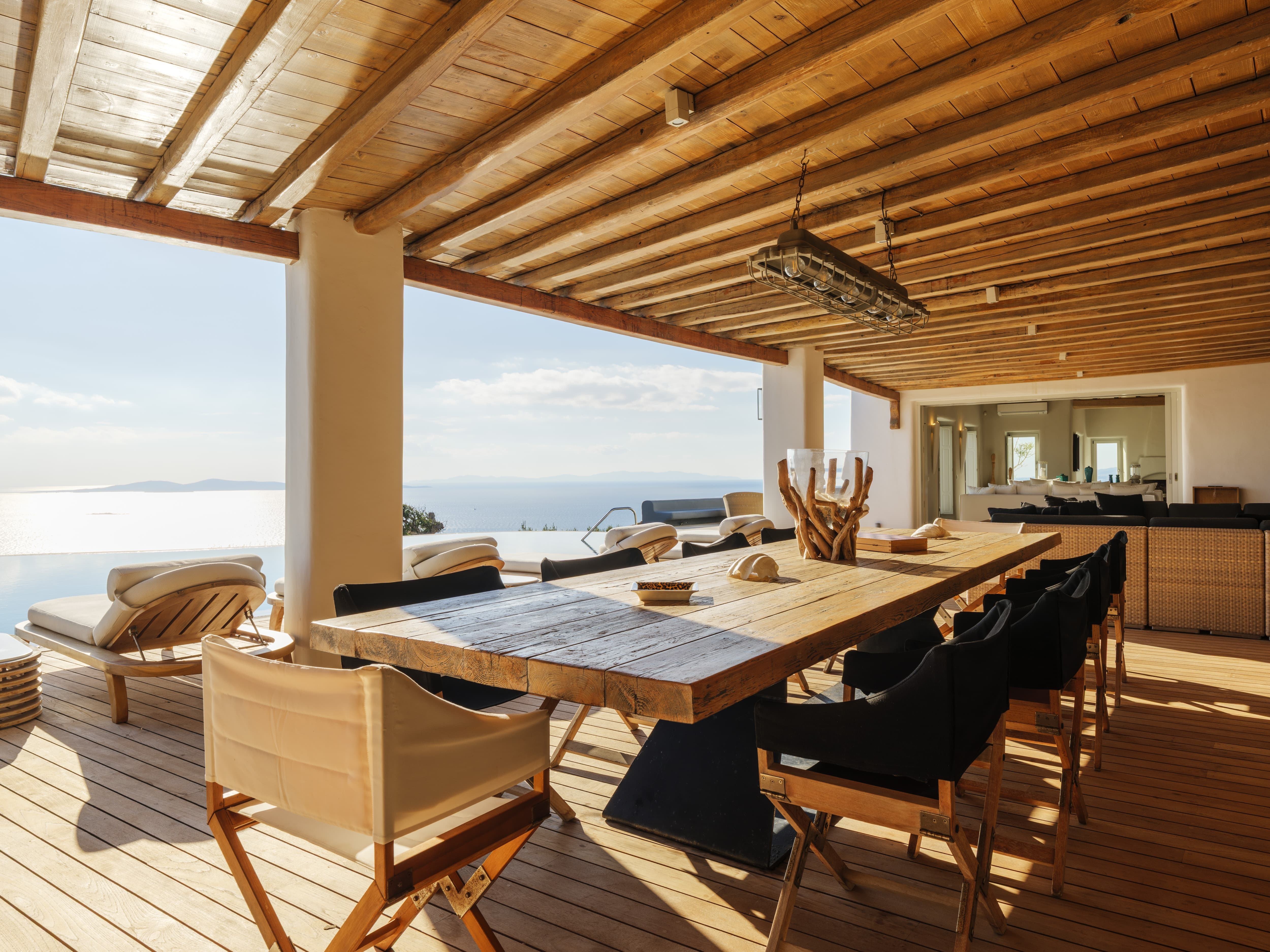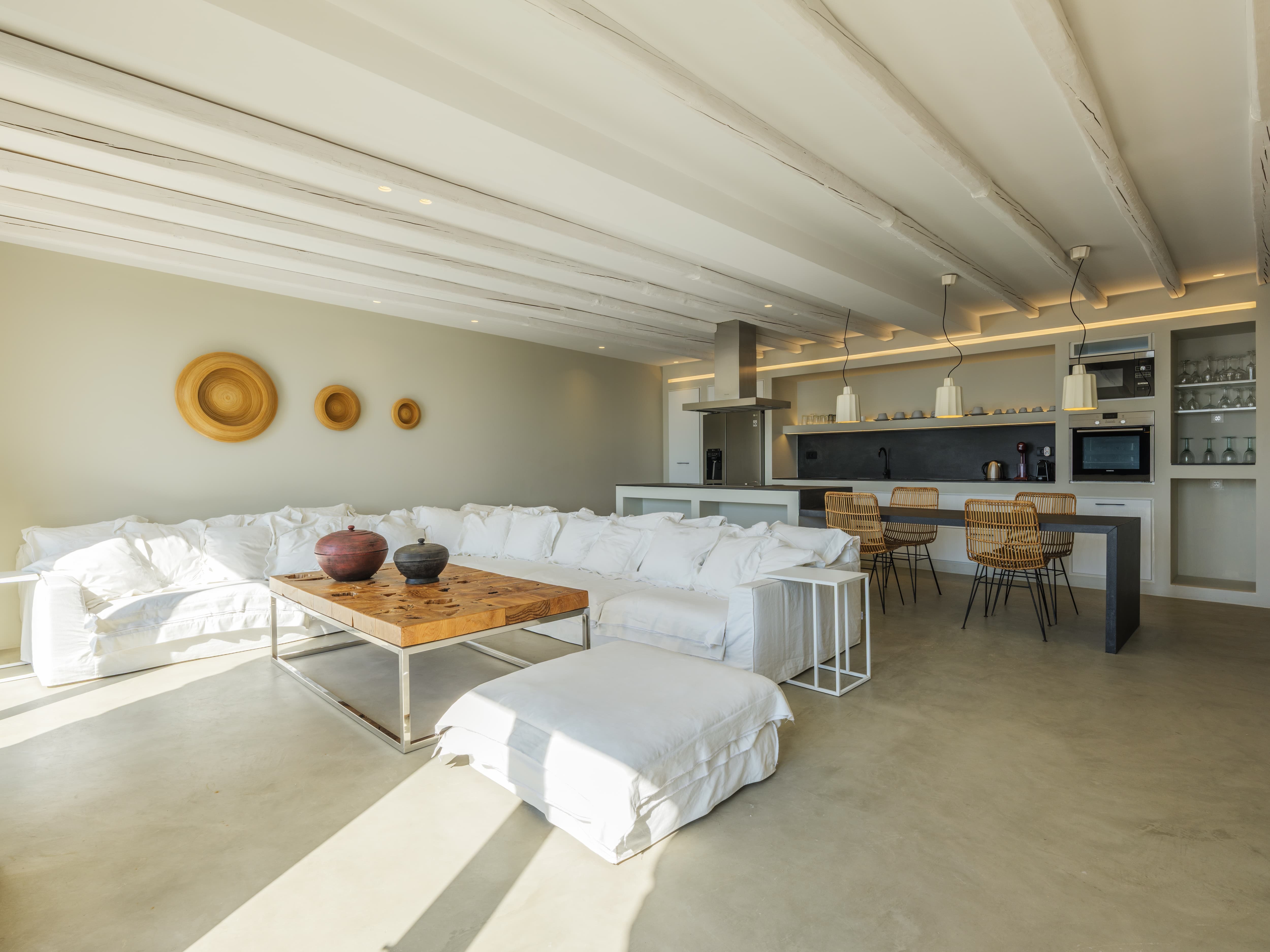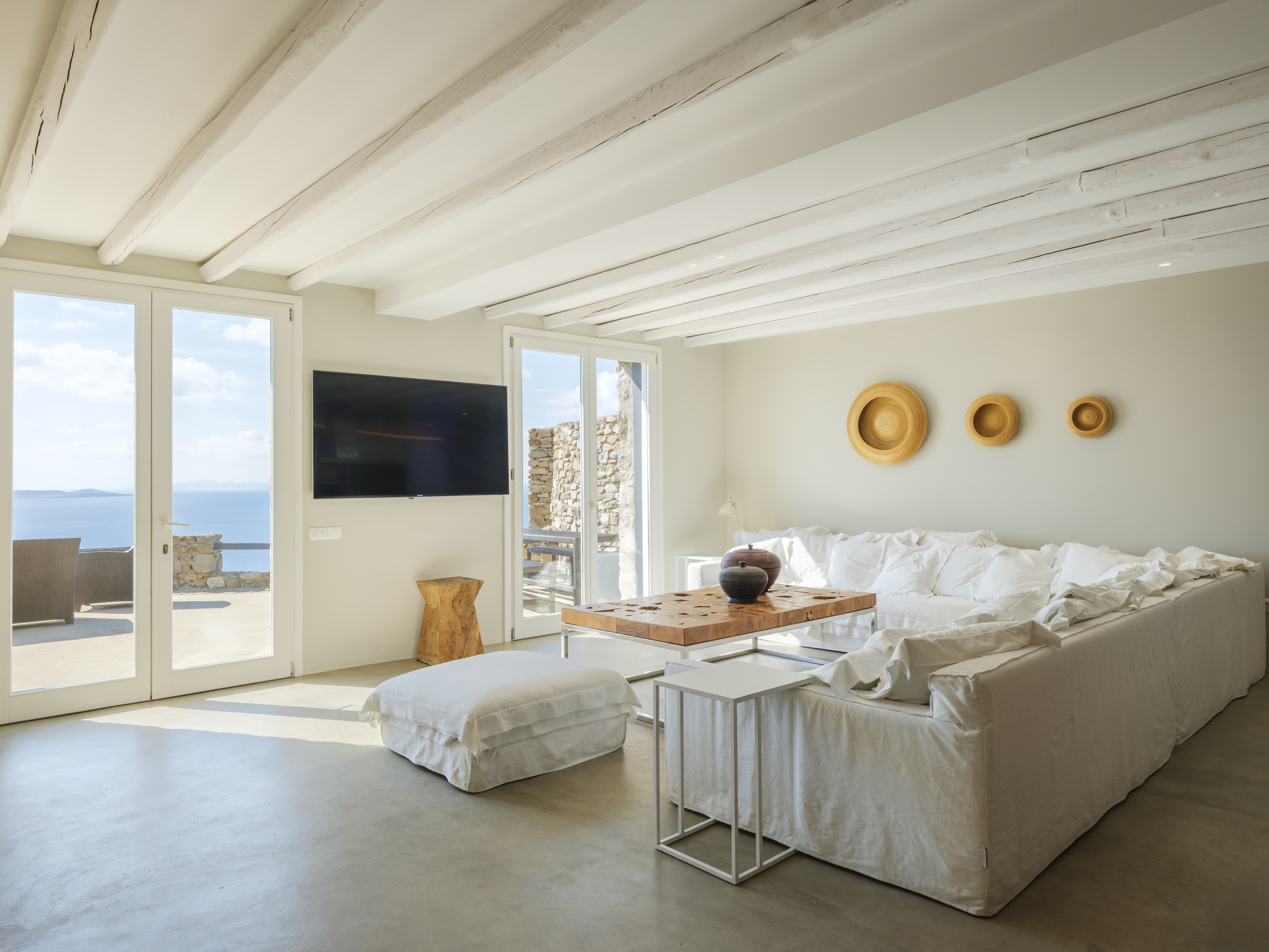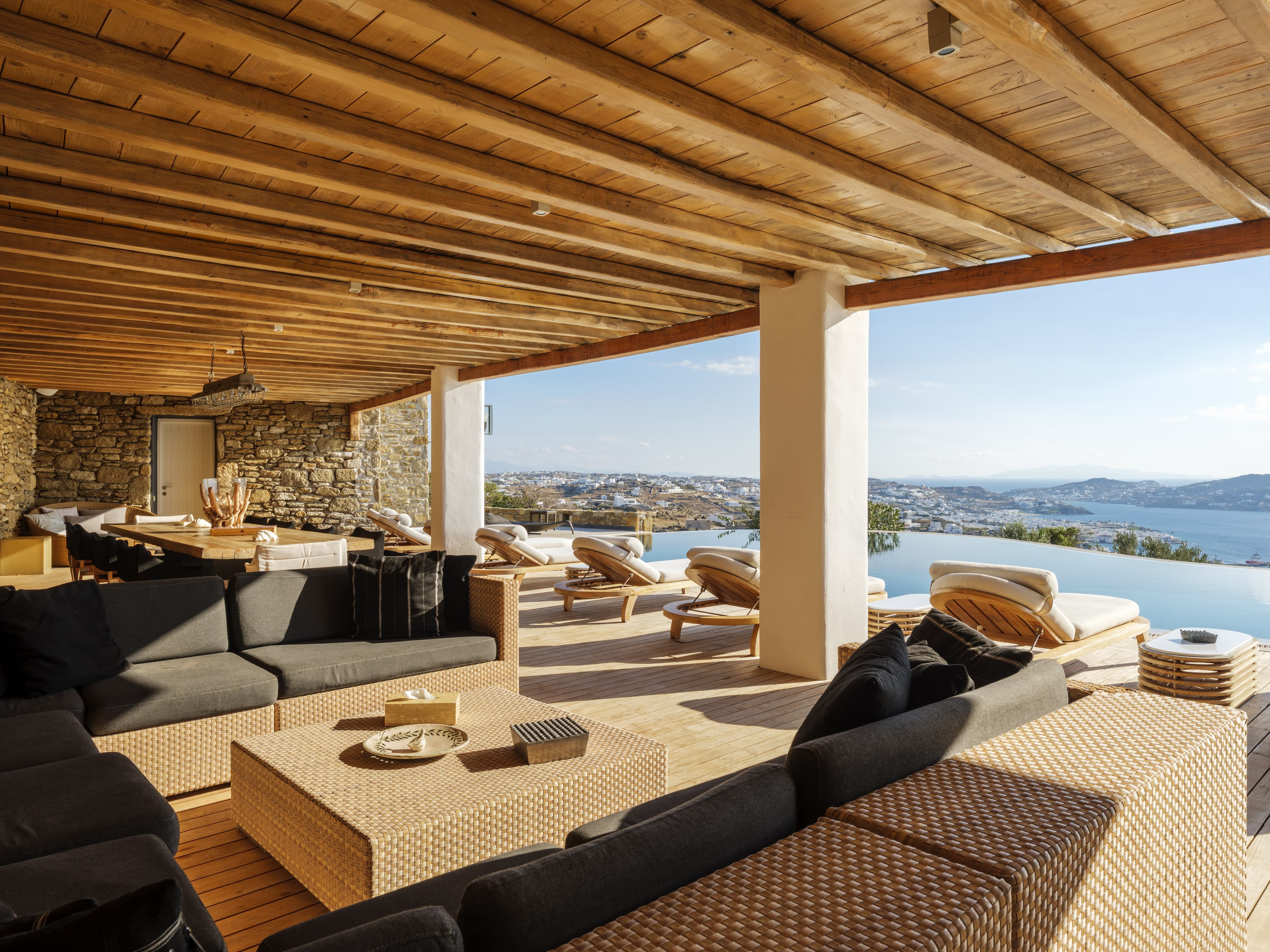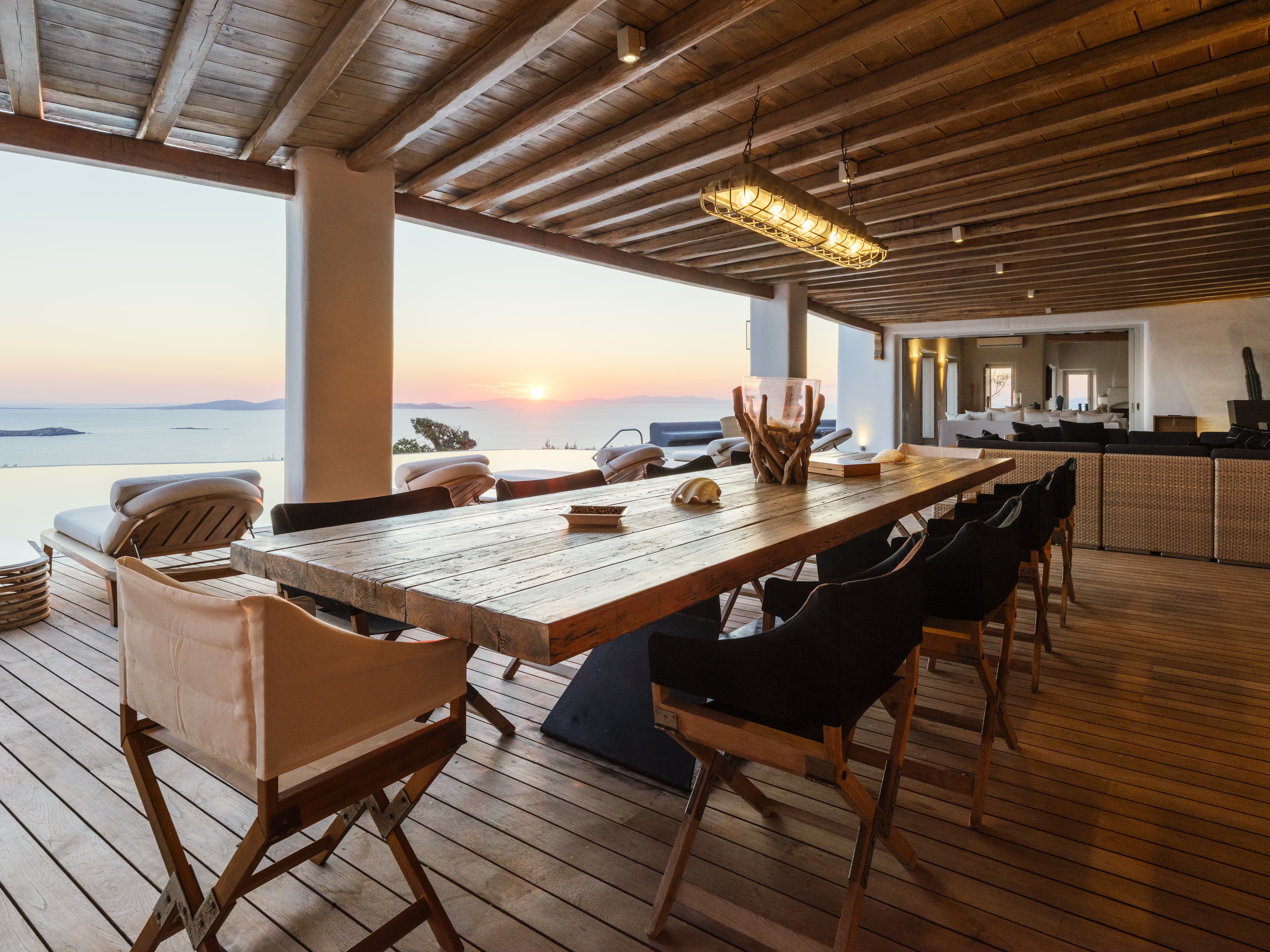 Expansive open-plan living areas designed to capture light and panoramic views across the Aegean and Mykonos Town. The main lounge, centred around a fireplace, flows seamlessly onto the outdoor terraces, creating a natural transition between indoor comfort and outdoor living. Multiple seating areas allow for both social gatherings and quieter moments.
