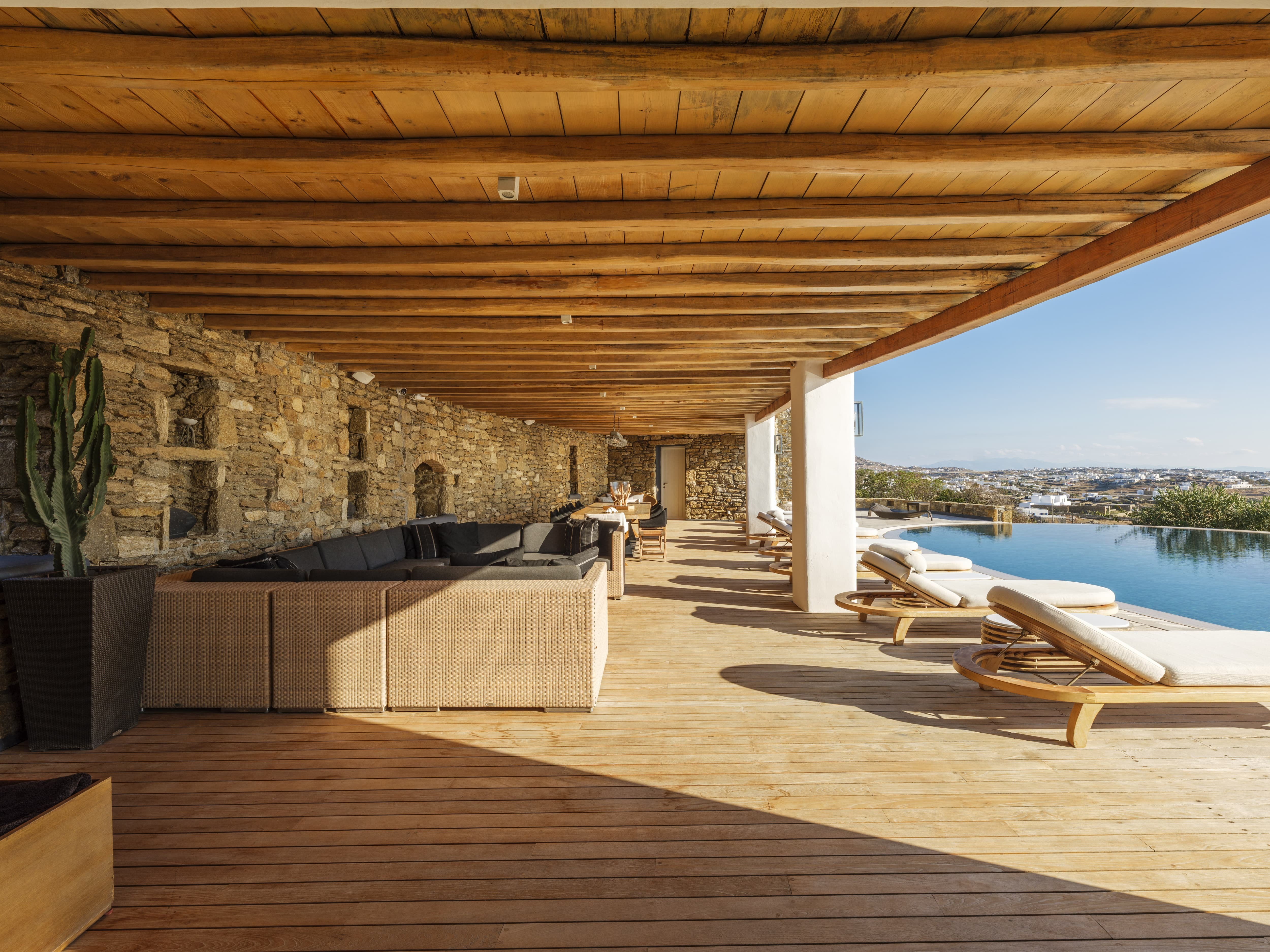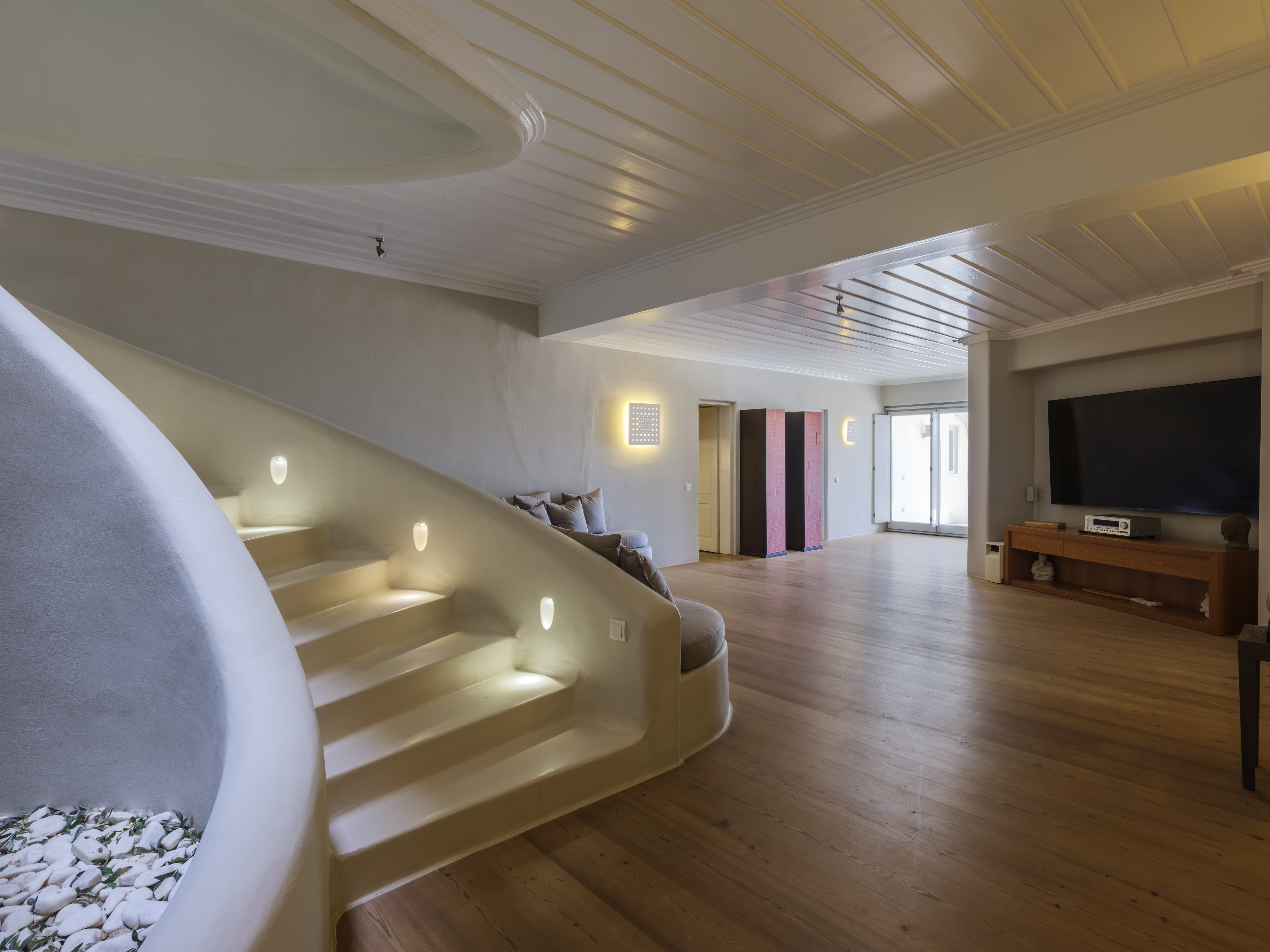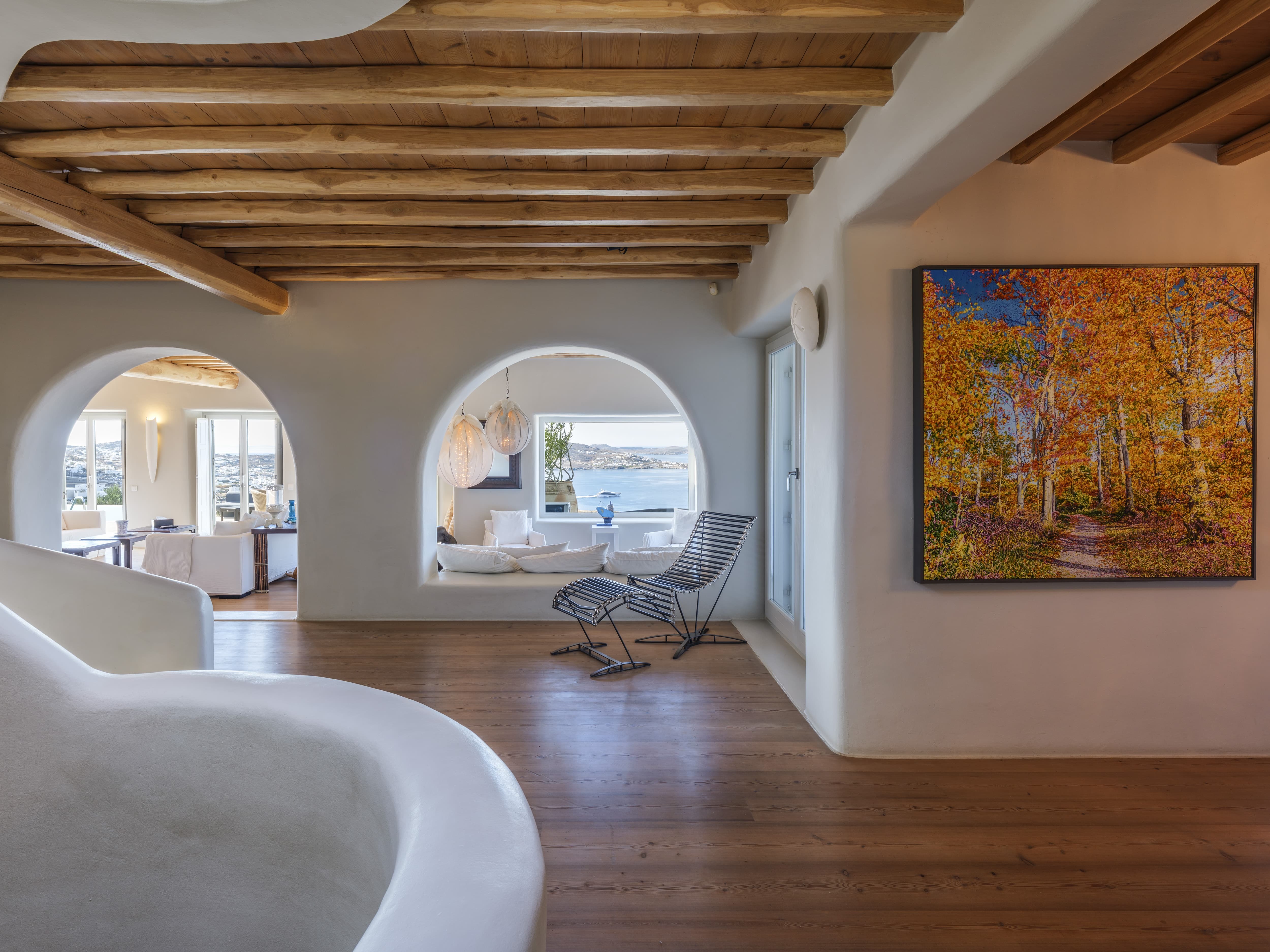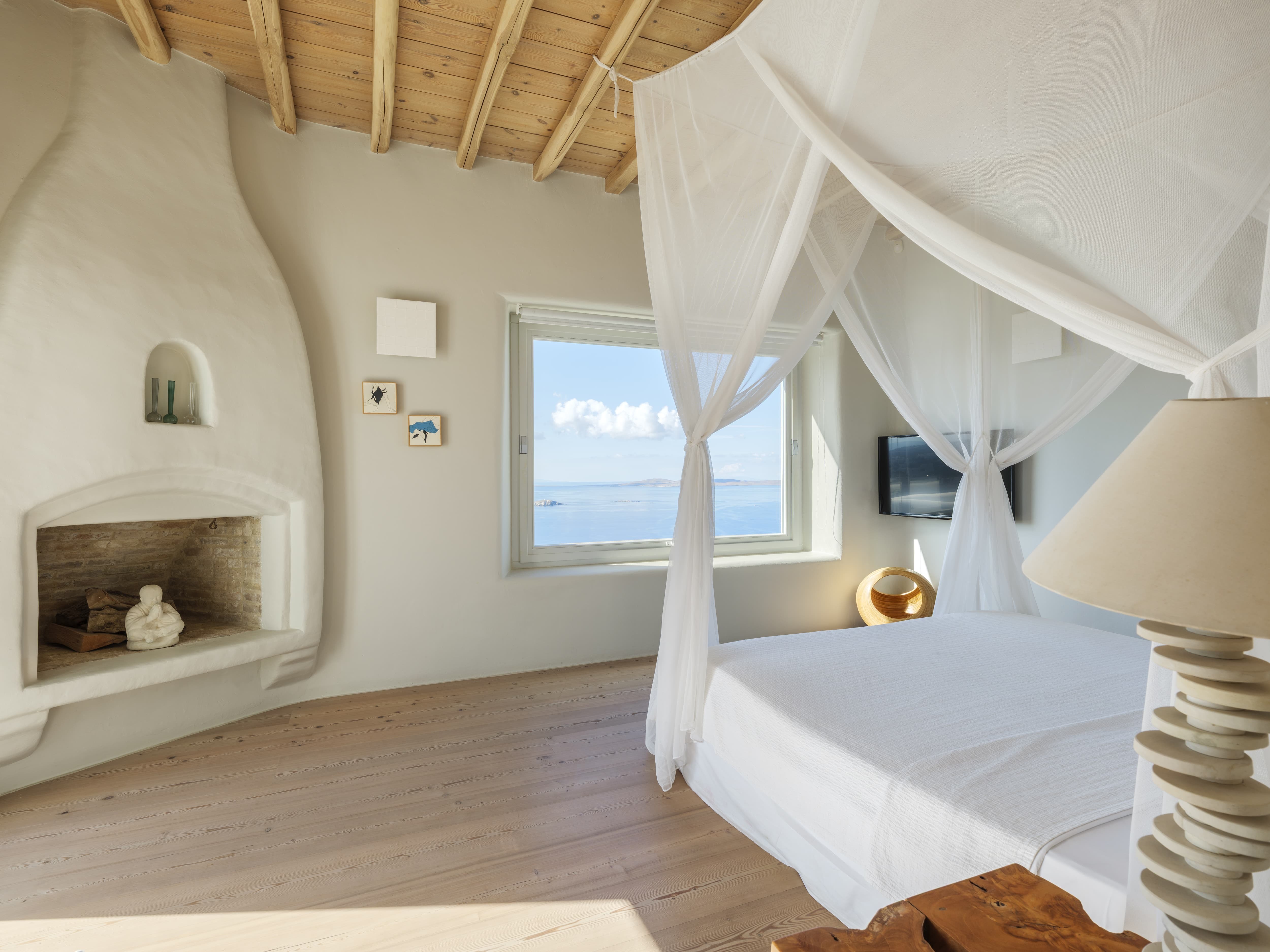Expansive open-plan living areas designed to capture light and panoramic views across the Aegean and Mykonos Town. The main lounge, centred around a fireplace, flows seamlessly onto the outdoor terraces, creating a natural transition between indoor comfort and outdoor living. Multiple seating areas allow for both social gatherings and quieter moments.