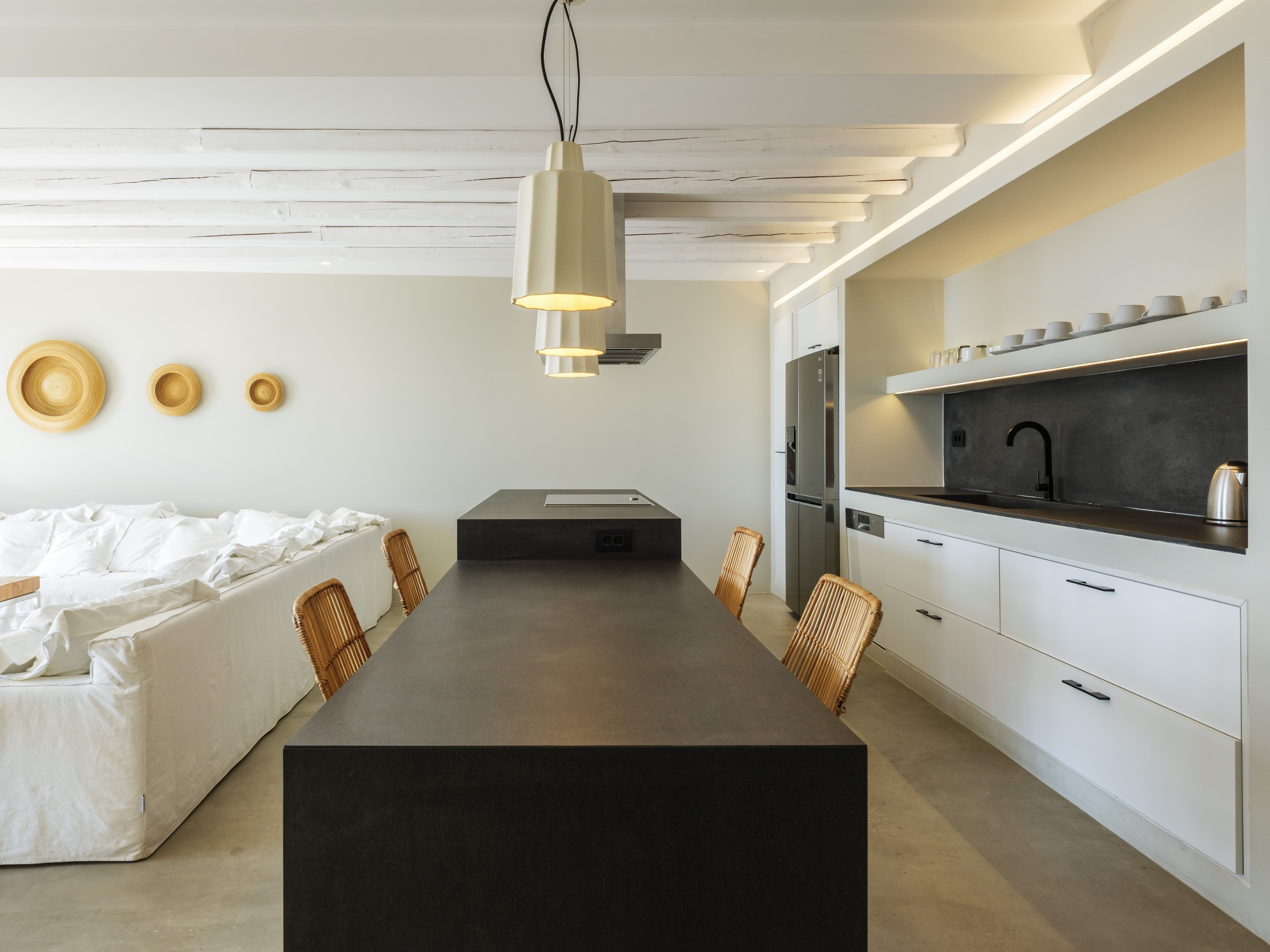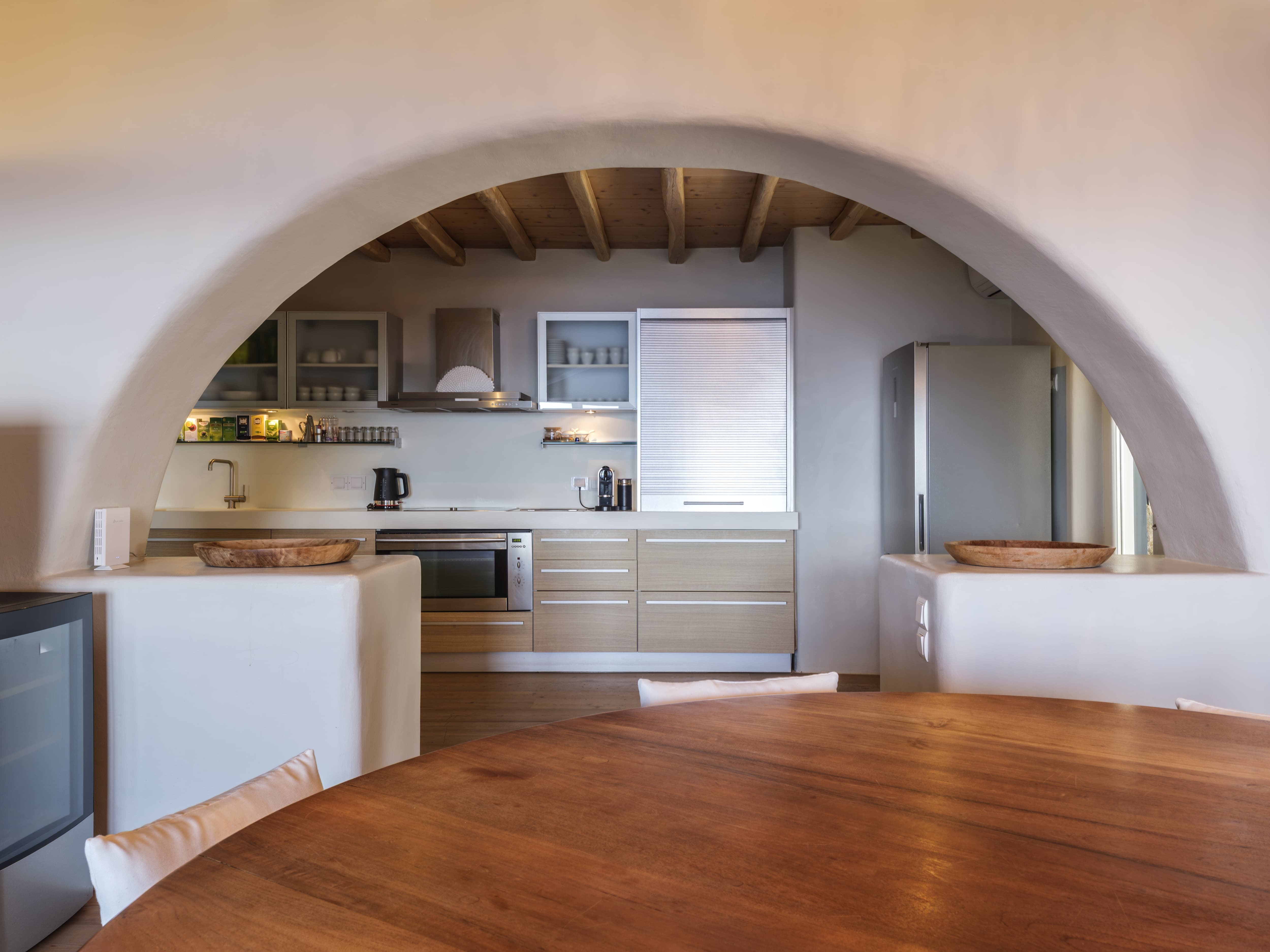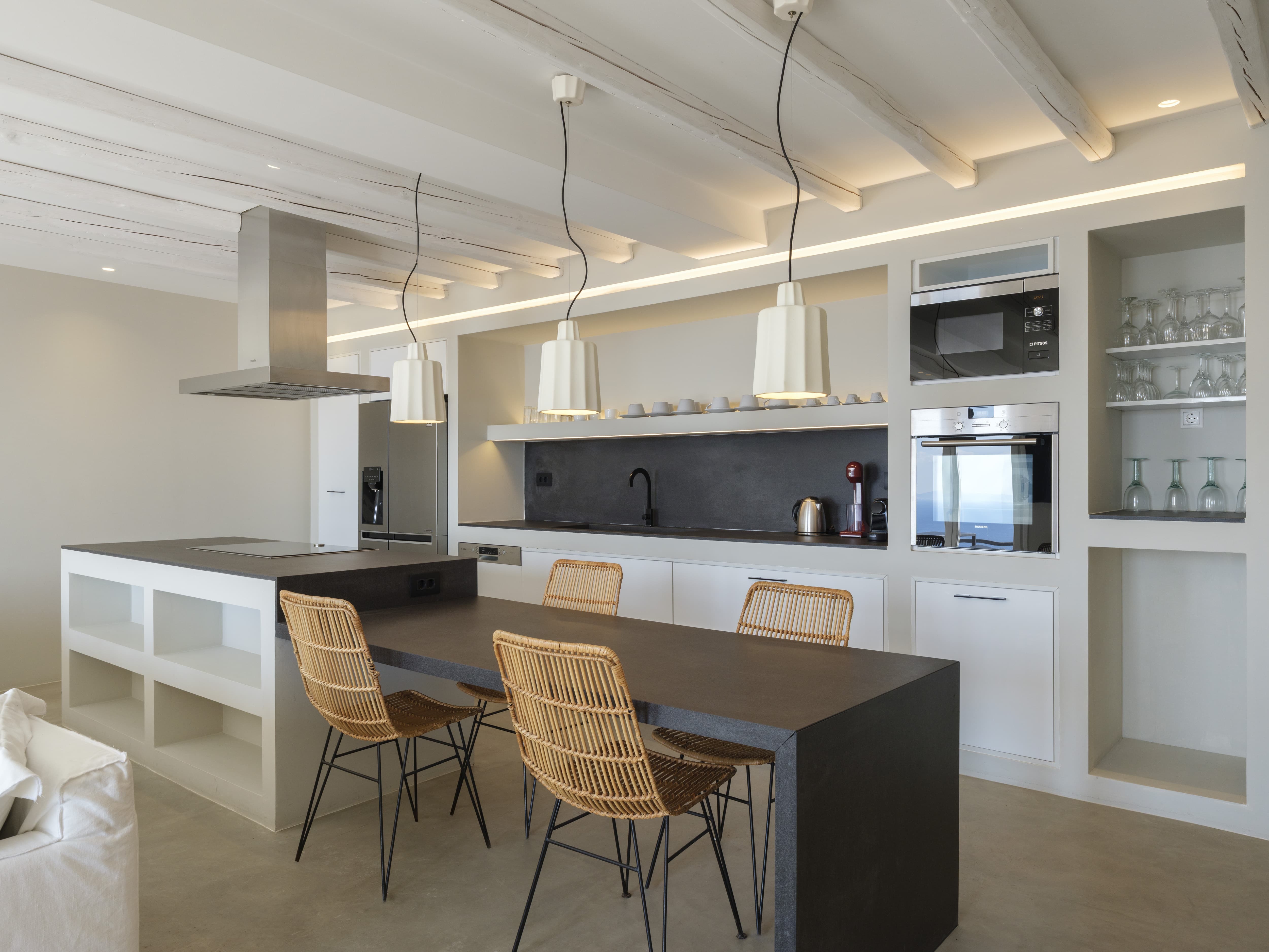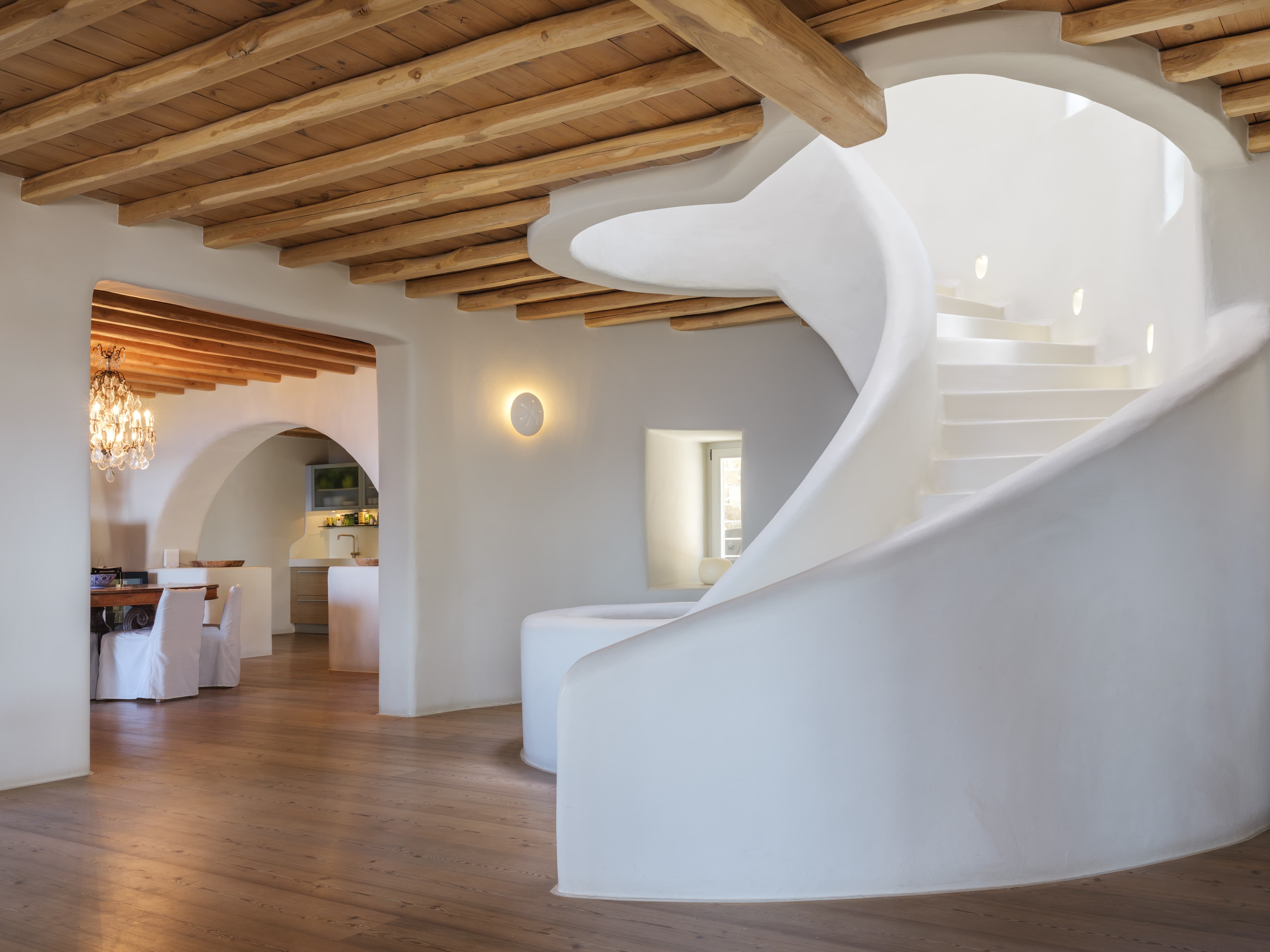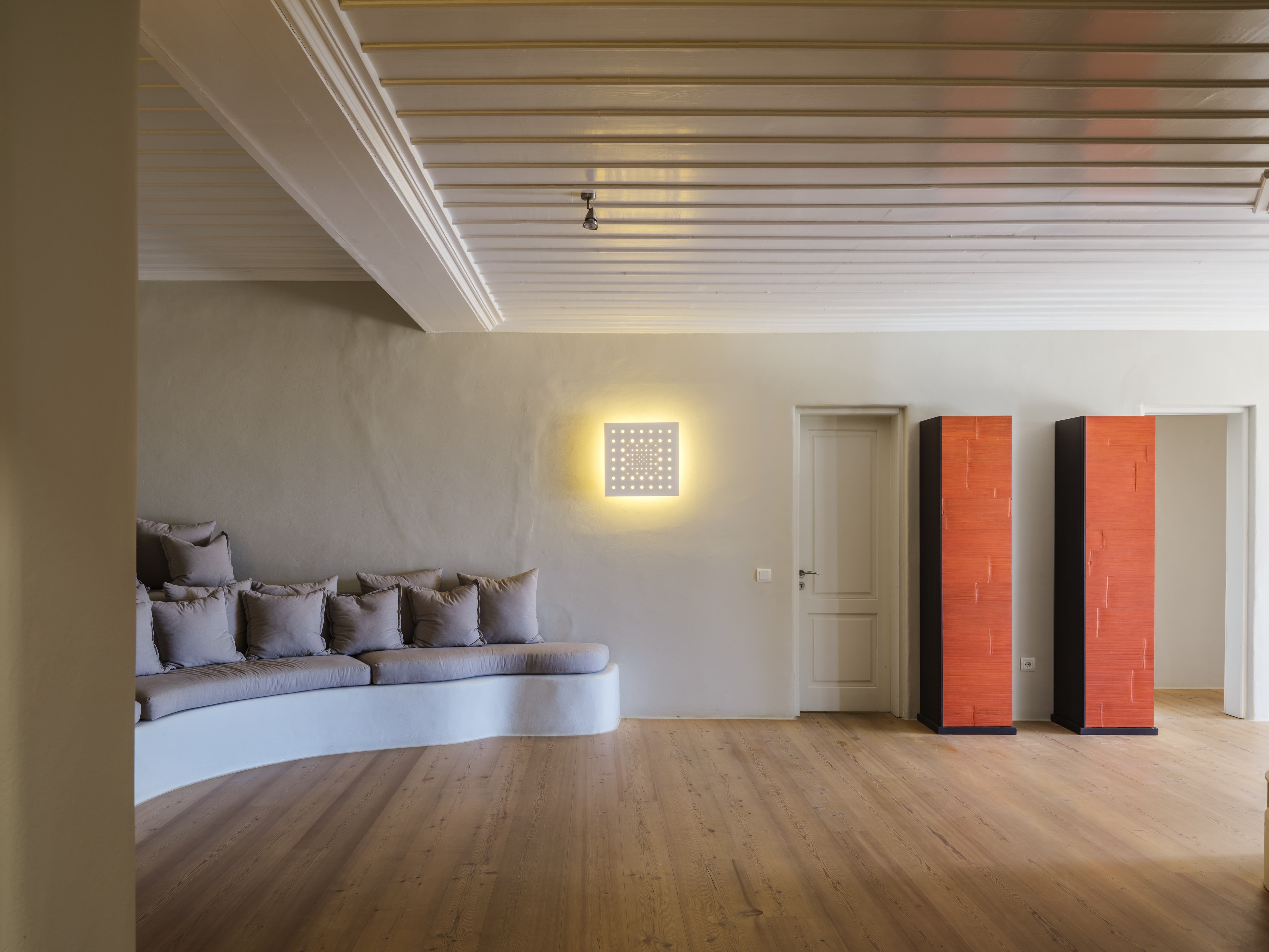 Expansive open-plan living areas designed to capture light and panoramic views across the Aegean and Mykonos Town. The main lounge, centred around a fireplace, flows seamlessly onto the outdoor terraces, creating a natural transition between indoor comfort and outdoor living. Multiple seating areas allow for both social gatherings and quieter moments.