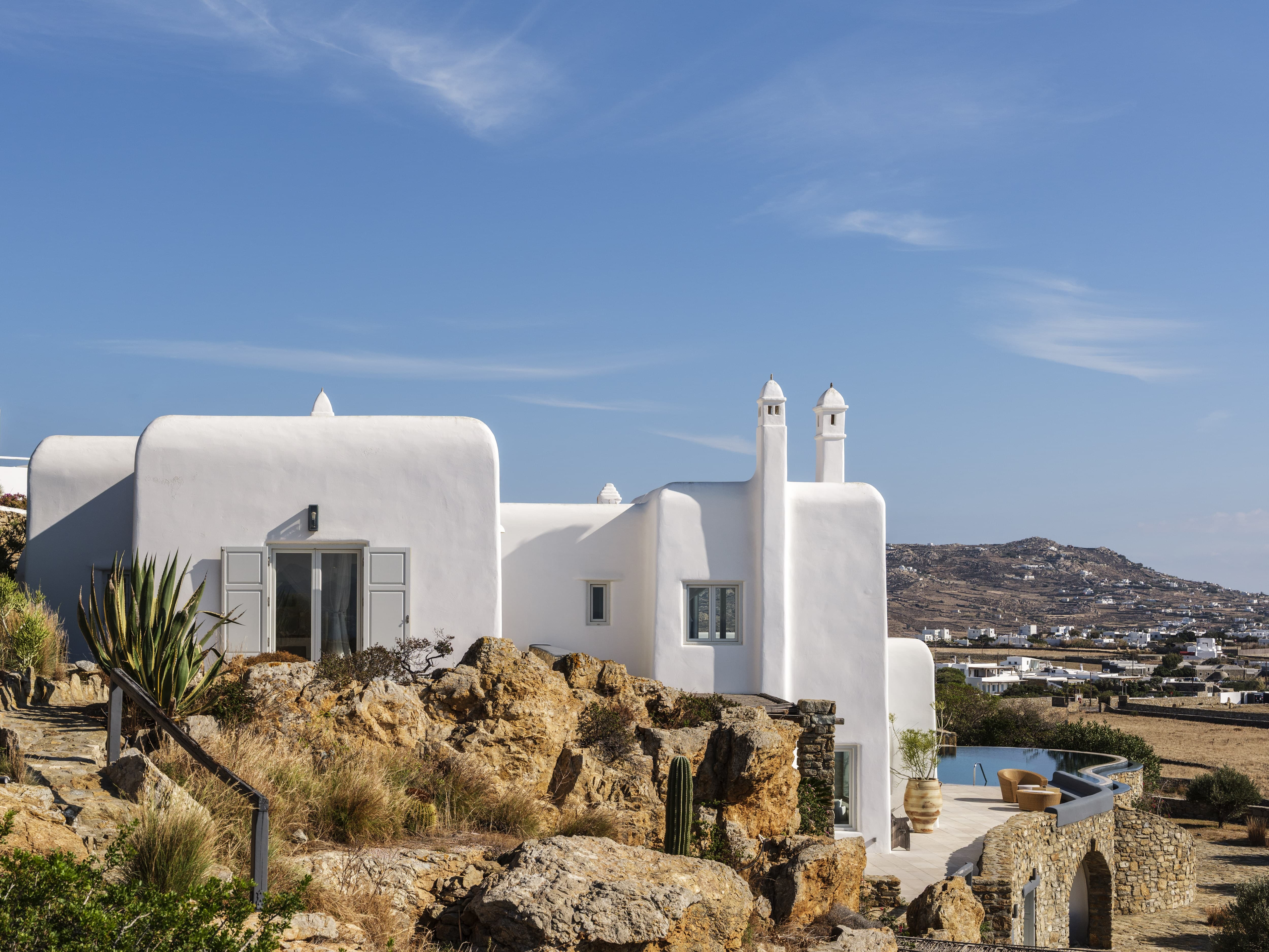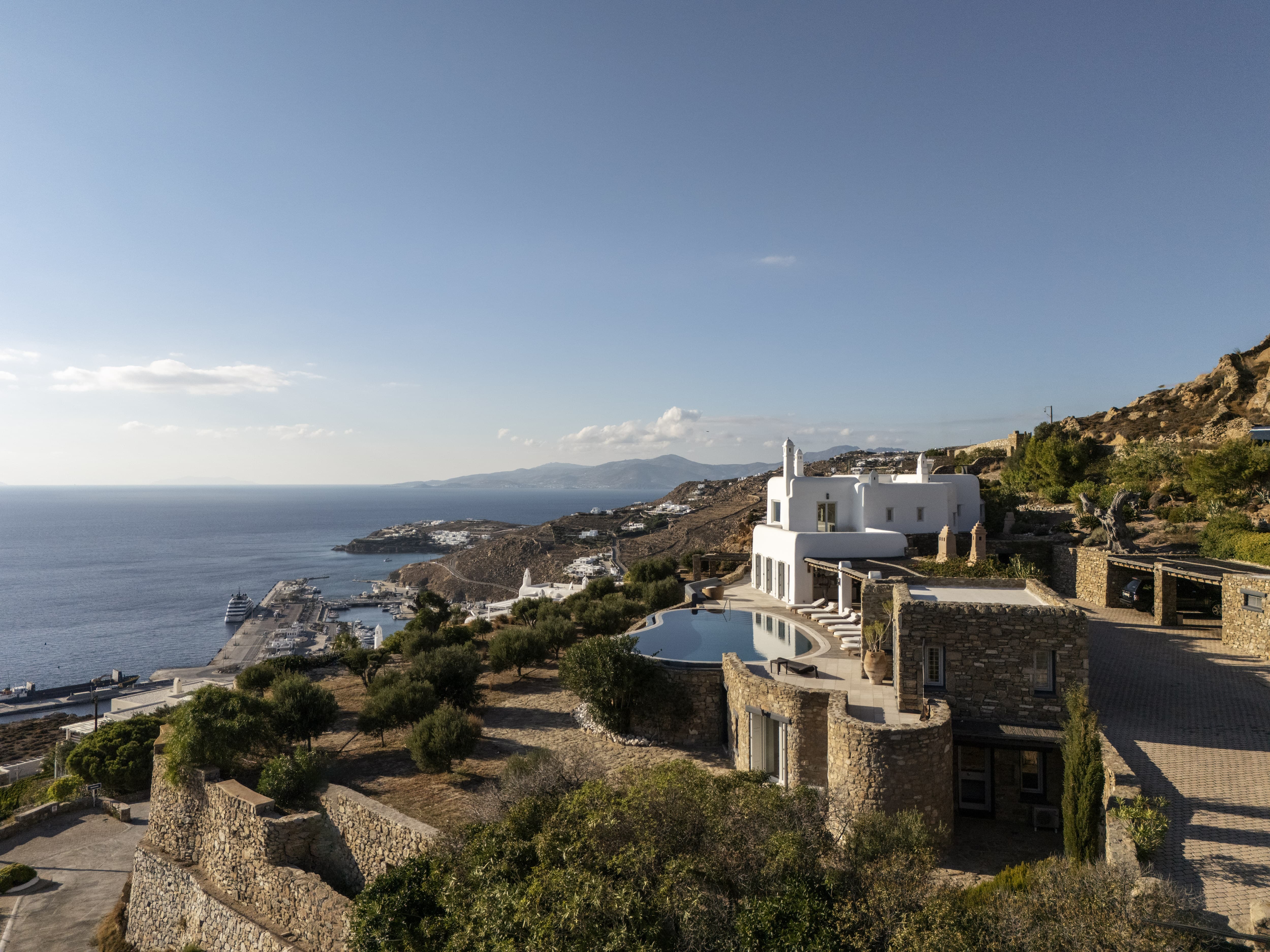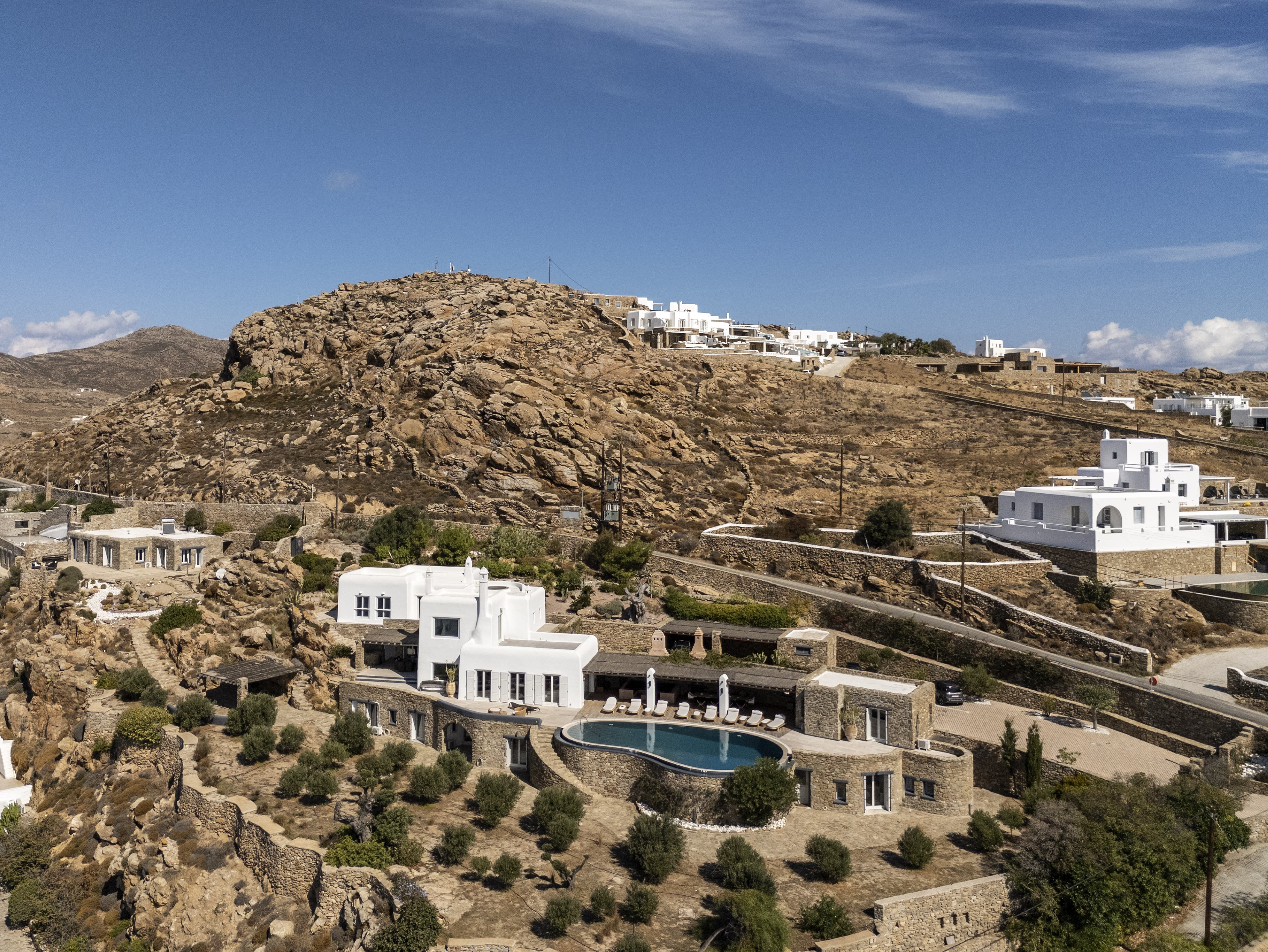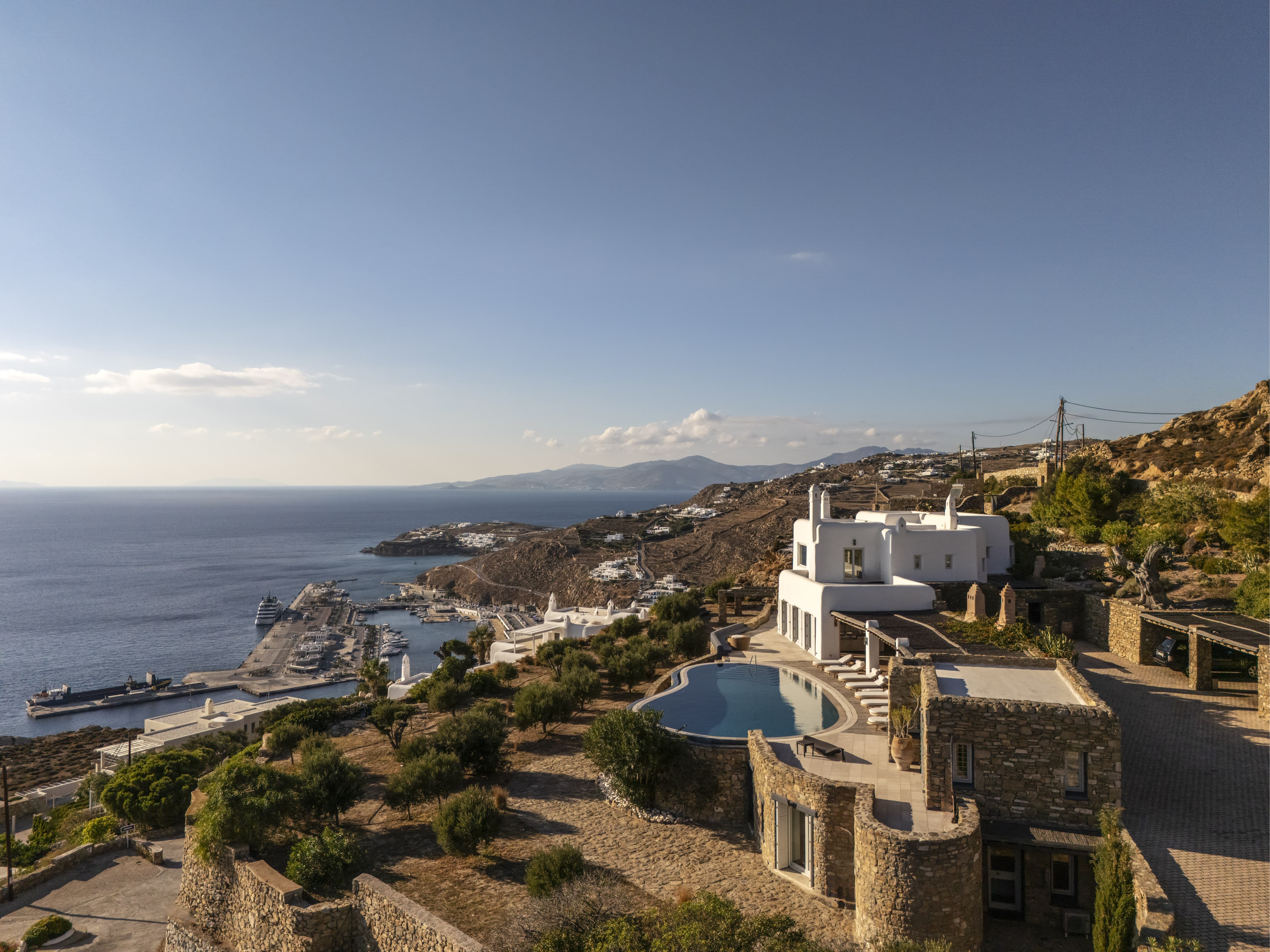 The villa is positioned in Agia Sofia, offering elevated views and immediate proximity to Mykonos Town.