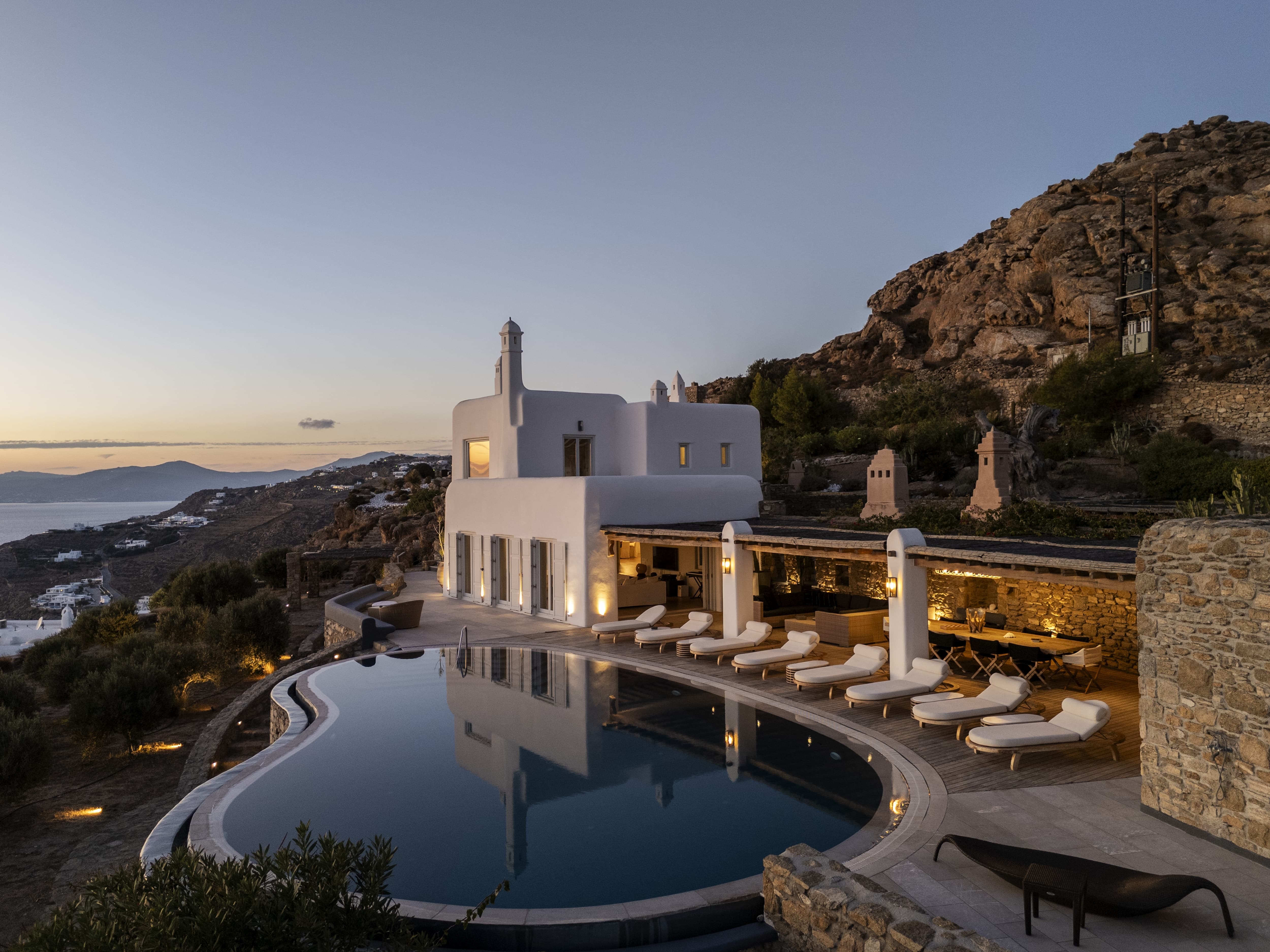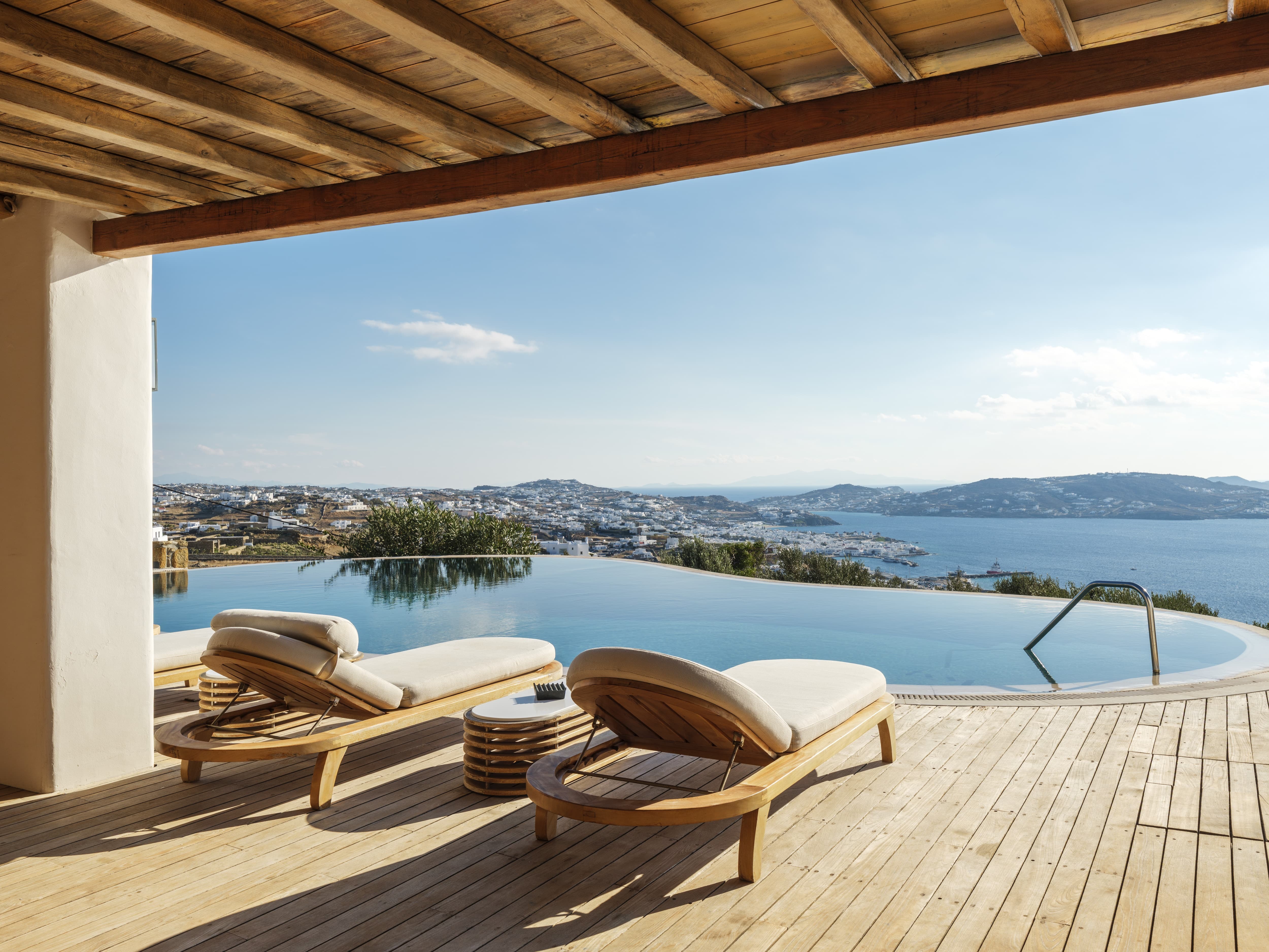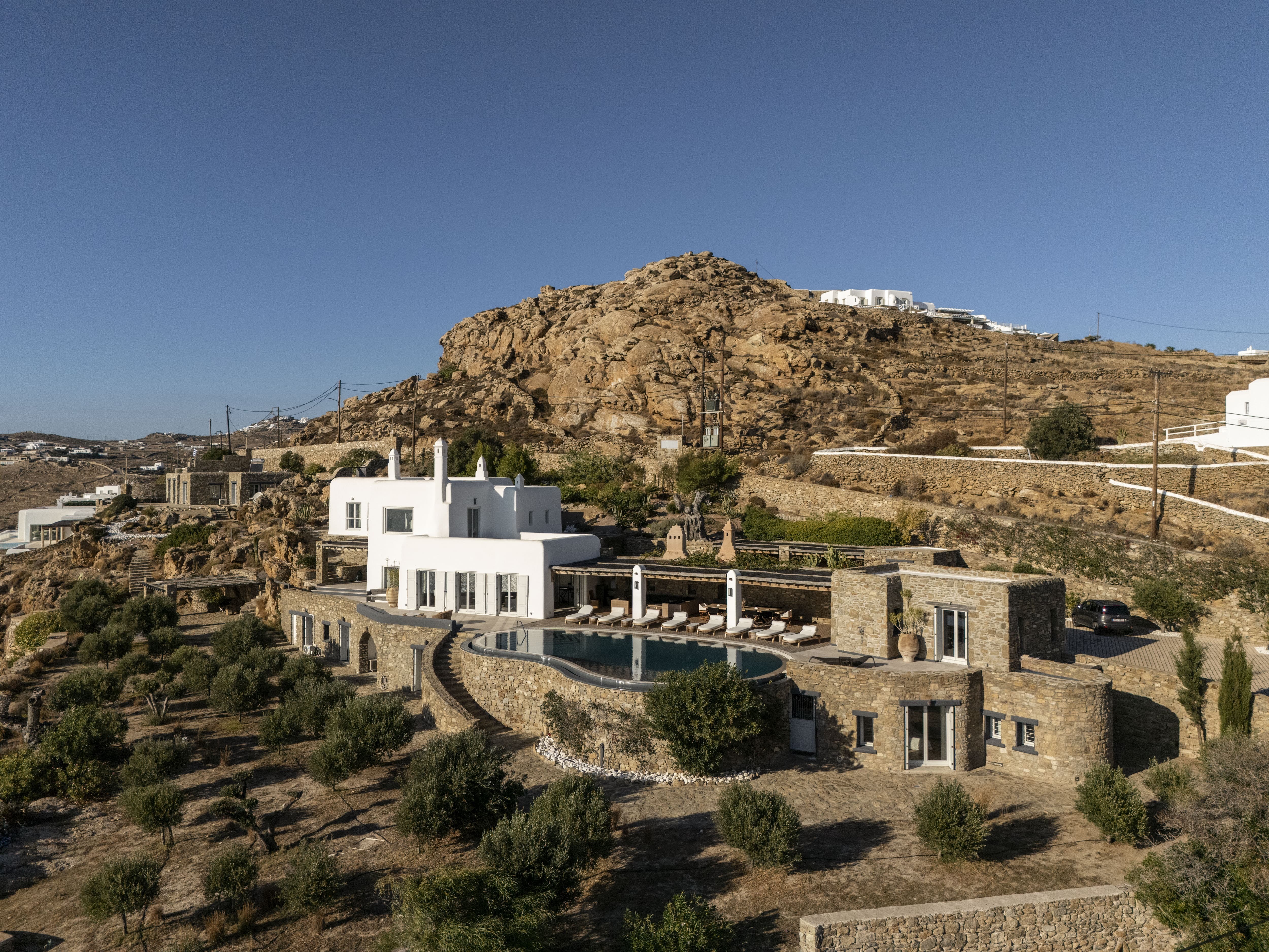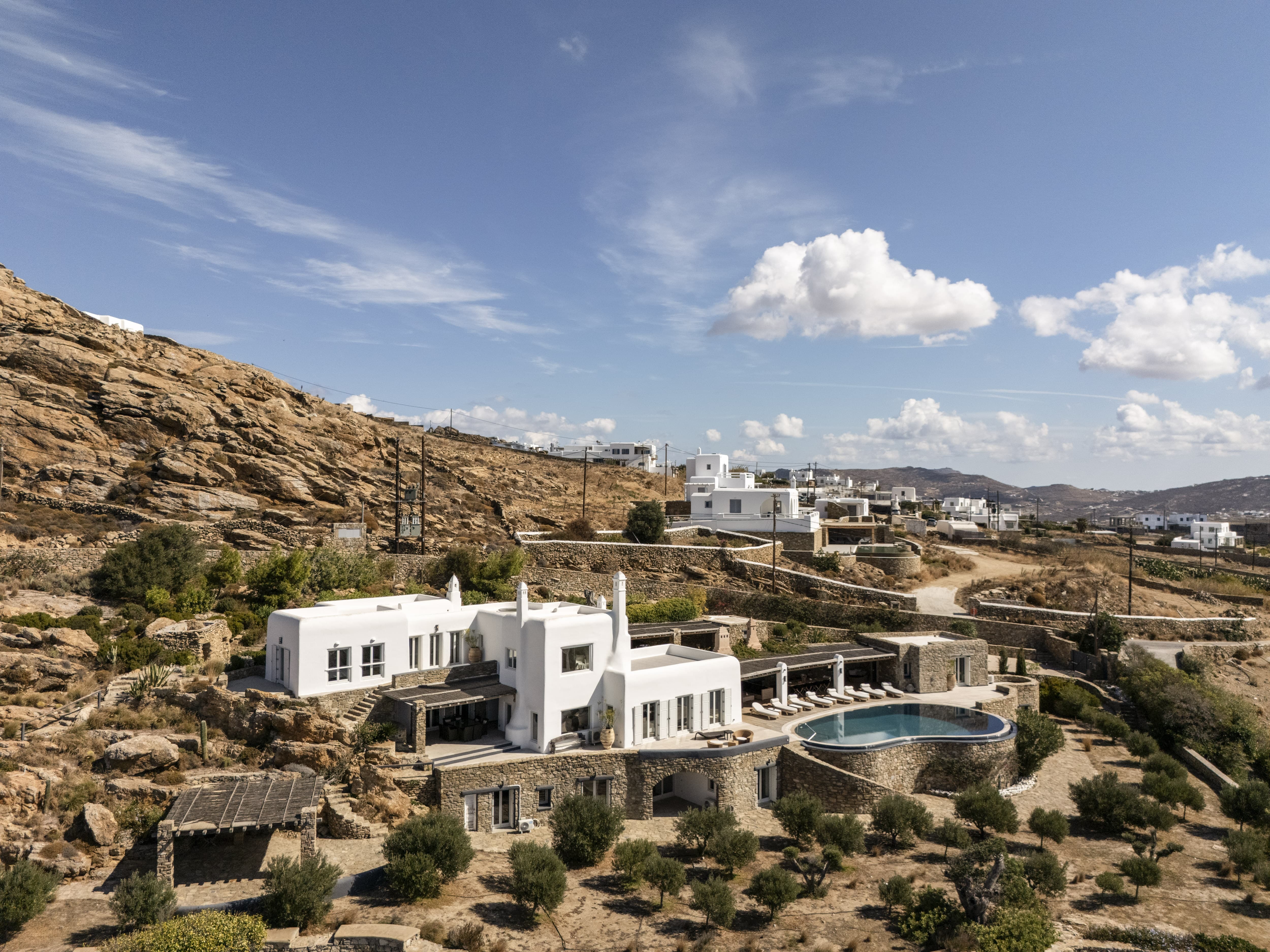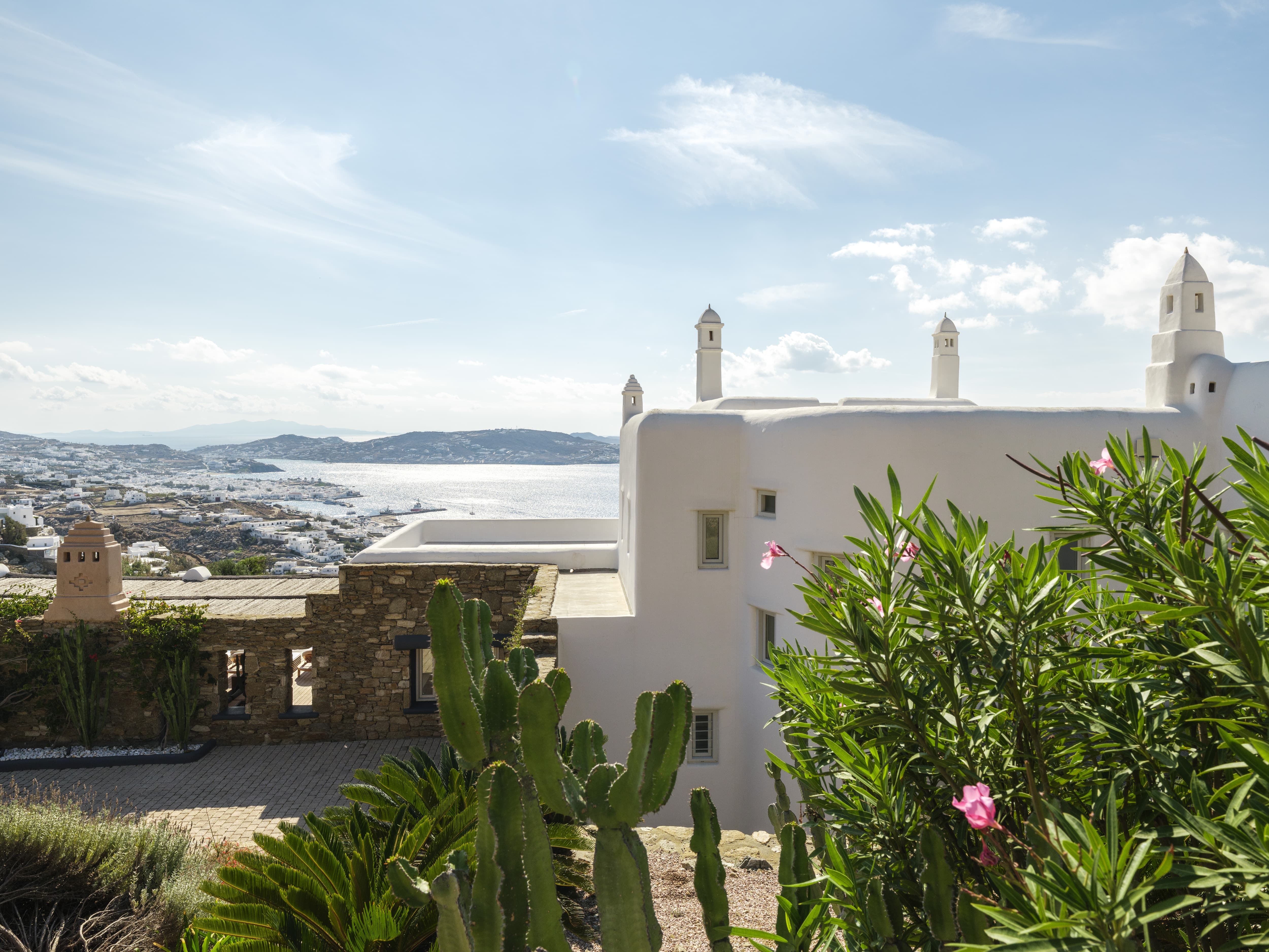 The villa is positioned in Agia Sofia, offering elevated views and immediate proximity to Mykonos Town.