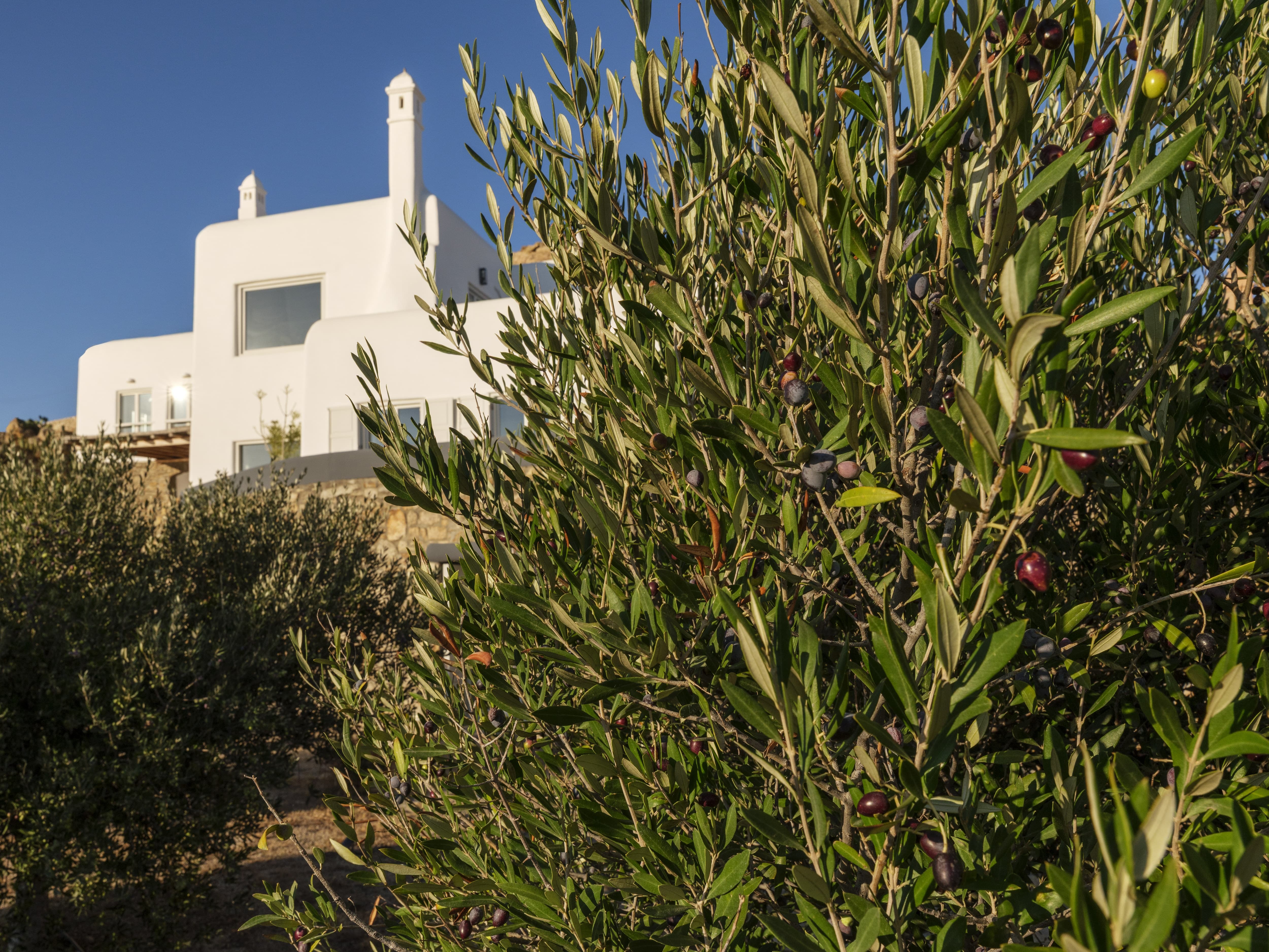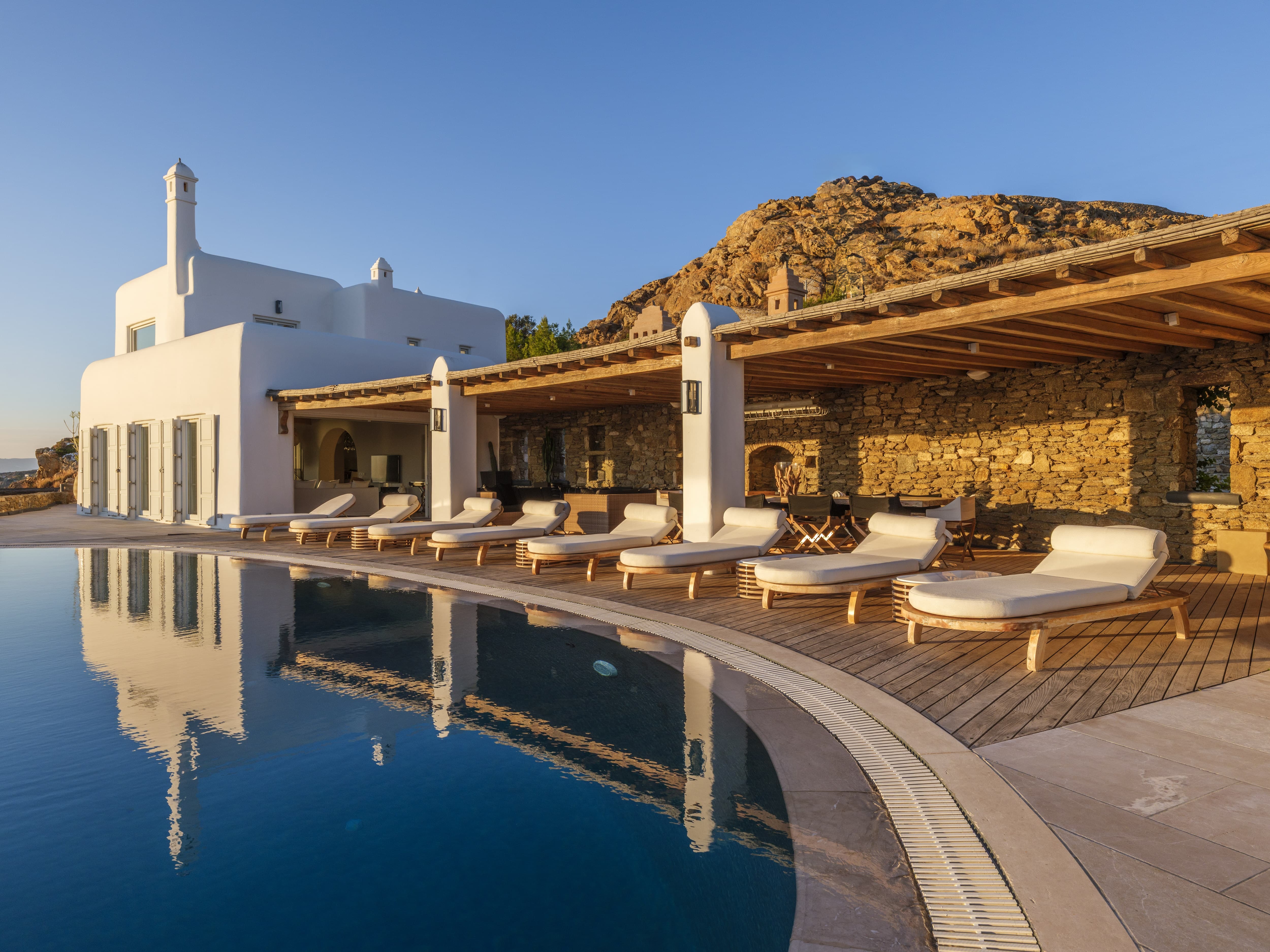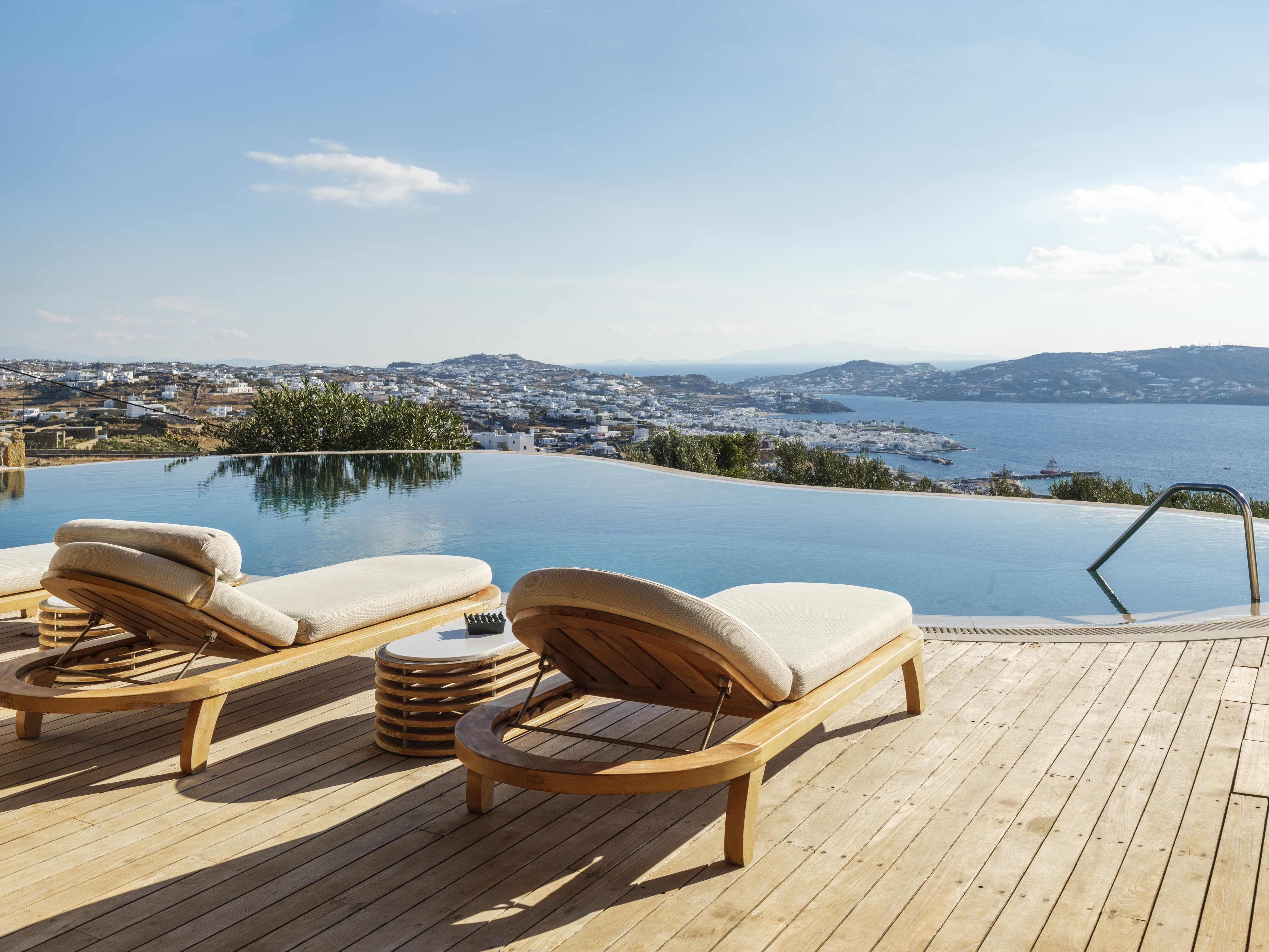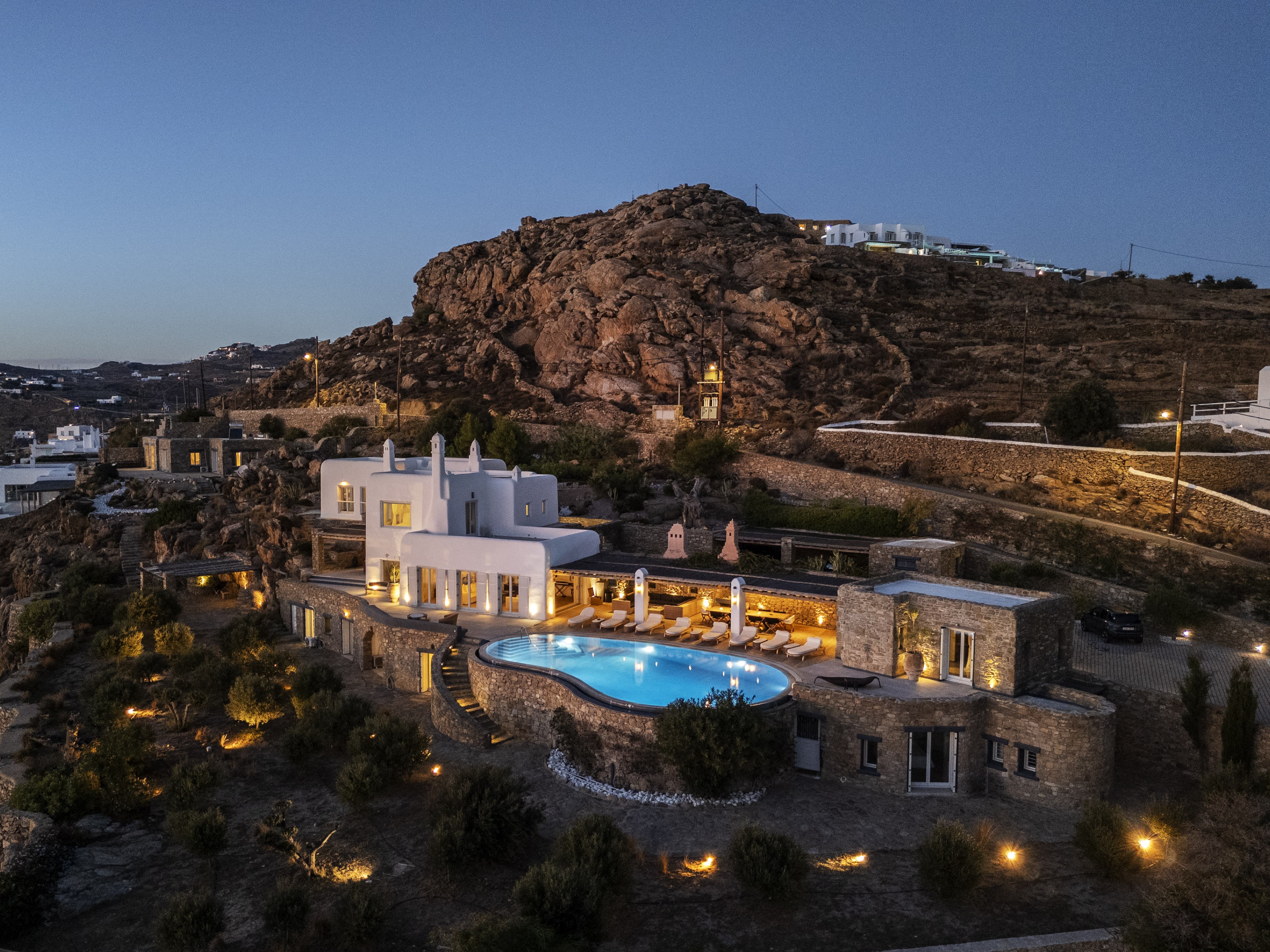 The villa is positioned in Agia Sofia, offering elevated views and immediate proximity to Mykonos Town.