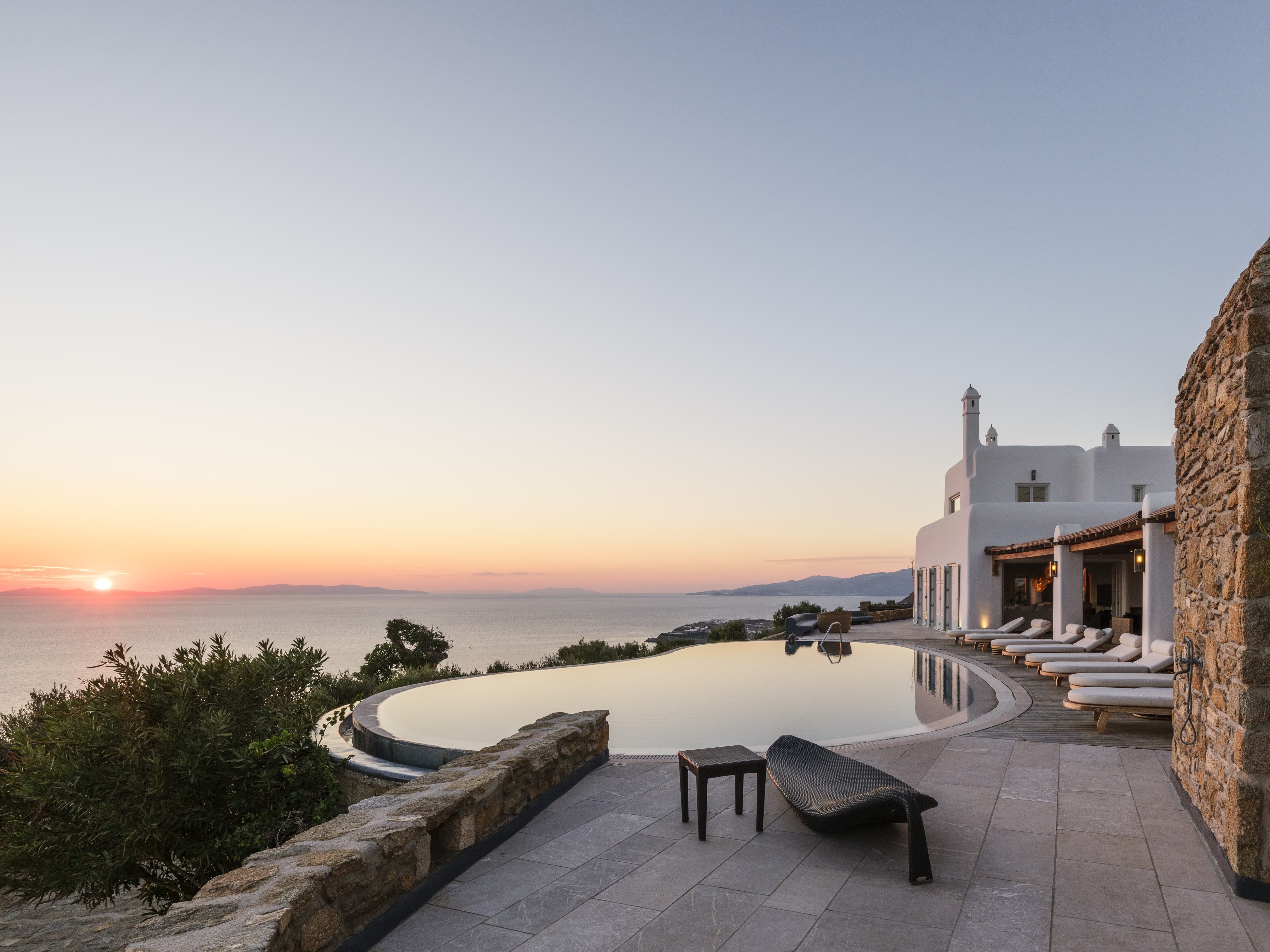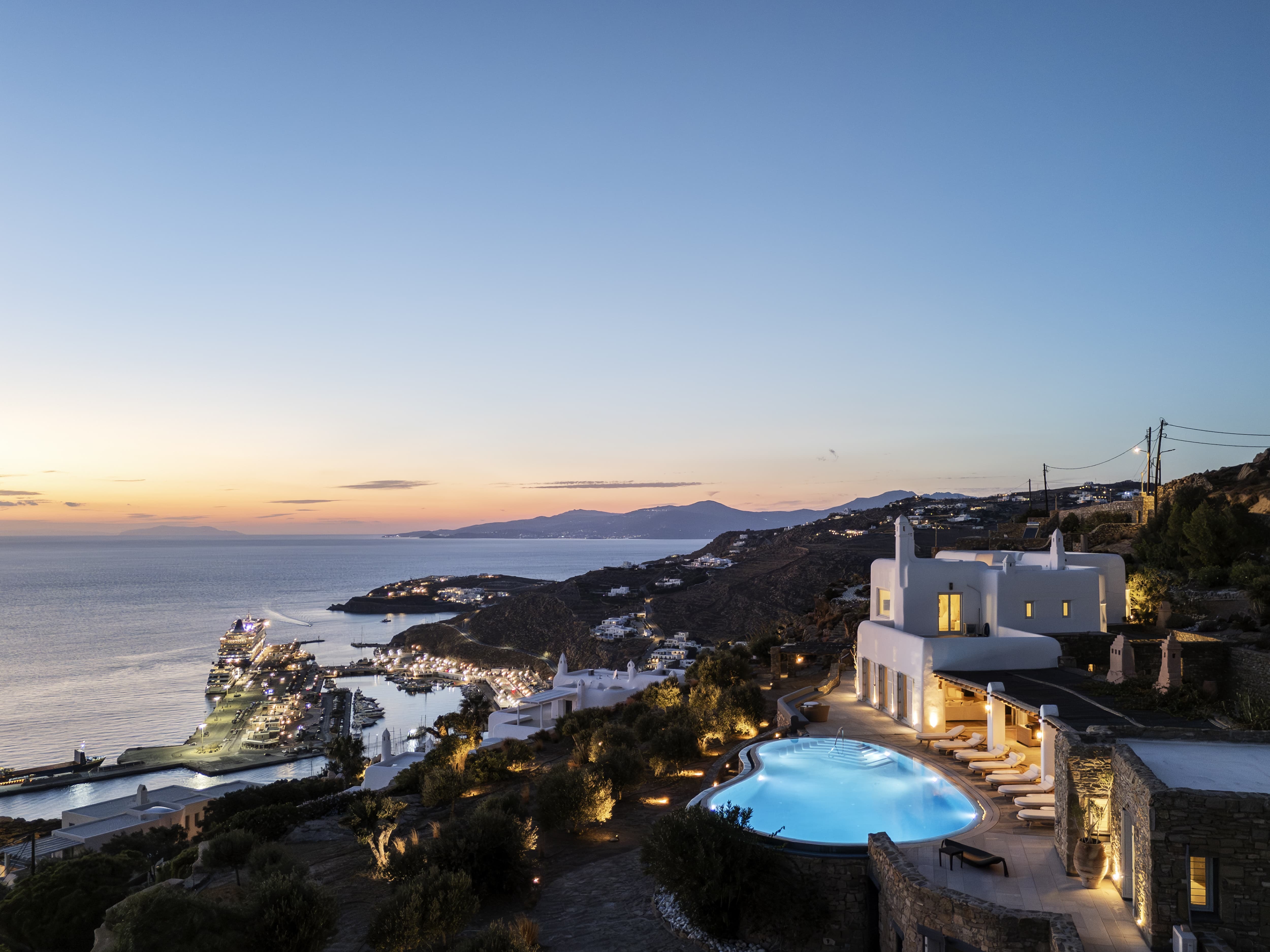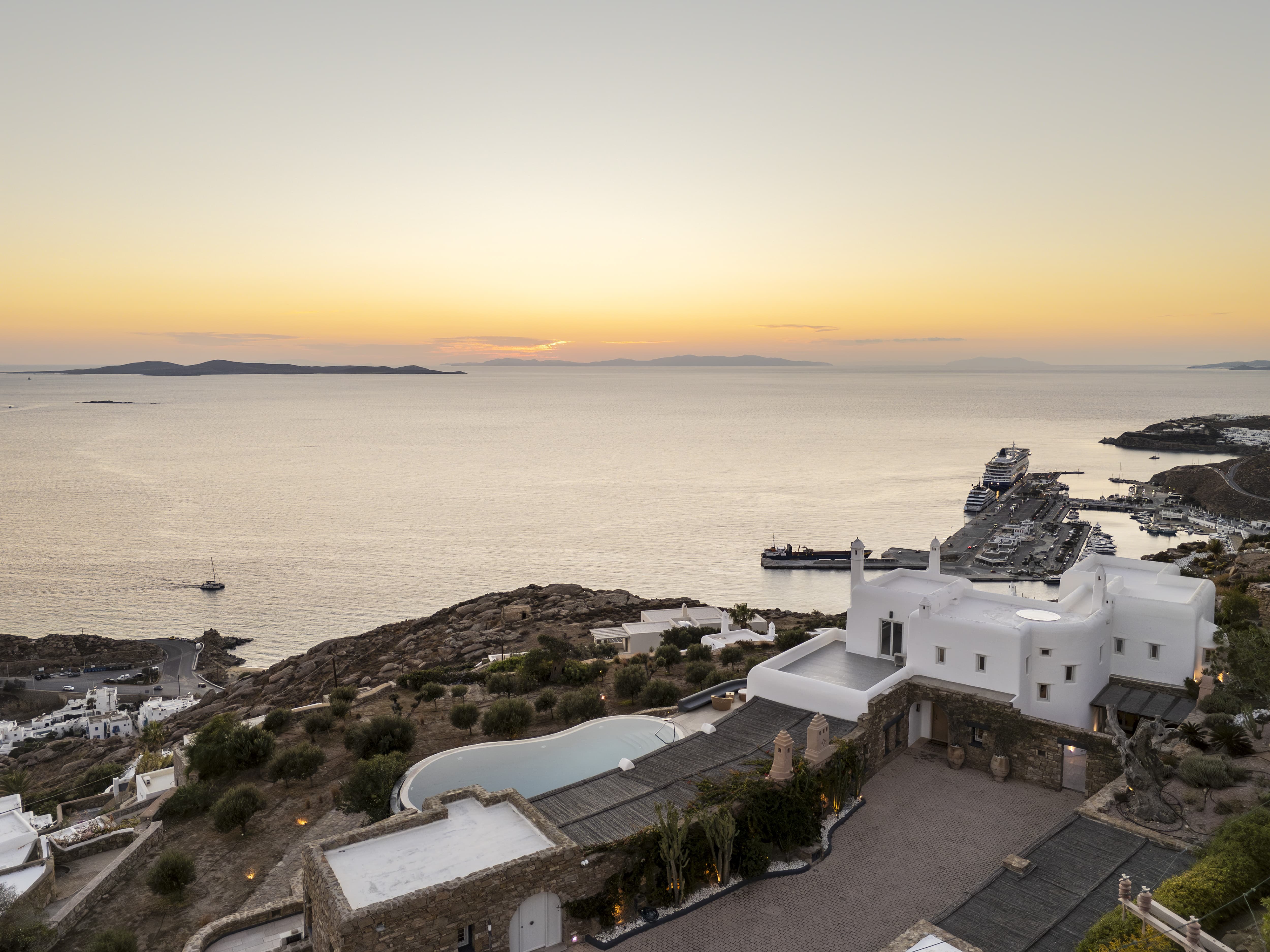 Set high above the coastline in Agia Sofia, Villa Elysian Cove offers a rare perspective over Mykonos. From this elevated position, the island unfolds beneath you, with uninterrupted views stretching across the Aegean, the port, and the shifting colours of the sunset that define each evening.