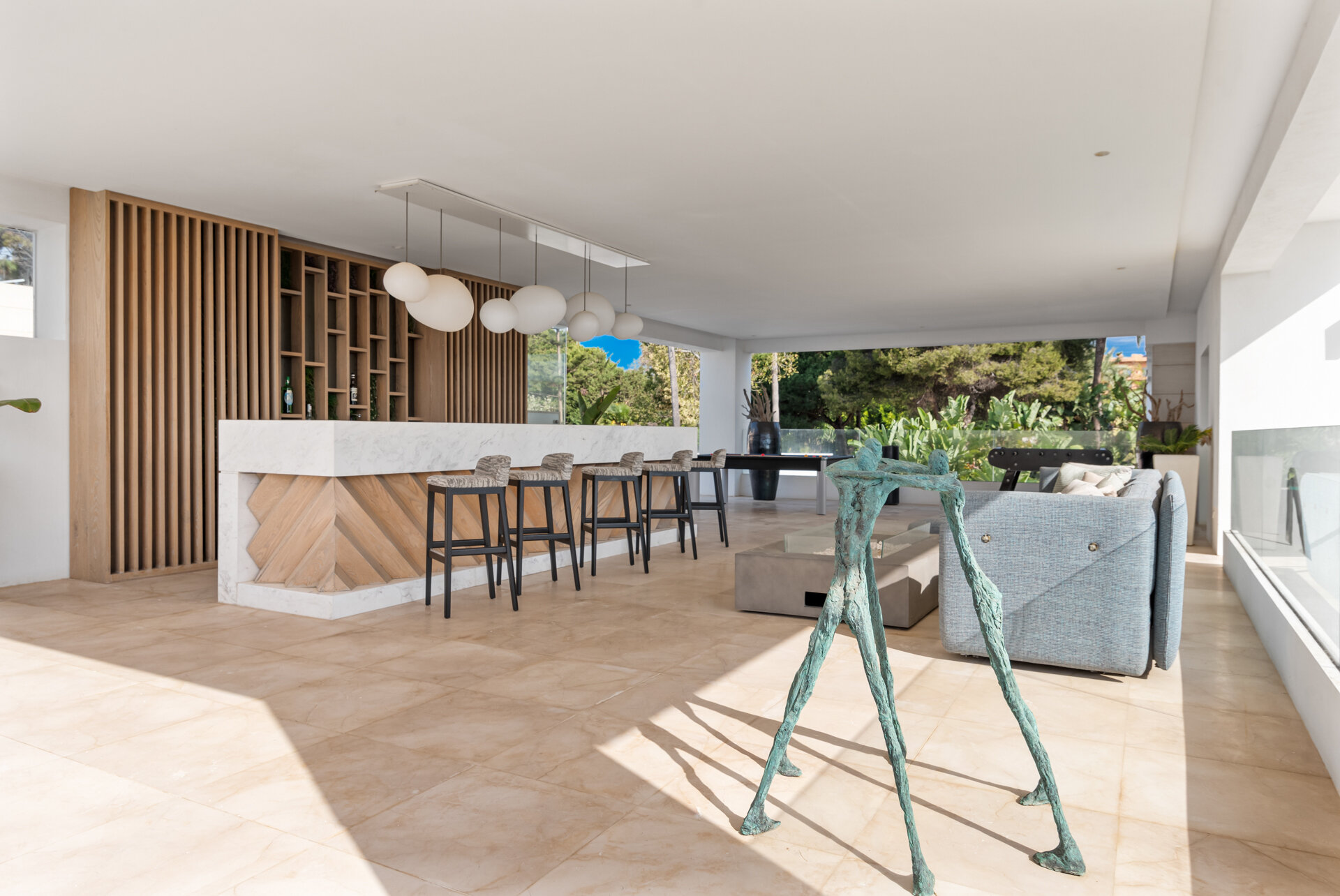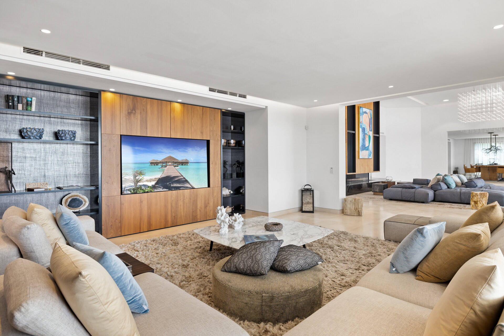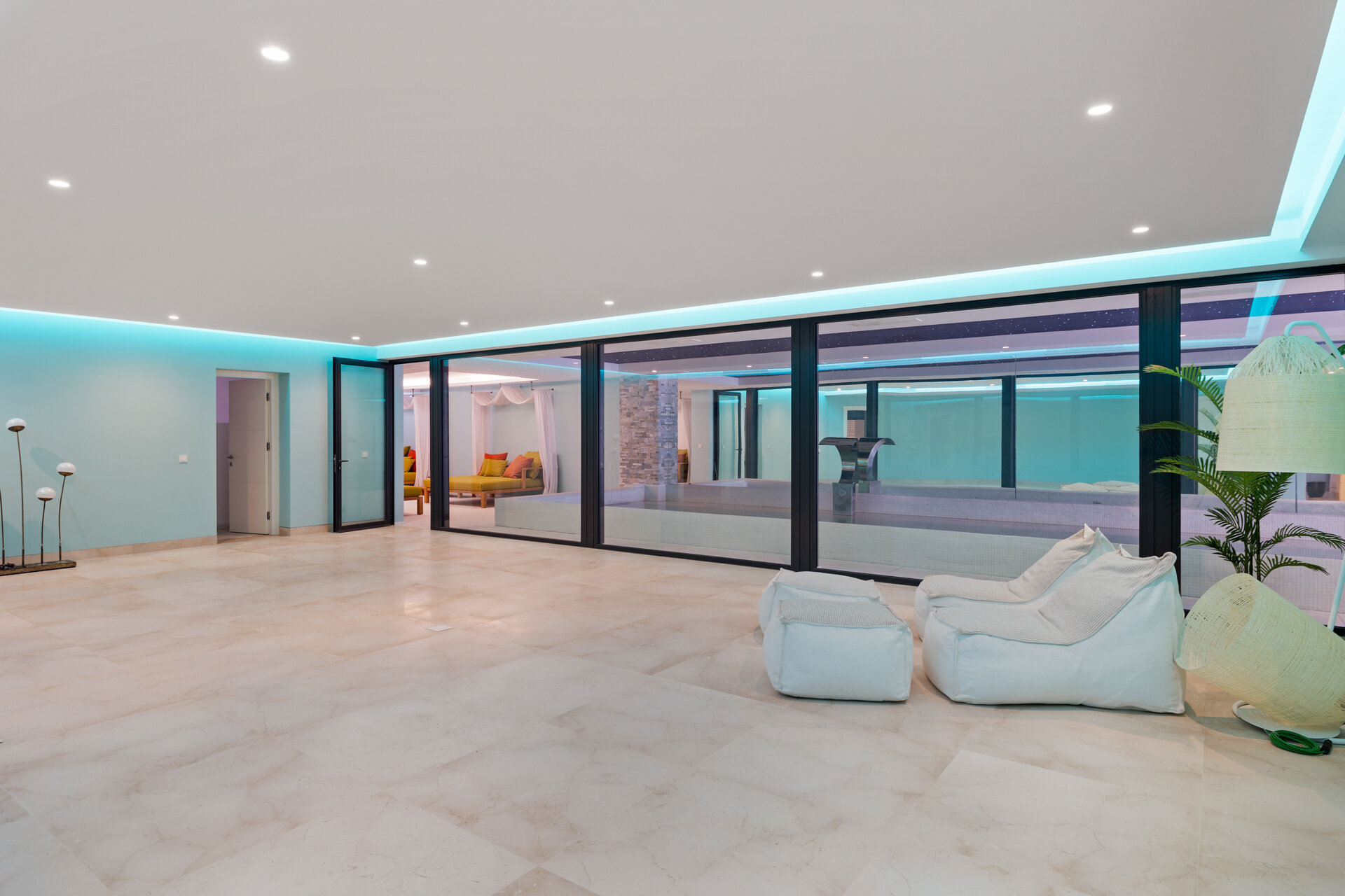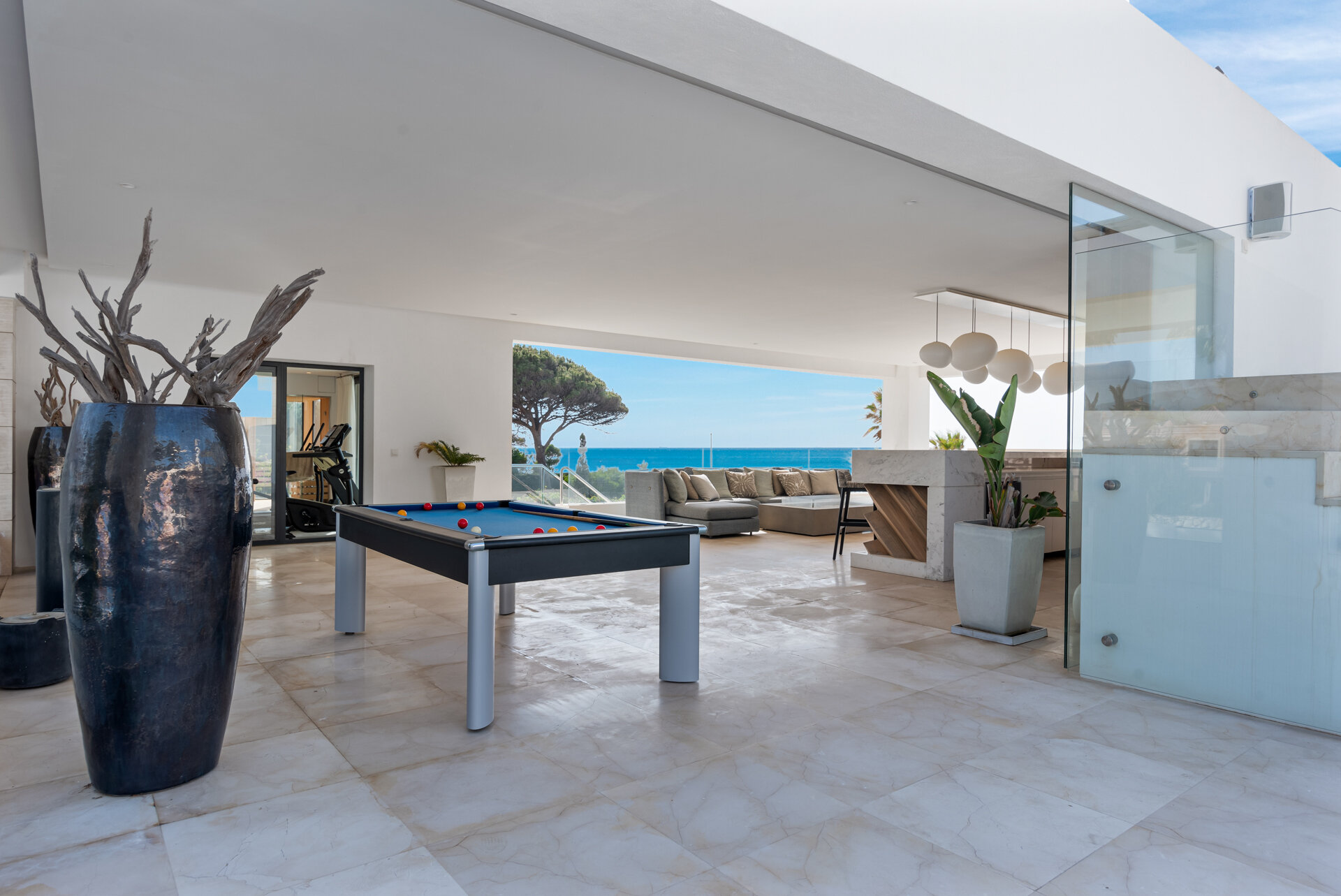 Entertainment spaces are thoughtfully integrated throughout the villa. A private cinema room and games room provide relaxed evenings indoors, while multiple lounges and terraces encourage social time during the day. Wellness and leisure facilities allow the house to adapt easily to different group dynamics.